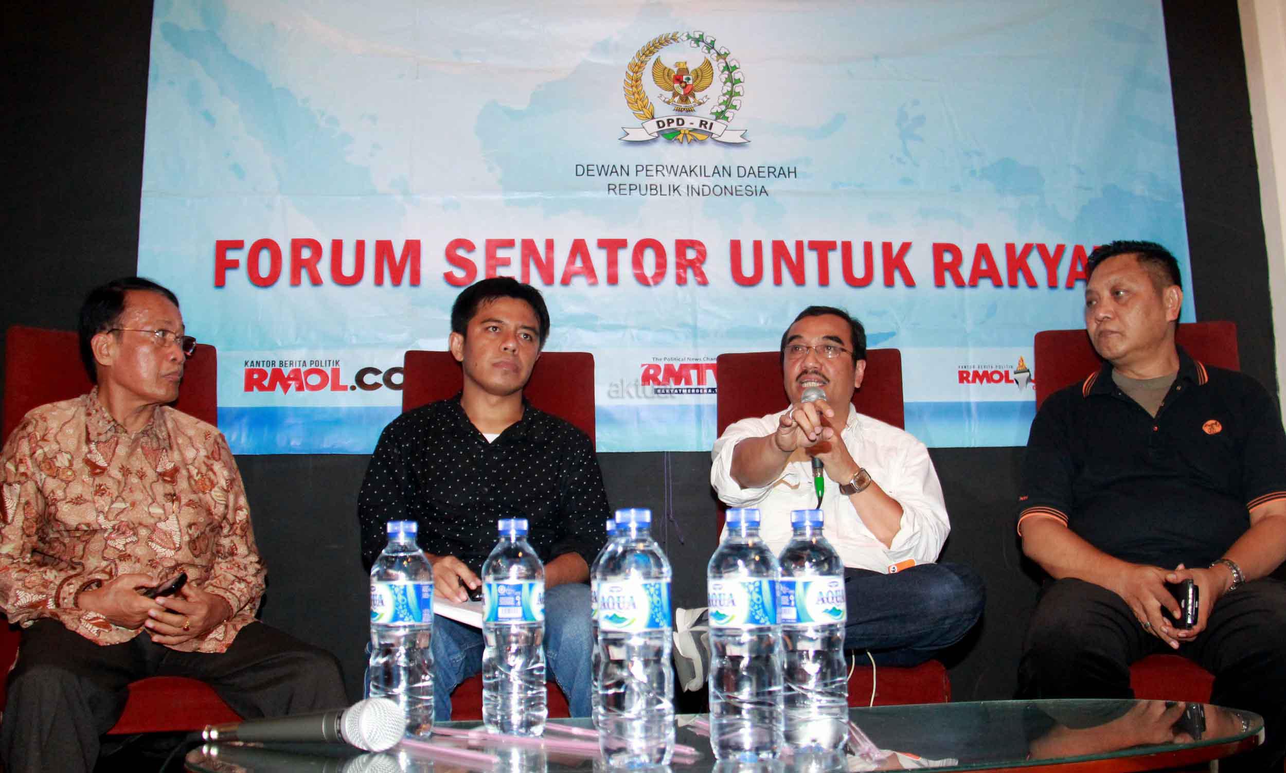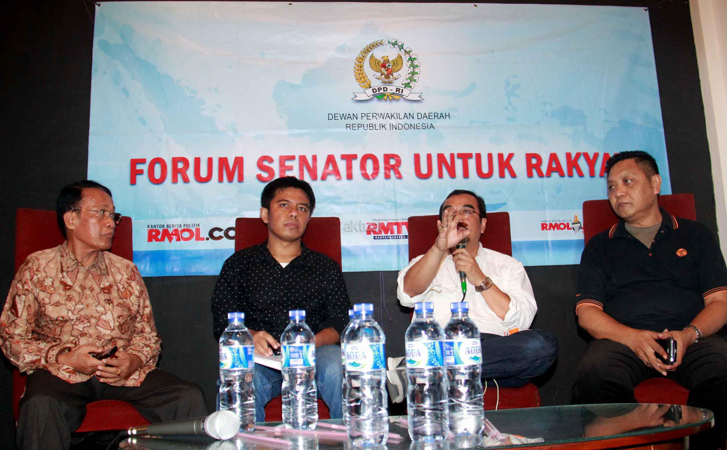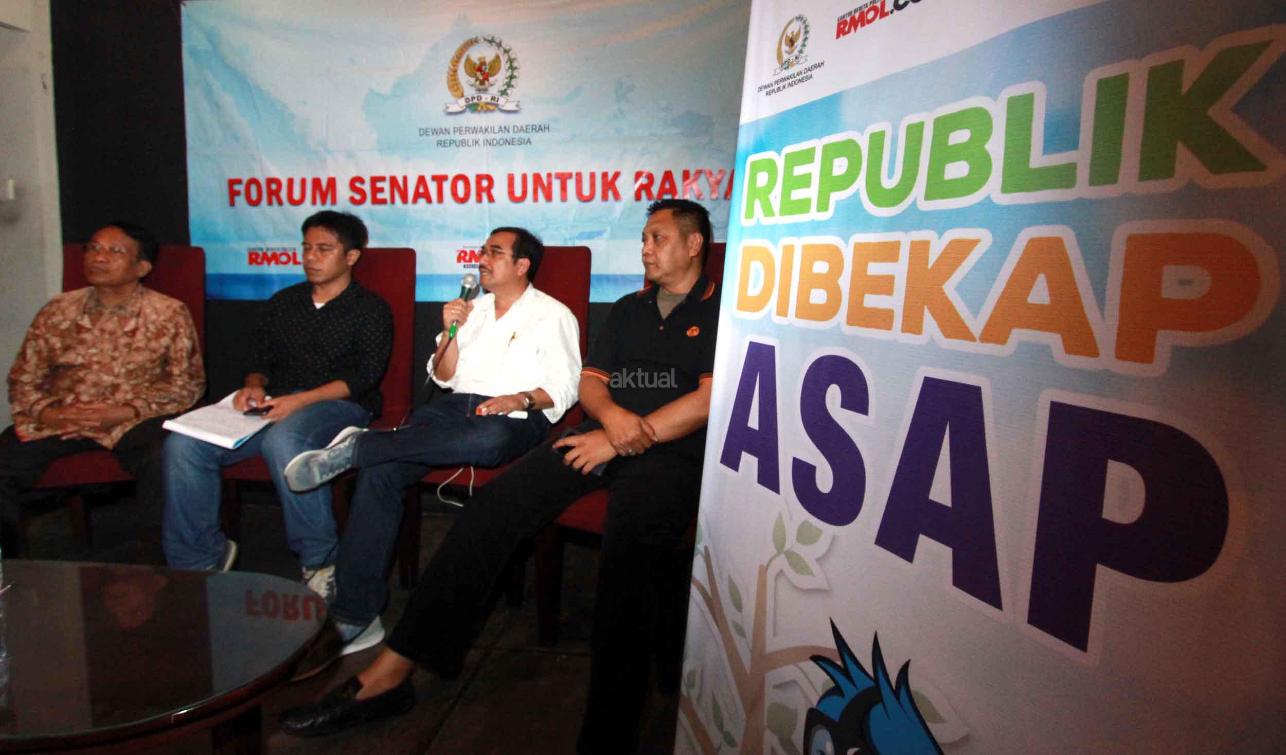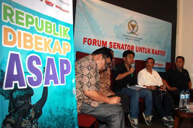 Kika; Anggota DPD RI Asal Riau Abdul Gafar Usmaan, Aktivis Walhi Pius Ginting, Direktur Eksekutif Gabungan Pengusaha Kelapa Sawit Indonesia Fadhil Hasan, Koordiantor Gerakan Indonesia Bersih Adhie Masardi, dalam diskusi Forum Senator Untuk Rakyat di Jakarta, Minggu (20/9/2015). Diskusi yang bertemakan " Republik Dibekap Asap.