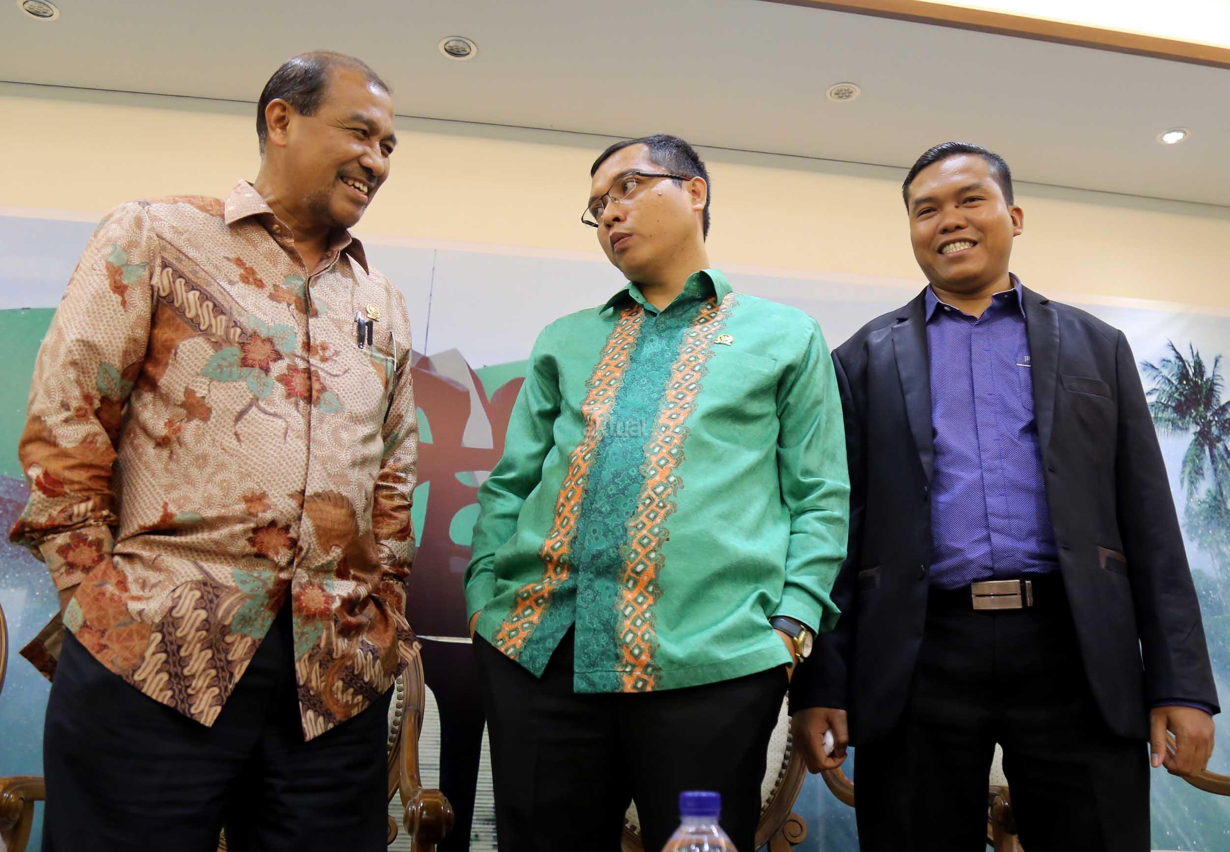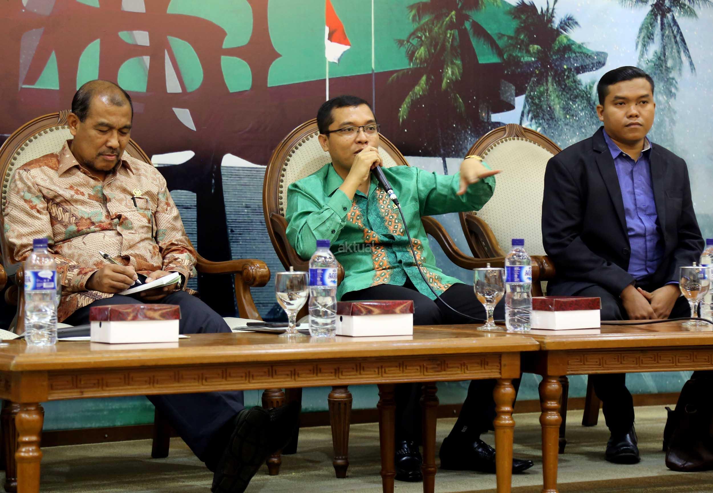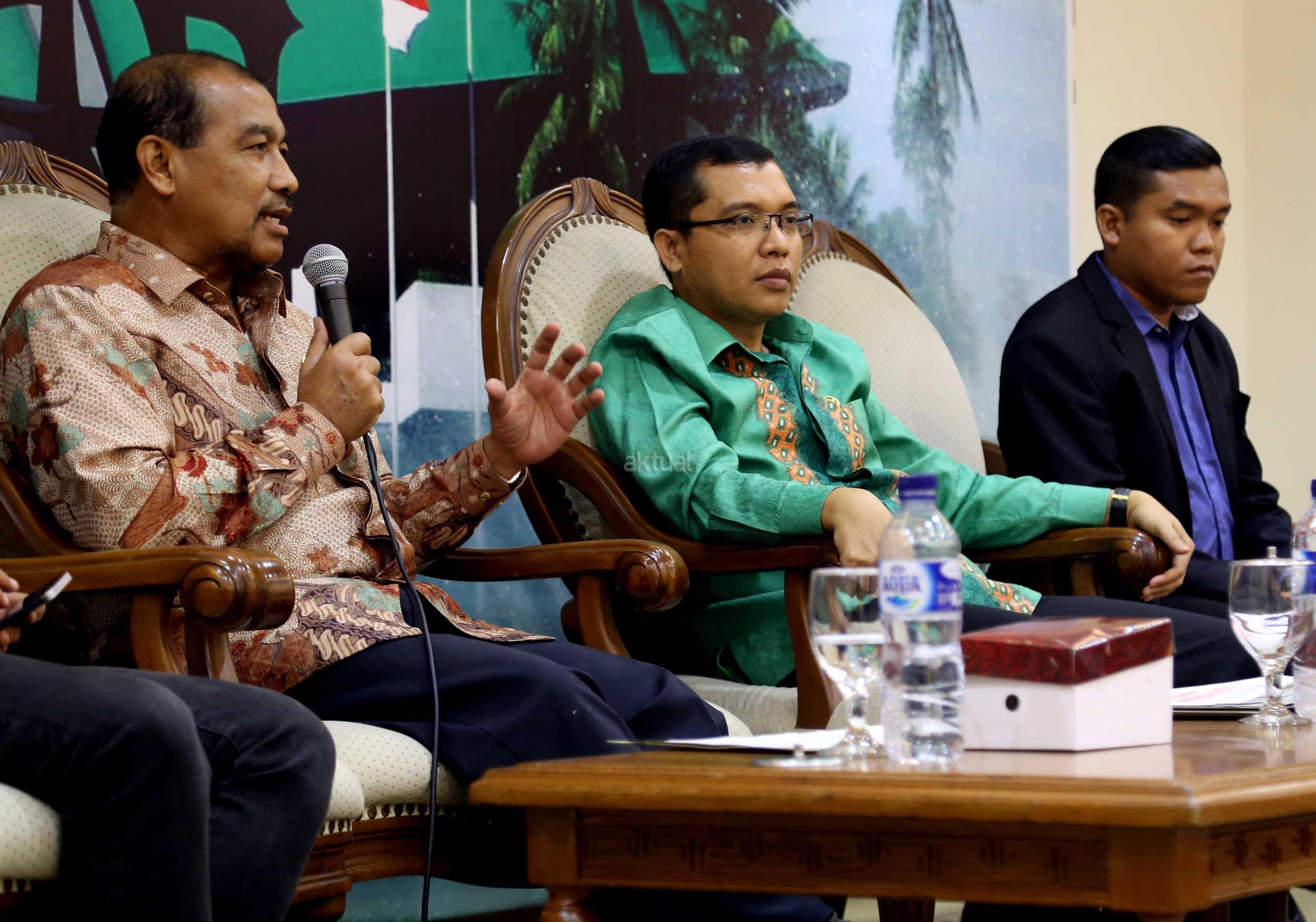 Wakil Ketua DPD RI Nono Sampono (kiri) bersama Anggota Komisi II DPR yang juga Anggota Pansus RUU Pemilu Achmad Baidowi (tengah), dan Pengamat Politik, Pangi Syarwi Chaniago (kanan) dalam diskusi dialektika demokrasi bertema di Kompleks Parlemen, Senayan, Jakarta, Kamis (27/4). Diskusi tersebut membahas tema "Retakkah Hubungan DPR-DPD Akibat Usulan Senator Dipilih DPRD”. Saat ini muncul usulan agar anggota Dewan Perwakilan Daerah (DPD) diseleksi oleh Panitia Seleksi (Pansel) dan Dewan Perwakilan Rakyat Daerah (DPRD) dalam pembahasan Rancangan Undang-Undang Pemilu (RUU Pemilu). AKTUAL/Tino Oktaviano