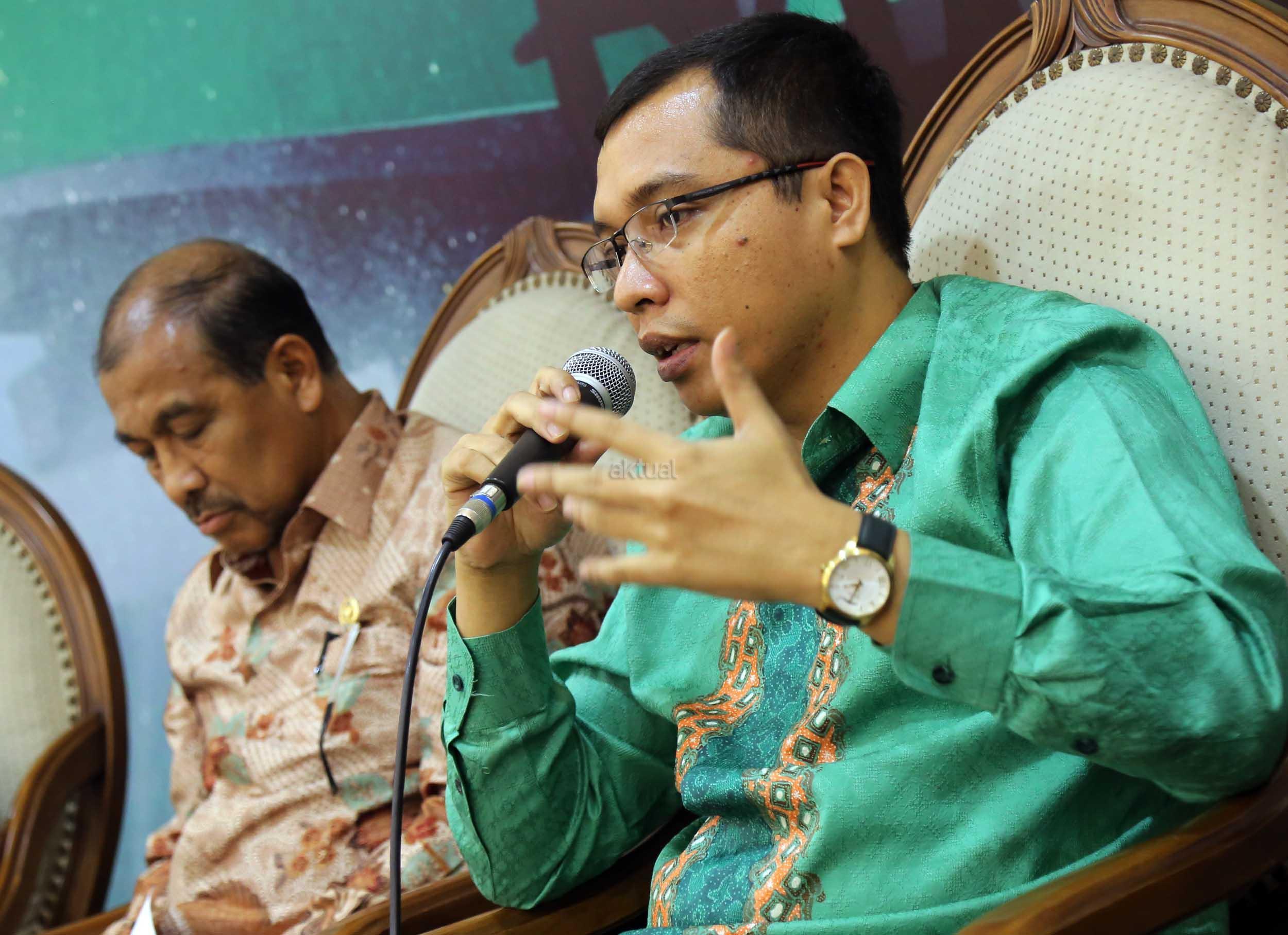 Wakil Ketua DPD RI Nono Sampono (kiri) bersama Anggota Komisi II DPR yang juga Anggota Pansus RUU Pemilu Achmad Baidowi (kanan) dalam diskusi dialektika demokrasi bertema di Kompleks Parlemen, Senayan, Jakarta, Kamis (27/4). Diskusi tersebut membahas tema “Retakkah Hubungan DPR-DPD Akibat Usulan Senator Dipilih DPRD”. Saat ini muncul usulan agar anggota Dewan Perwakilan Daerah (DPD) diseleksi oleh Panitia Seleksi (Pansel) dan Dewan Perwakilan Rakyat Daerah (DPRD) dalam pembahasan Rancangan Undang-Undang Pemilu (RUU Pemilu). AKTUAL/Tino Oktaviano
