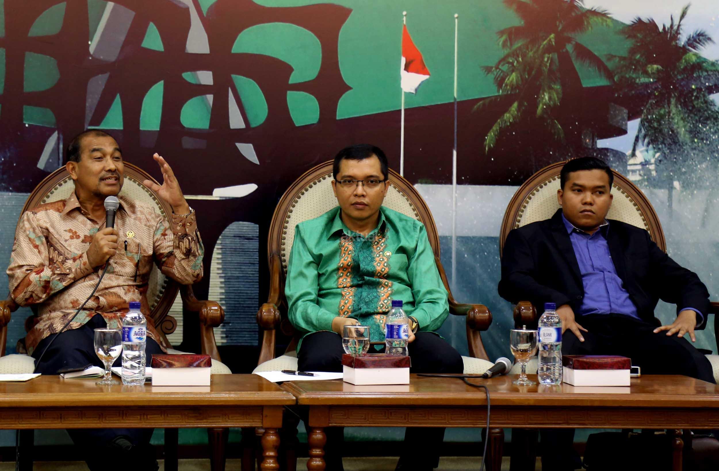 Wakil Ketua DPD RI Nono Sampono (kiri) bersama Anggota Komisi II DPR yang juga Anggota Pansus RUU Pemilu Achmad Baidowi (tengah), dan Pengamat Politik, Pangi Syarwi Chaniago (kanan) dalam diskusi dialektika demokrasi bertema di Kompleks Parlemen, Senayan, Jakarta, Kamis (27/4). Diskusi tersebut membahas tema “Retakkah Hubungan DPR-DPD Akibat Usulan Senator Dipilih DPRD”. Saat ini muncul usulan agar anggota Dewan Perwakilan Daerah (DPD) diseleksi oleh Panitia Seleksi (Pansel) dan Dewan Perwakilan Rakyat Daerah (DPRD) dalam pembahasan Rancangan Undang-Undang Pemilu (RUU Pemilu). AKTUAL/Tino Oktaviano