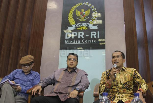 Ketua Panja RUU Perfilman Abdul Kharis (kanan) bersama Pimpinan Komisi X Dede Yusuf dan Pengamat Perfilman Yan Wijaya (kiri) menjadi pembicara dalam Forum Legislasi dengan topik 'RUU Perfilman' di Gedung Parlemen Senayan, Jakarta, Selasa (8/3/2016). Pemerintah dalam waktu dekat segera merampungkan pembahasan revisi Daftar Negatif Investasi (DNI). Hal tersebut untuk membuka kesempatan yang lebih besar bagi pemodal asing berinvestasi lebih di sektor usaha di dalam negeri. Salah satu sektor yang turut direvisi adalah investasi di sektor industri perfilman, mulai dari produksi, distribusi, hingga eksebisi. Foto: Aktual/Junaidi Mahbub