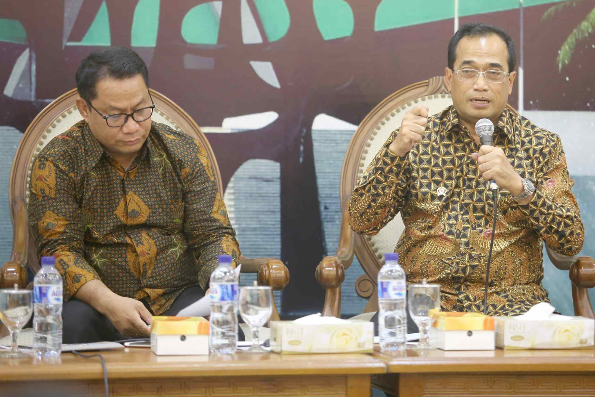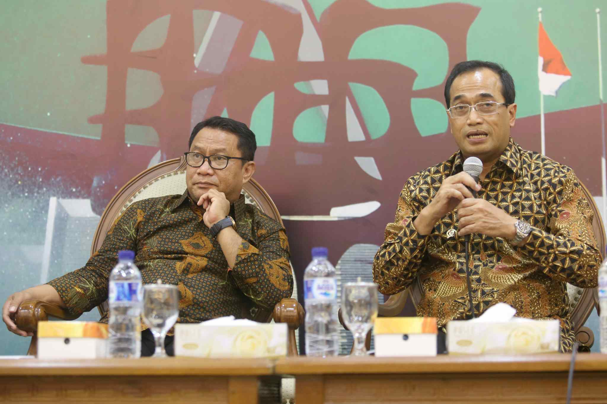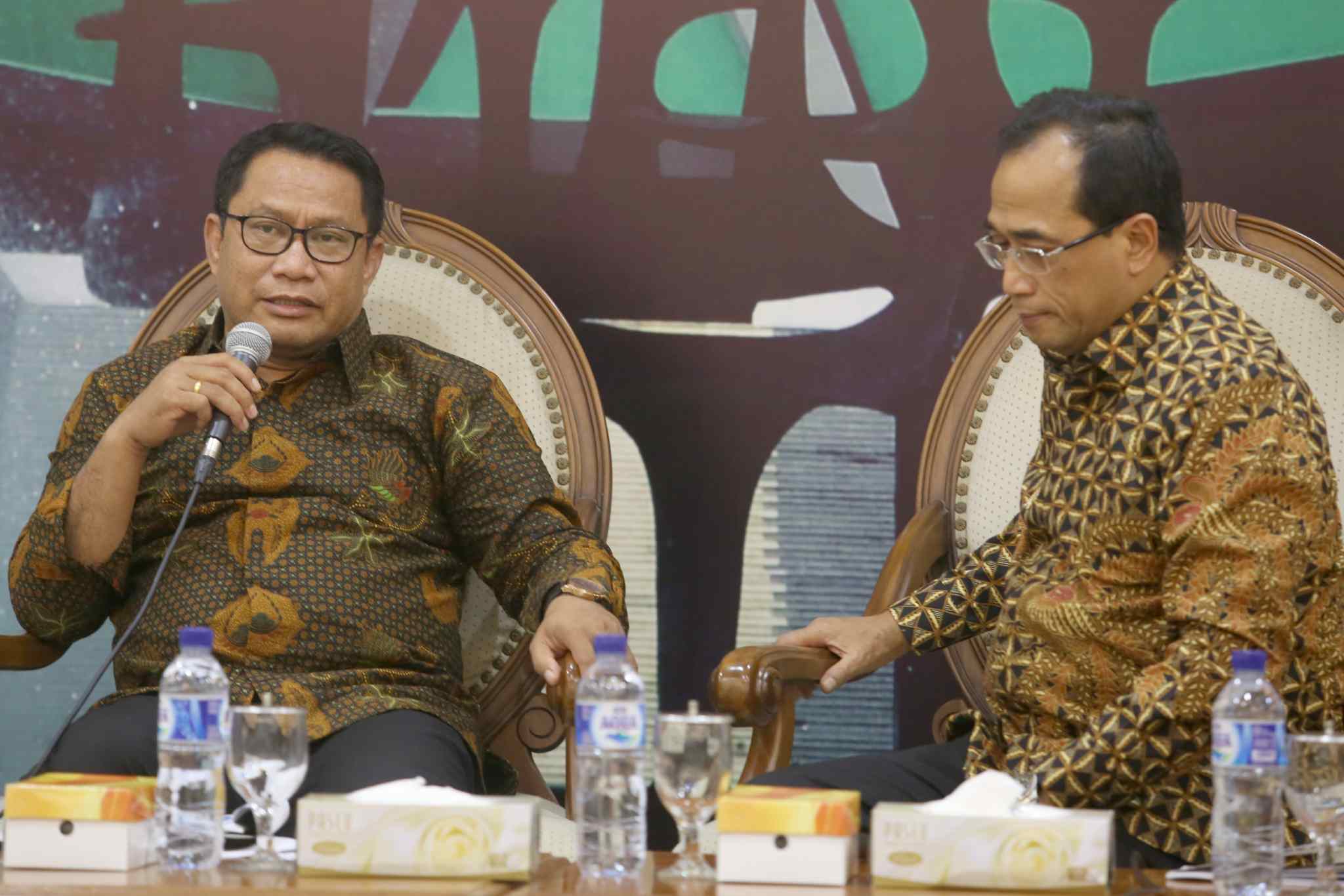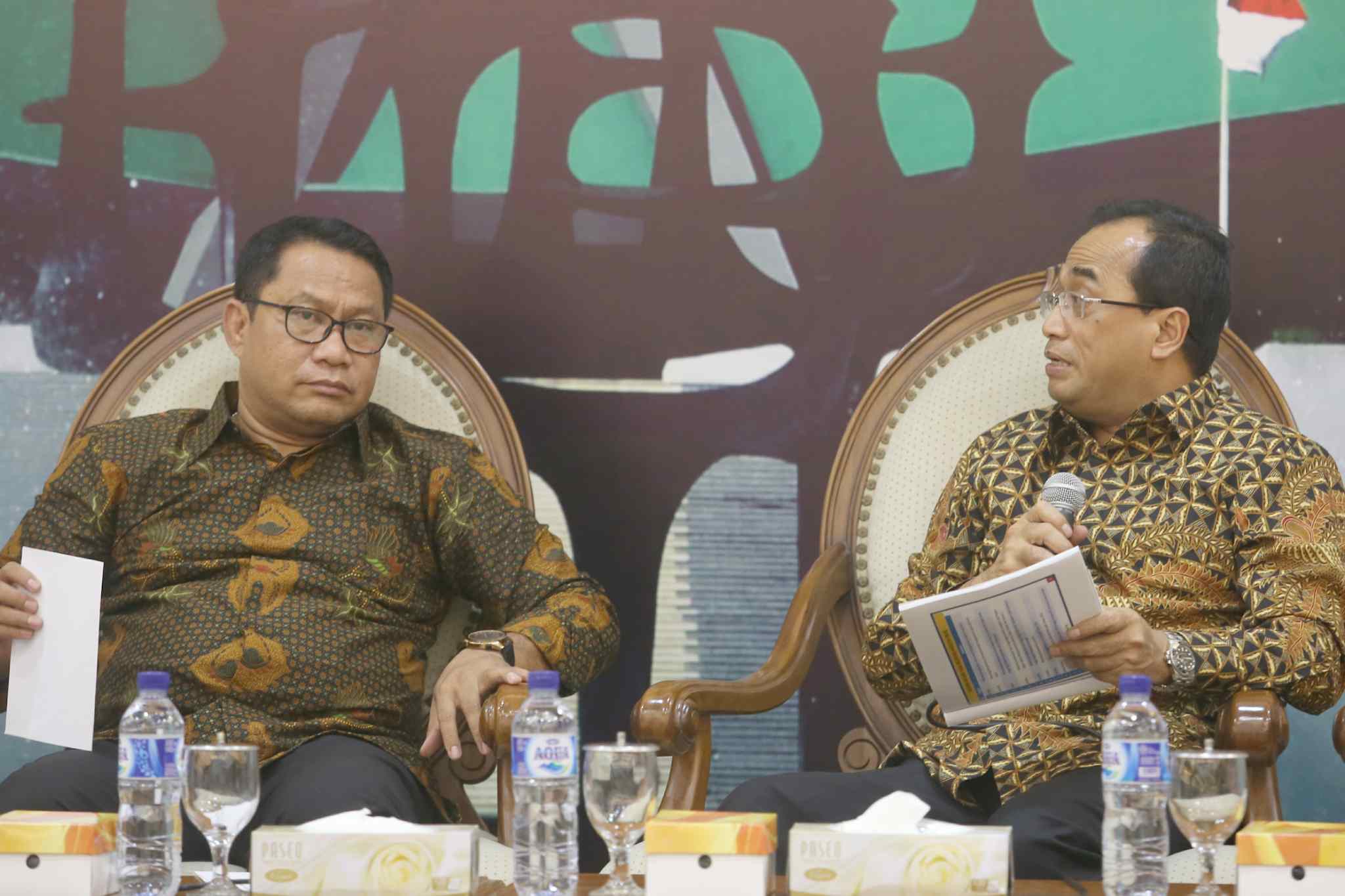 Menteri Perhubungan Budi Karya Sumadi didampingi Ketua Komisi V DPR dari Fraksi Gerindra Fary Djamy Francis saat diskusi Forum Legislasi dengan tema 'Revisi UU LLAJ Solusi Konkrit bagi Angkutan Umum' di ruang press room DPR, Jakarta, Selasa (4/4). Seiring berkembangnya teknologi dan kebutuhan masyarakat, kini ojek online semakin mendapat tempat di tengah masyarakat. Di sisi lain, keberadaan dalam operasionalnya masih dianggap ilegal. Maka Undang-Undang Nomor 22 Tahun 2009 ini harus kita revisi ketika kita legalkan roda dua jadi angkutan umum. AKTUAL/Tino Oktaviano