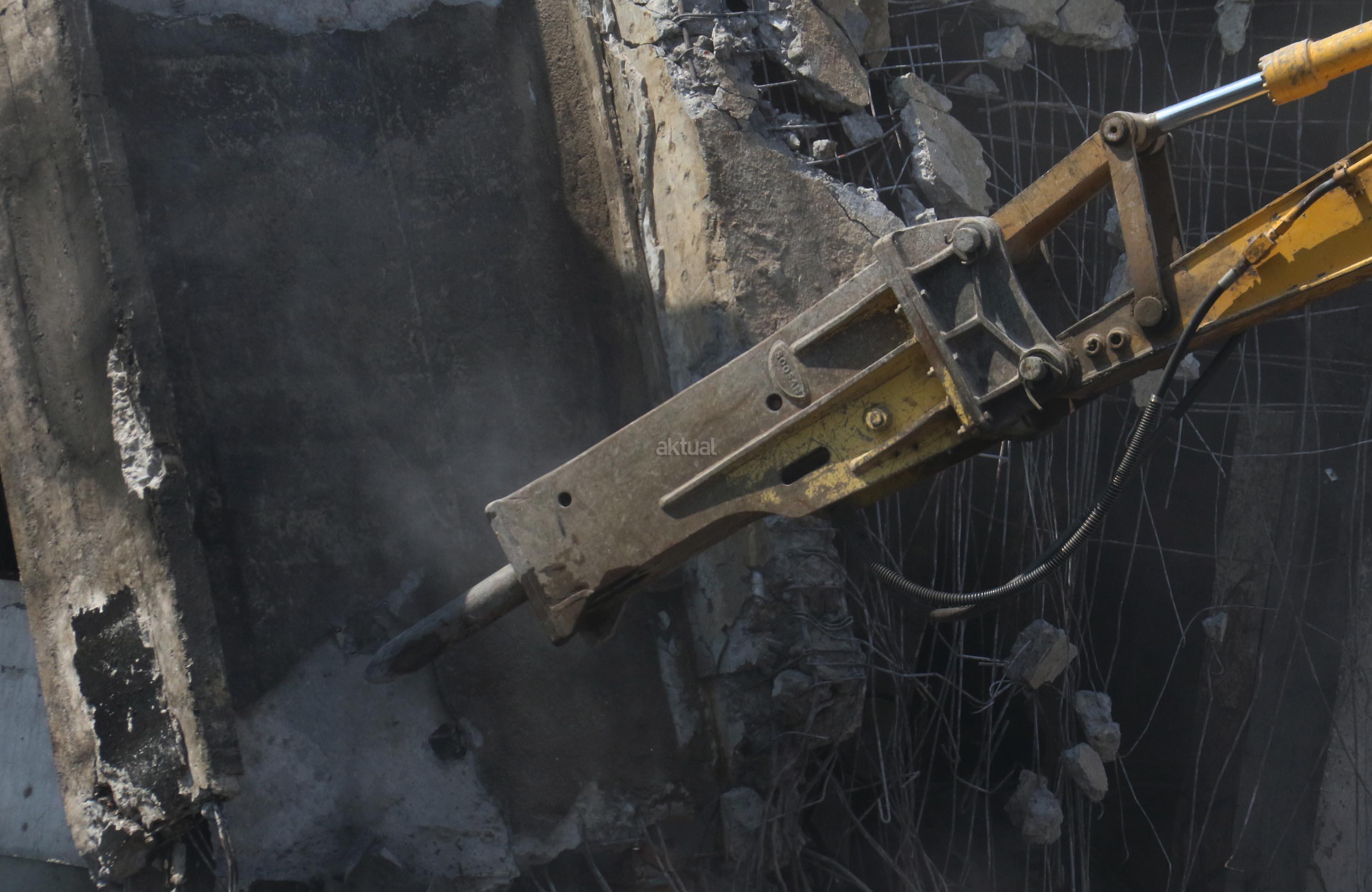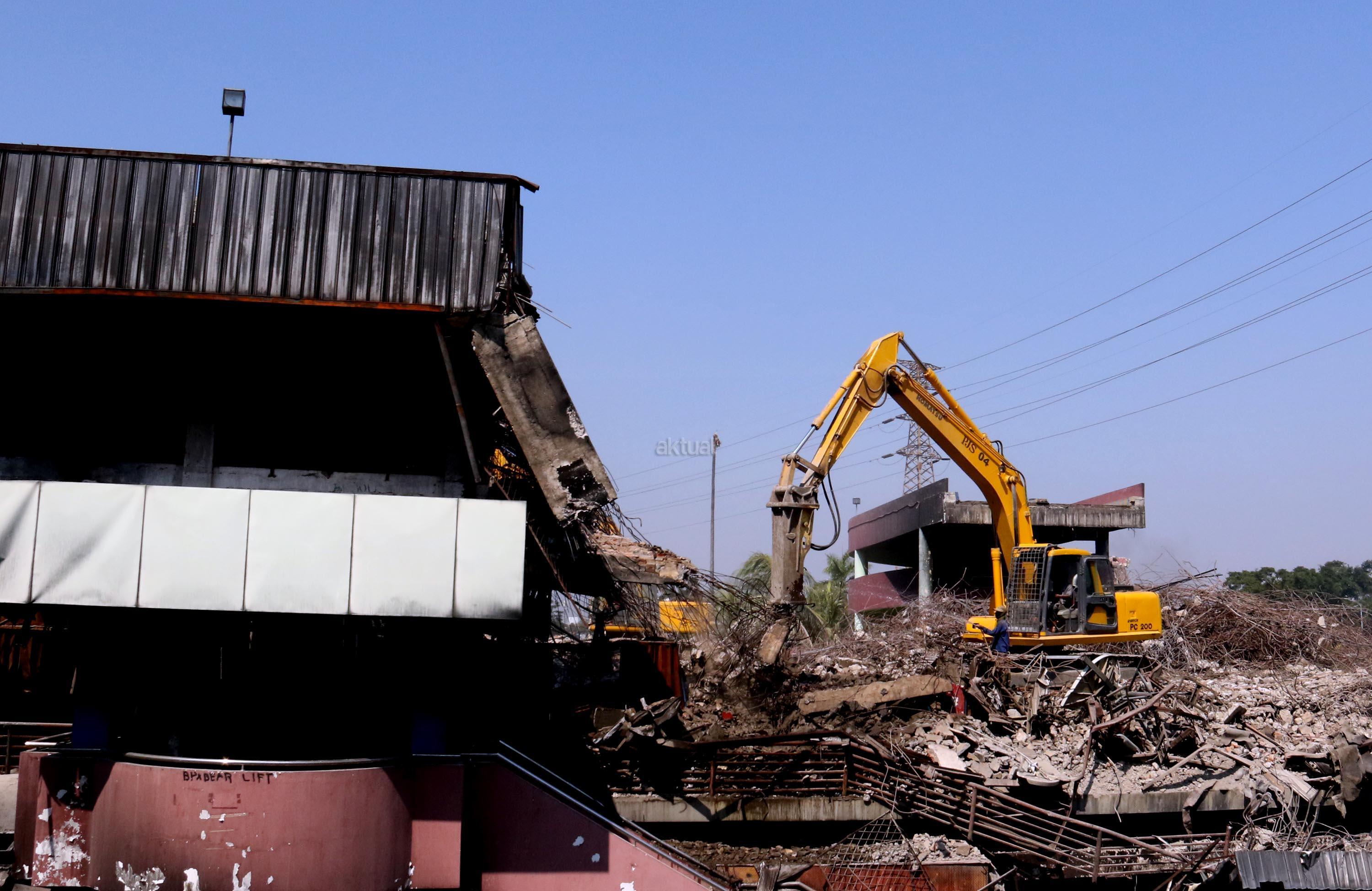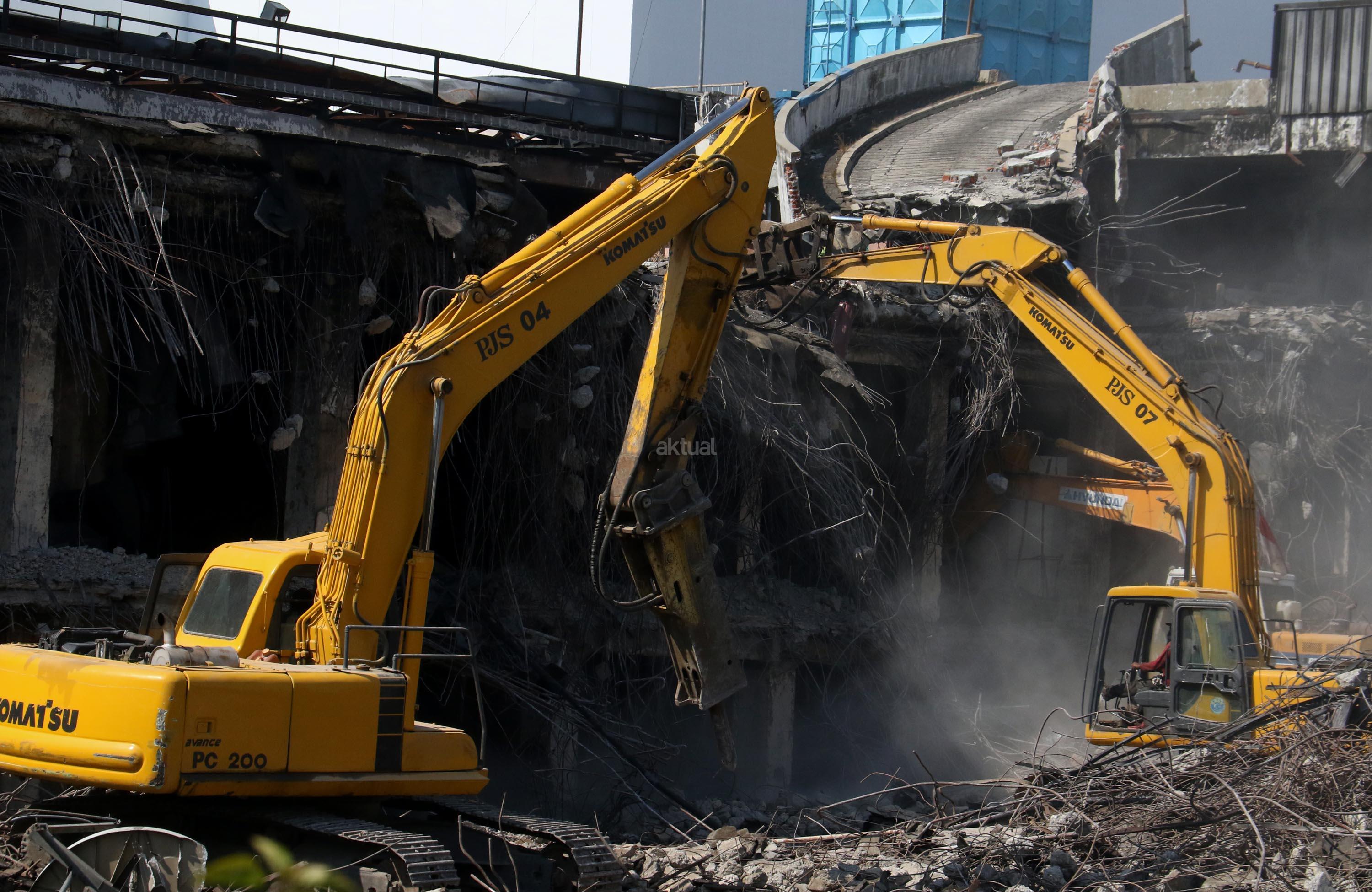 Alat berat merobohkan bangunan Pasar Senen yang terbakar di Jakarta, Jumat(15/9/2017). Pemprov DKI menyiapkan anggaran sebesar Rp116,9 miliar untuk revitalisasi Pasar Senen Blok I dan Blok II yang terbakar pada Januari 2017.
