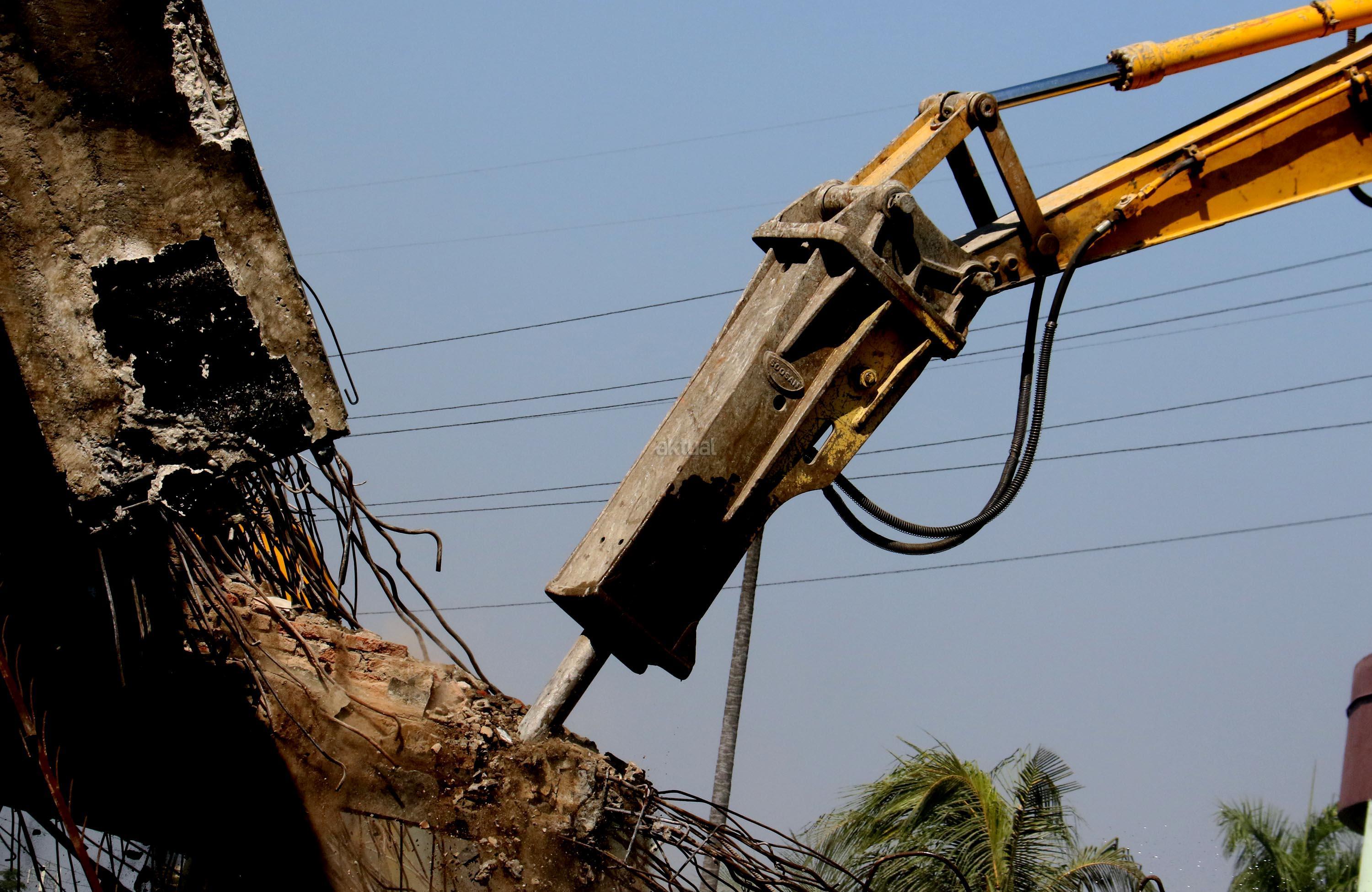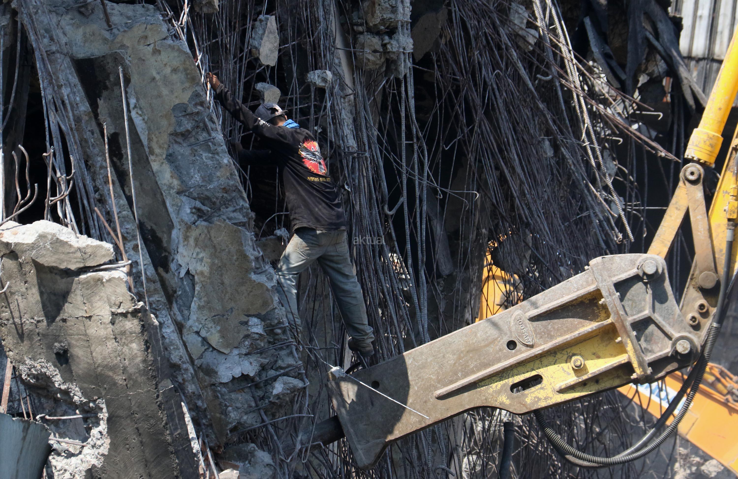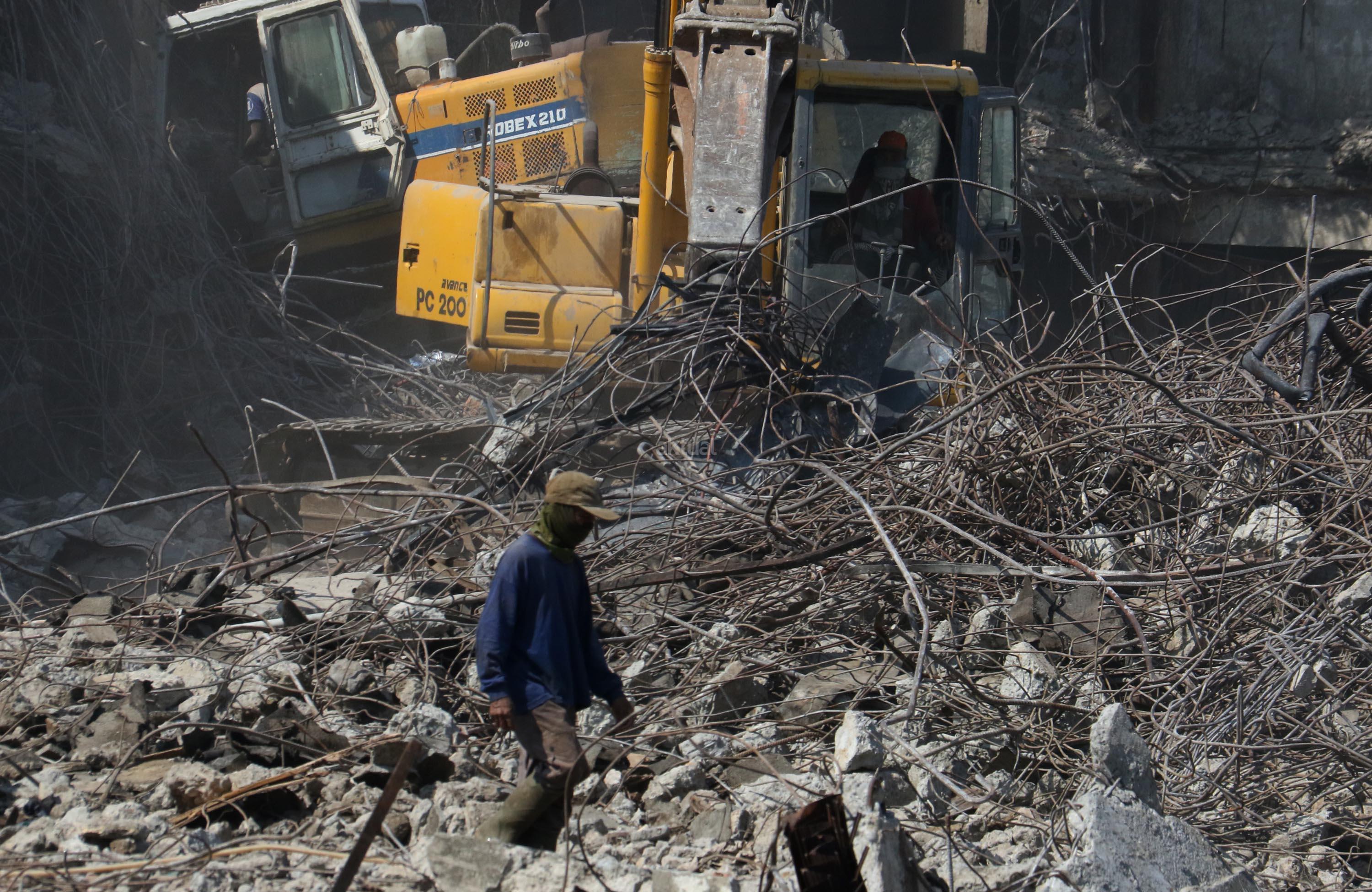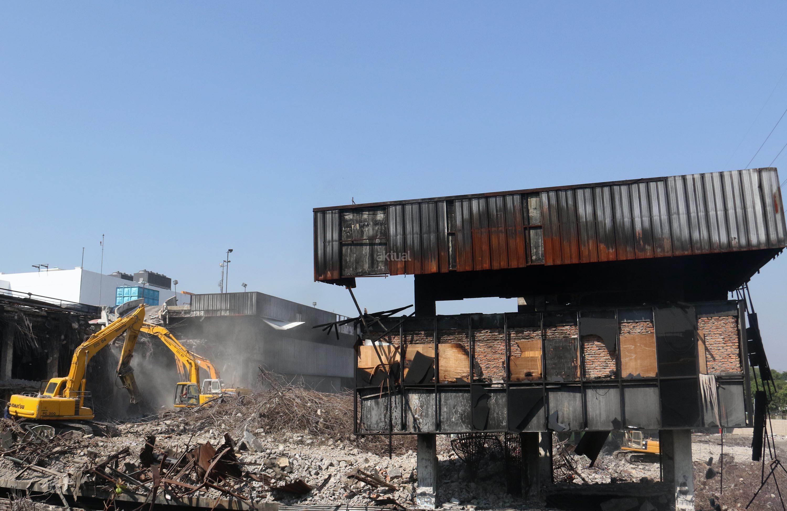 Alat berat merobohkan bangunan Pasar Senen yang terbakar di Jakarta, Jumat(15/9/2017). Pemprov DKI menyiapkan anggaran sebesar Rp116,9 miliar untuk revitalisasi Pasar Senen Blok I dan Blok II yang terbakar pada Januari 2017.