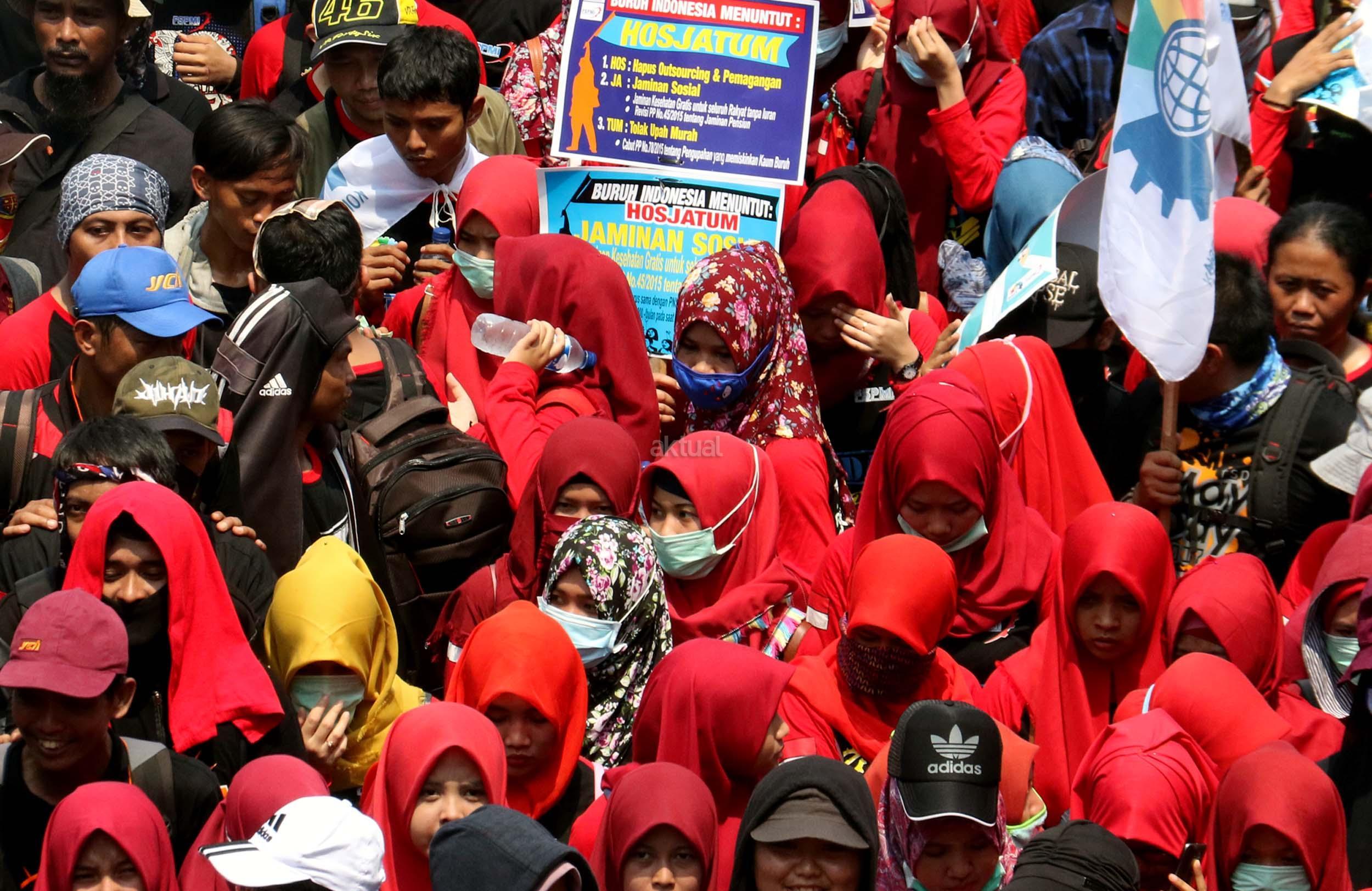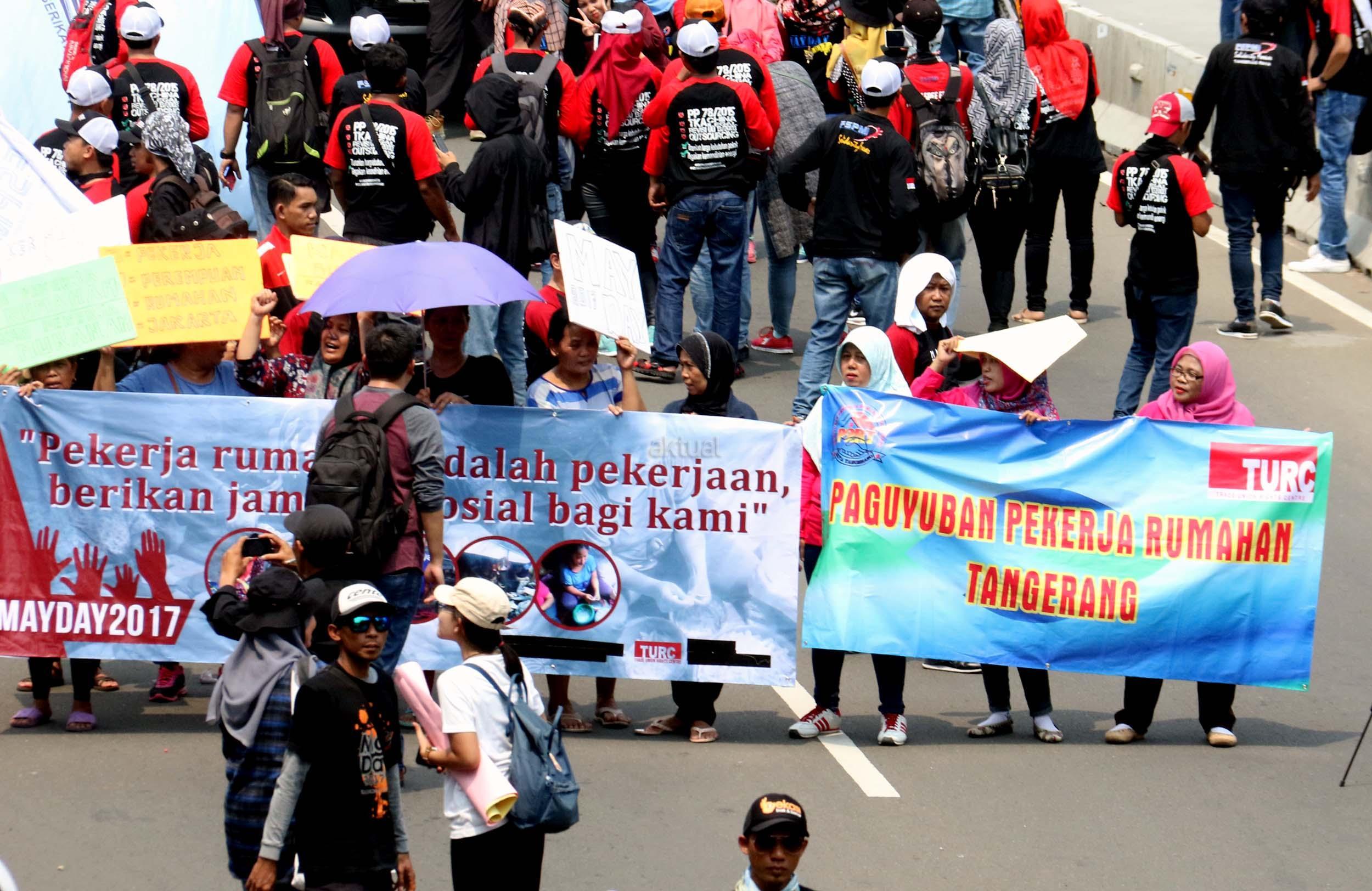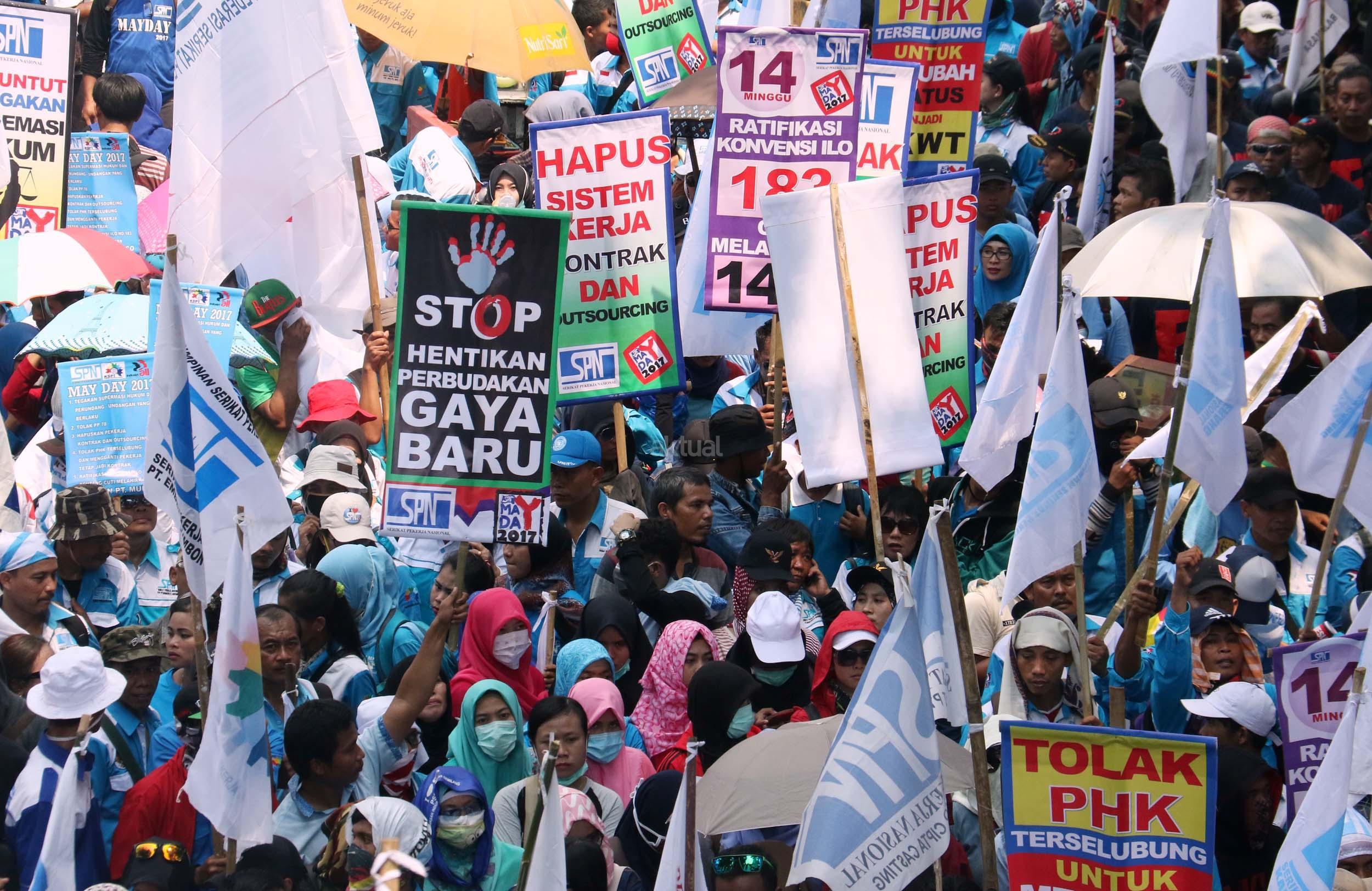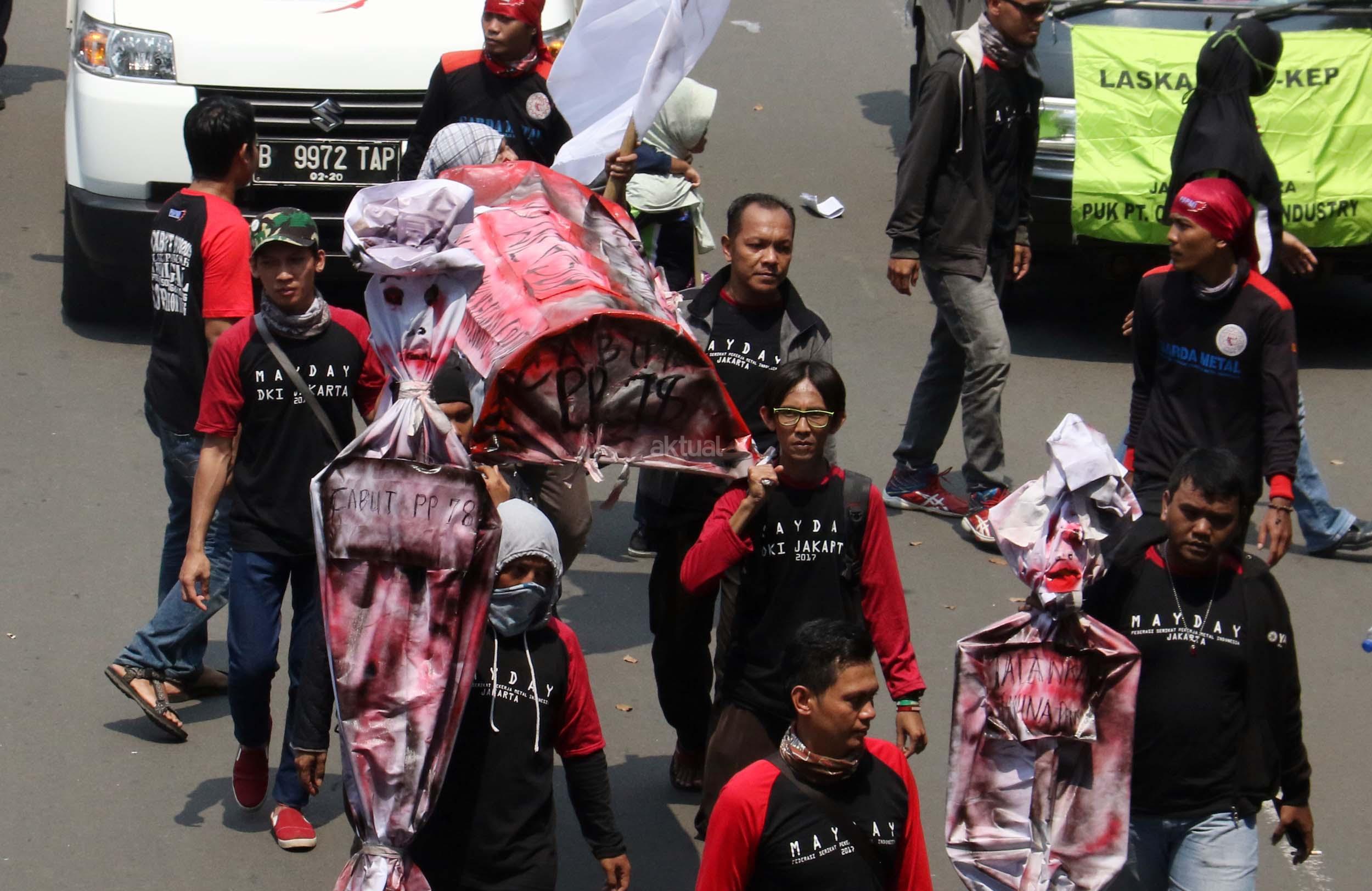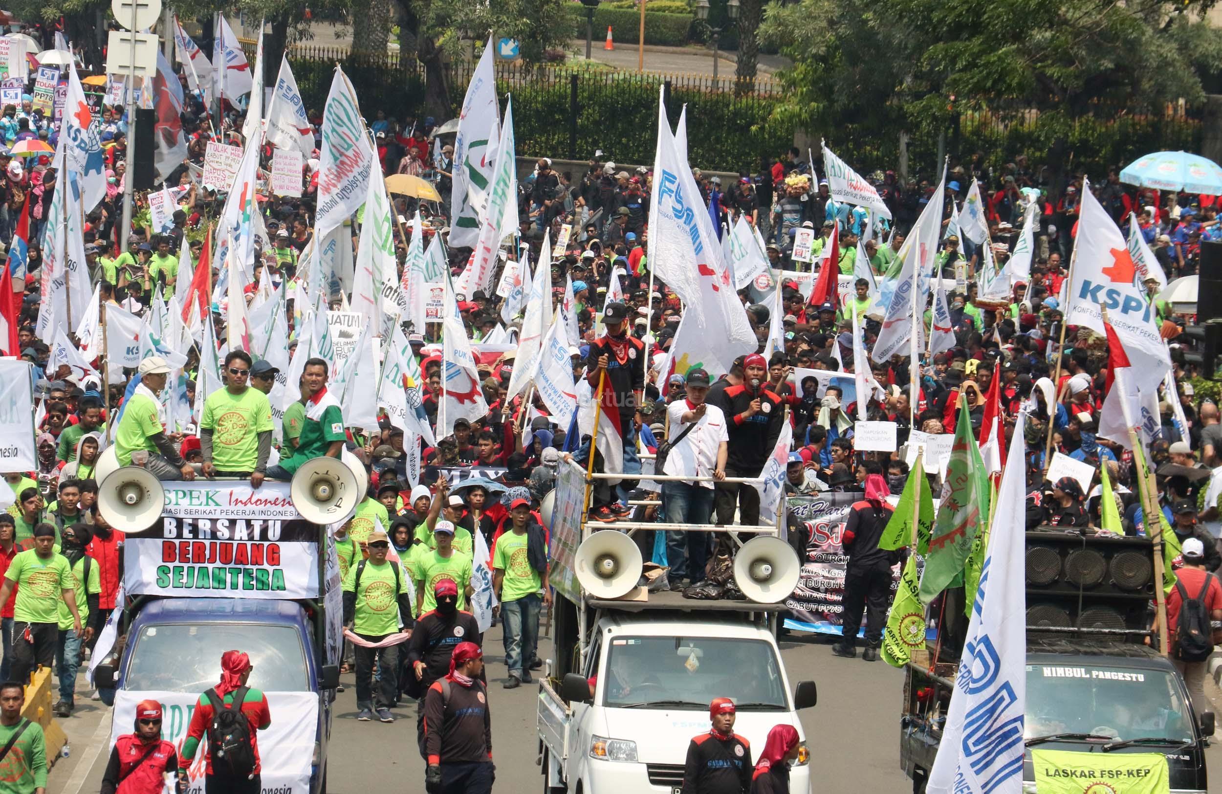 Hari Buruh sedunia diperingati ribuan buruh dari wilayah Jabodetabek dengan menggelar aksi unjuk rasa menuntut penghapusan outsourcing, jaminan sosial pekerja dan tolak upah murah. AKTUAL/Munzir