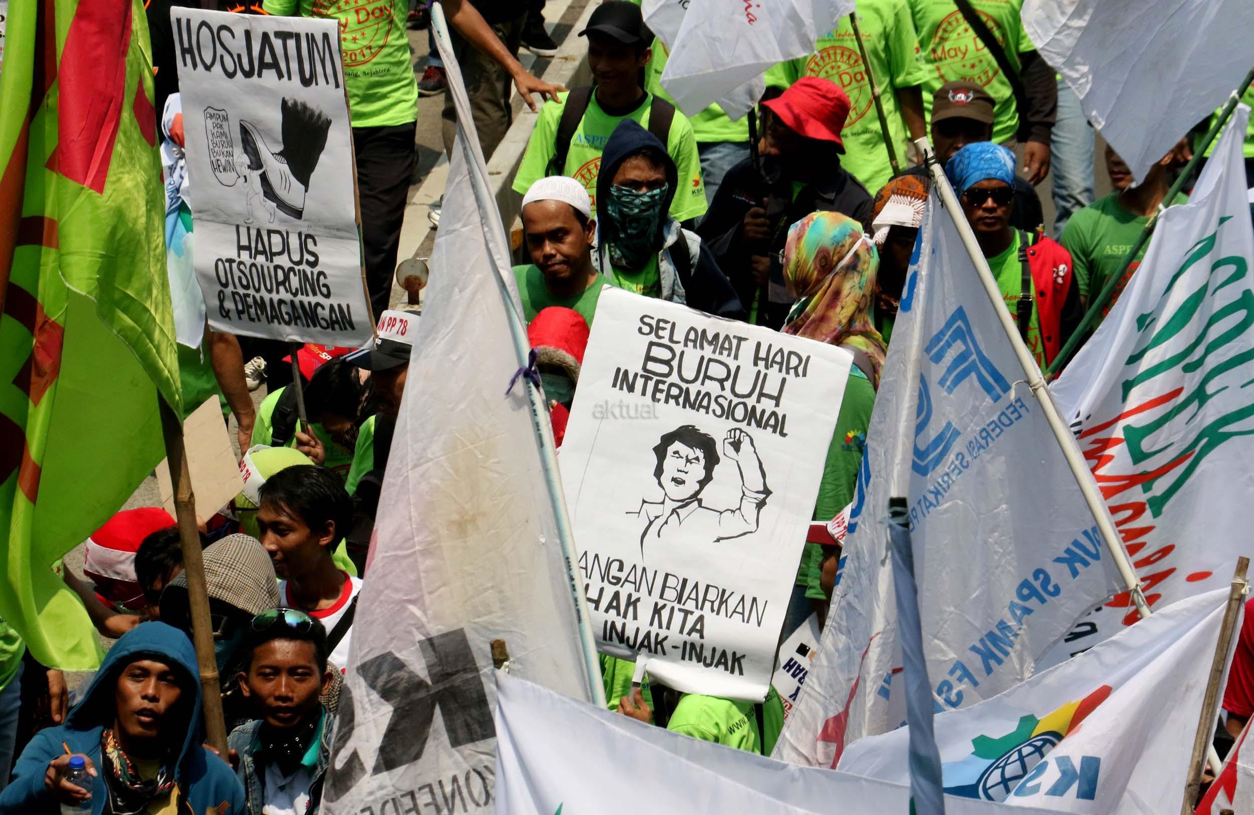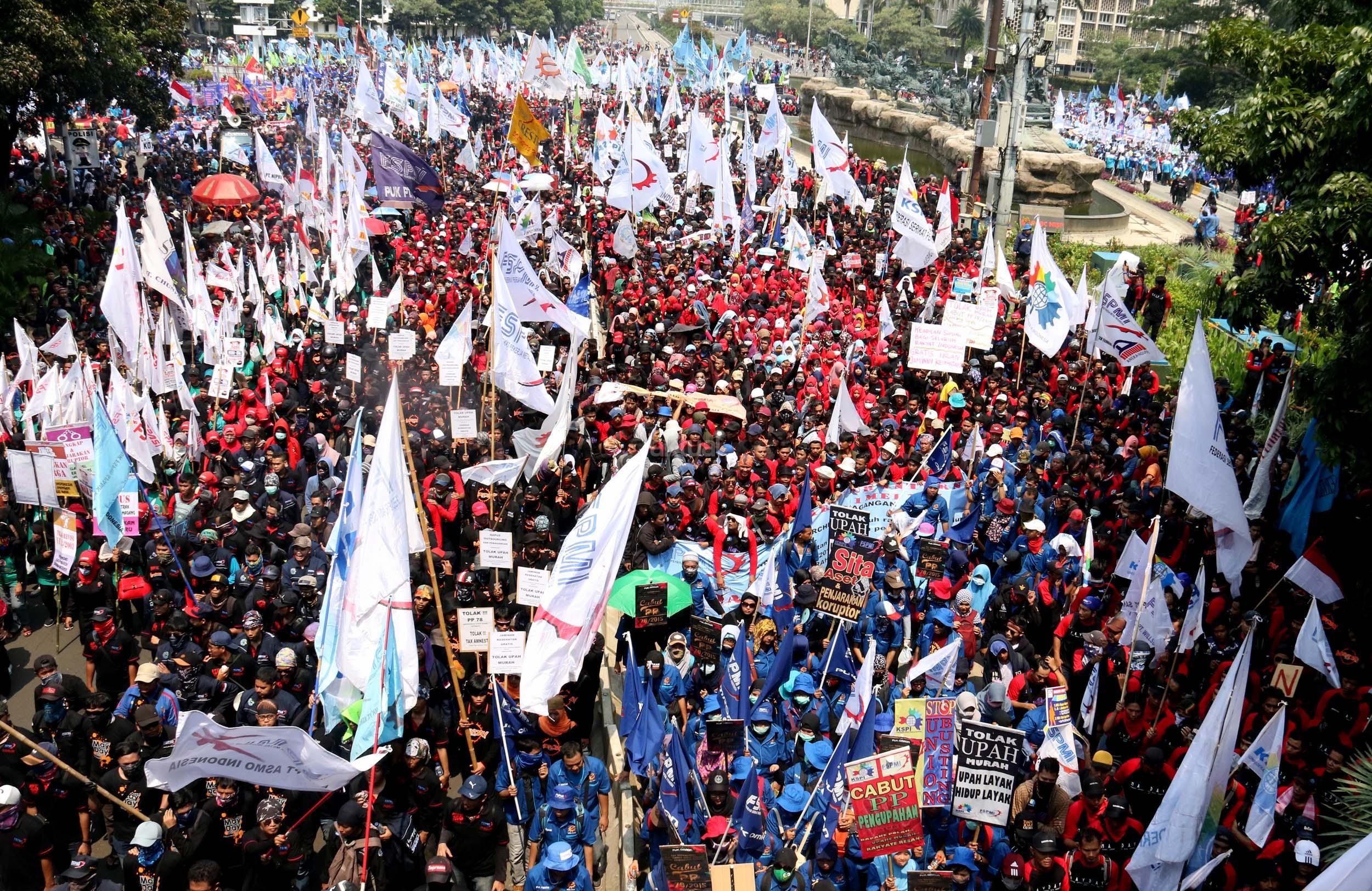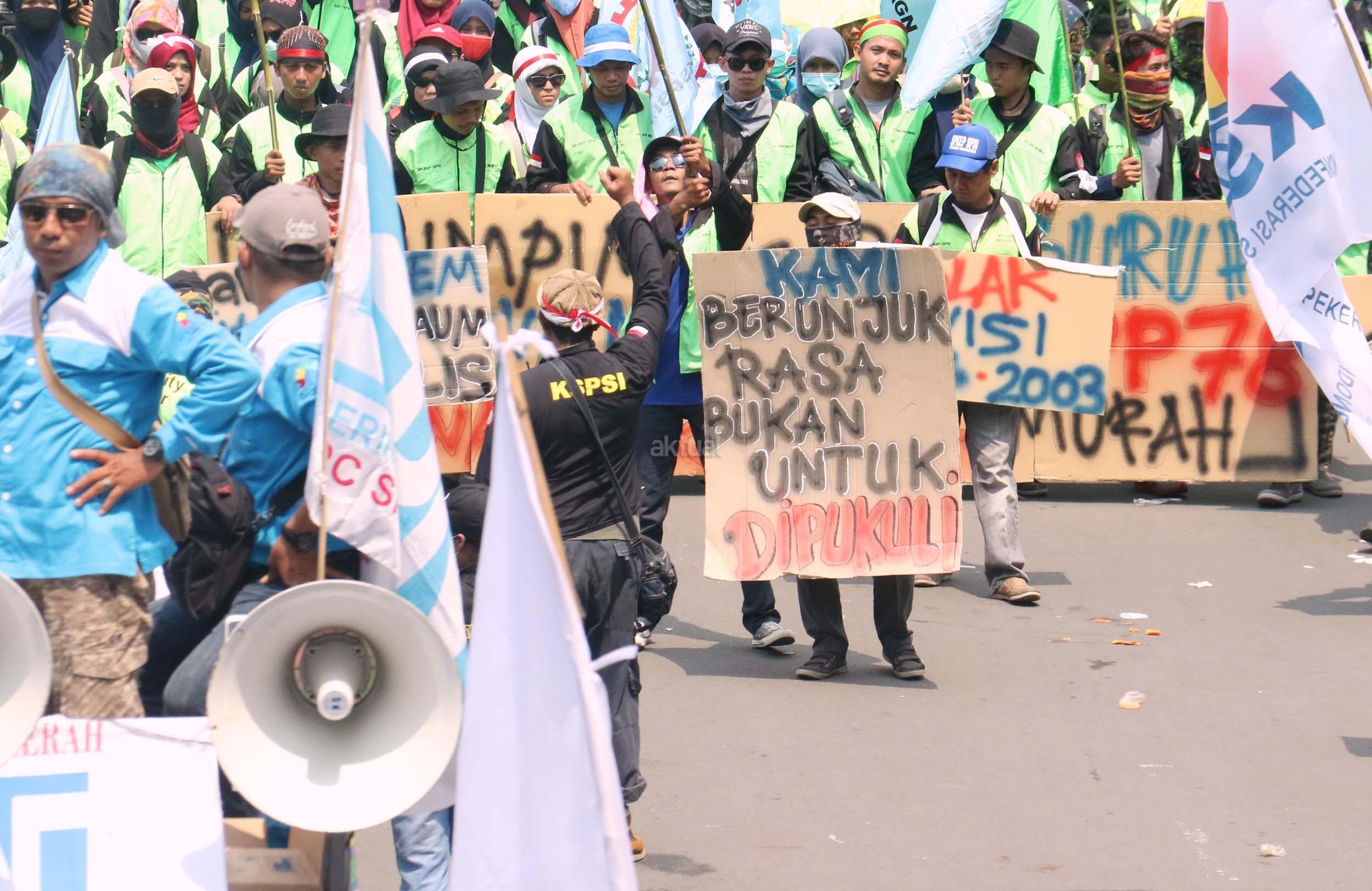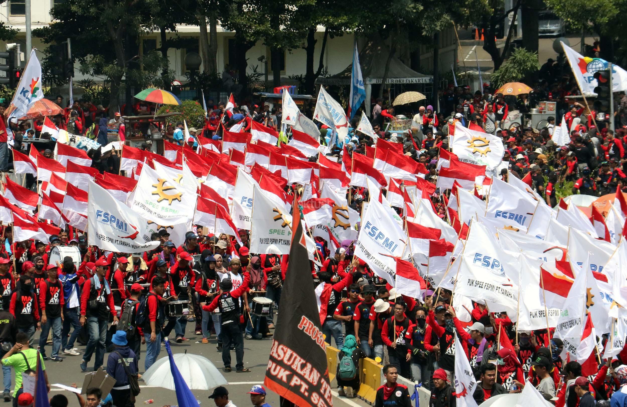 Hari Buruh sedunia diperingati ribuan buruh dari wilayah Jabodetabek dengan menggelar aksi unjuk rasa menuntut penghapusan outsourcing, jaminan sosial pekerja dan tolak upah murah. AKTUAL/Munzir
