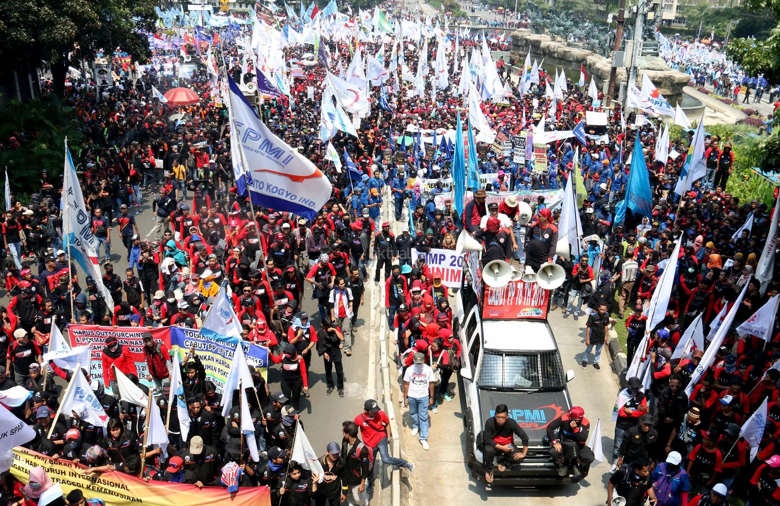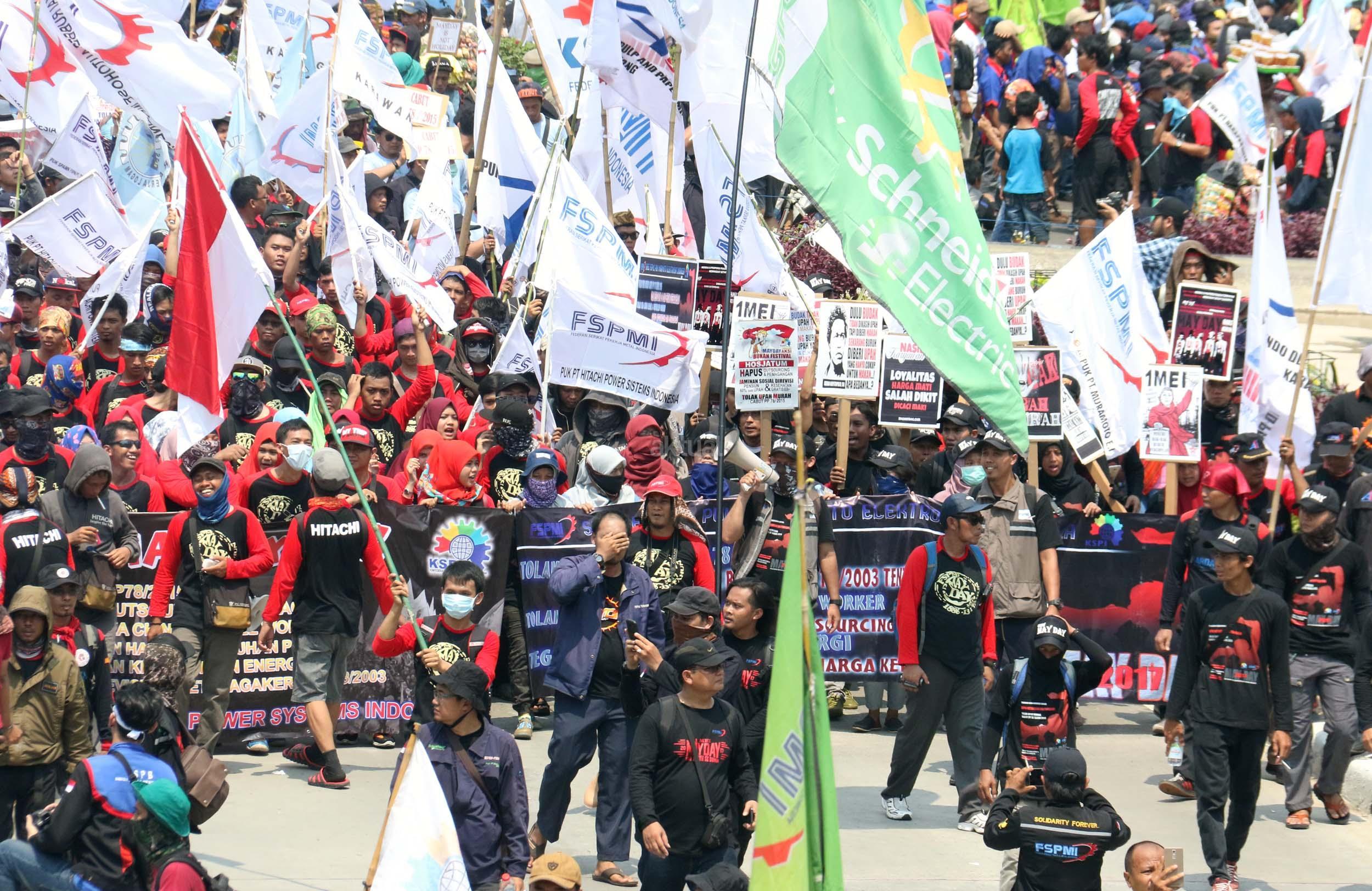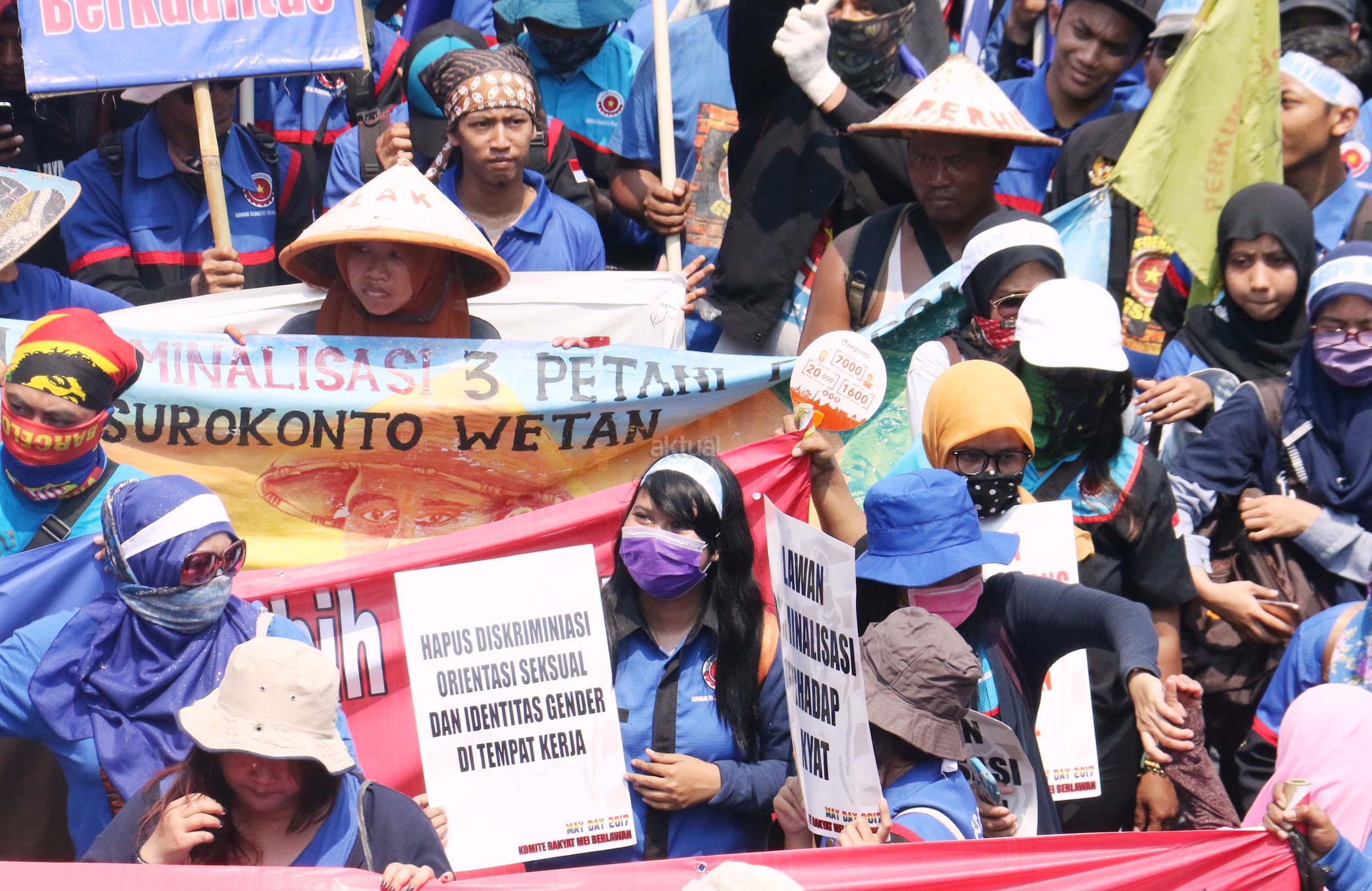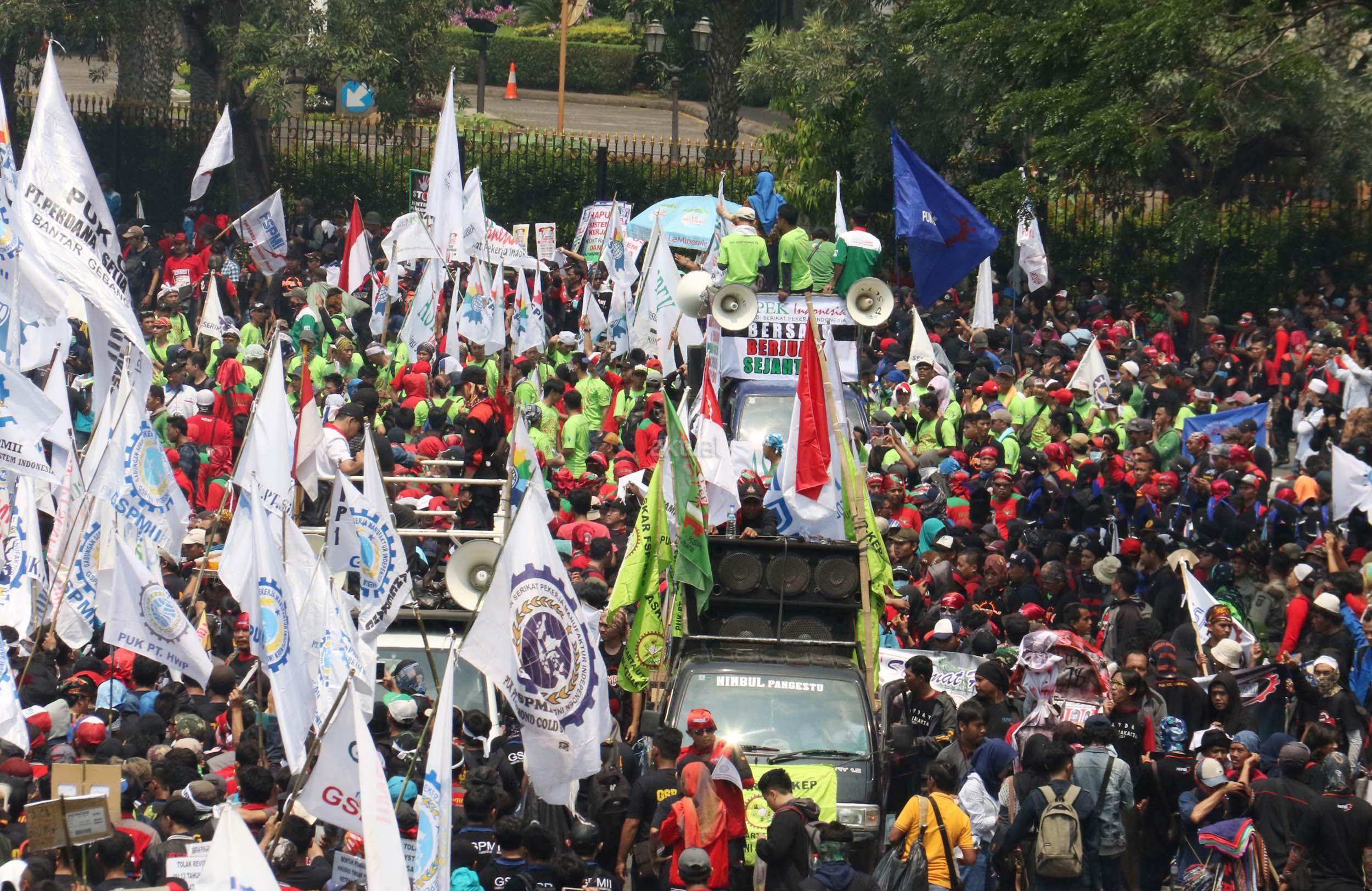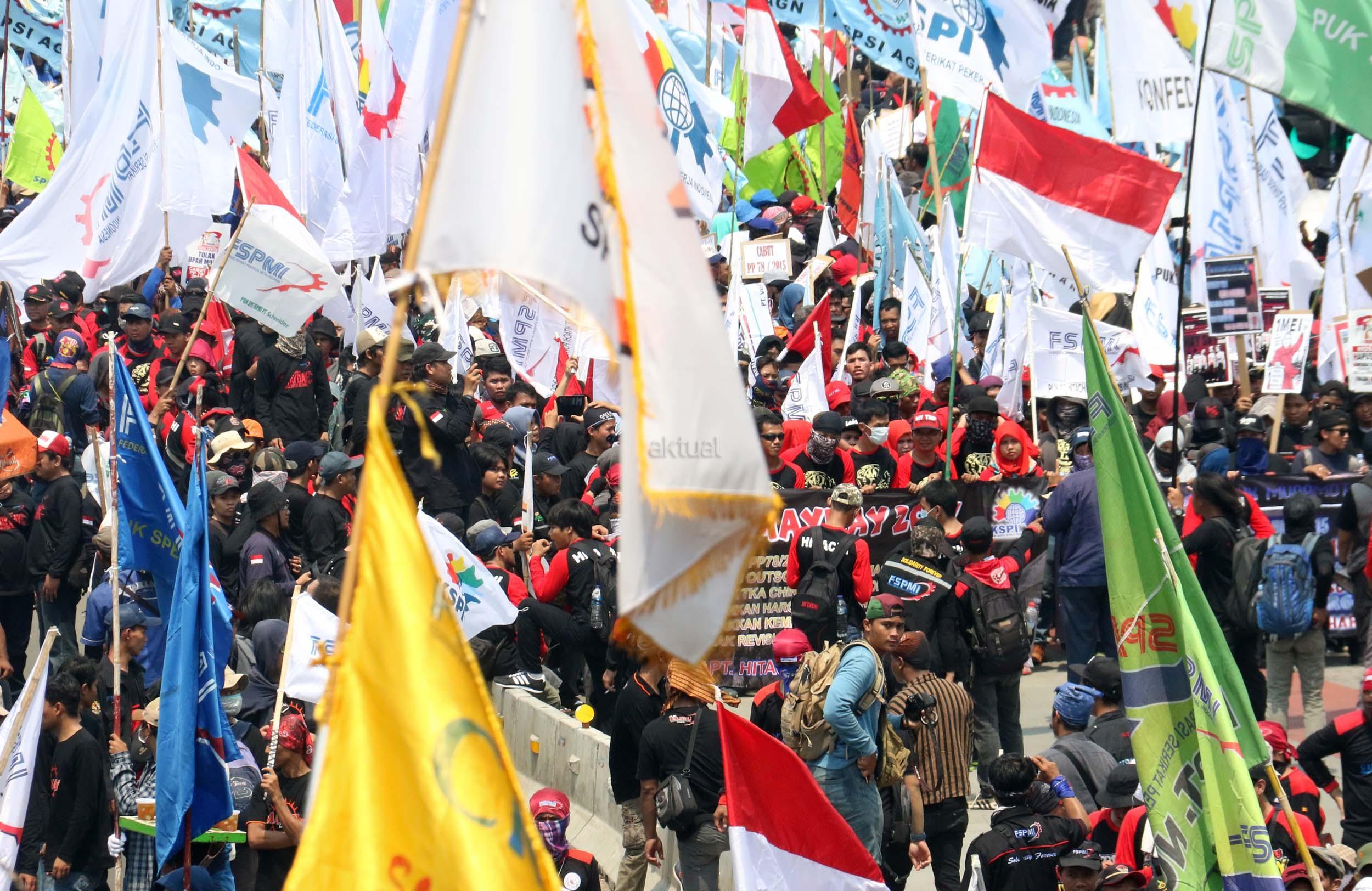 Hari Buruh sedunia diperingati ribuan buruh dari wilayah Jabodetabek dengan menggelar aksi unjuk rasa menuntut penghapusan outsourcing, jaminan sosial pekerja dan tolak upah murah. AKTUAL/Munzir