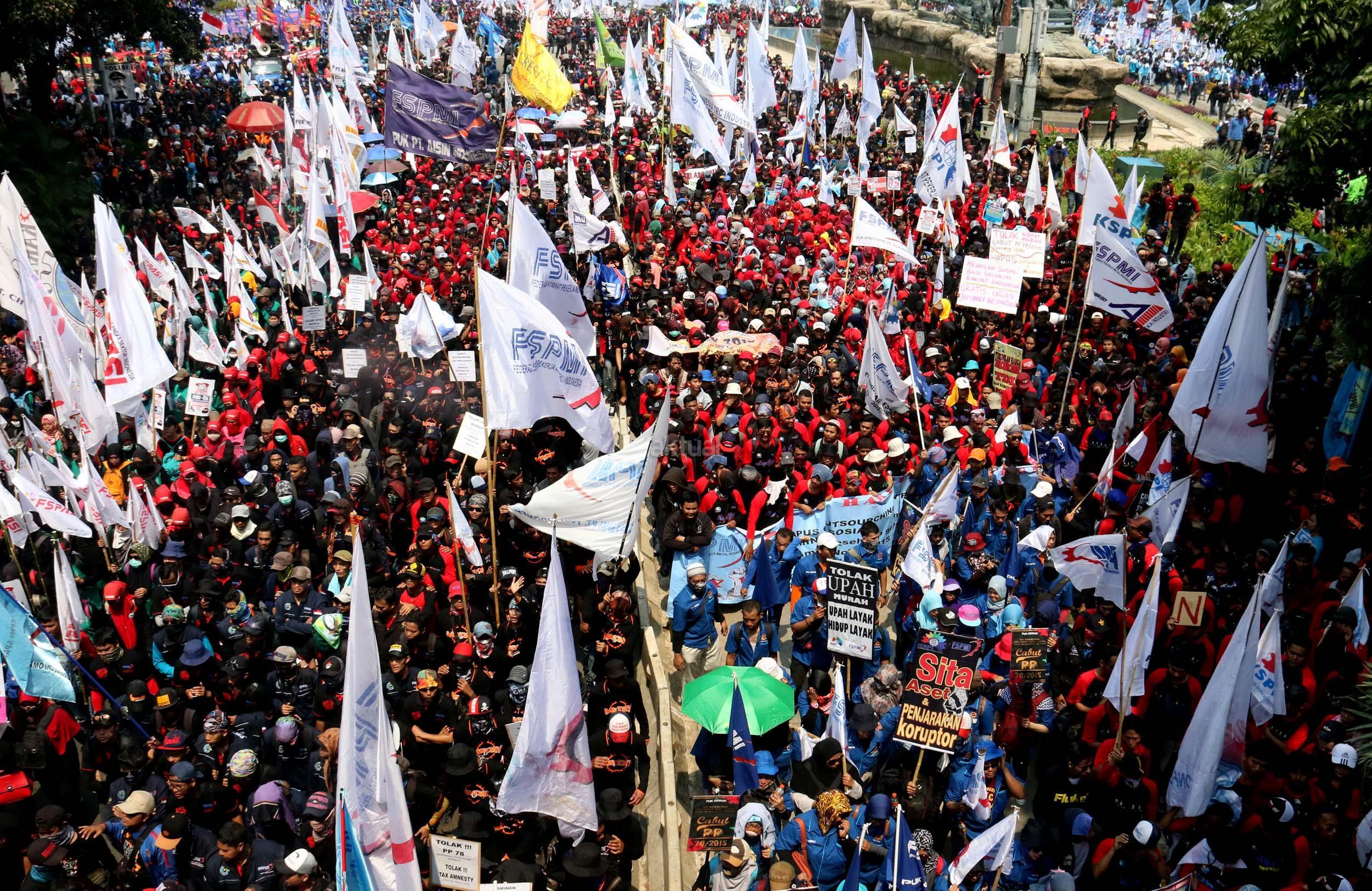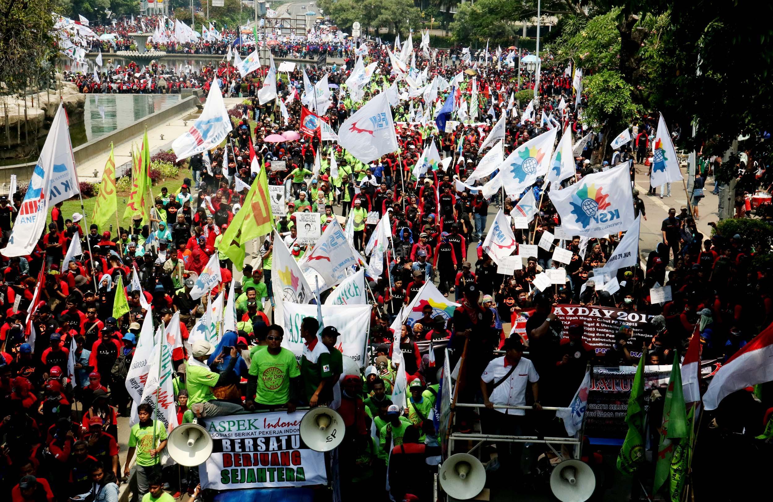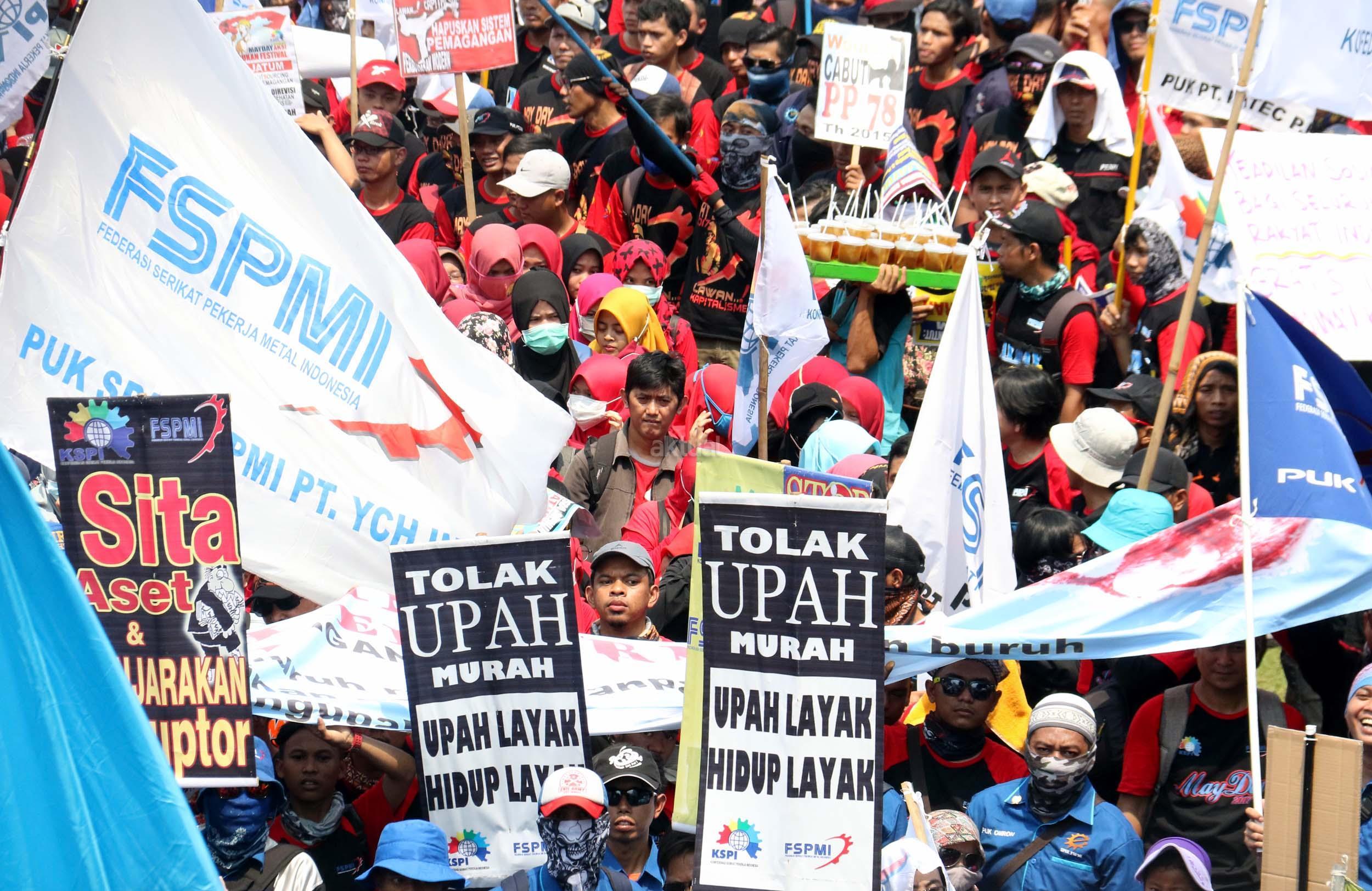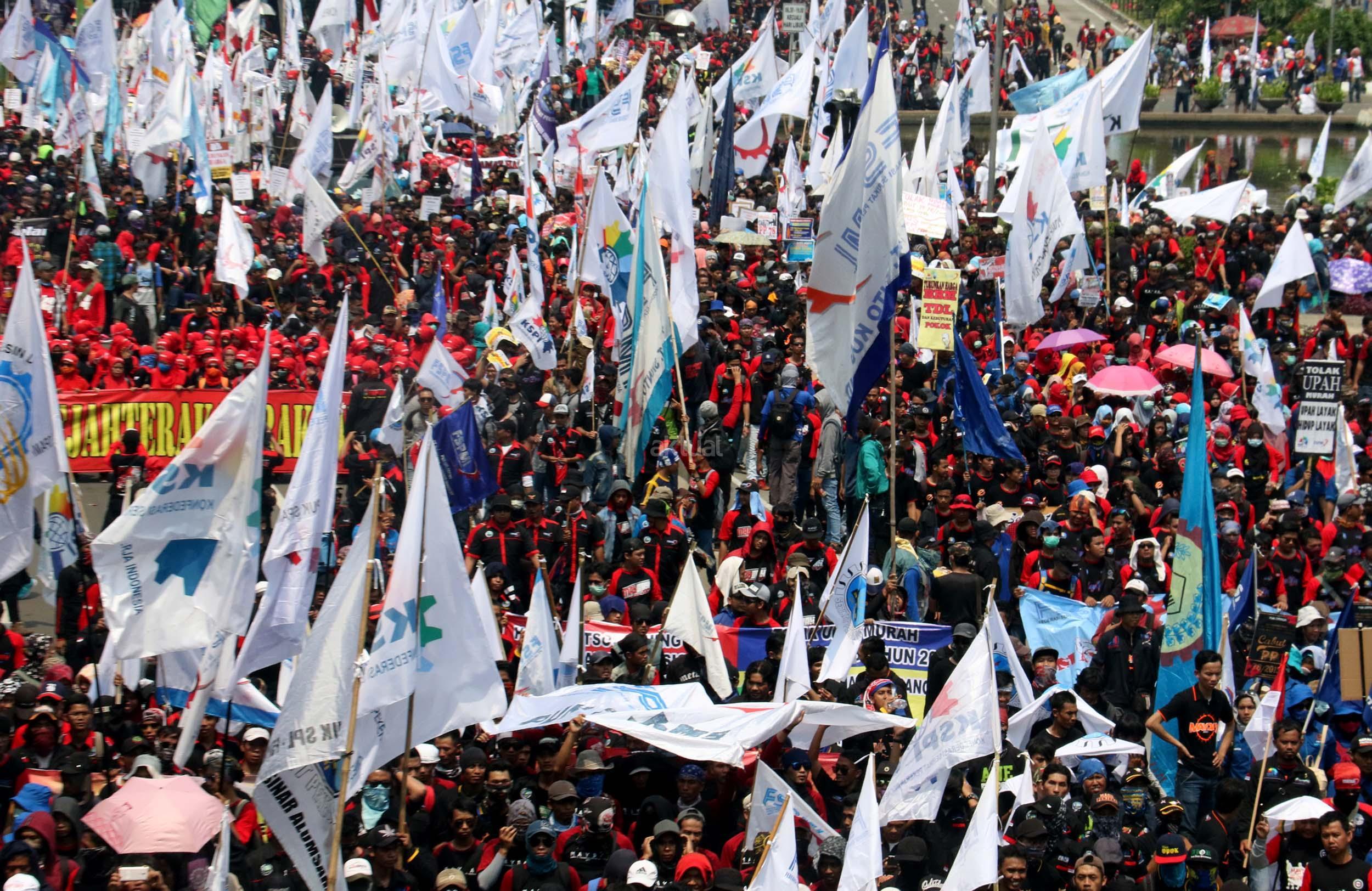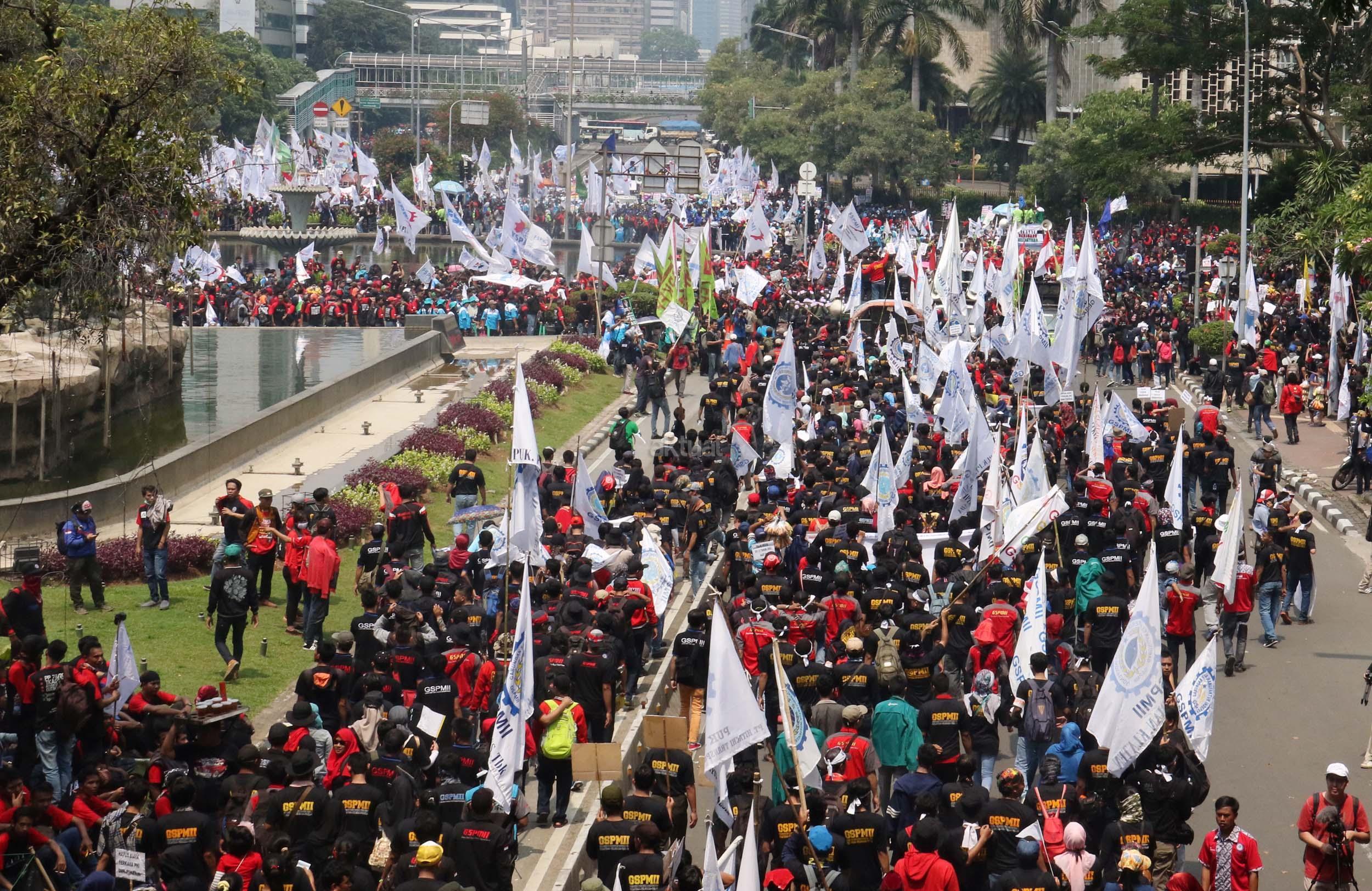Hari Buruh sedunia diperingati ribuan buruh dari wilayah Jabodetabek dengan menggelar aksi unjuk rasa menuntut penghapusan outsourcing, jaminan sosial pekerja dan tolak upah murah. AKTUAL/Munzir