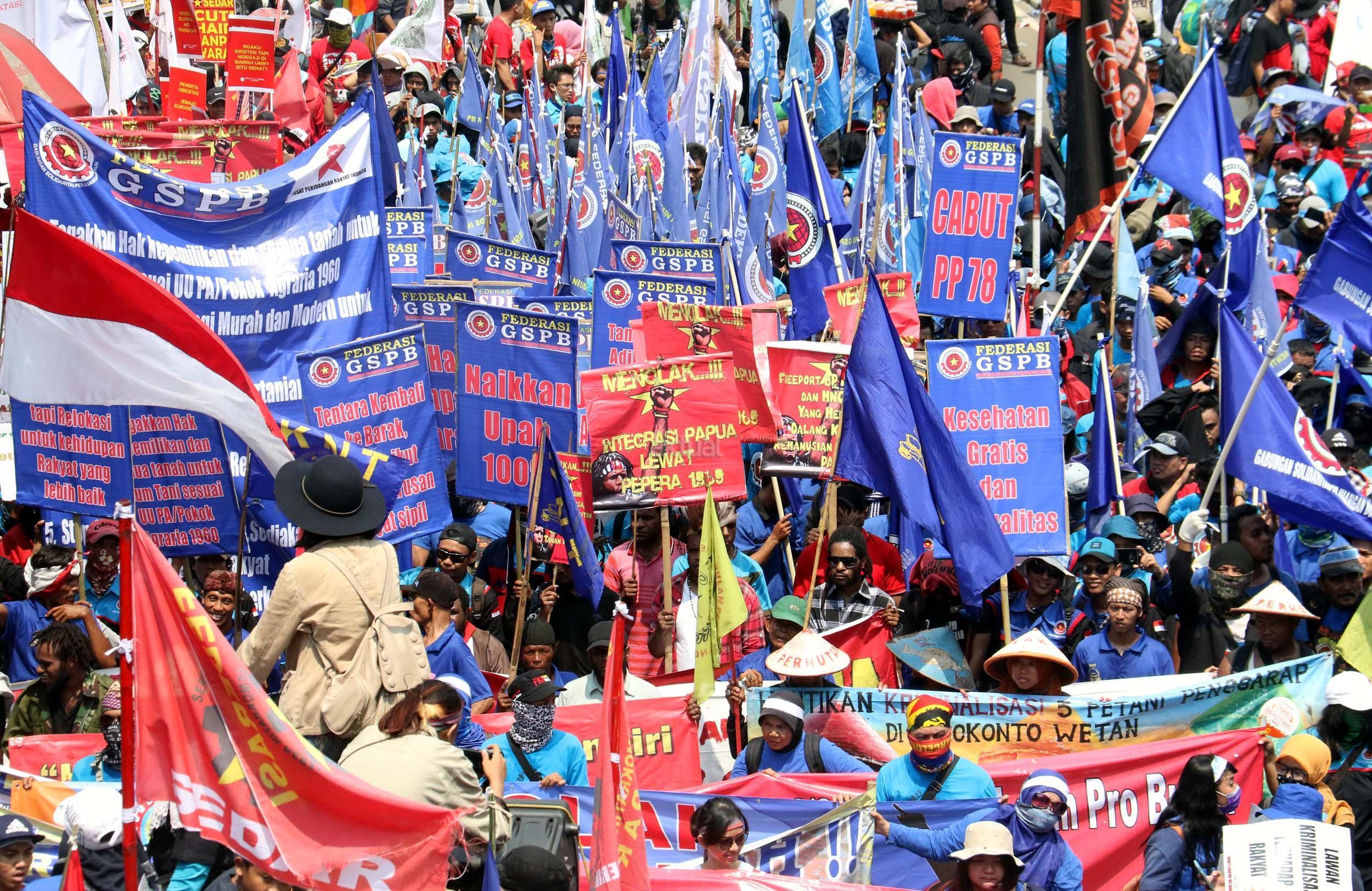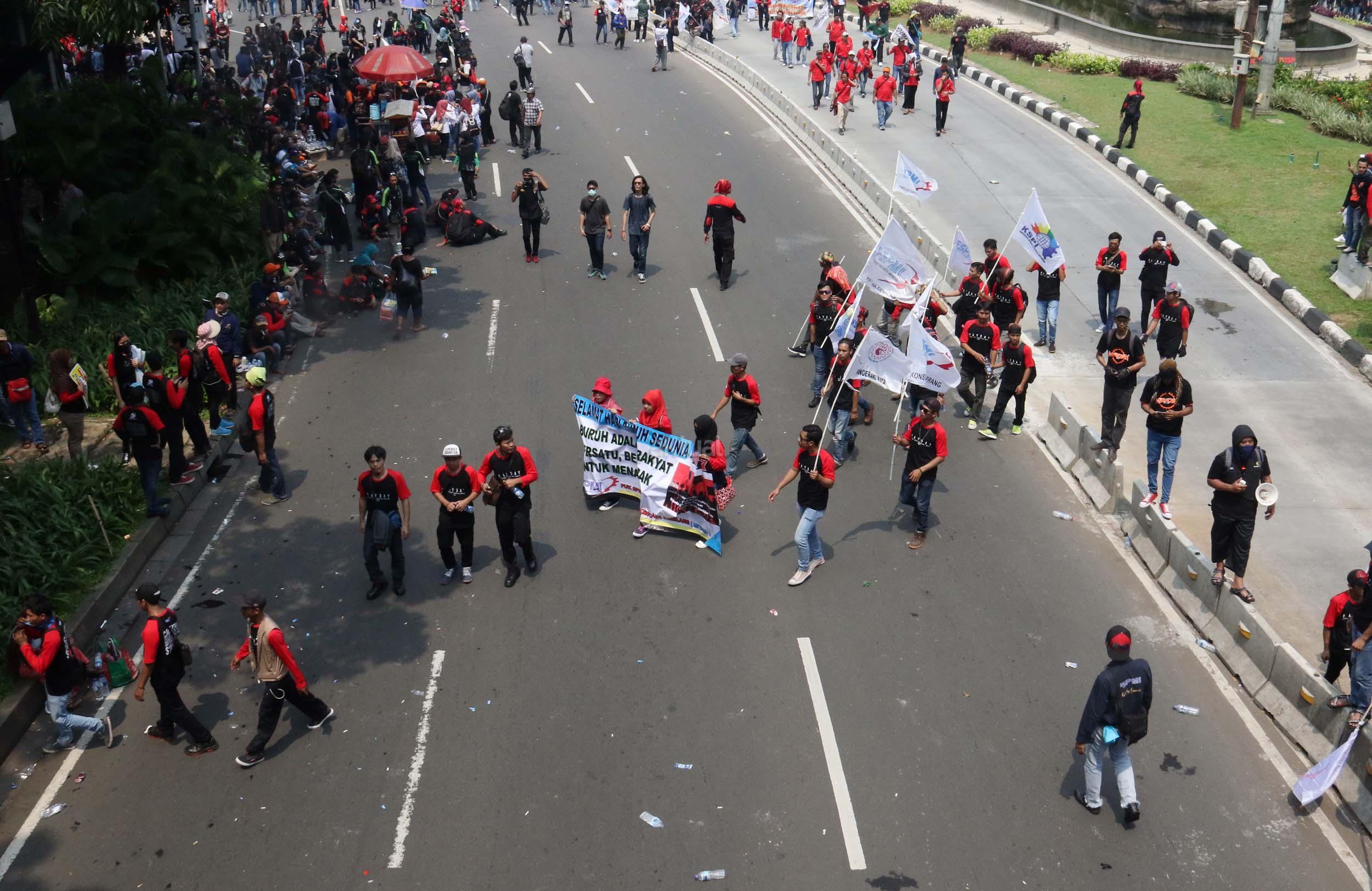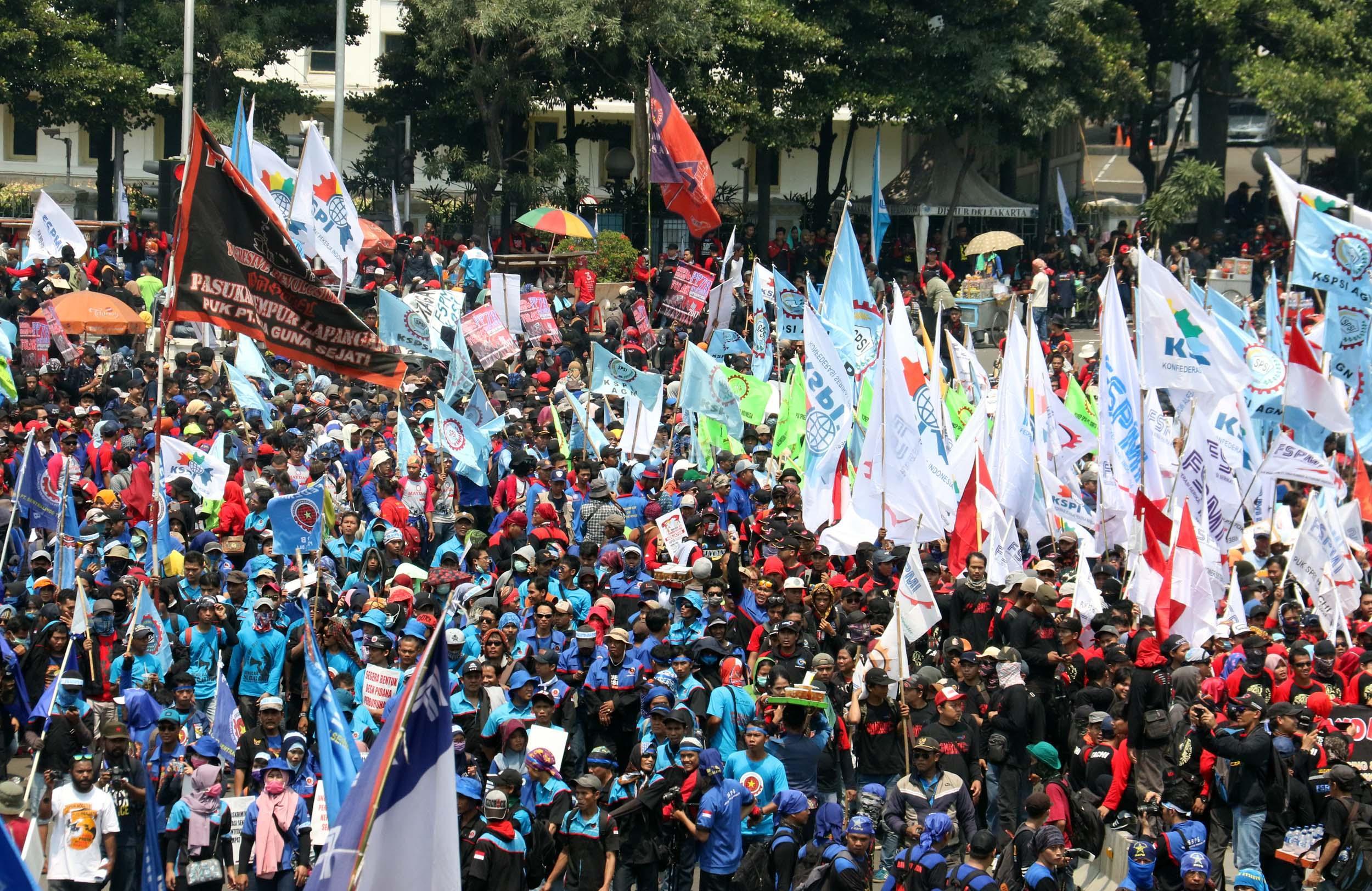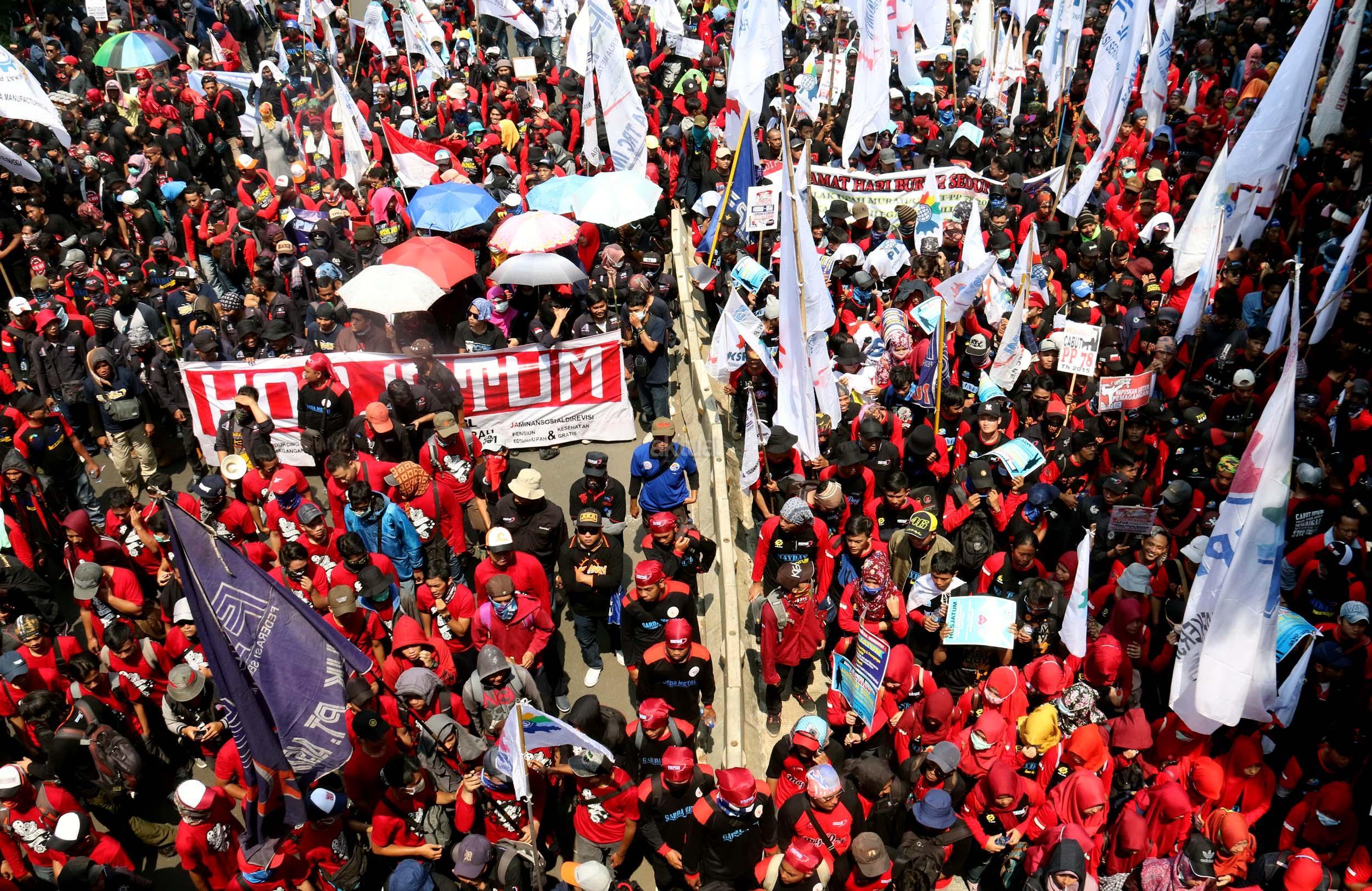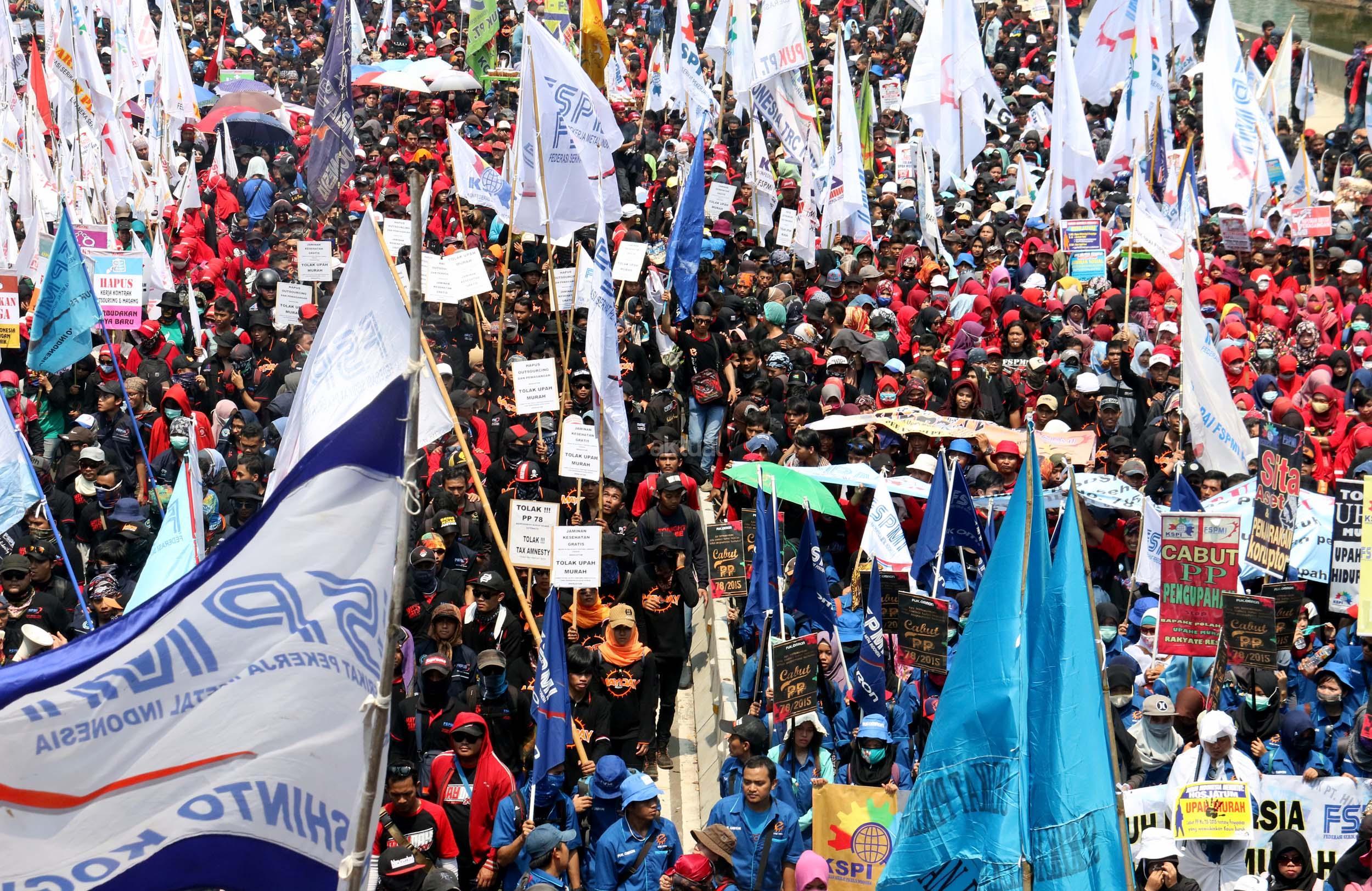 Hari Buruh sedunia diperingati ribuan buruh dari wilayah Jabodetabek dengan menggelar aksi unjuk rasa menuntut penghapusan outsourcing, jaminan sosial pekerja dan tolak upah murah. AKTUAL/Munzir