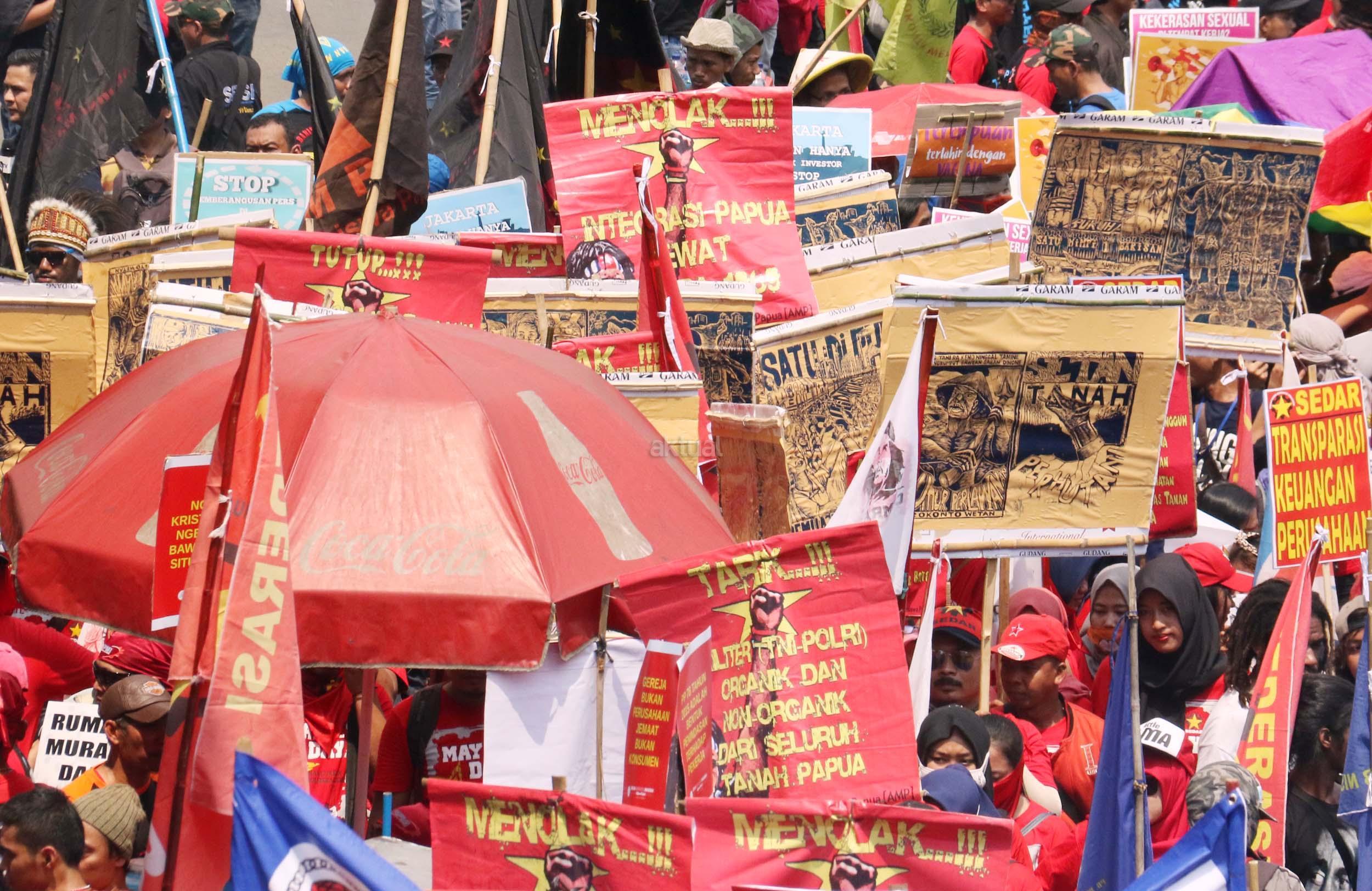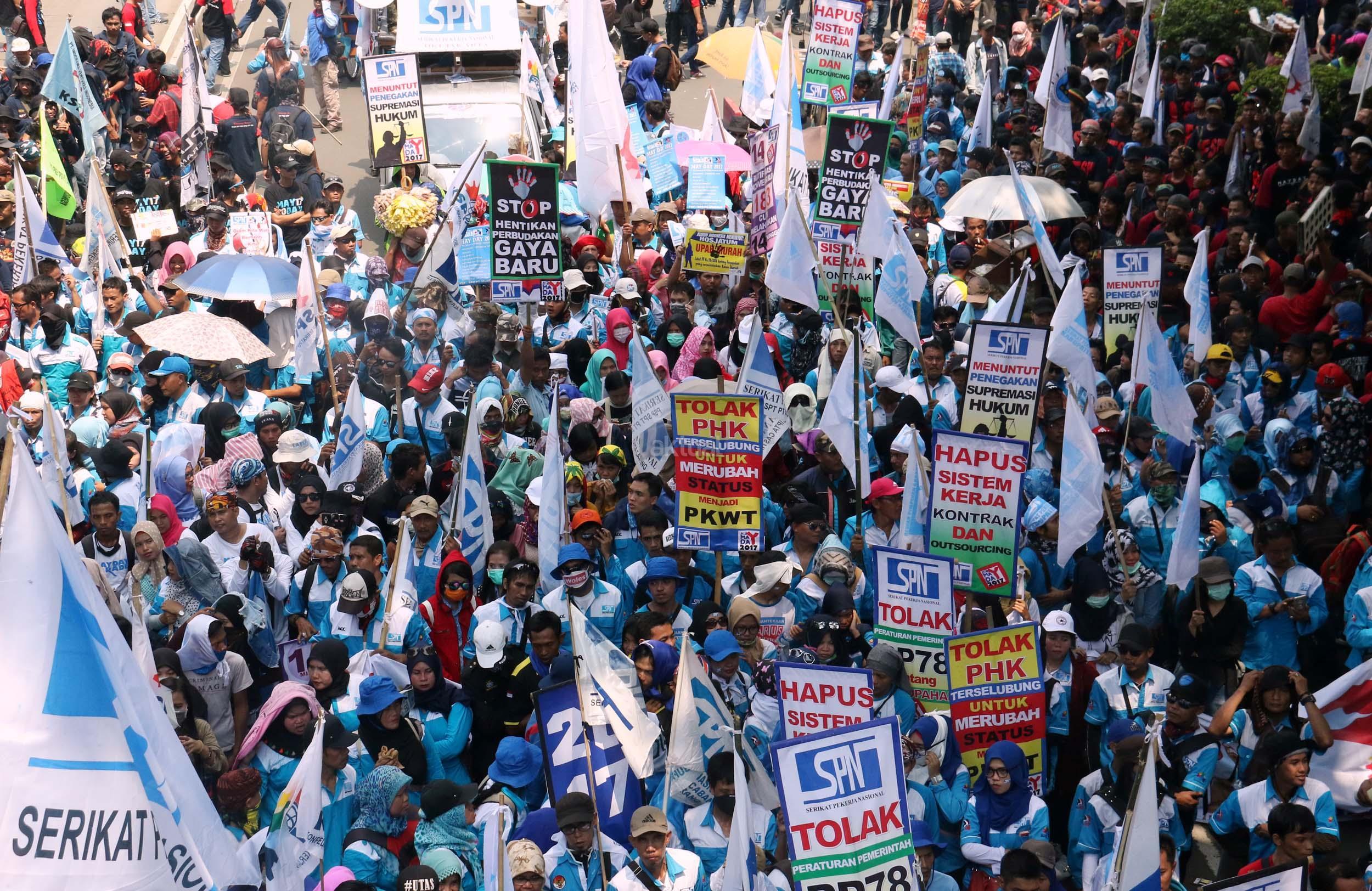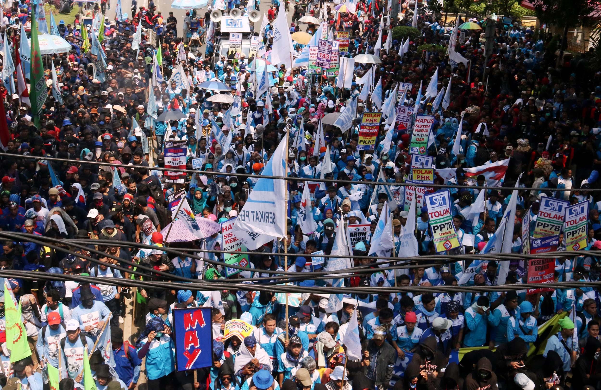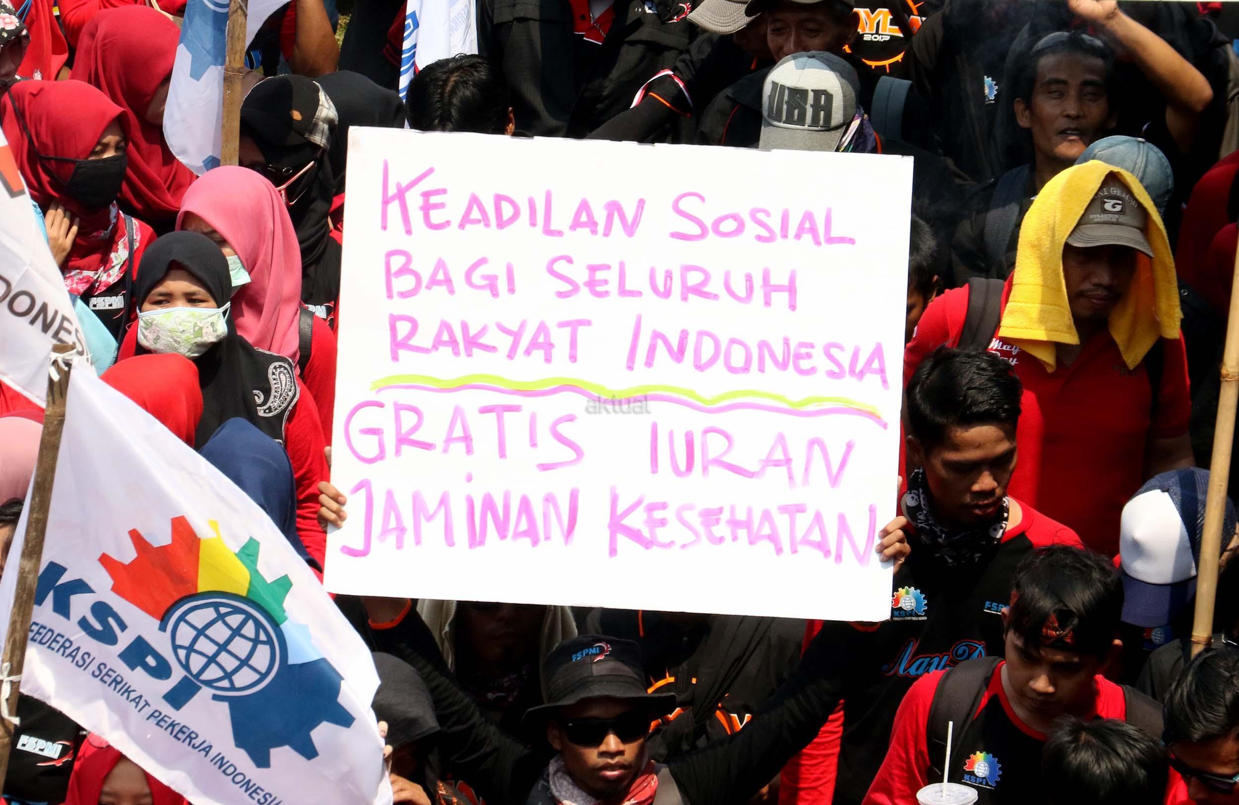 Hari Buruh sedunia diperingati ribuan buruh dari wilayah Jabodetabek dengan menggelar aksi unjuk rasa menuntut penghapusan outsourcing, jaminan sosial pekerja dan tolak upah murah. AKTUAL/Munzir