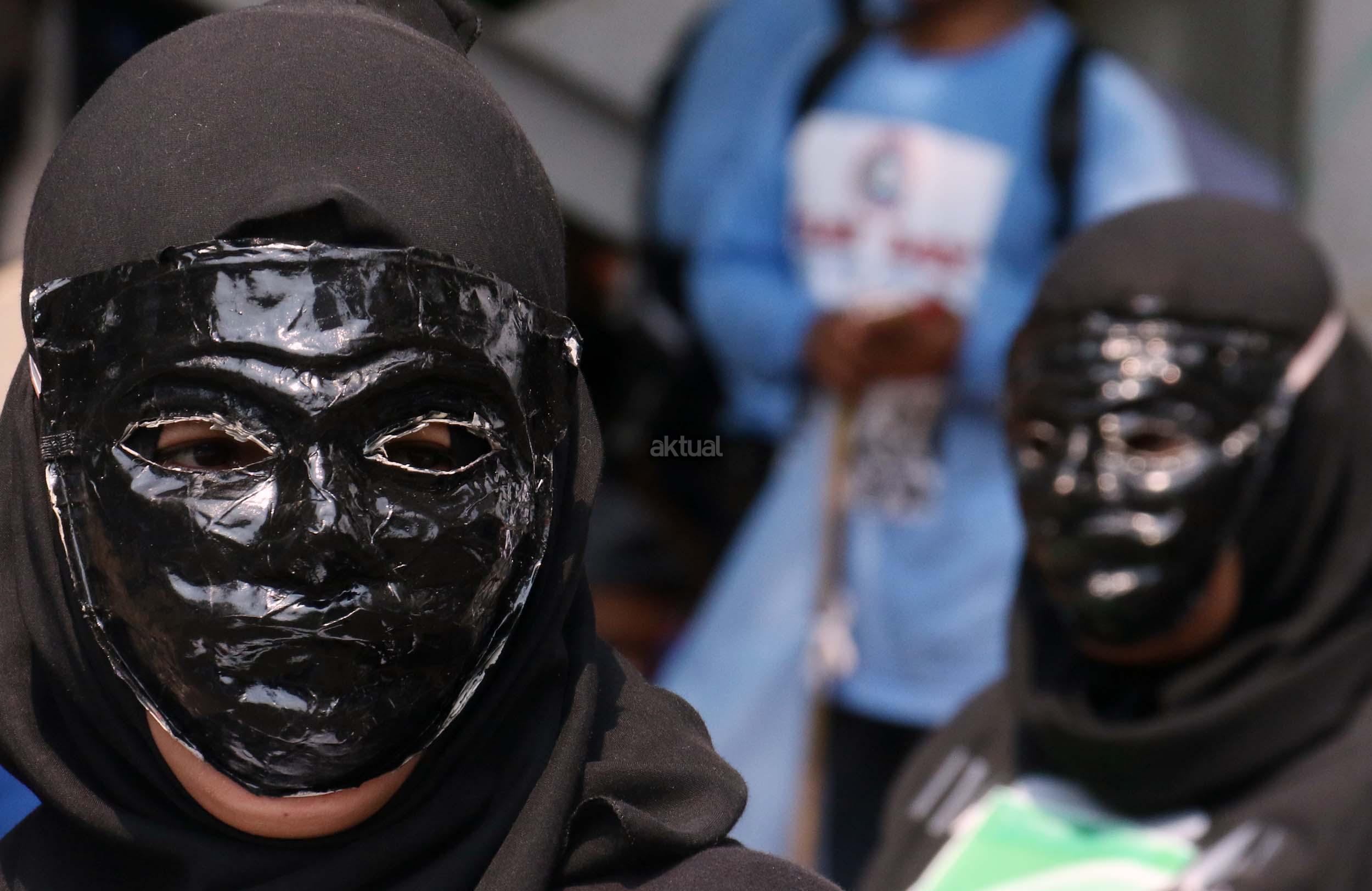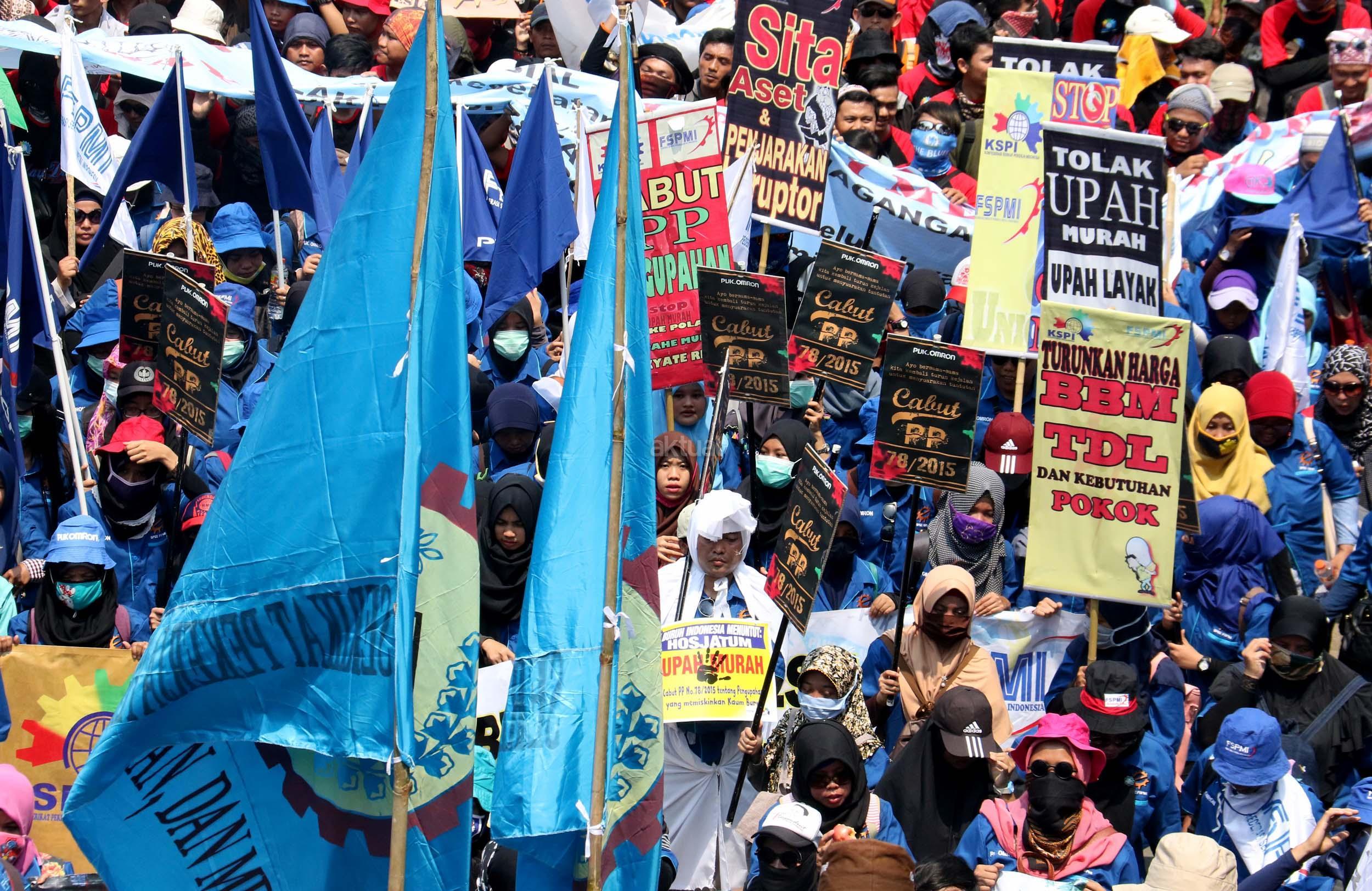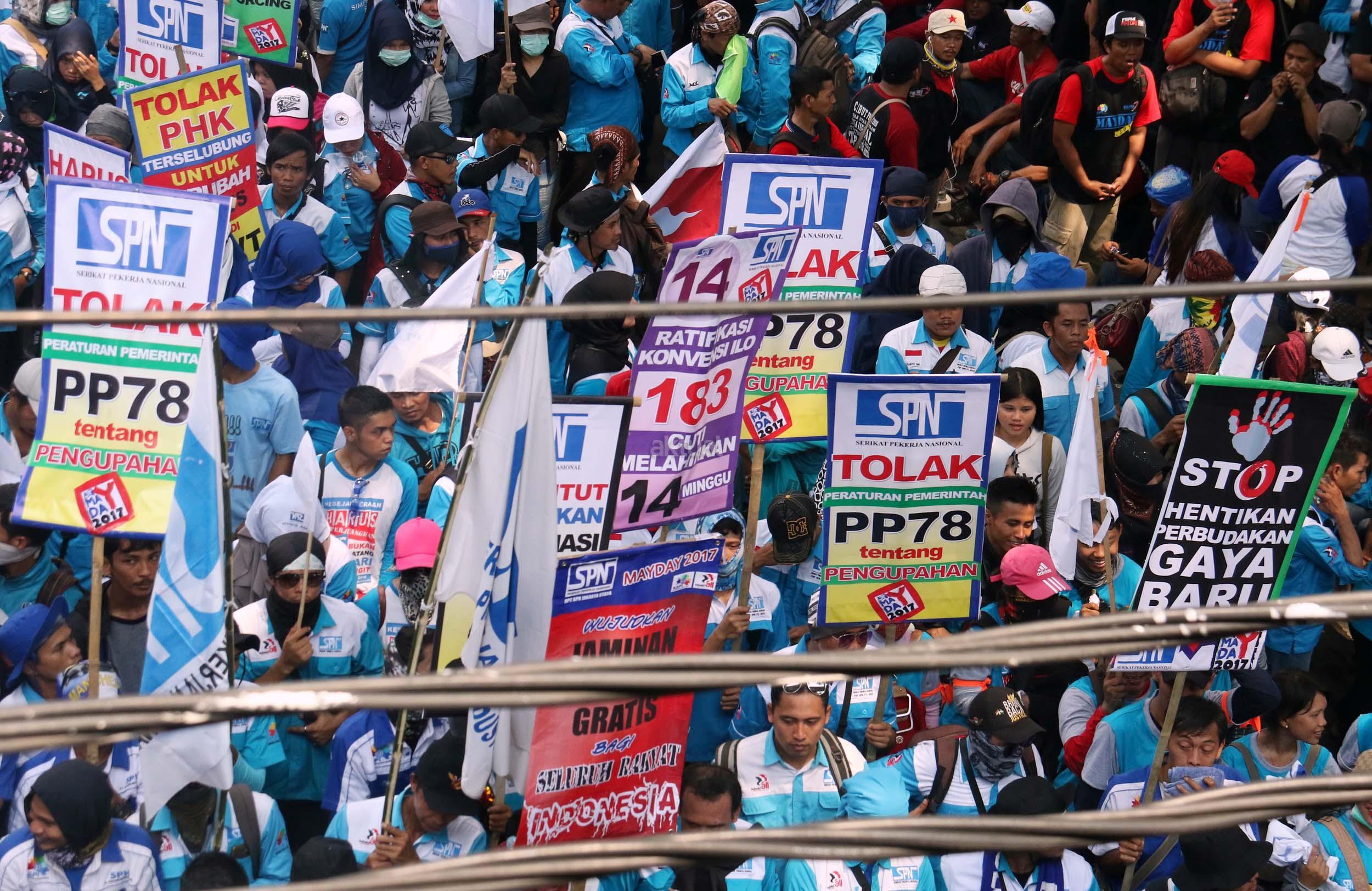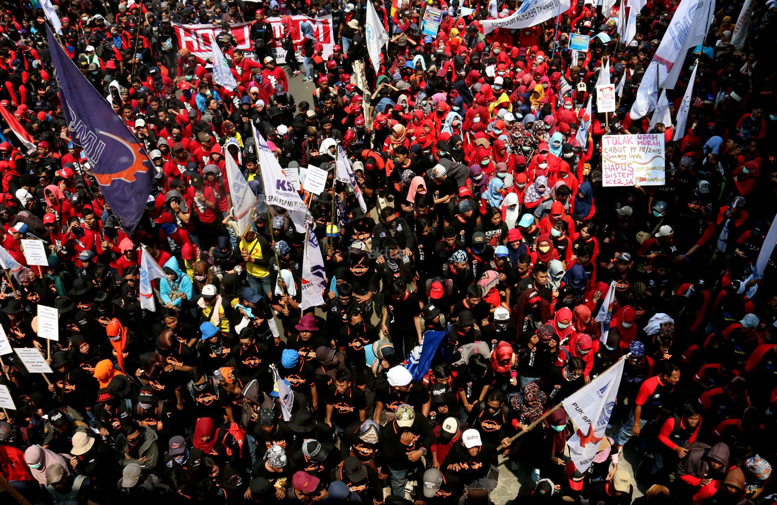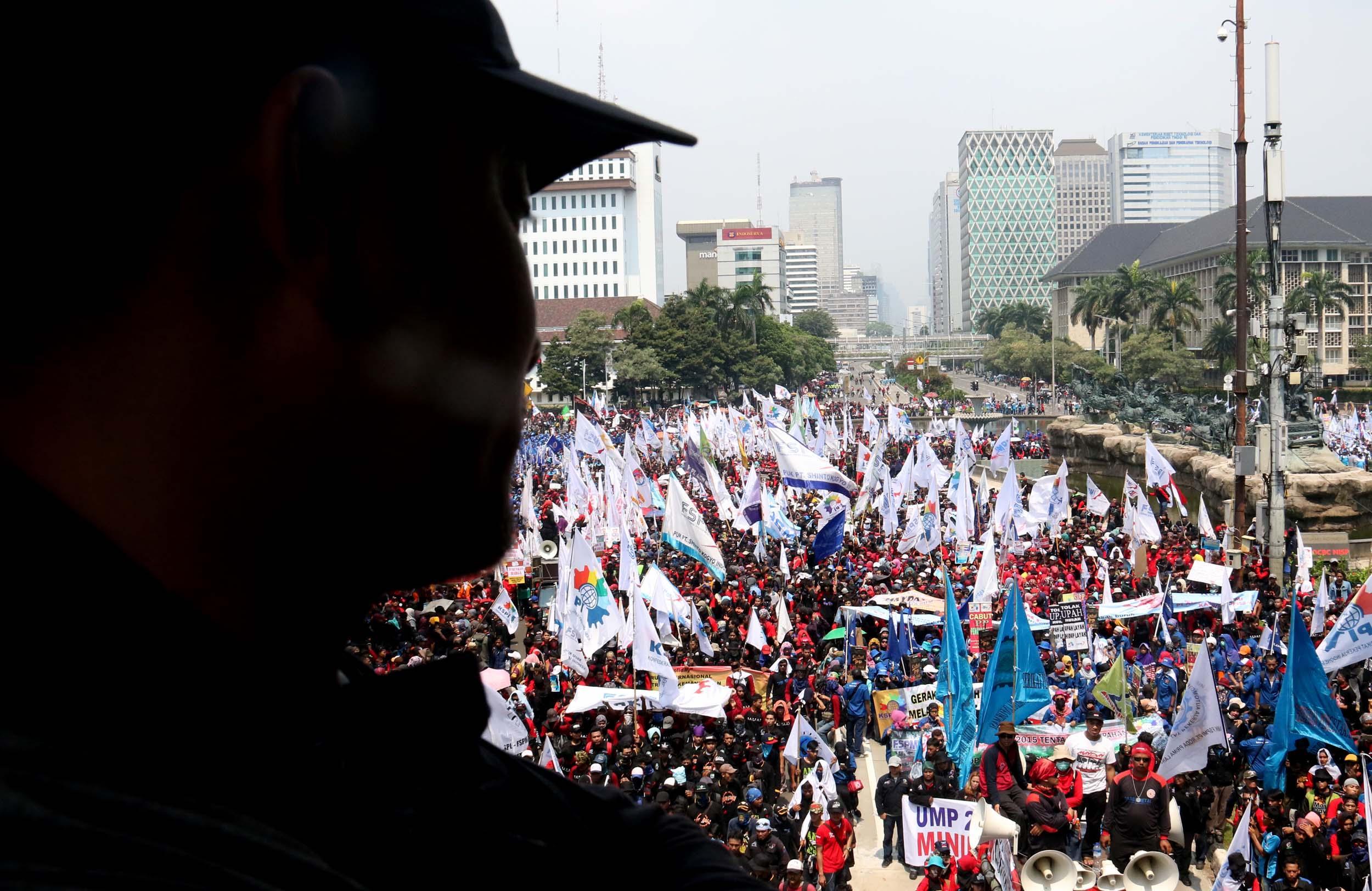 Hari Buruh sedunia diperingati ribuan buruh dari wilayah Jabodetabek dengan menggelar aksi unjuk rasa menuntut penghapusan outsourcing, jaminan sosial pekerja dan tolak upah murah. AKTUAL/Munzir