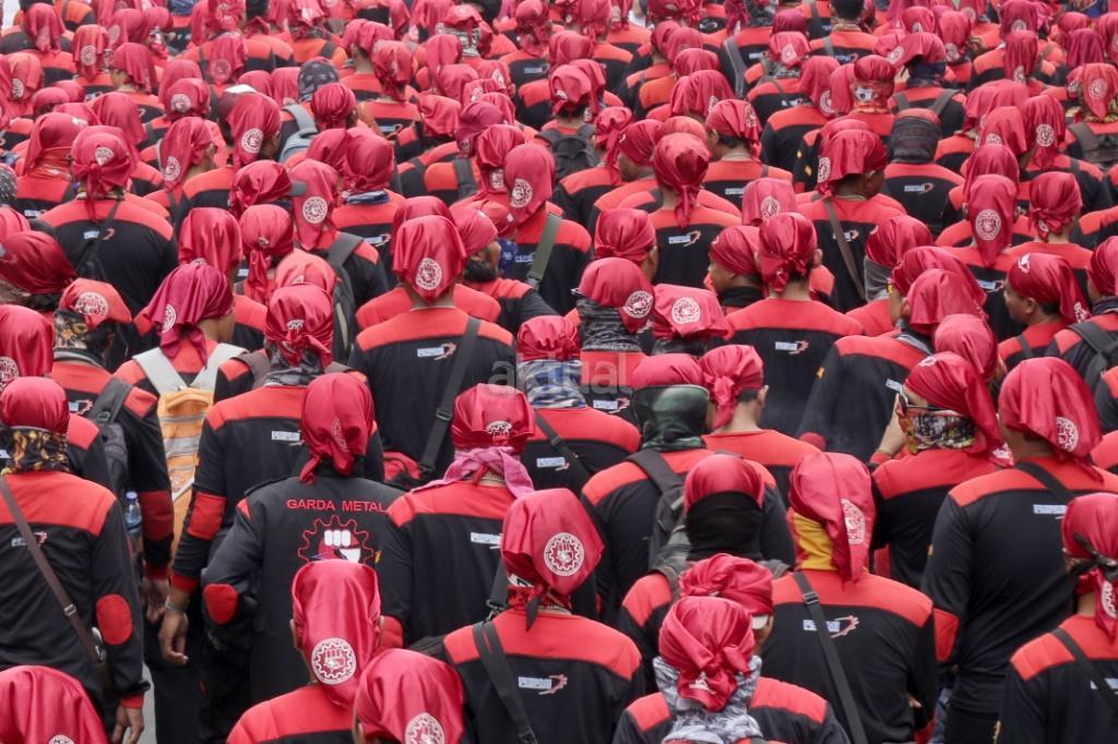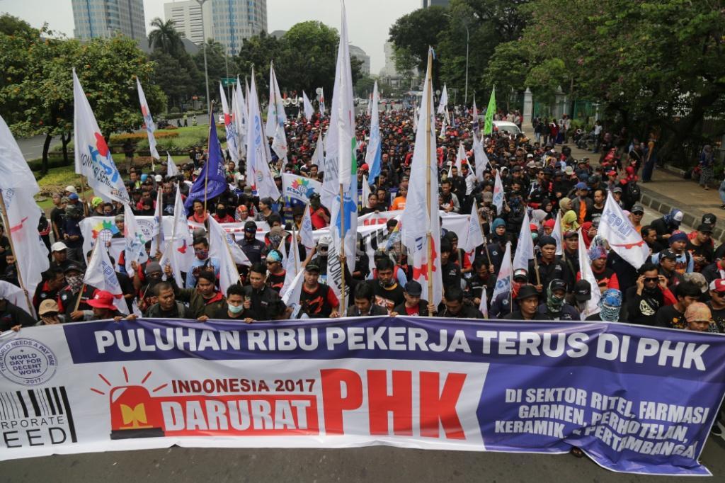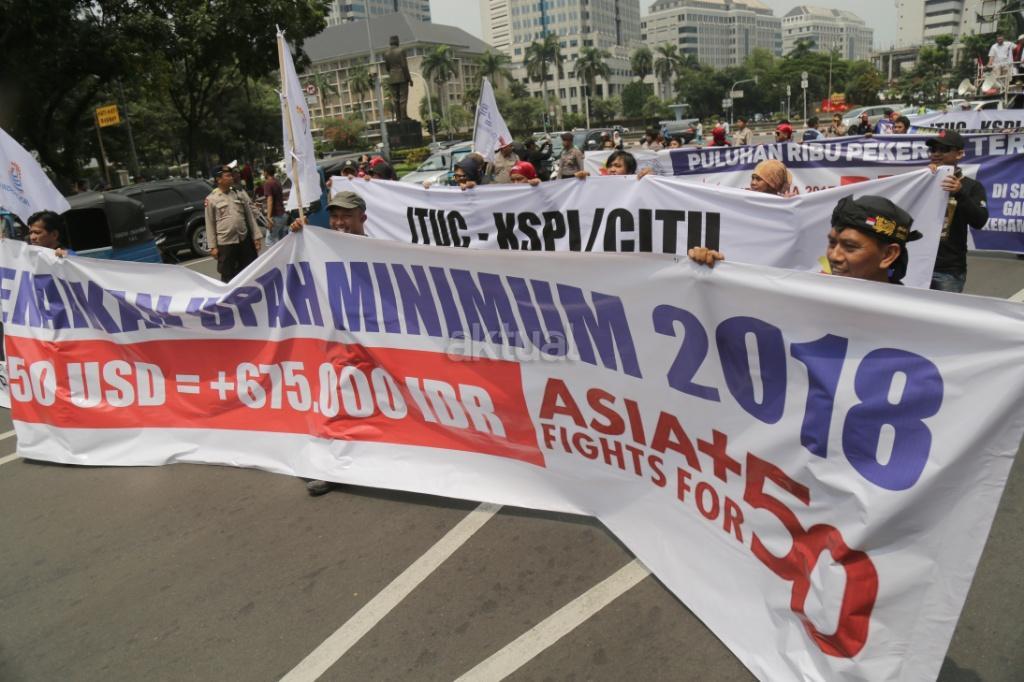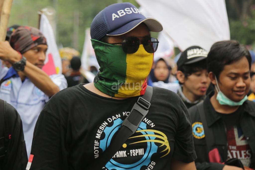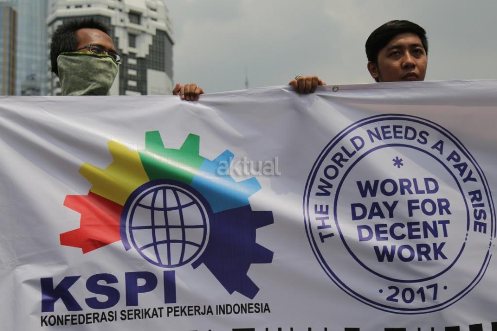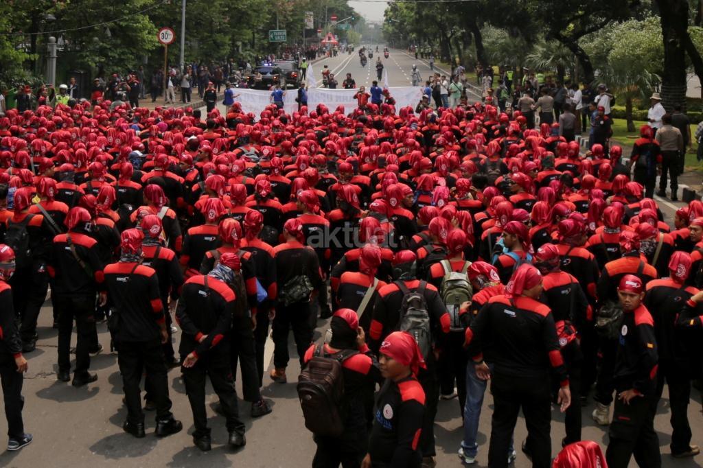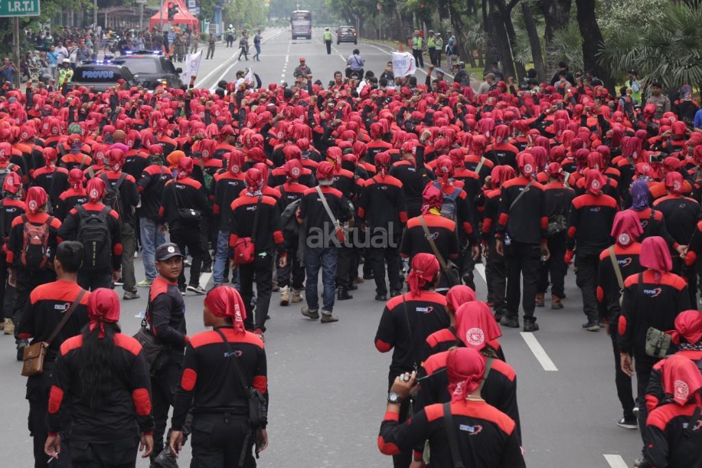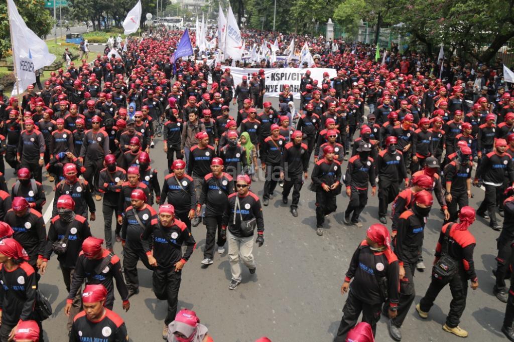Ribuan buruh yang tergabung salam Konfederasi Serikat Pekerja Indonesia (KSPI) melakukan long march di kawasan Monas, Jakarta, Sabtu (7/10/207). Tuntutan terkait peningkatan kualitas jaminan kesehatan disuarakan, mengingat pemberian layanan itu kepada pekerja dirasa masih buruk. Sementara itu, penolakan terhadap upah murah dilakukan mengingat dampaknya kepada kesejahteraan buruh, serta perekonomian nasional. AKTUAL/Tino Oktaviano