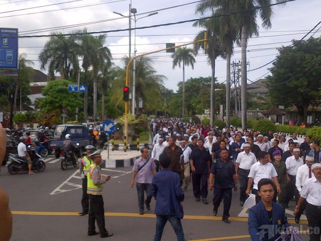 Tak muat memenuhi areal PN Sudirman juga meluber ke jalan raya. Polisi terpaksa menutup arus lalu lintas di depan PN Denpasar. Jumlah massa yang membludak membuat kemacetan di Jalan Yos Sudarso-Sudirman.