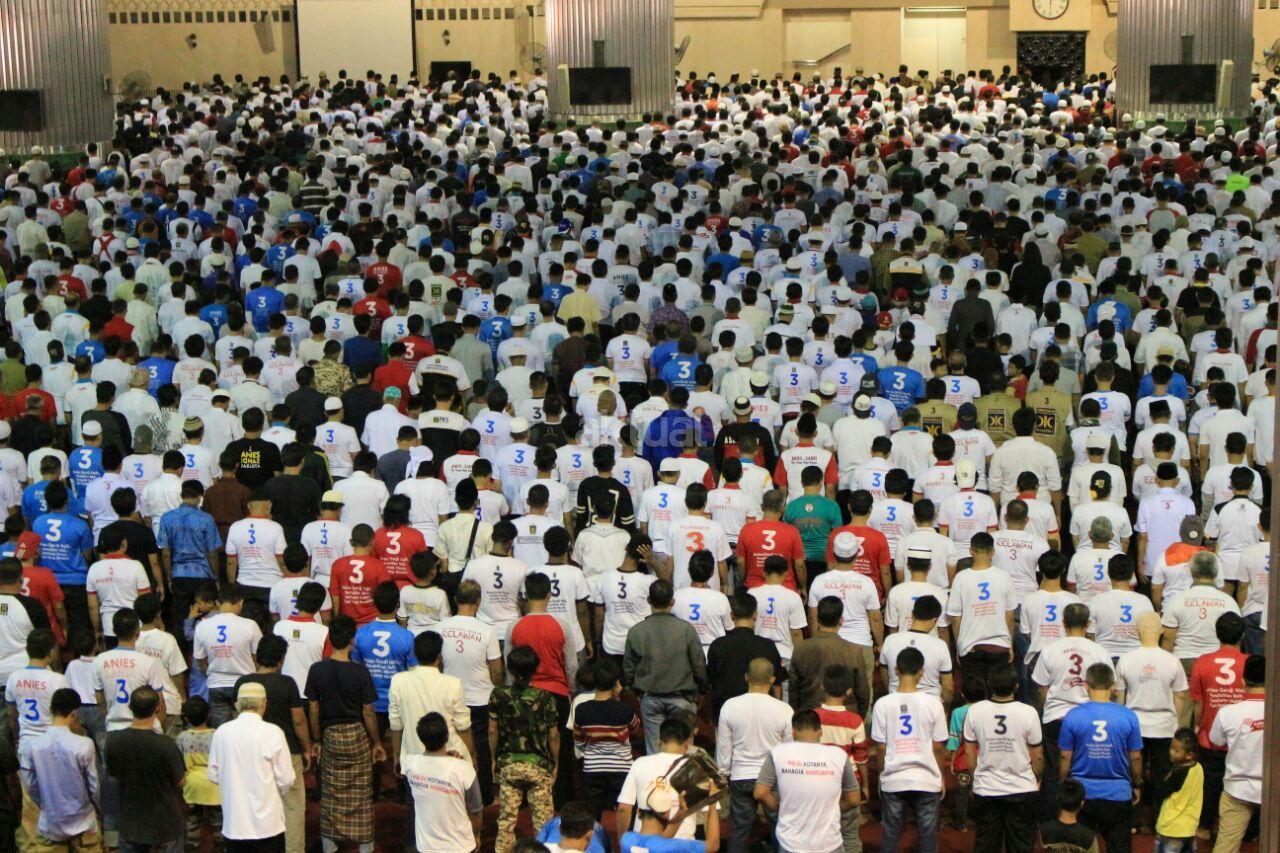 Massa pendukung pasangan cagub no 3 melakukan salat duhur bersama sebelum kampanye di Masjid Istiqlal, Jakarta Pusat, Minggu (5/2/2017). Kampanye ini dihadiri berbagai elemen pendukung juga turut hadir meramaikan kampanye akbar Anies-Sandi, seperti tokoh masyarakat dan para relawan pemenangan. AKTUAL/Tino Oktaviano