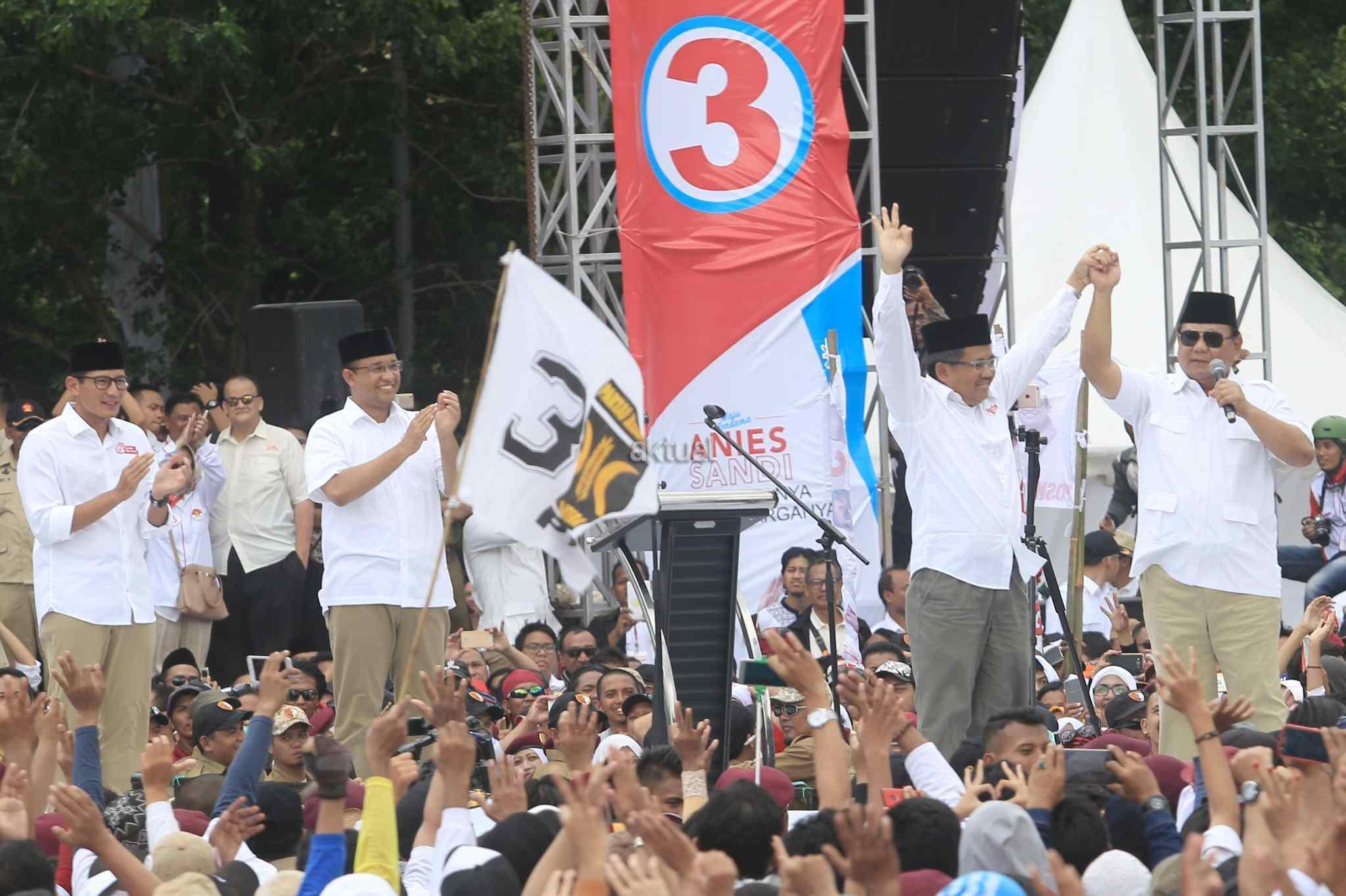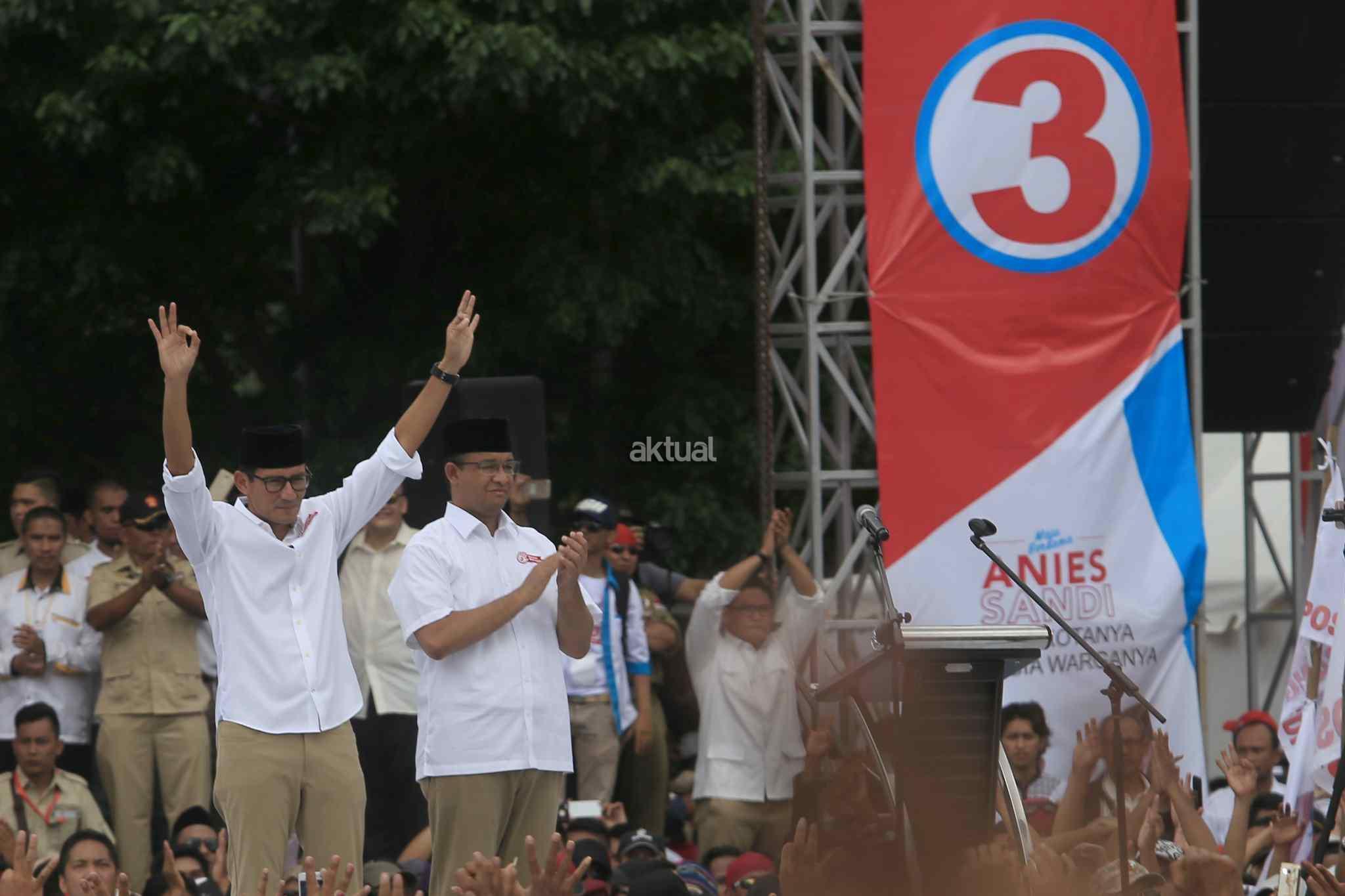 Pasangan Cagub dan Cawagub no urut 3, Anies Baswedan dan Sandiaga Uno saat kampanye akbar di Lapangan Banteng, Jakarta Pusat, Minggu (5/2/2017). Kampanye yang dihadiri Ketua Dewan Pembina sekaligus Ketua Umum Partai Gerindra Prabowo Subianto dan Presiden PKS Mohammad Sohibul Iman tersebut mengajak massa bagi yang belum menentukan pilihan dapat memilih Anies-Sandi di Pilgub DKI pada 15 Februari 2017 mendatang. AKTUAL/Tino Oktaviano