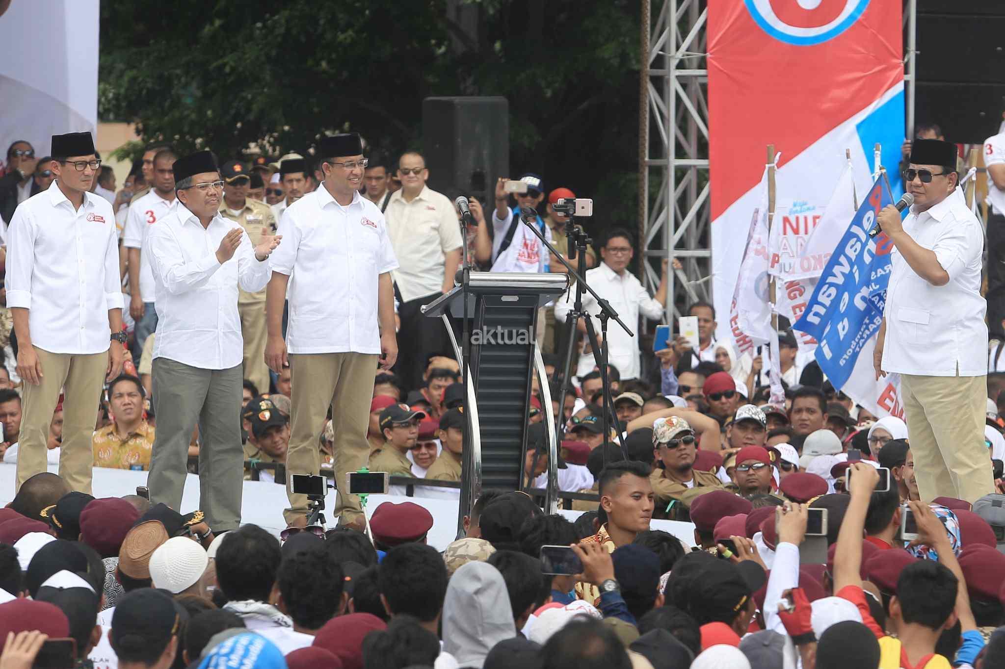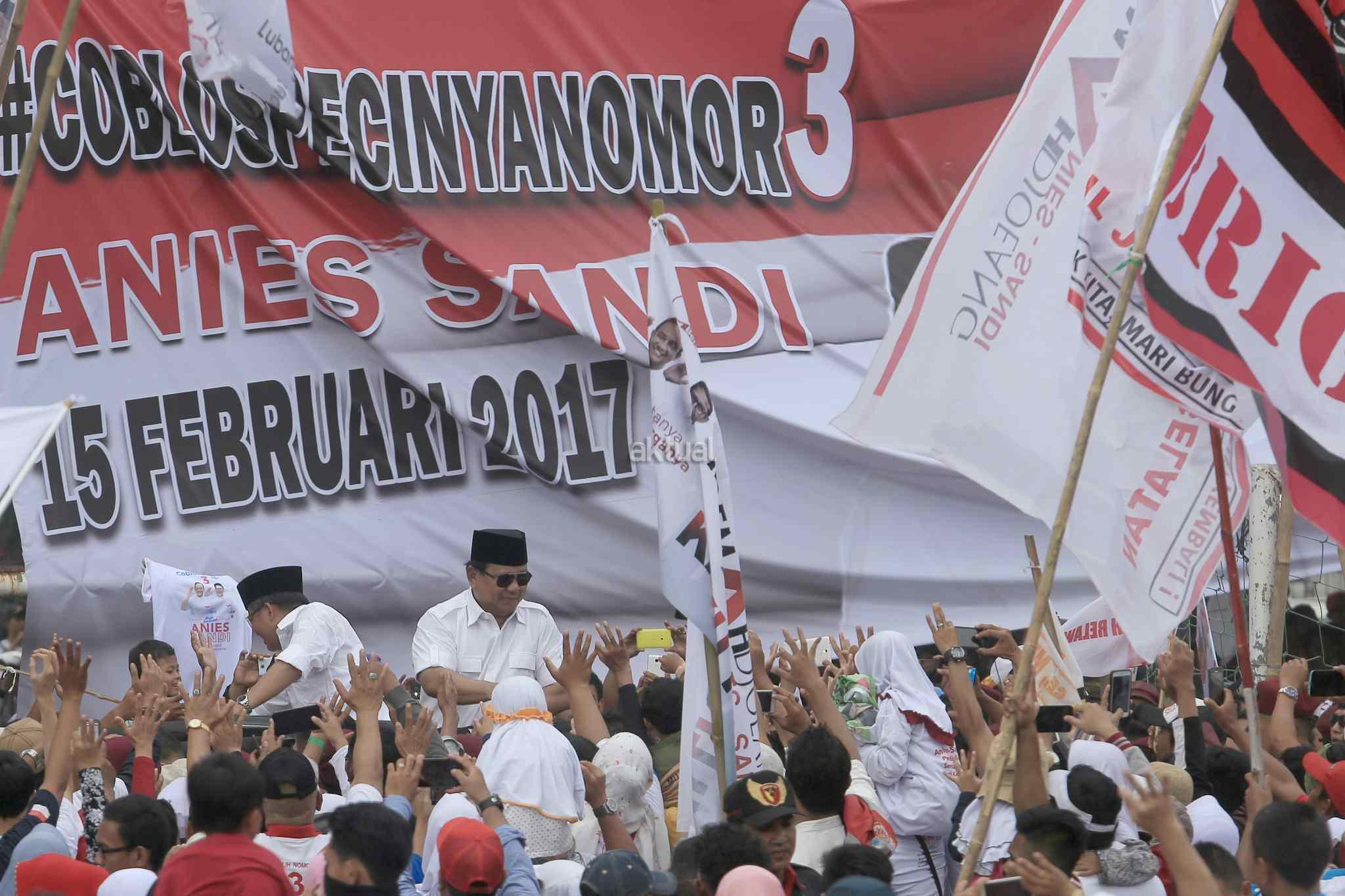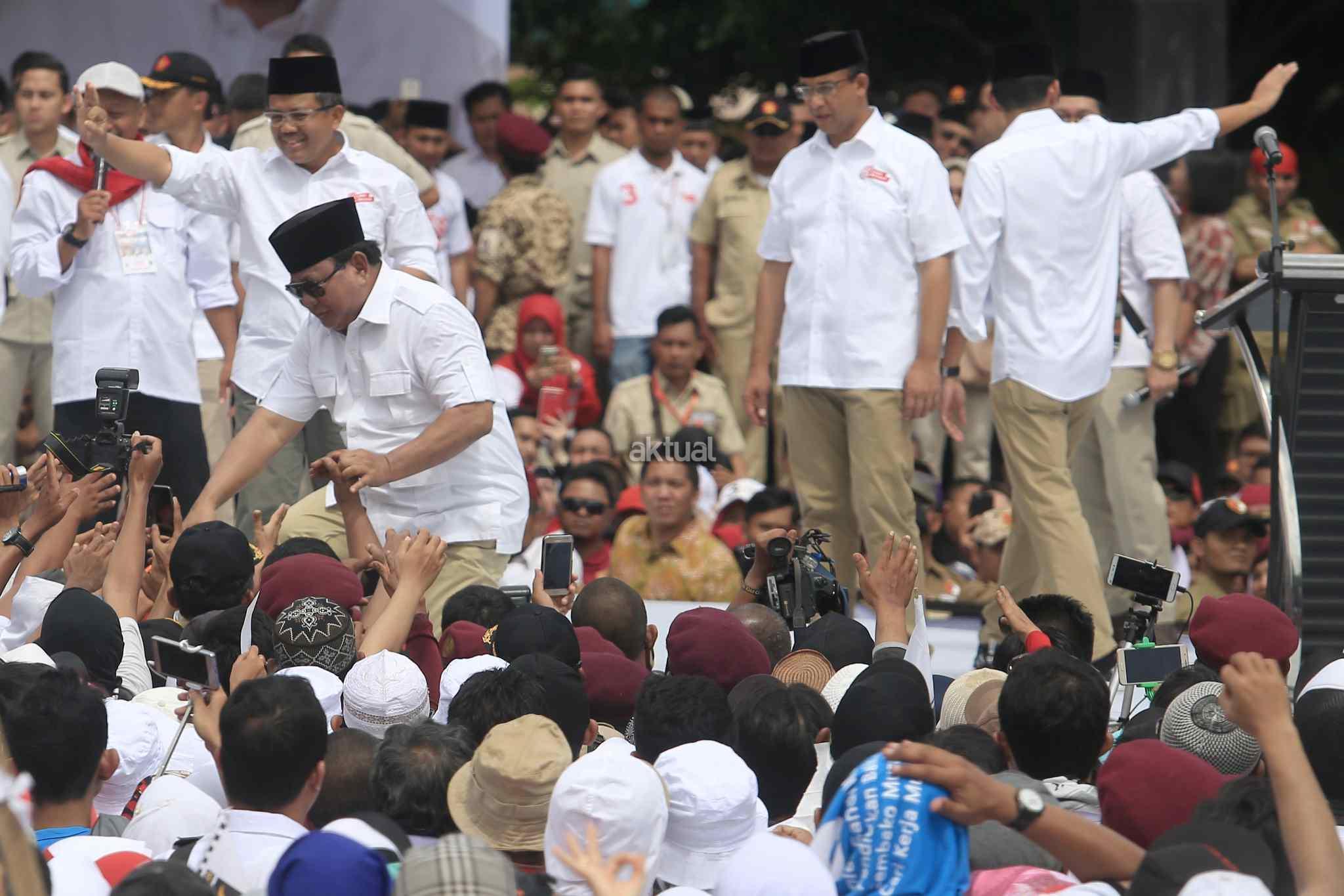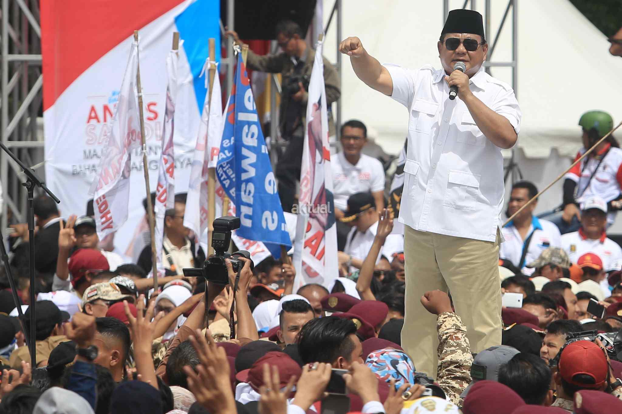 Ketua Dewan Pembina sekaligus Ketua Umum Partai Gerindra Prabowo Subianto saat kampanye akbar di Lapangan Banteng, Jakarta Pusat, Minggu (5/2/2017). Kampanye ini dihadiri berbagai elemen pendukung juga turut hadir meramaikan kampanye akbar Anies-Sandi, seperti tokoh masyarakat dan para relawan pemenangan. AKTUAL/Tino Oktaviano