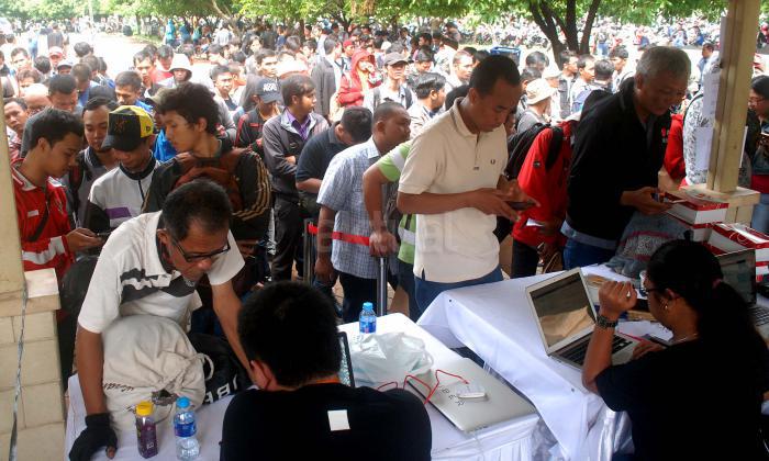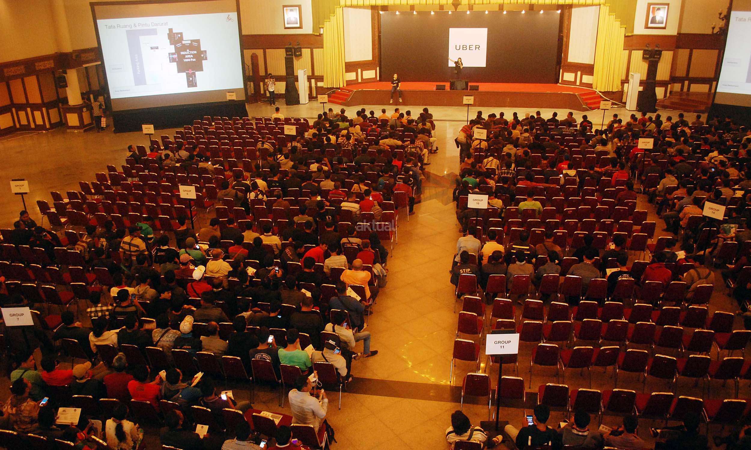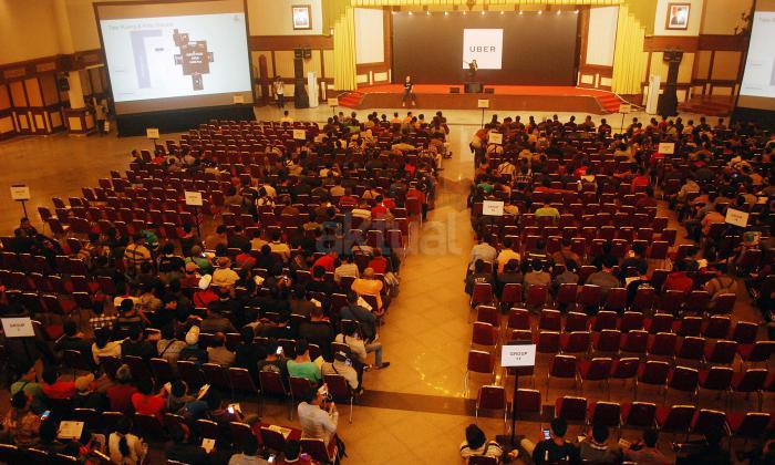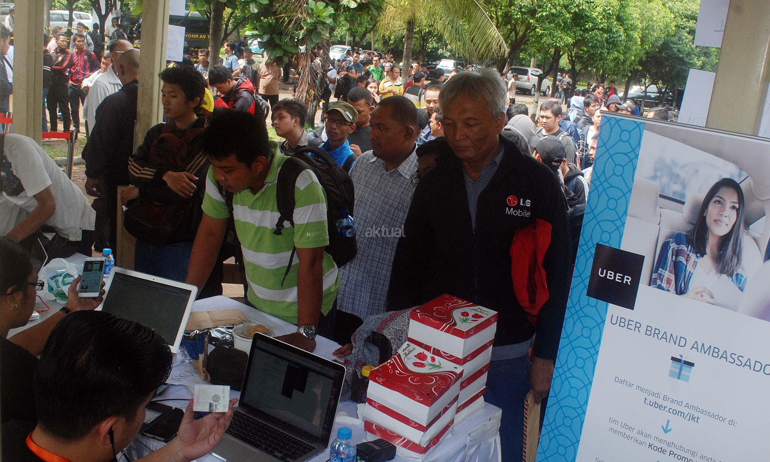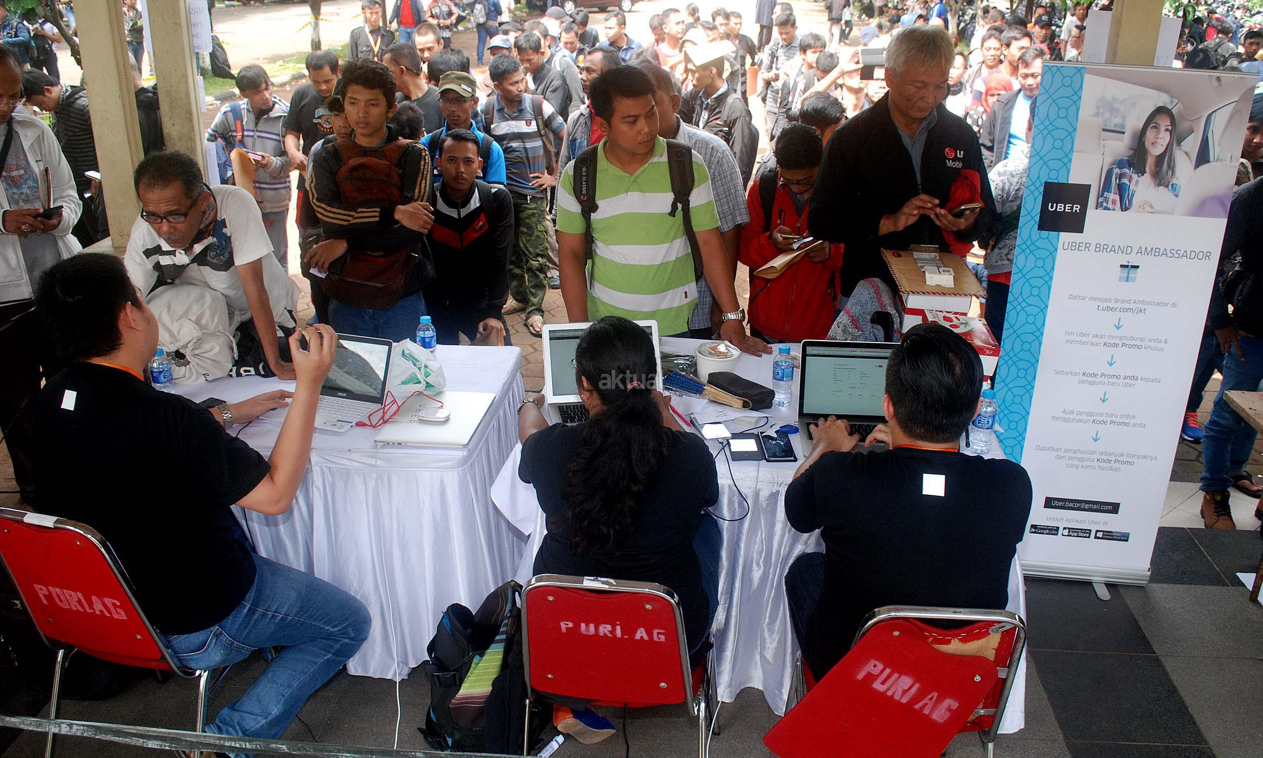 Ribuan orang berbondong-bondong untuk mendaftar menjadi driver UberMotor di Jakarta, Rabu (25/5/2016). Uber Indonesia membuka pendaftaran driver untuk umum dengan melalui proses yang sangat mudah, mulai dari pendaftaran, pembekalan, hingga aktivasi dalam satu lokasi.