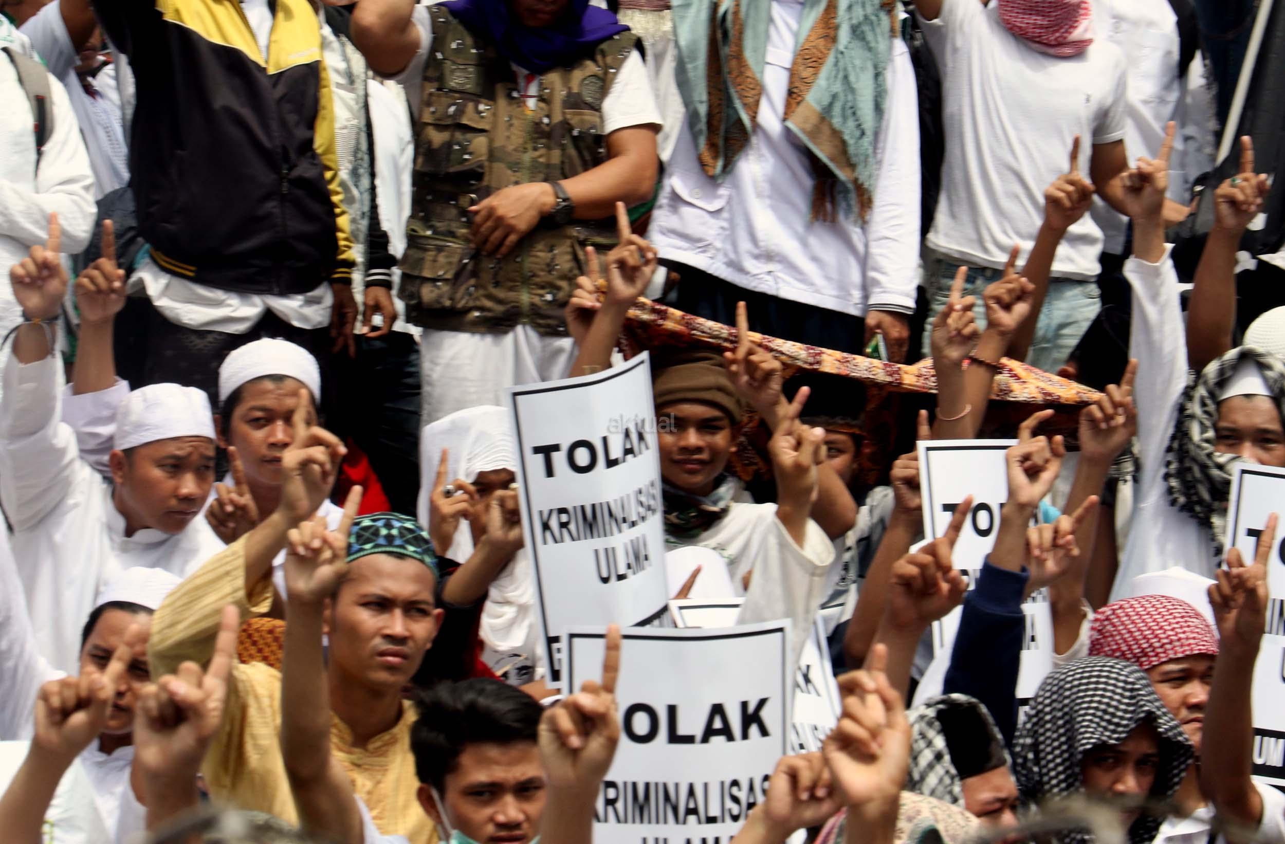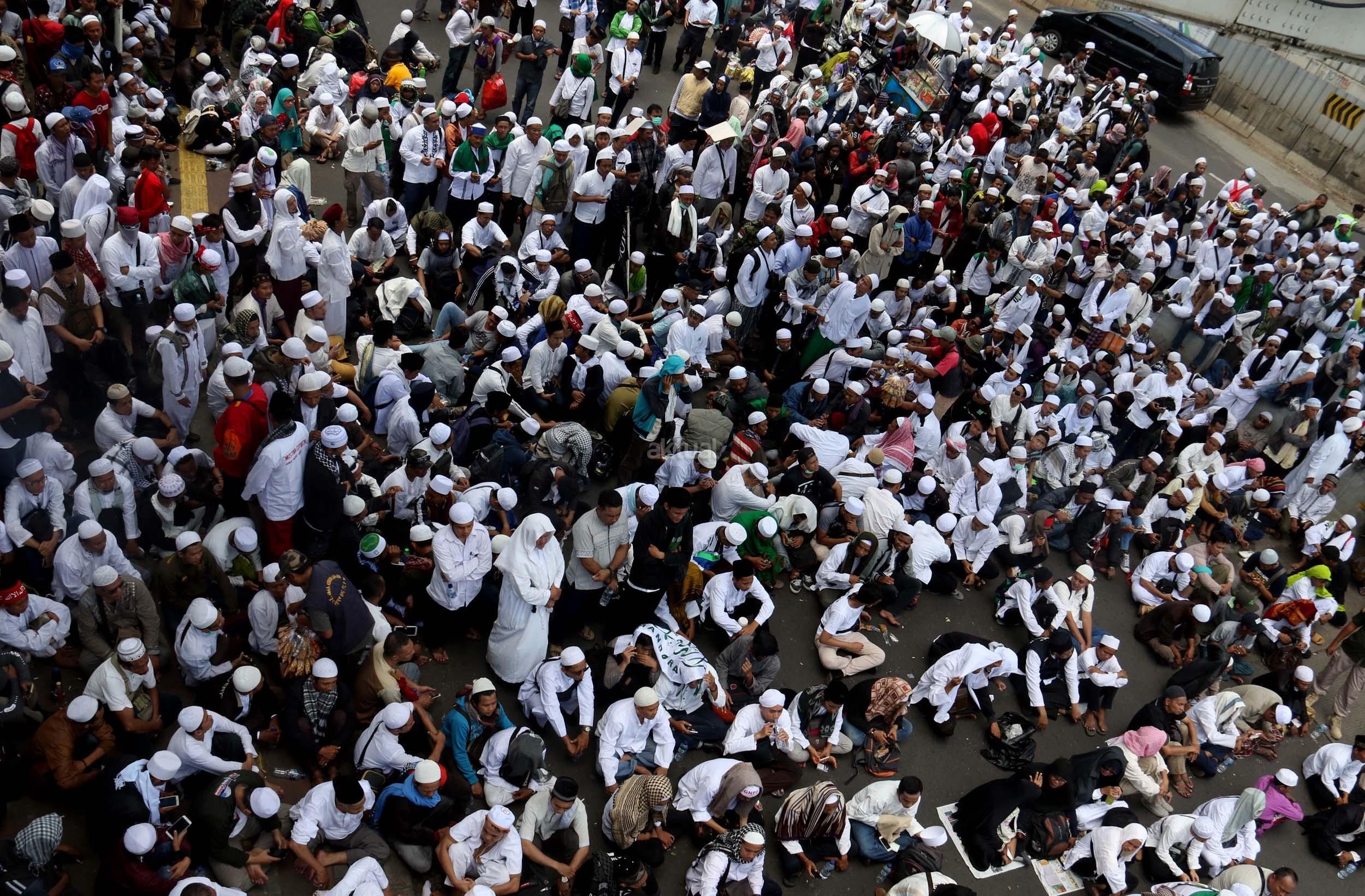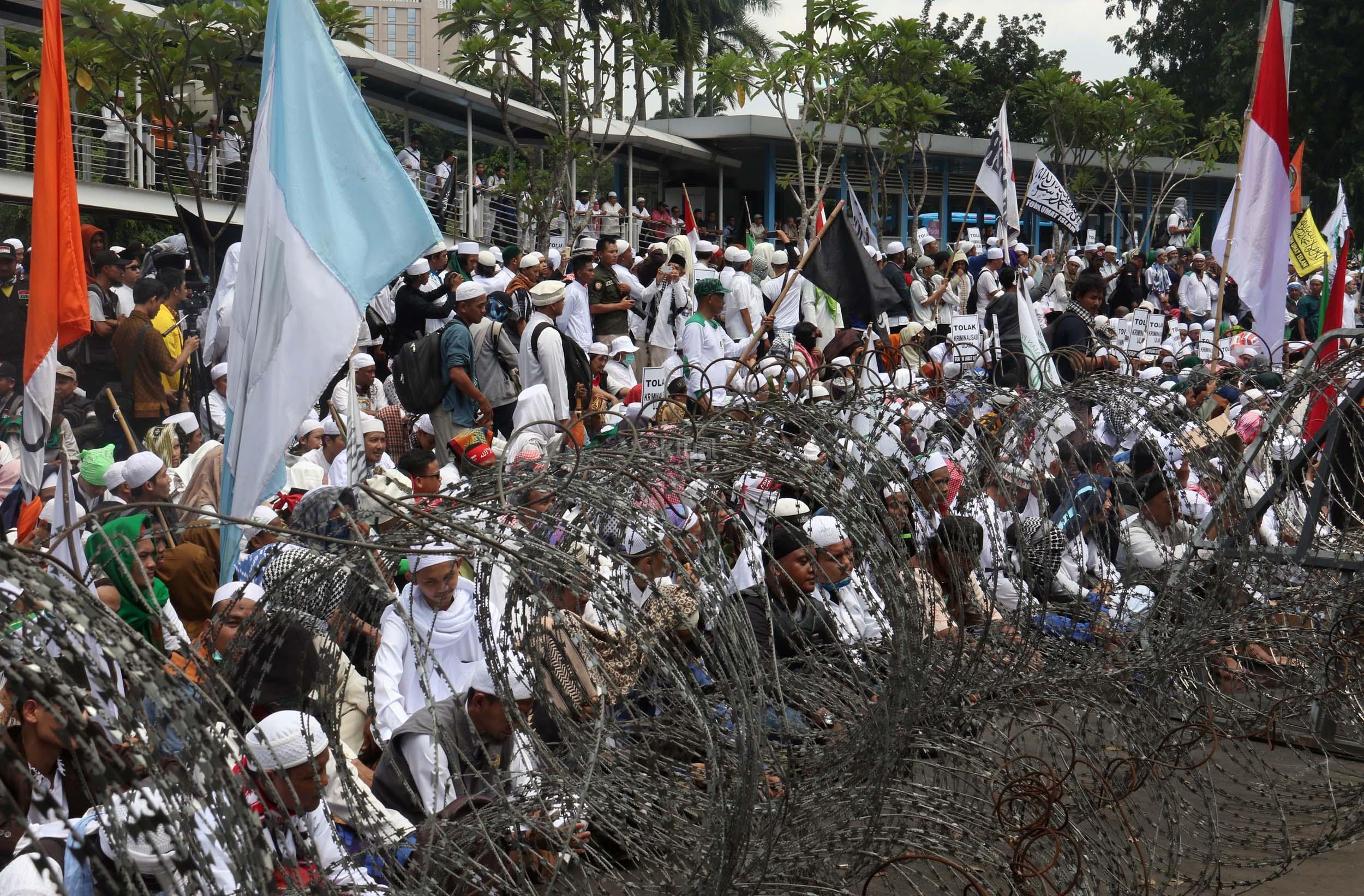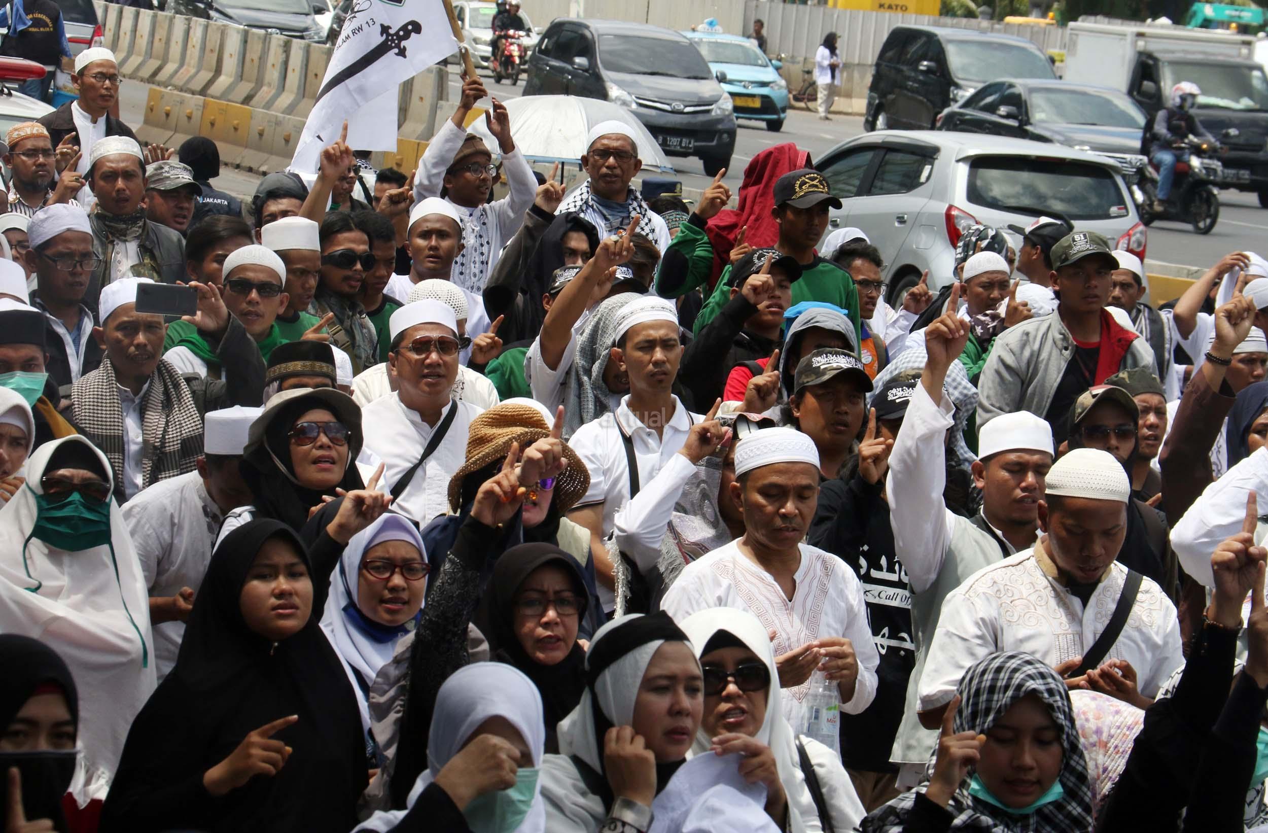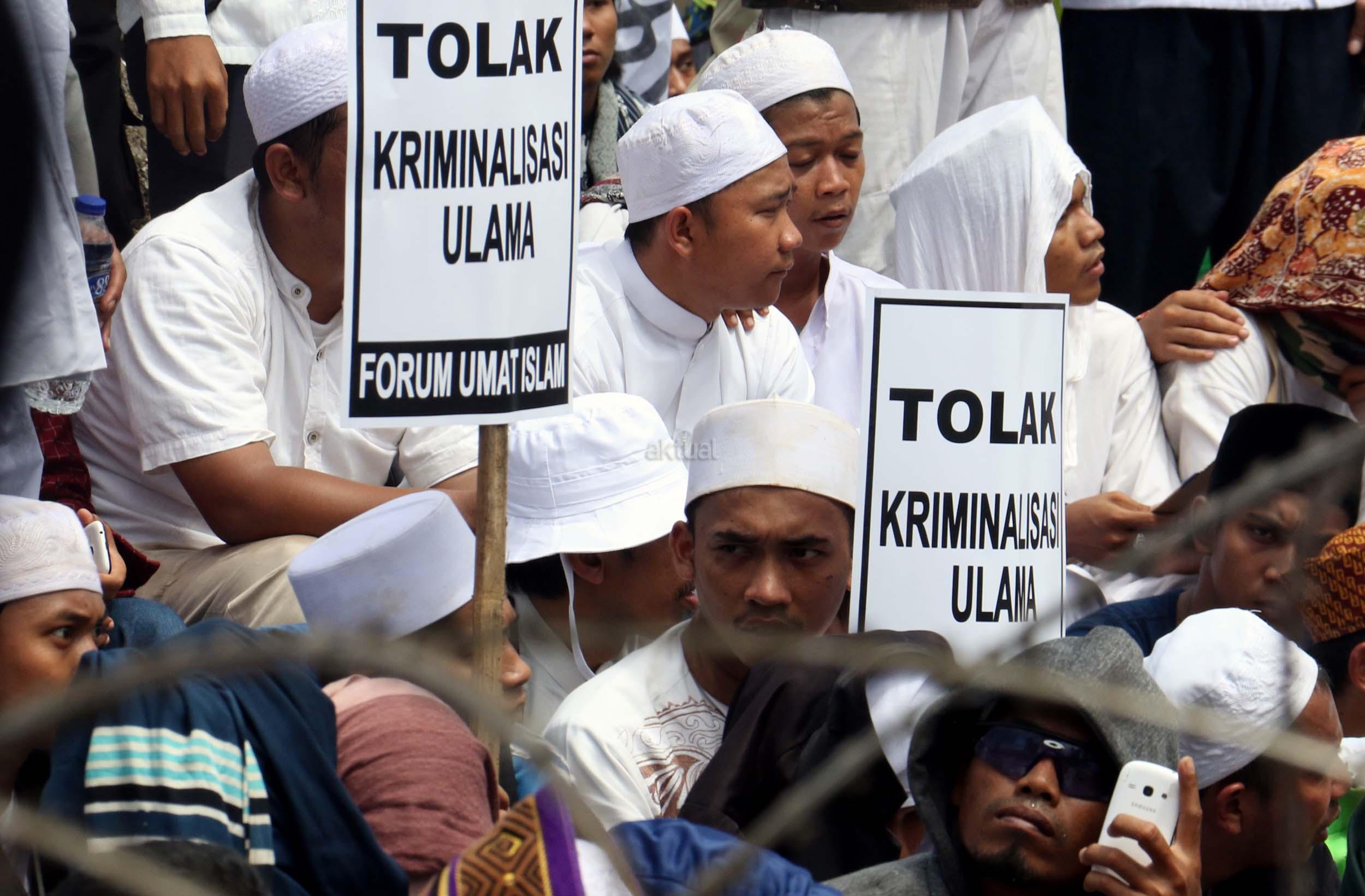 Ribuan umat Islam dari berbagai elemen organisasi melakukan aksi mengawal pemeriksaan Imam Besar Front Pembela Islam (FPI), Habib Rizieq oleh pihak Kepolisian di Mapolda Metro Jaya, Jakarta, Senin (23/1/2017). Dalam aksinya massa aksi tidak hanya berasal dari Jakarta, melainkan dari kota-kota satelit Jakarta seperti Depok, Tangerang dan Bekasi. AKTUAL/Munzir