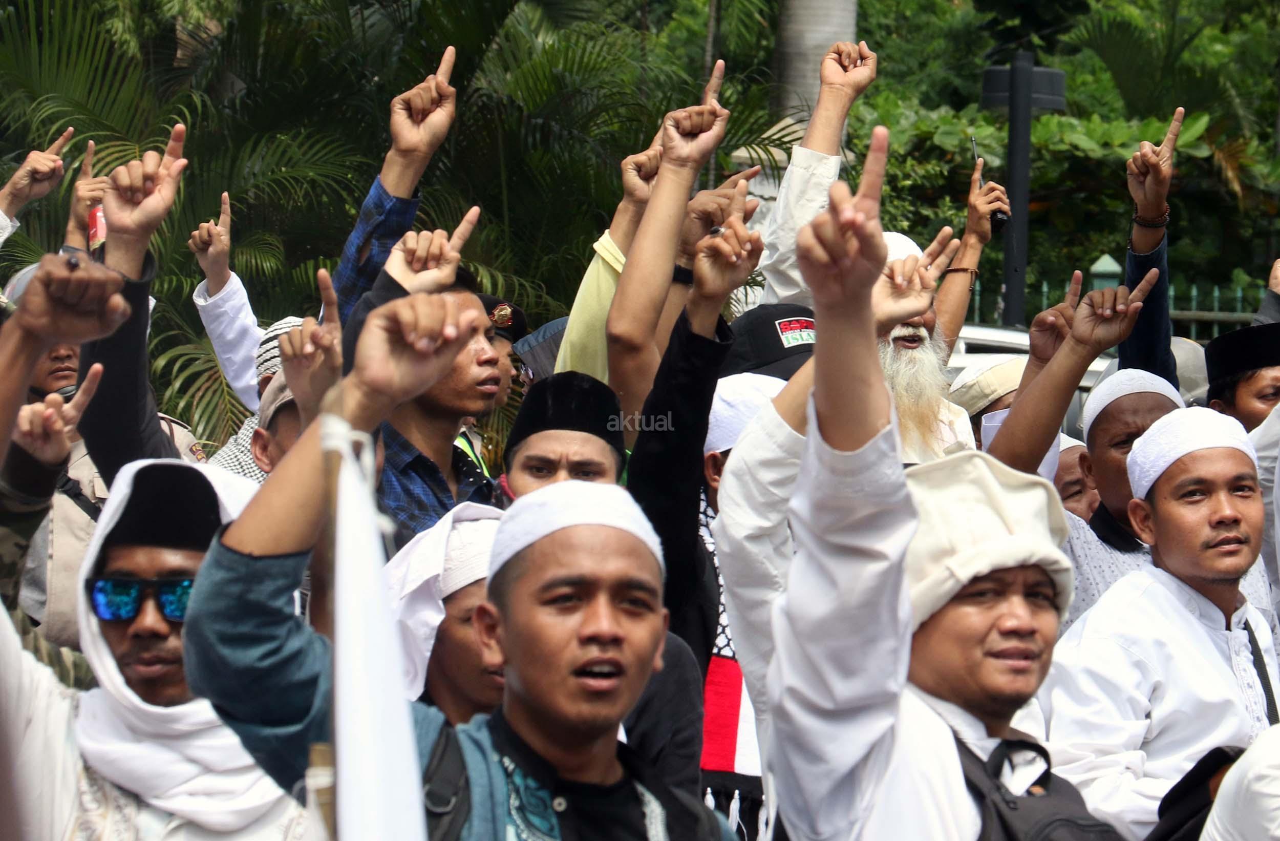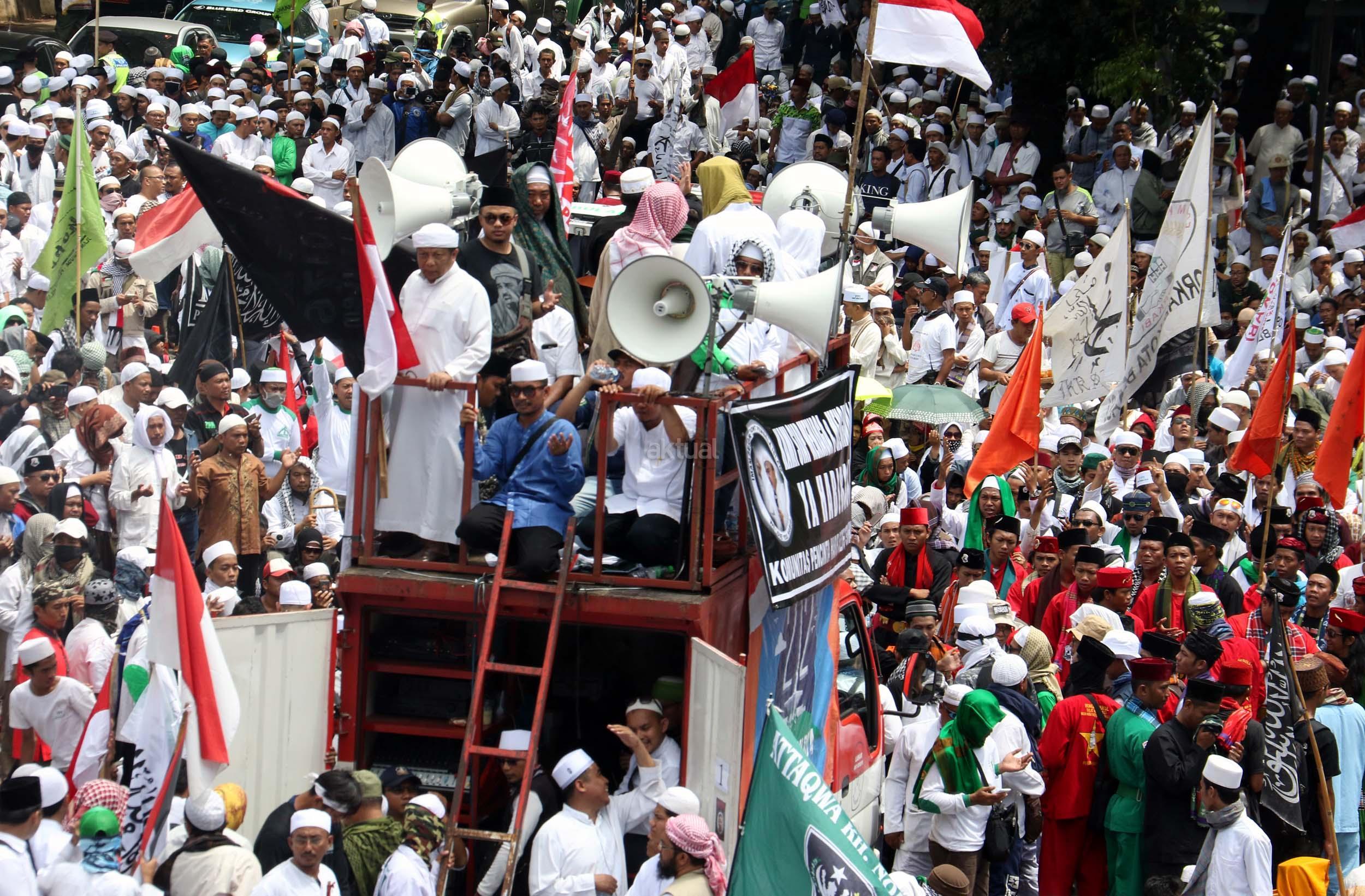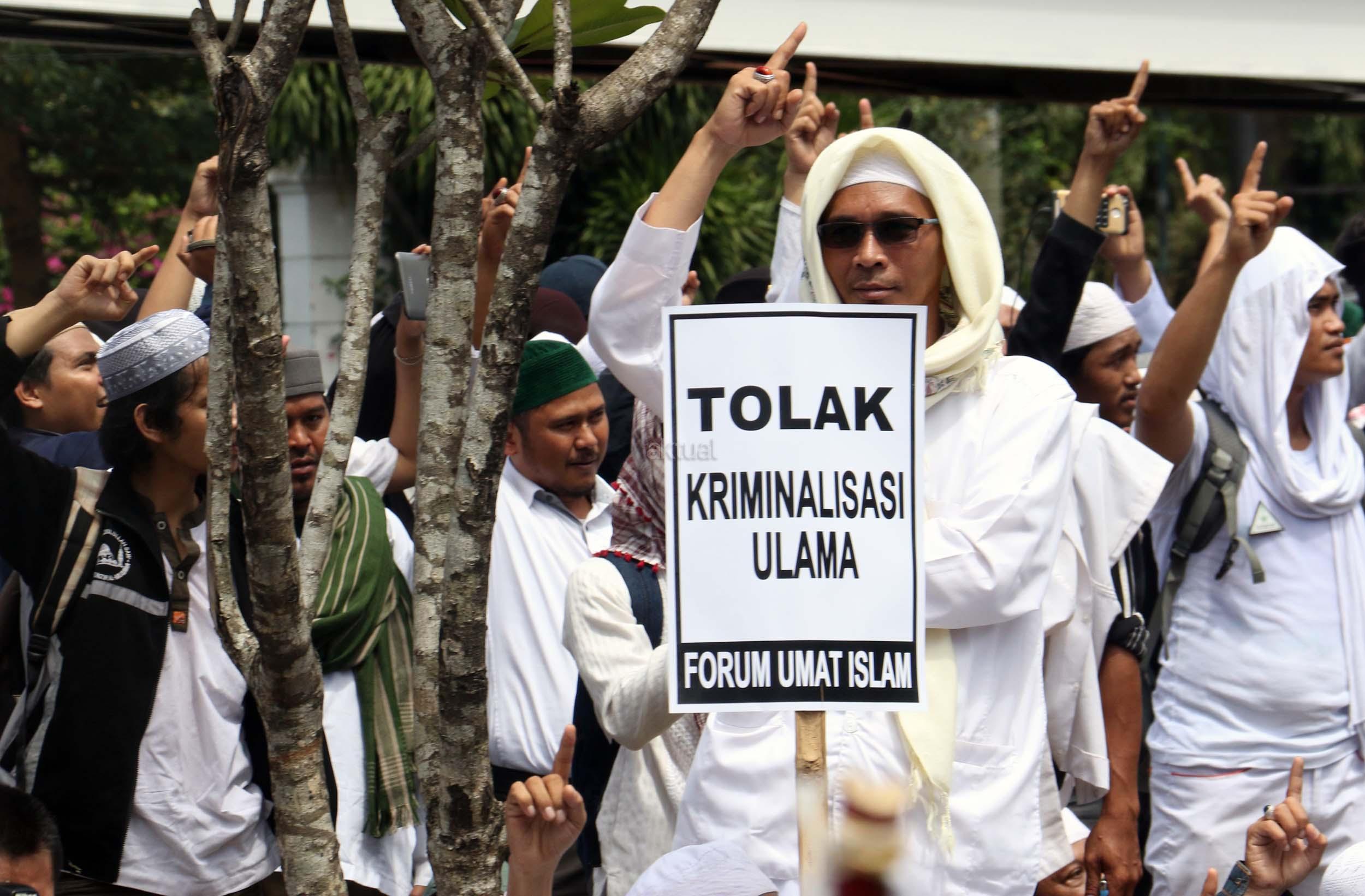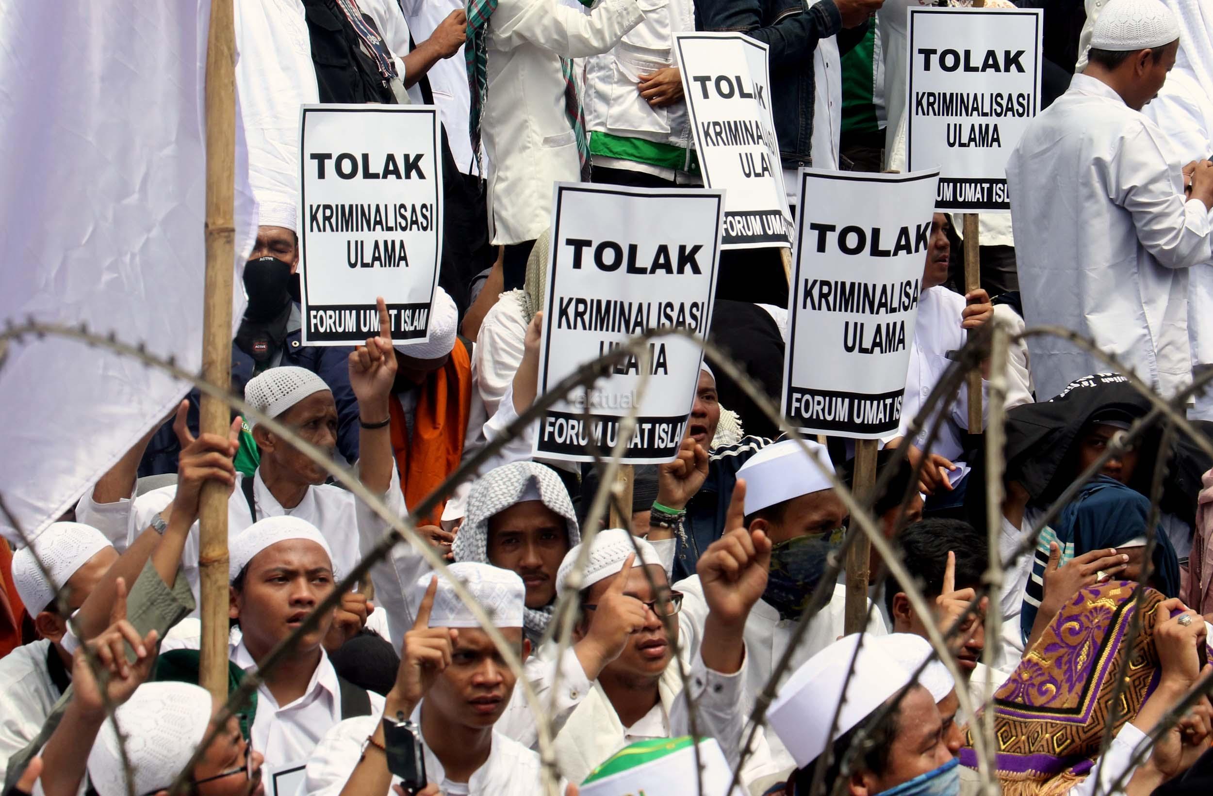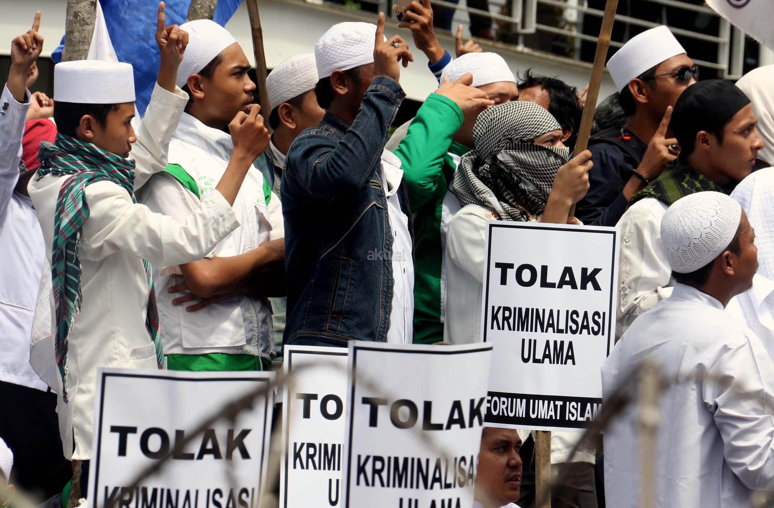 Ribuan umat Islam dari berbagai elemen organisasi melakukan aksi mengawal pemeriksaan Imam Besar Front Pembela Islam (FPI), Habib Rizieq oleh pihak Kepolisian di Mapolda Metro Jaya, Jakarta, Senin (23/1/2017). Dalam aksinya massa aksi tidak hanya berasal dari Jakarta, melainkan dari kota-kota satelit Jakarta seperti Depok, Tangerang dan Bekasi. AKTUAL/Munzir