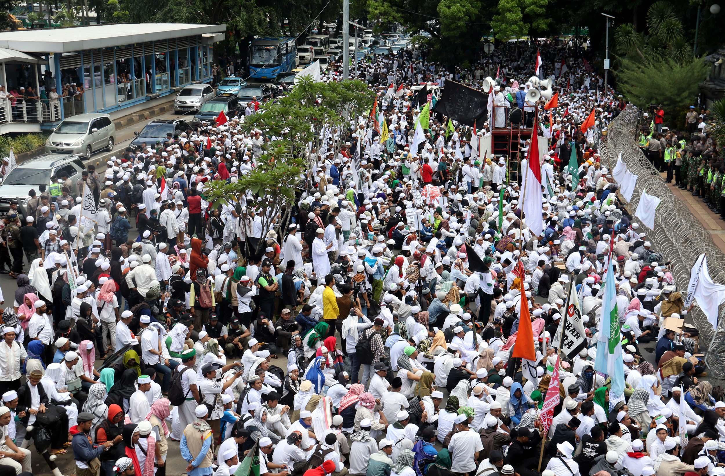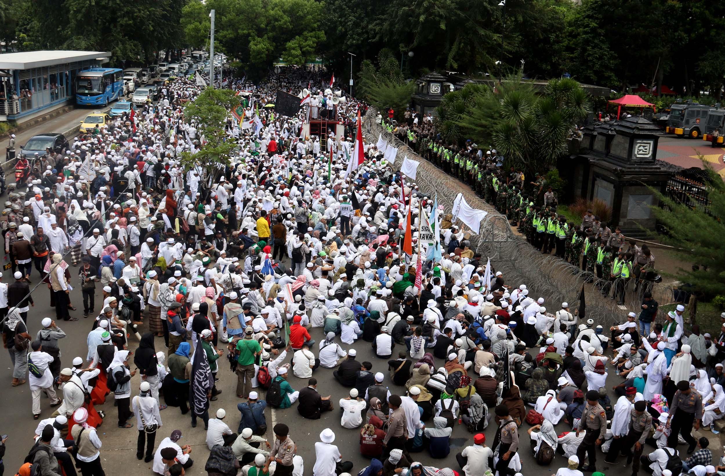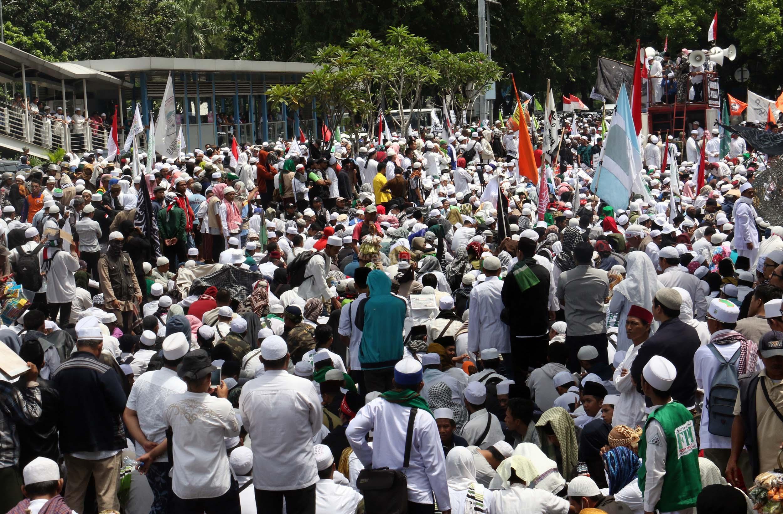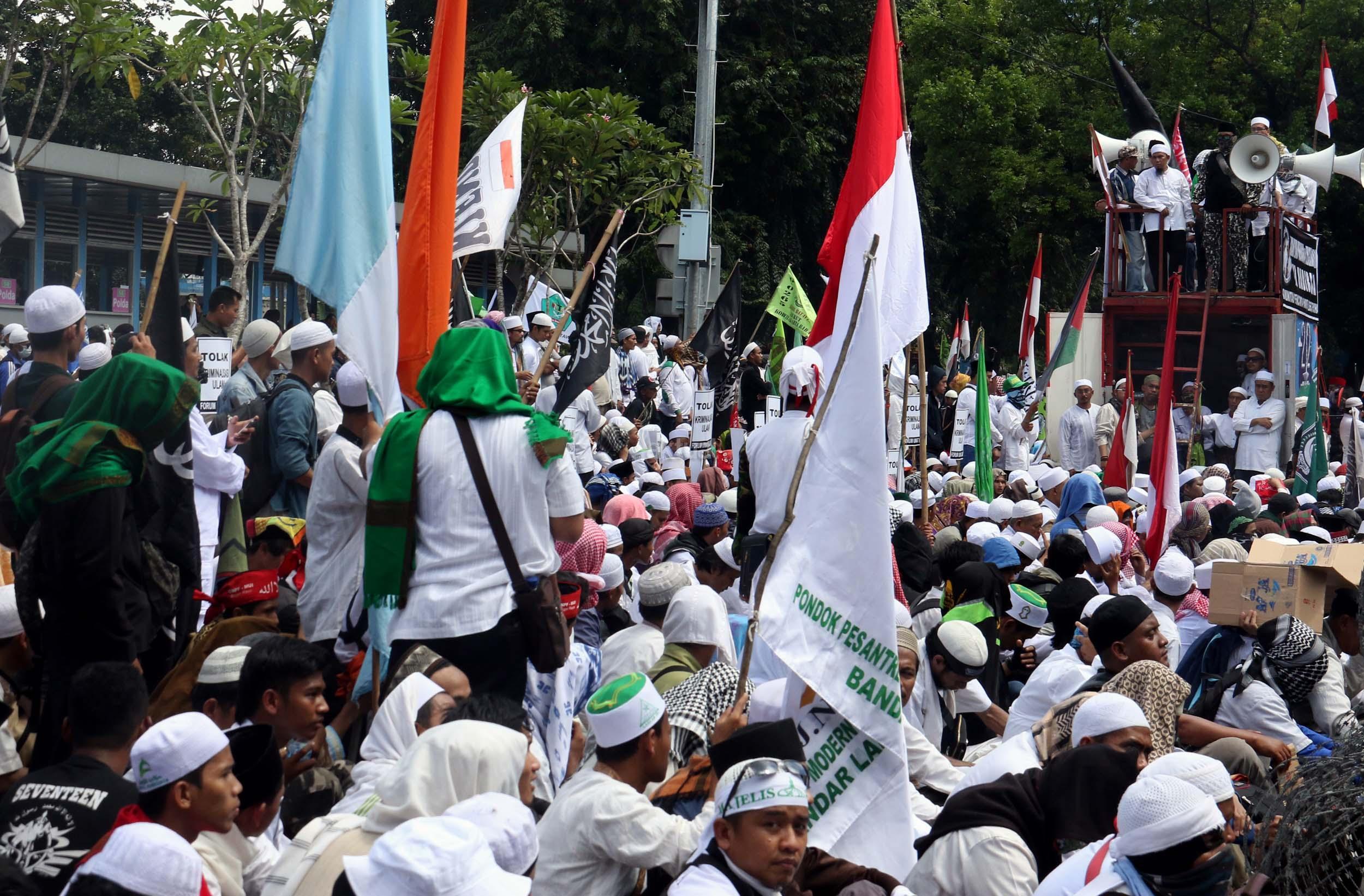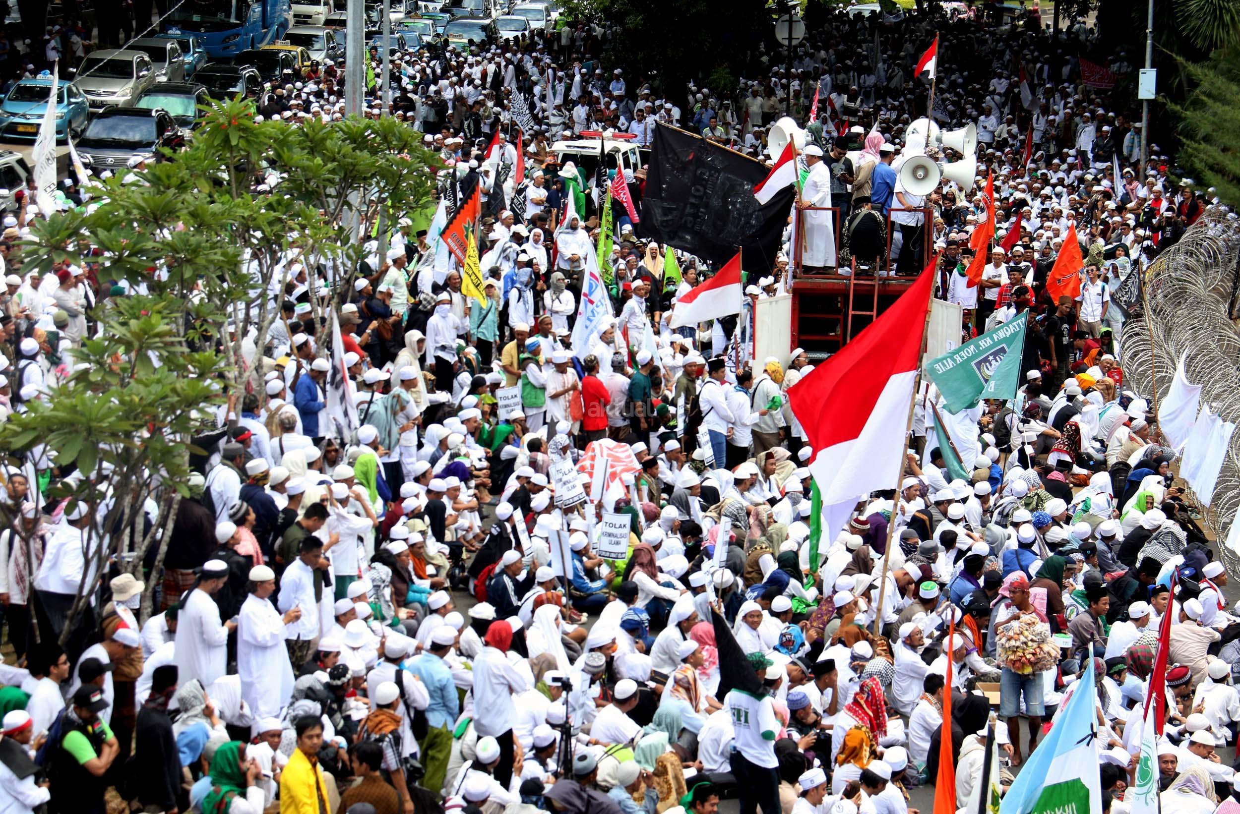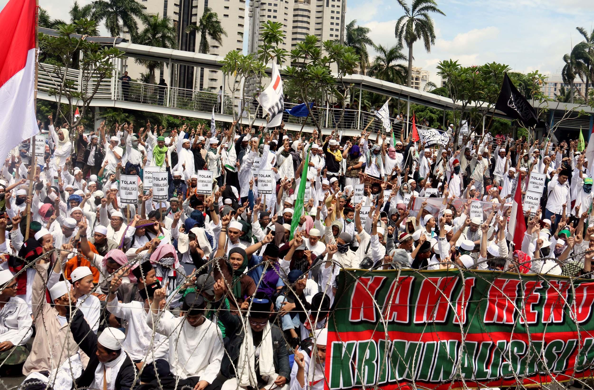 Ribuan umat Islam dari berbagai elemen organisasi melakukan aksi mengawal pemeriksaan Imam Besar Front Pembela Islam (FPI), Habib Rizieq oleh pihak Kepolisian di Mapolda Metro Jaya, Jakarta, Senin (23/1/2017). Dalam aksinya massa aksi tidak hanya berasal dari Jakarta, melainkan dari kota-kota satelit Jakarta seperti Depok, Tangerang dan Bekasi. AKTUAL/Munzir