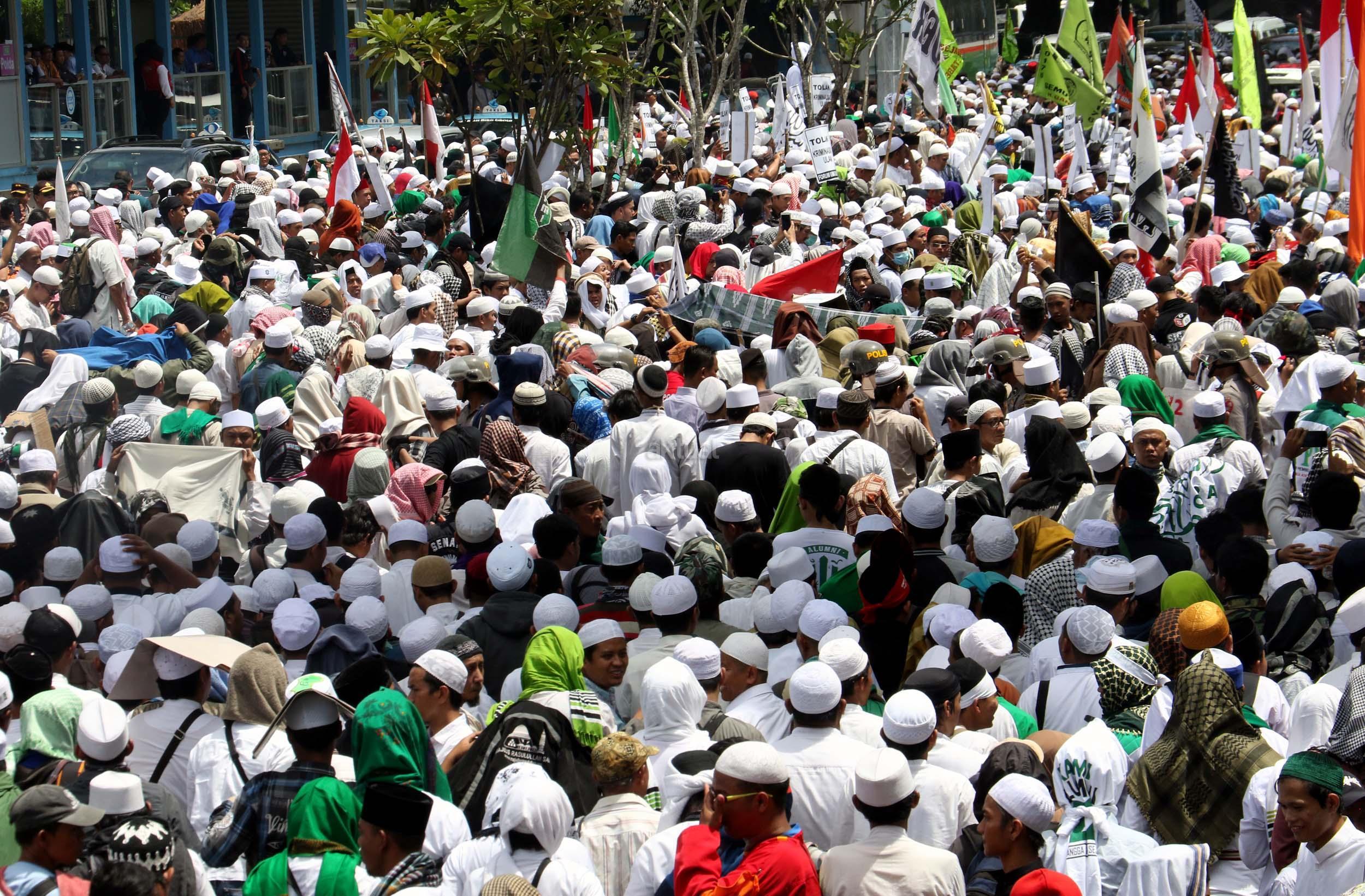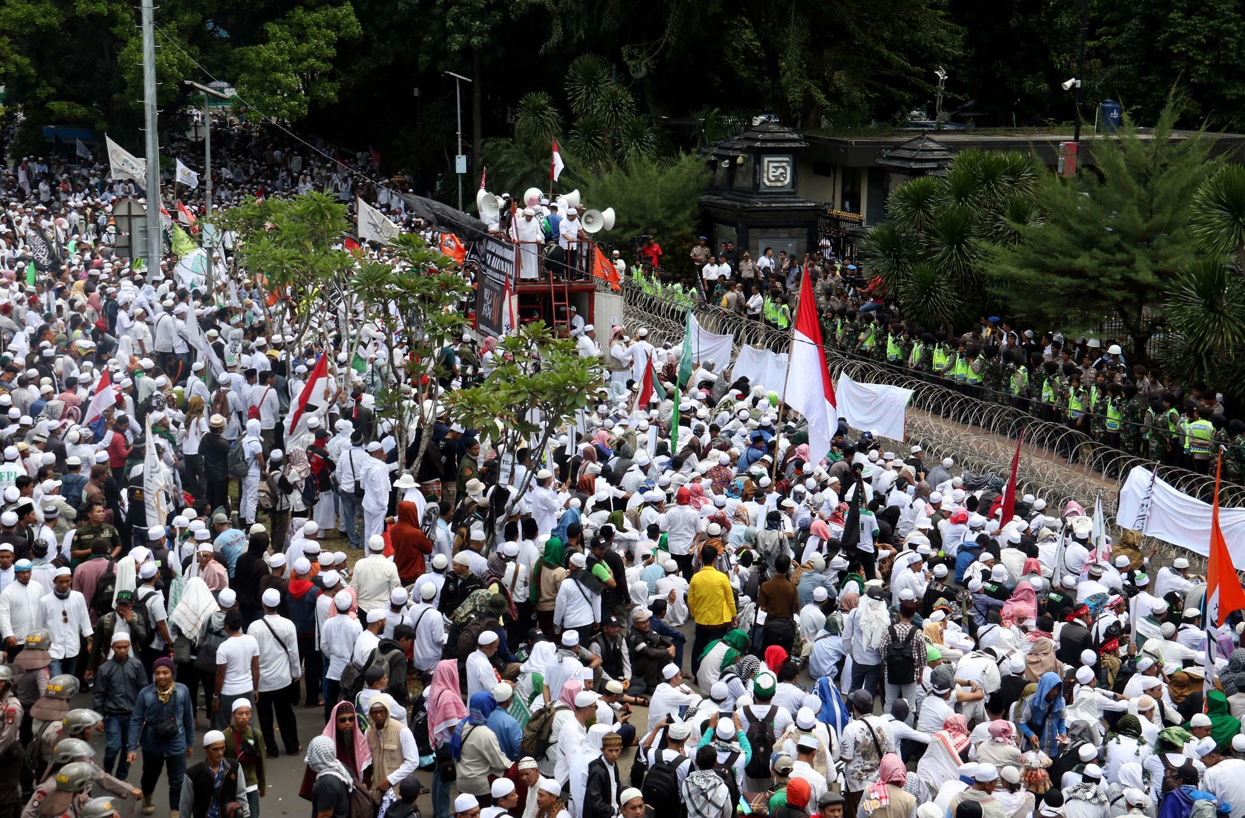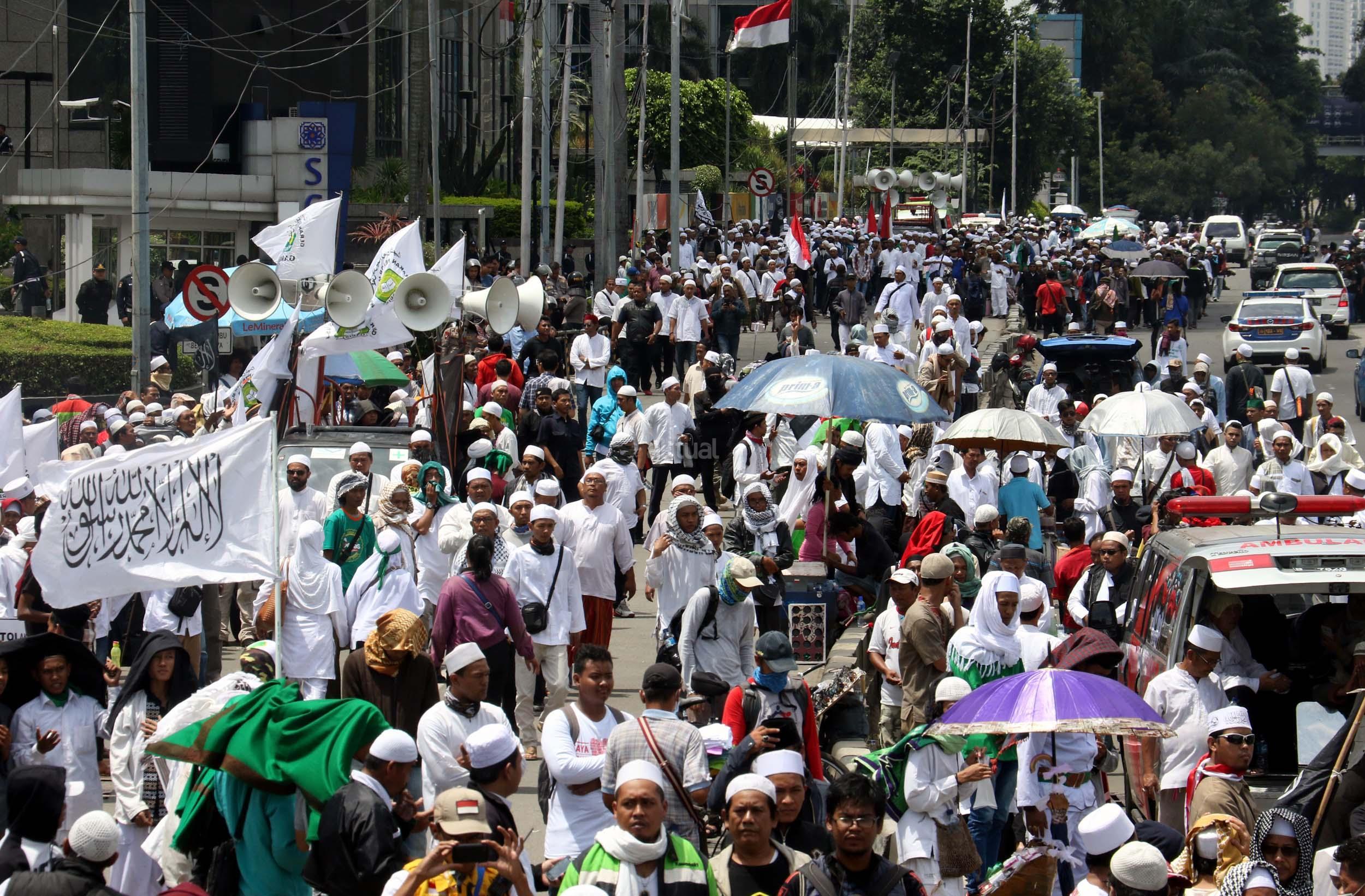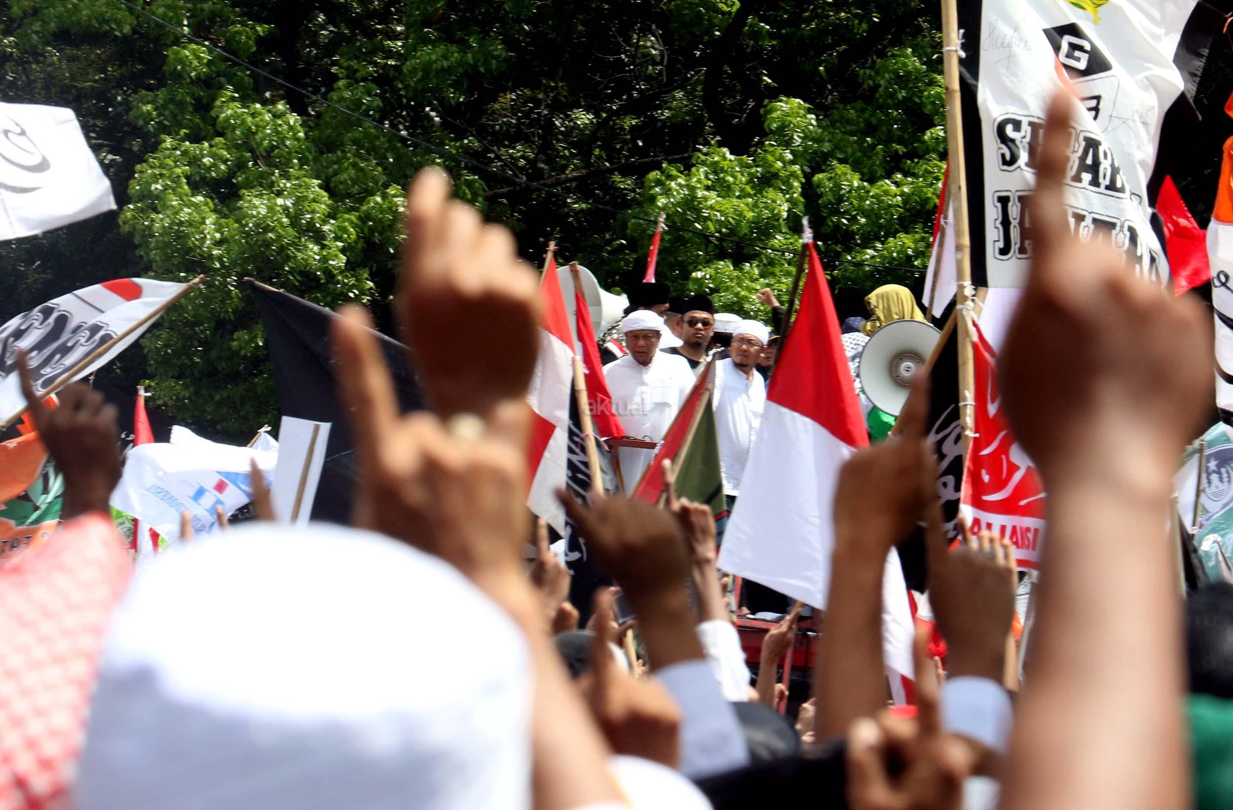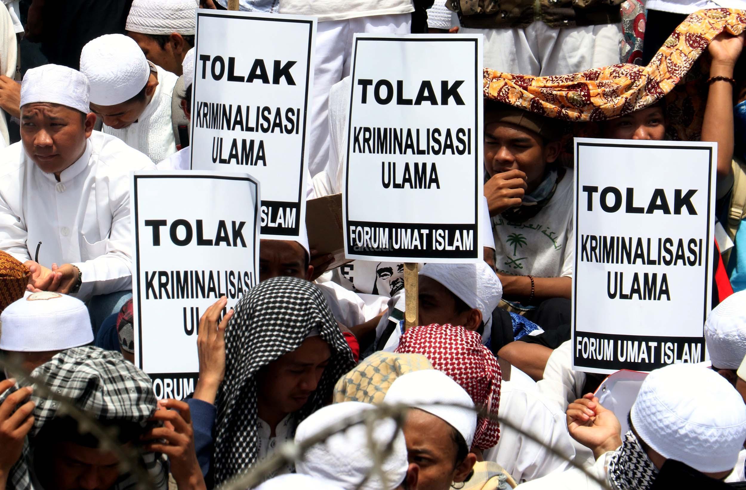 Ribuan umat Islam dari berbagai elemen organisasi melakukan aksi mengawal pemeriksaan Imam Besar Front Pembela Islam (FPI), Habib Rizieq oleh pihak Kepolisian di Mapolda Metro Jaya, Jakarta, Senin (23/1/2017). Dalam aksinya massa aksi tidak hanya berasal dari Jakarta, melainkan dari kota-kota satelit Jakarta seperti Depok, Tangerang dan Bekasi. AKTUAL/Munzir