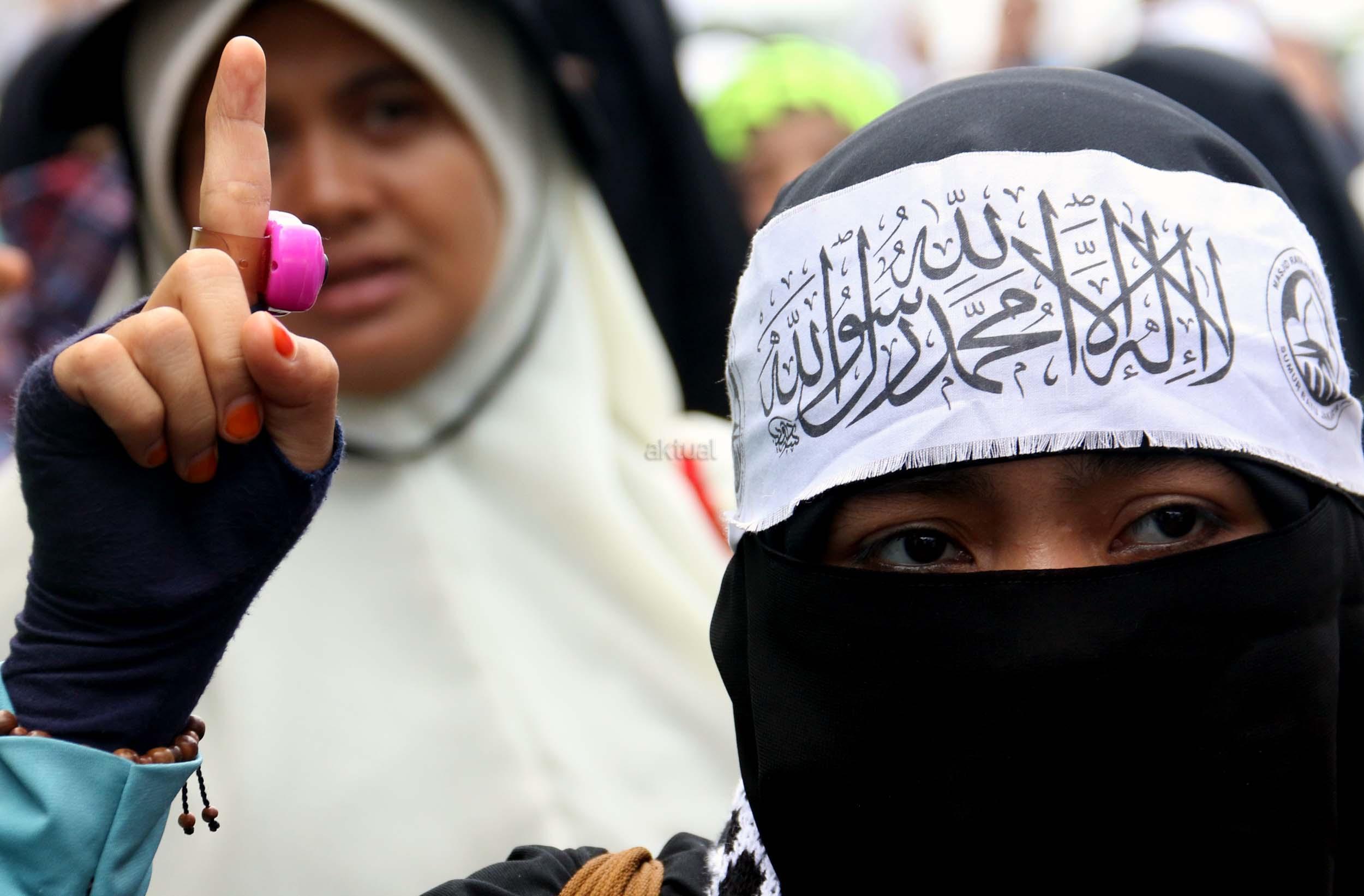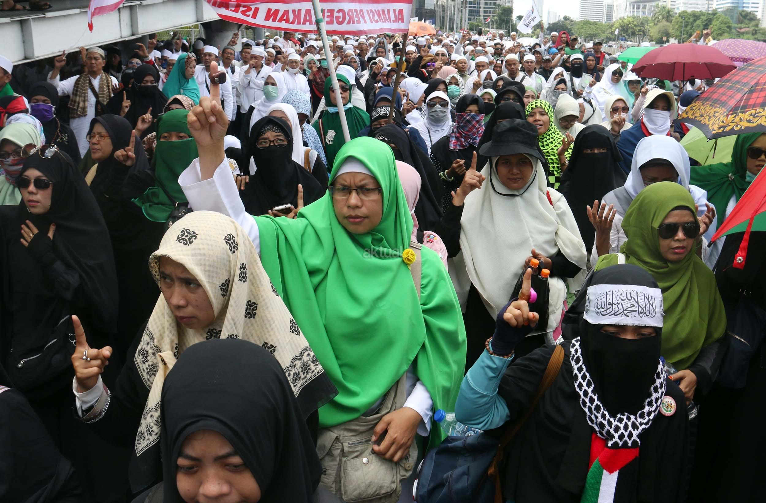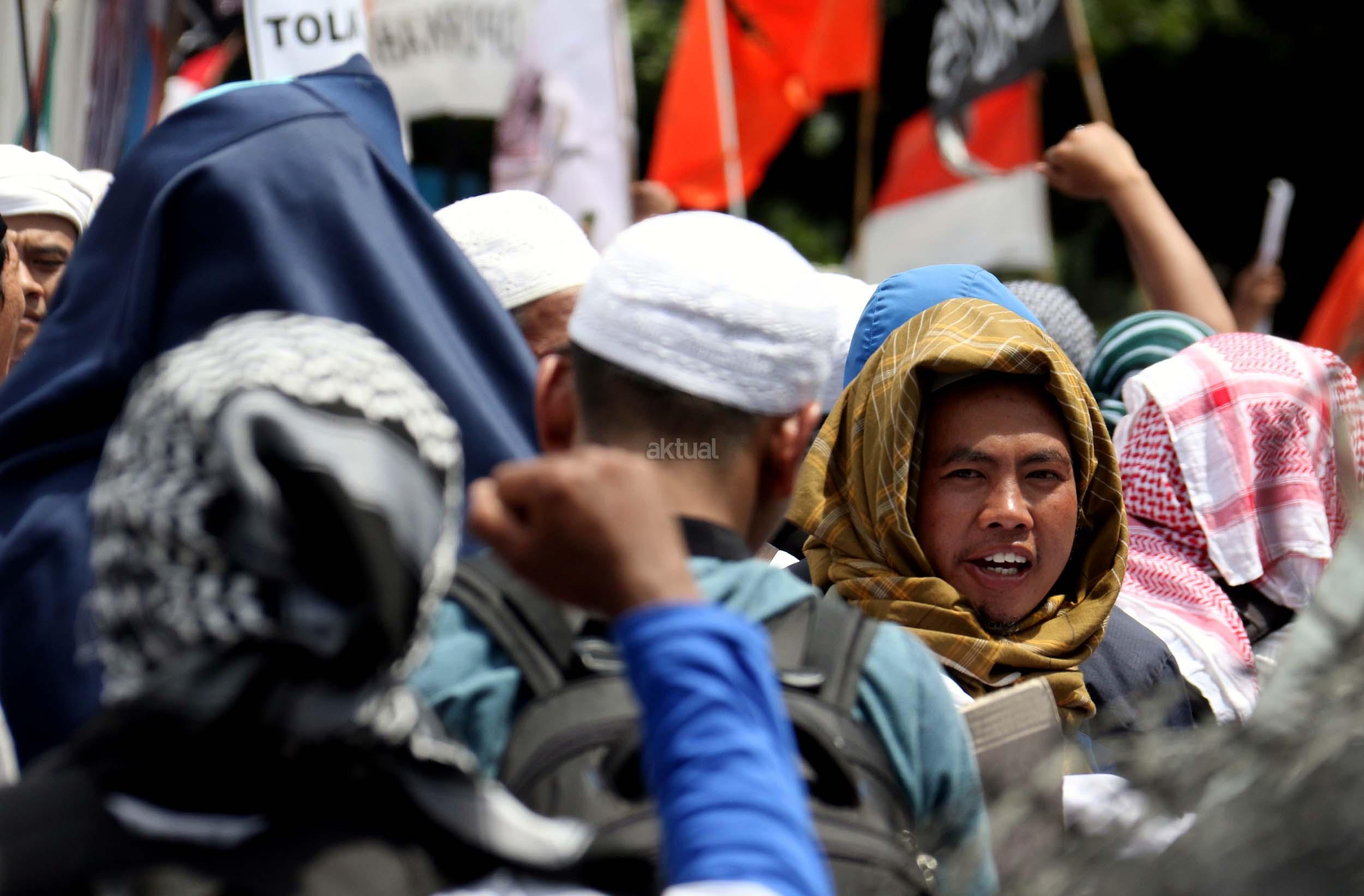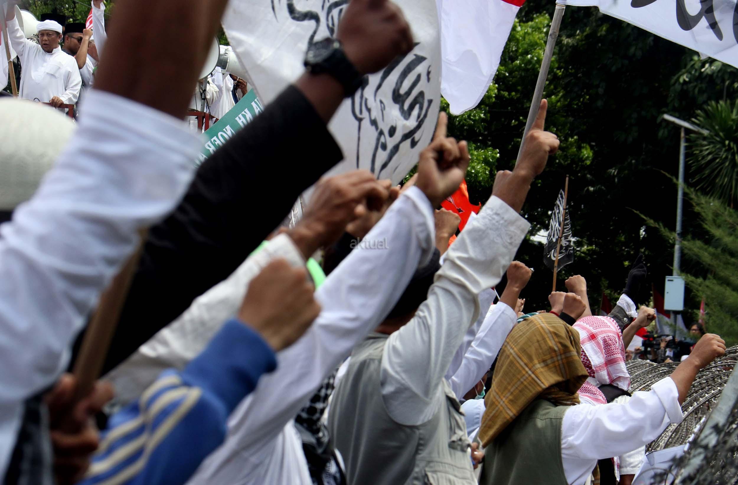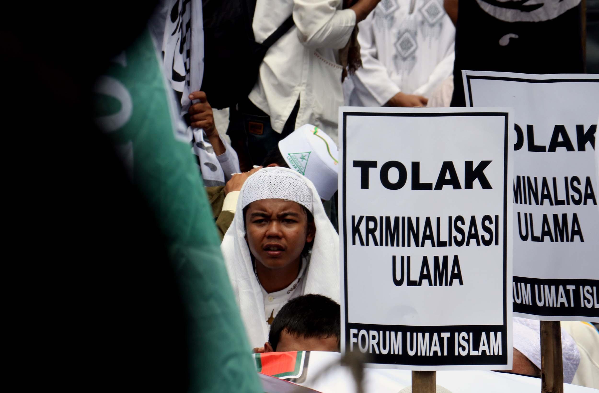 Ribuan umat Islam dari berbagai elemen organisasi melakukan aksi mengawal pemeriksaan Imam Besar Front Pembela Islam (FPI), Habib Rizieq oleh pihak Kepolisian di Mapolda Metro Jaya, Jakarta, Senin (23/1/2017). Dalam aksinya massa aksi tidak hanya berasal dari Jakarta, melainkan dari kota-kota satelit Jakarta seperti Depok, Tangerang dan Bekasi. AKTUAL/Munzir