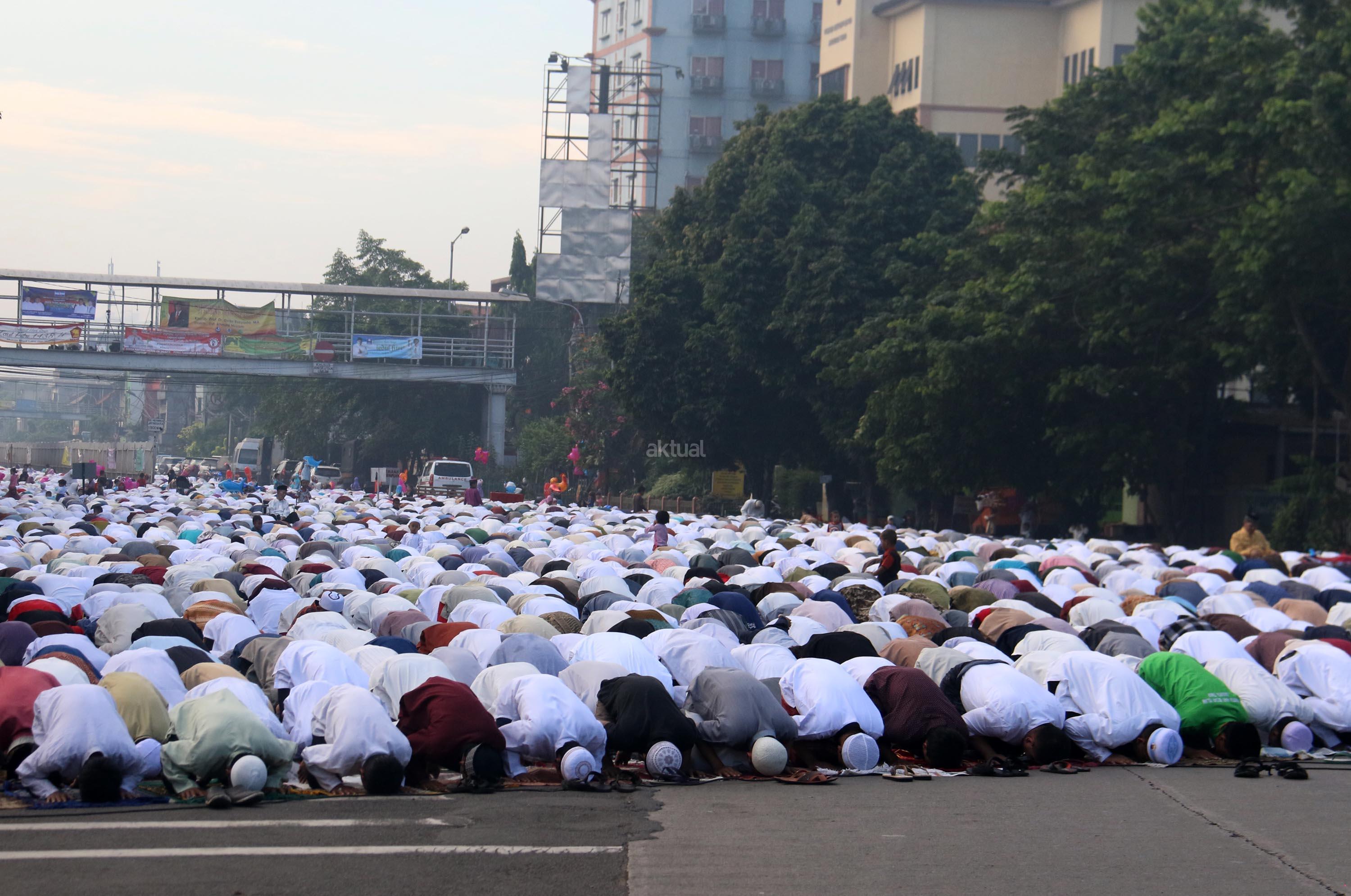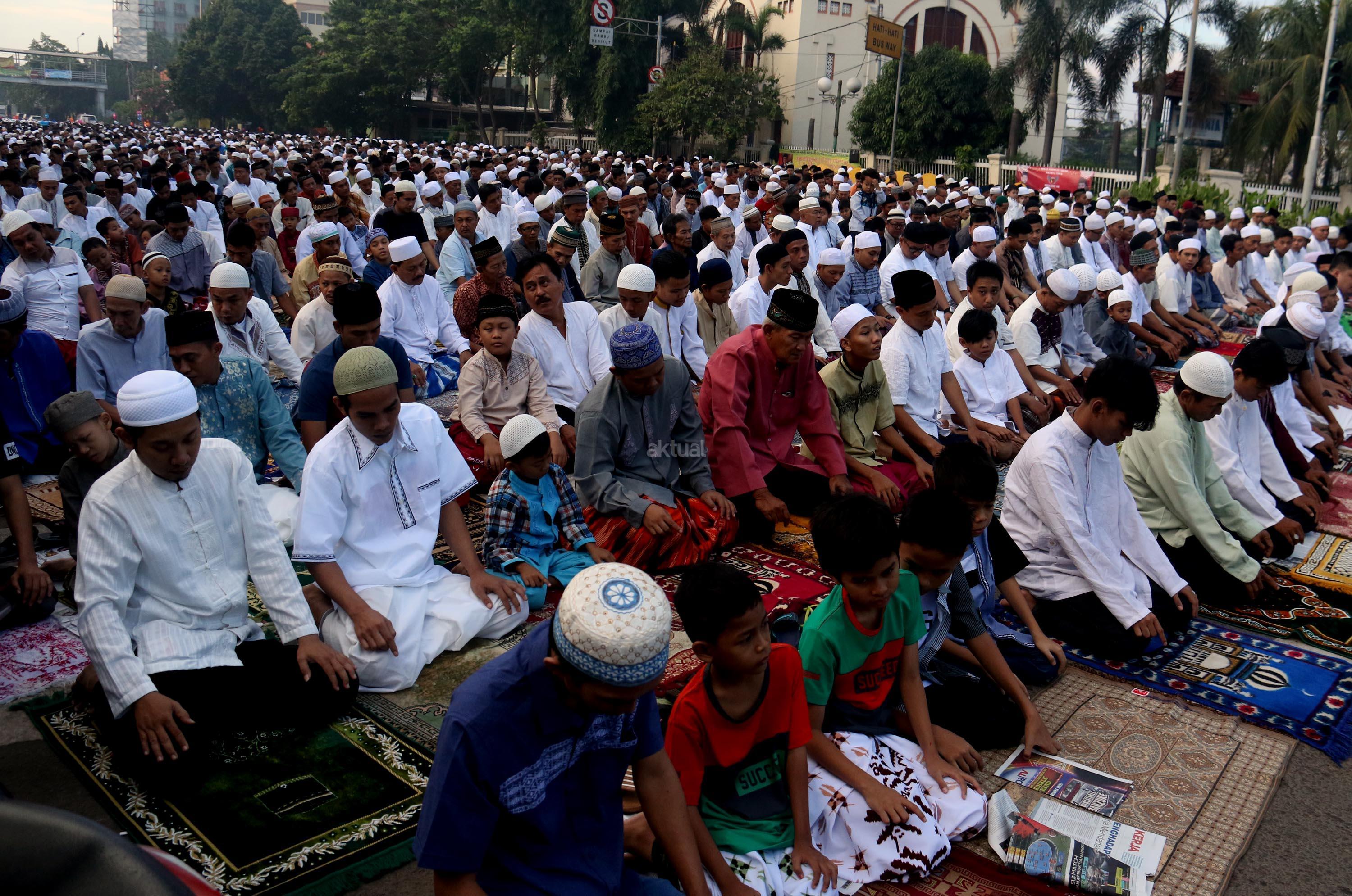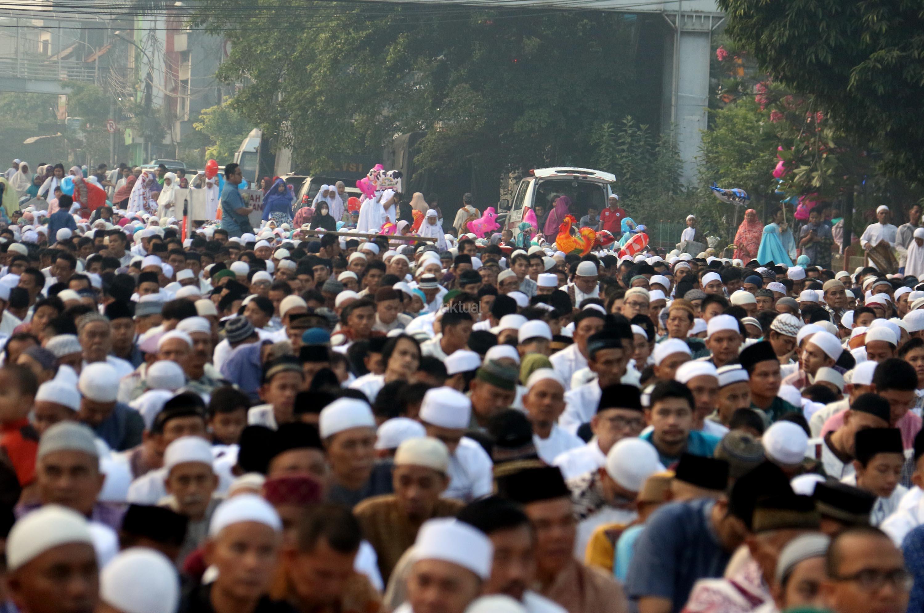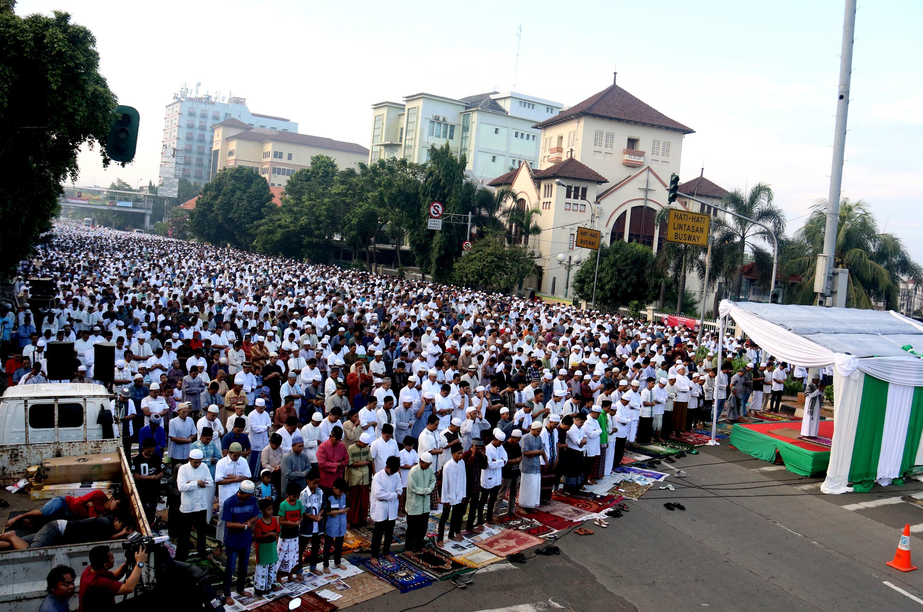 Terlihat ribuan umat muslim mengikuti salat Idul Fitri 1438 H di Jatinegara, Jakarta Timur, Minggu (25/6/2017). Pemerintah menetapkan hari raya Idul Fitri 1438 H jatuh pada hari ini Minggu (25/6/2017). AKTUAL/Munzir