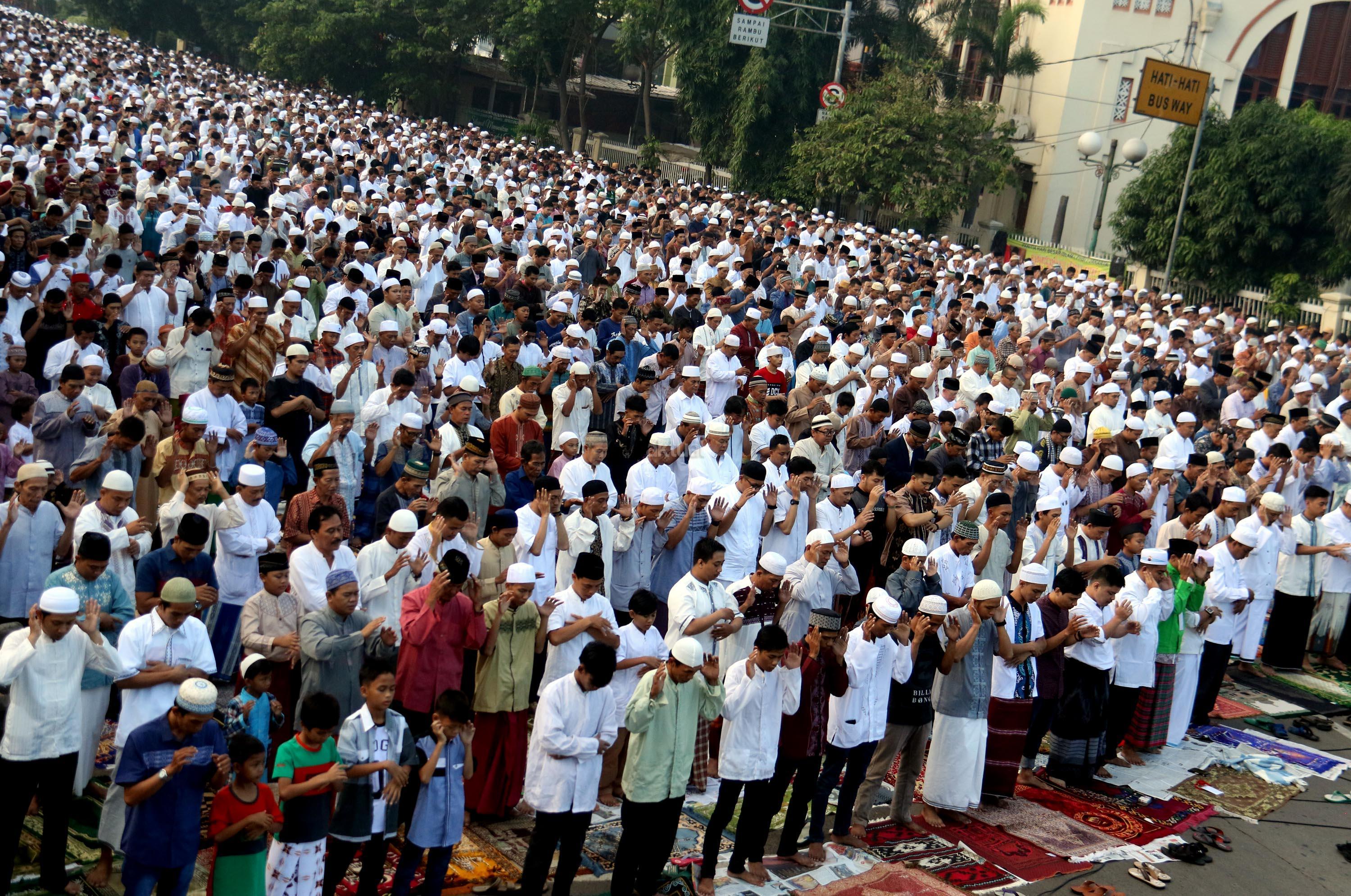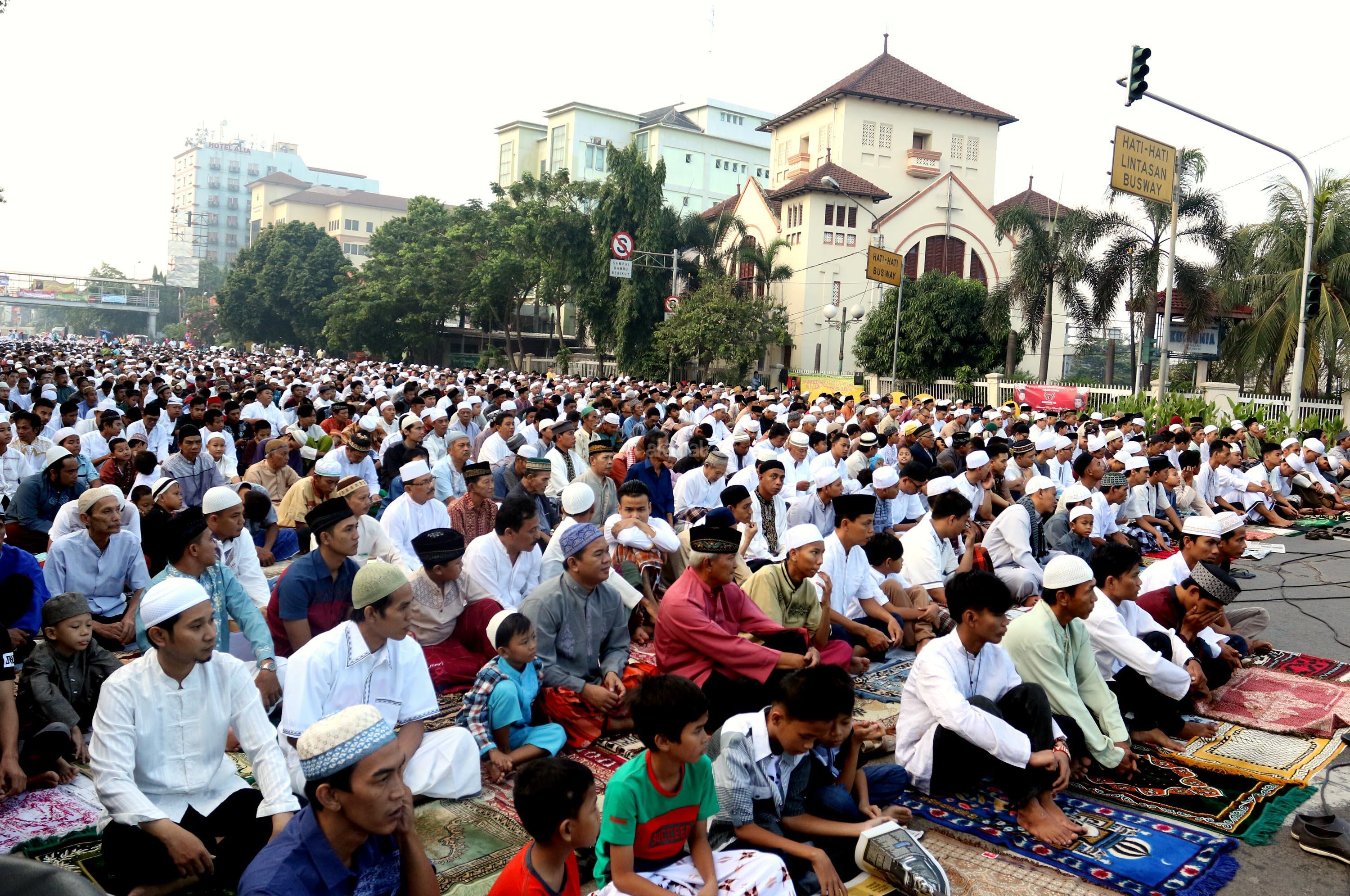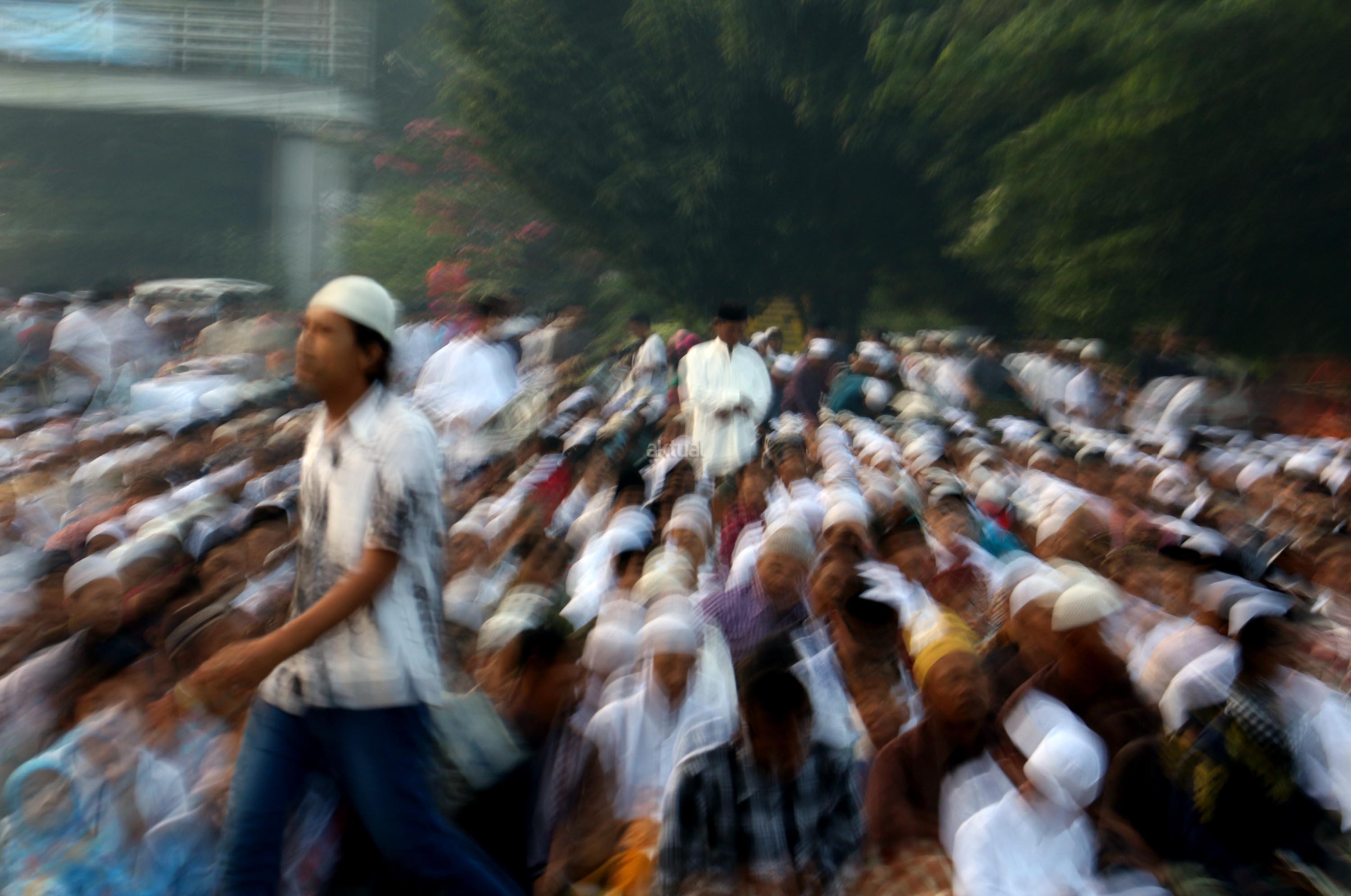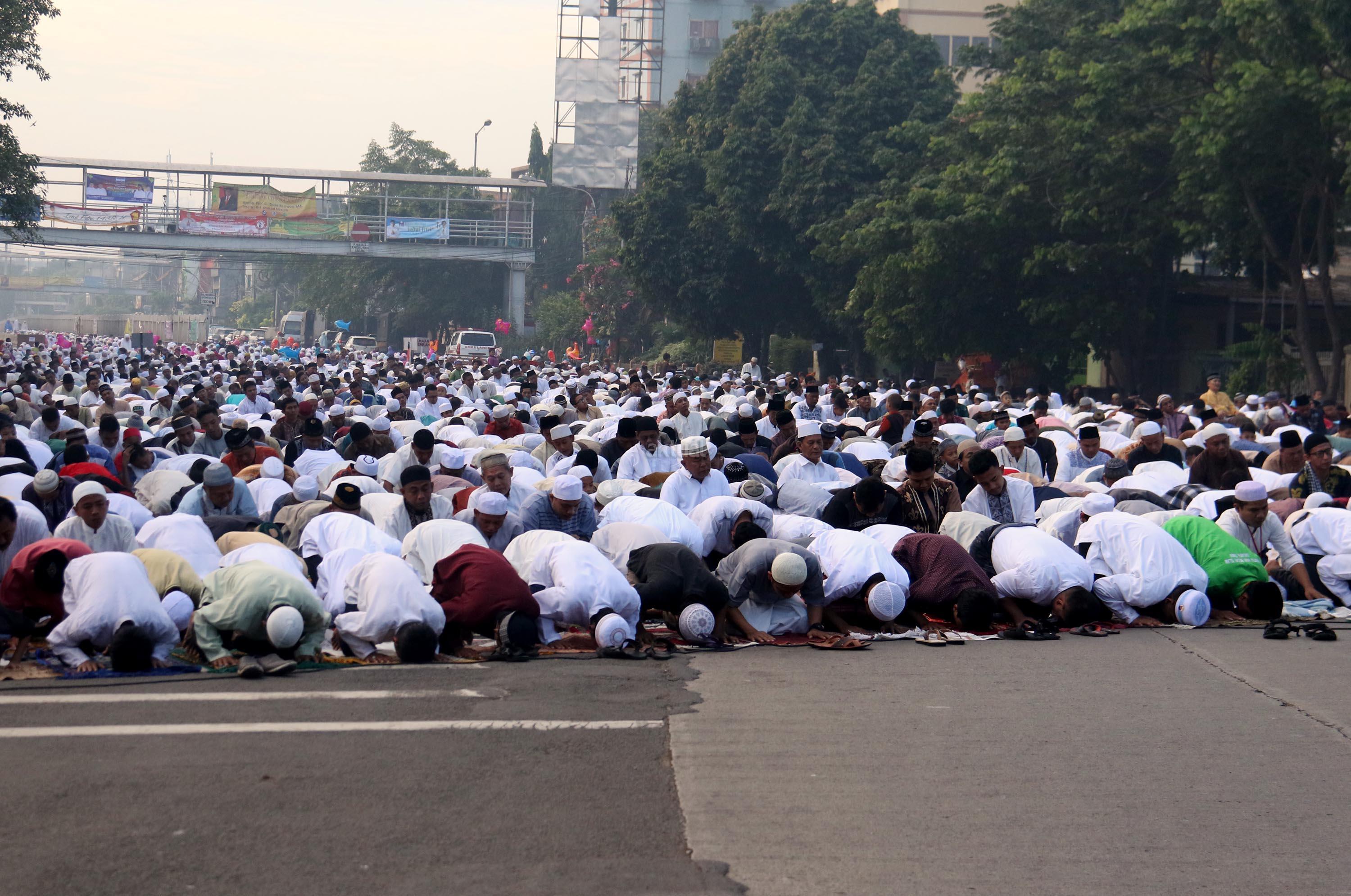 Terlihat ribuan umat muslim mengikuti salat Idul Fitri 1438 H di Jatinegara, Jakarta Timur, Minggu (25/6/2017). Pemerintah menetapkan hari raya Idul Fitri 1438 H jatuh pada hari ini Minggu (25/6/2017). AKTUAL/Munzir