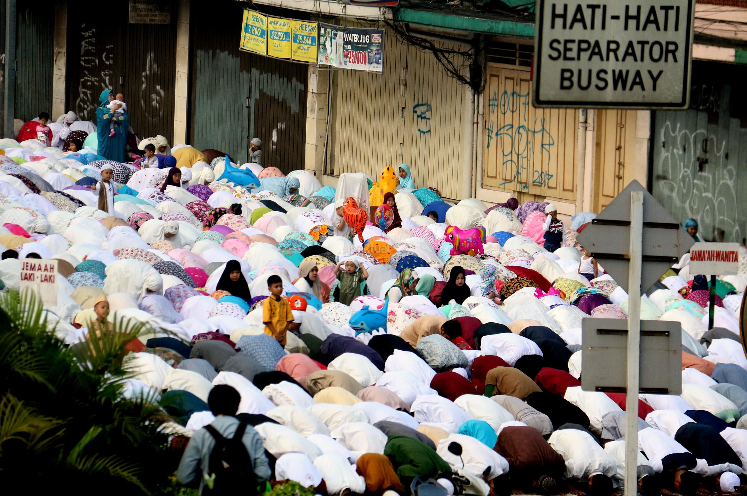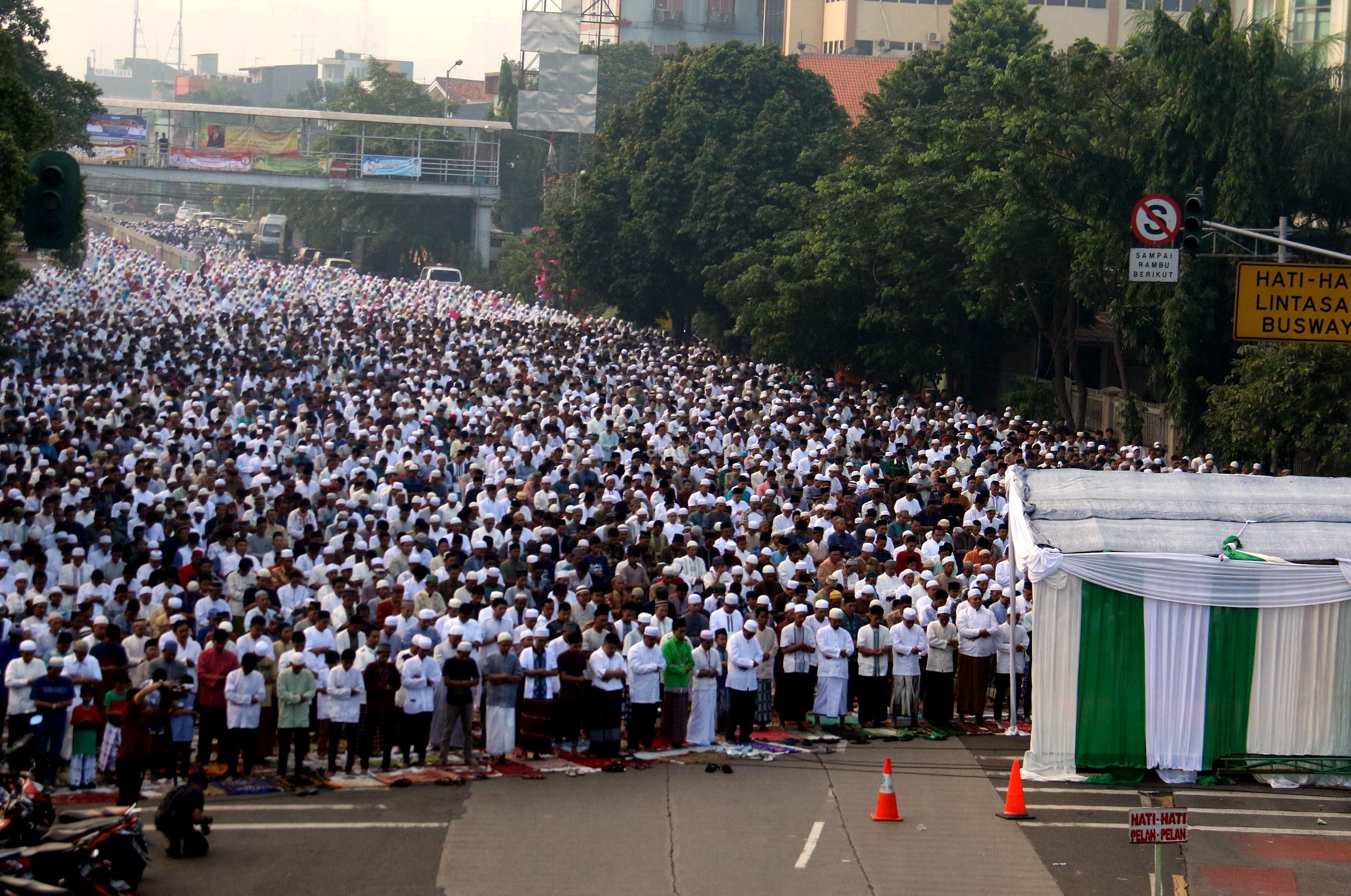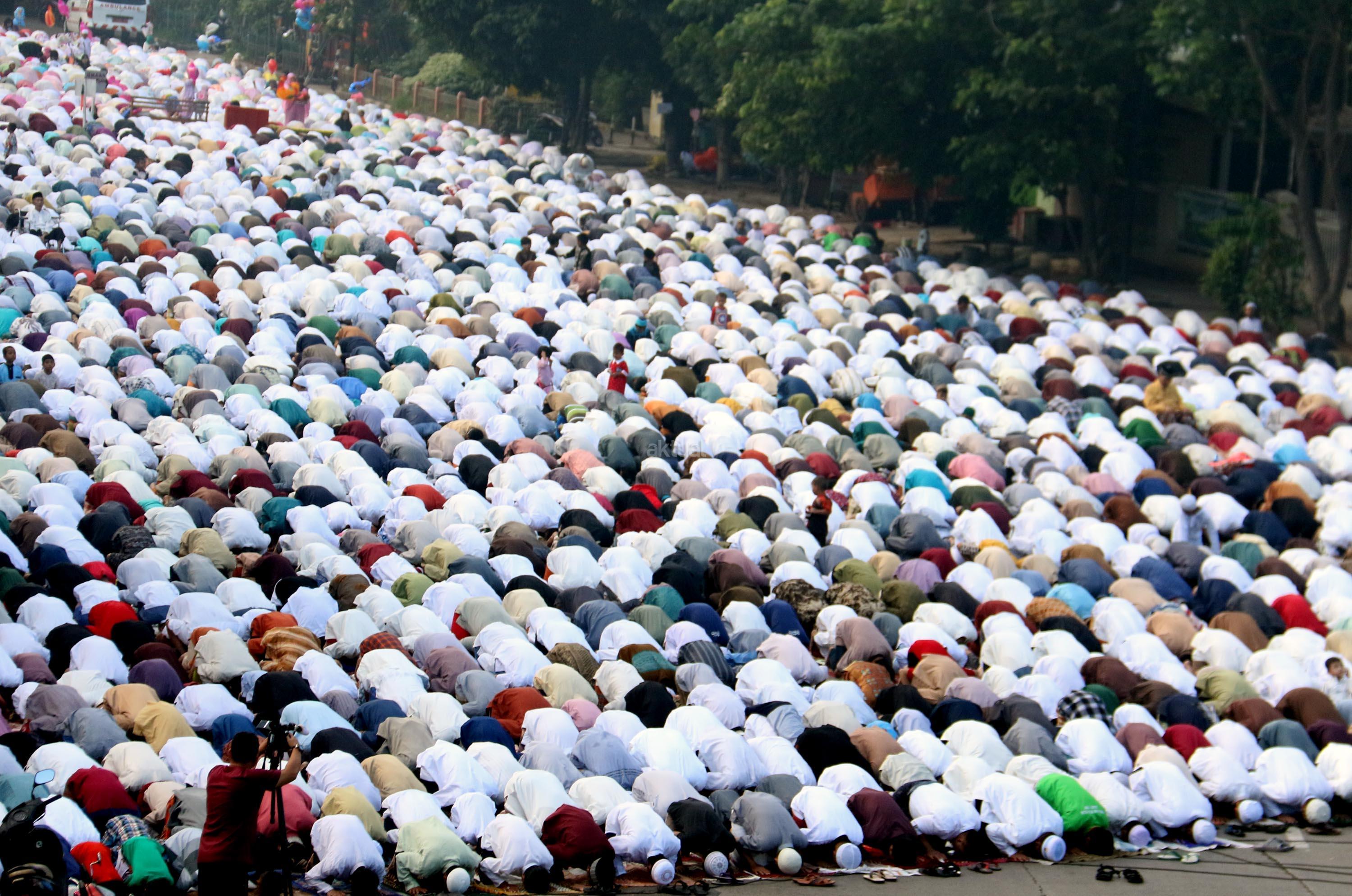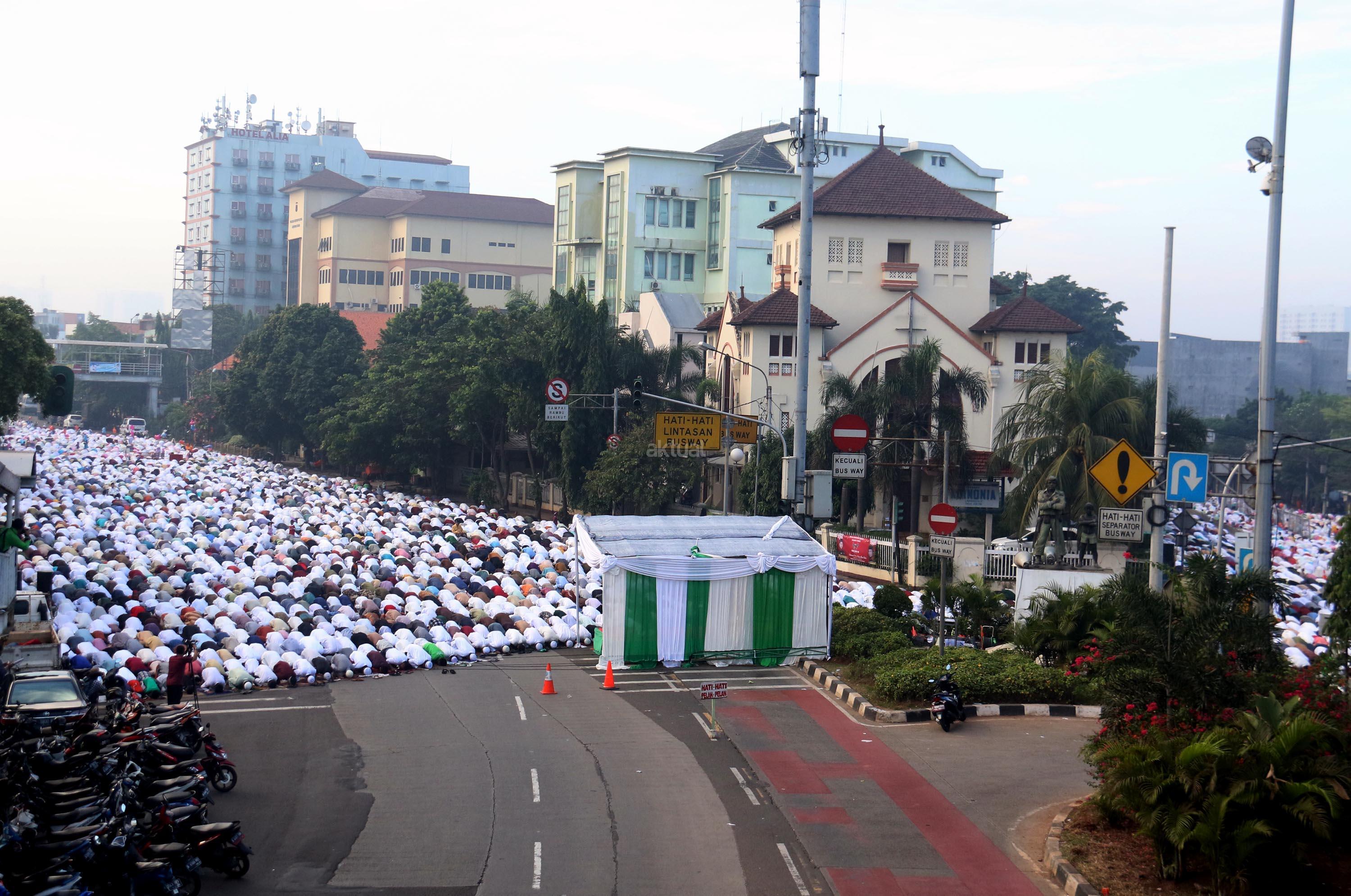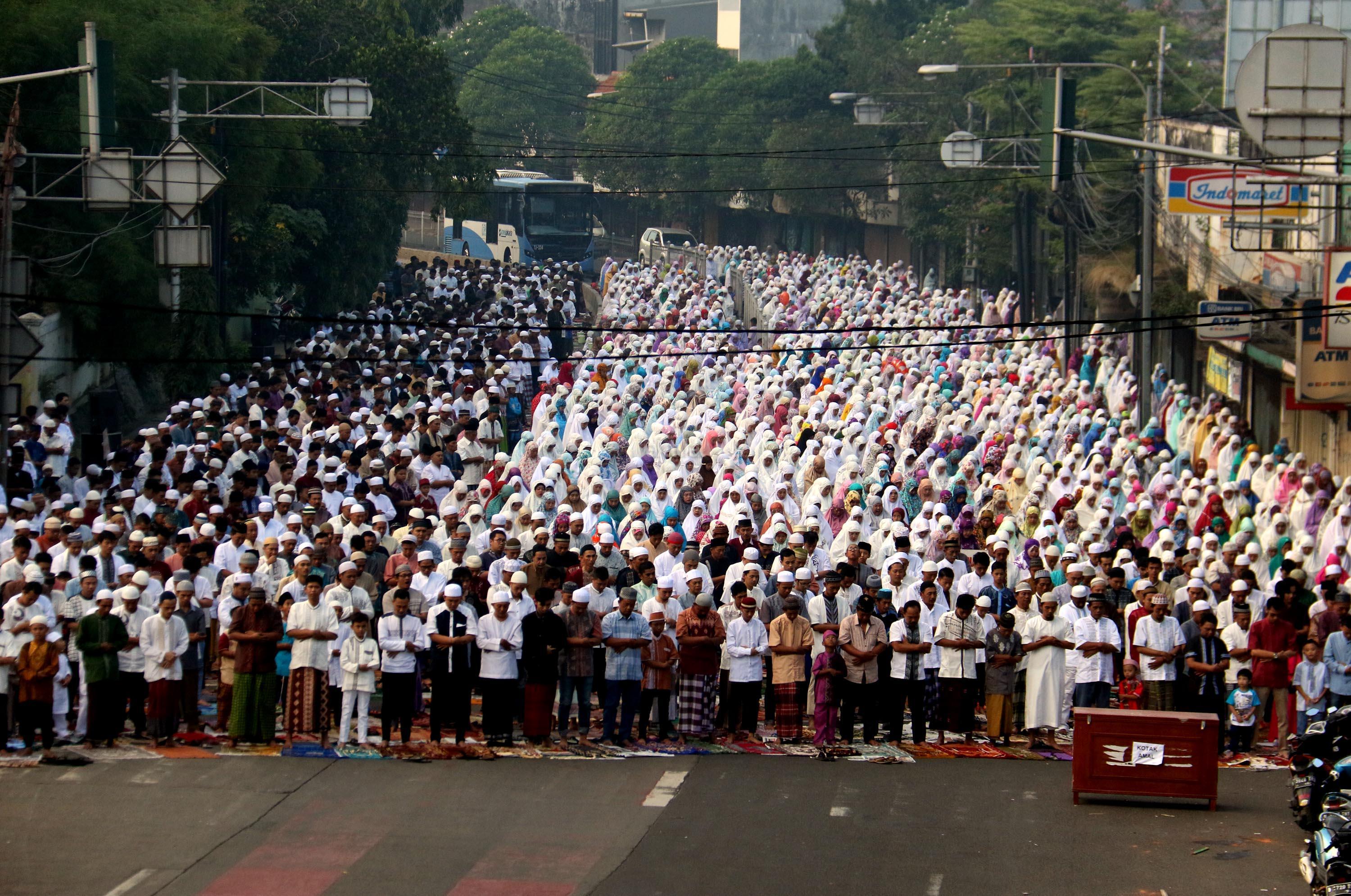 Terlihat ribuan umat muslim mengikuti salat Idul Fitri 1438 H di Jatinegara, Jakarta Timur, Minggu (25/6/2017). Pemerintah menetapkan hari raya Idul Fitri 1438 H jatuh pada hari ini Minggu (25/6/2017). AKTUAL/Munzir