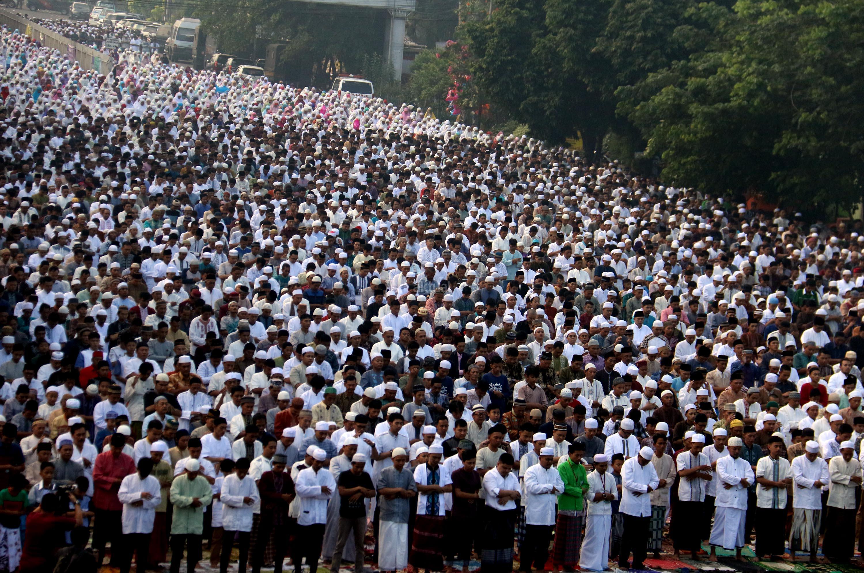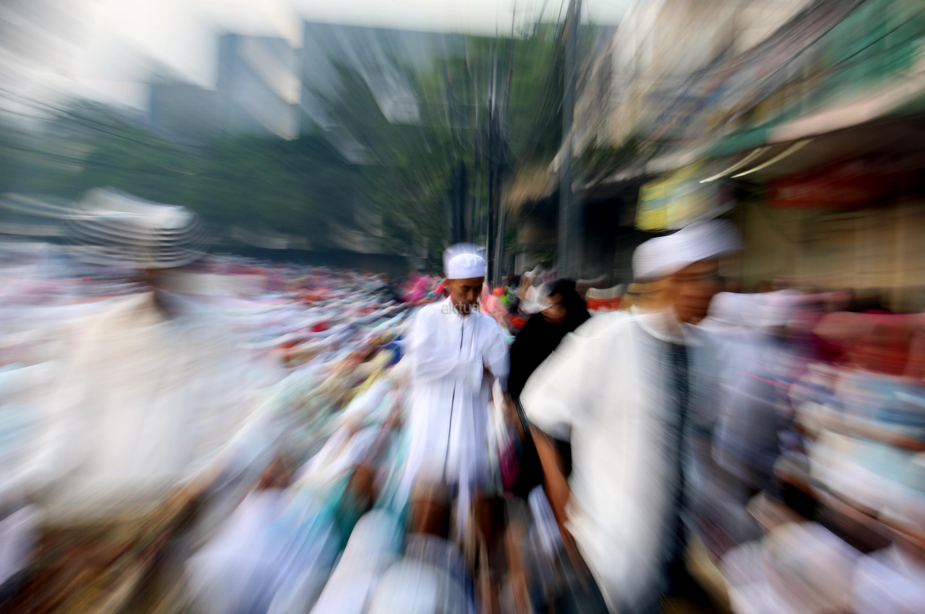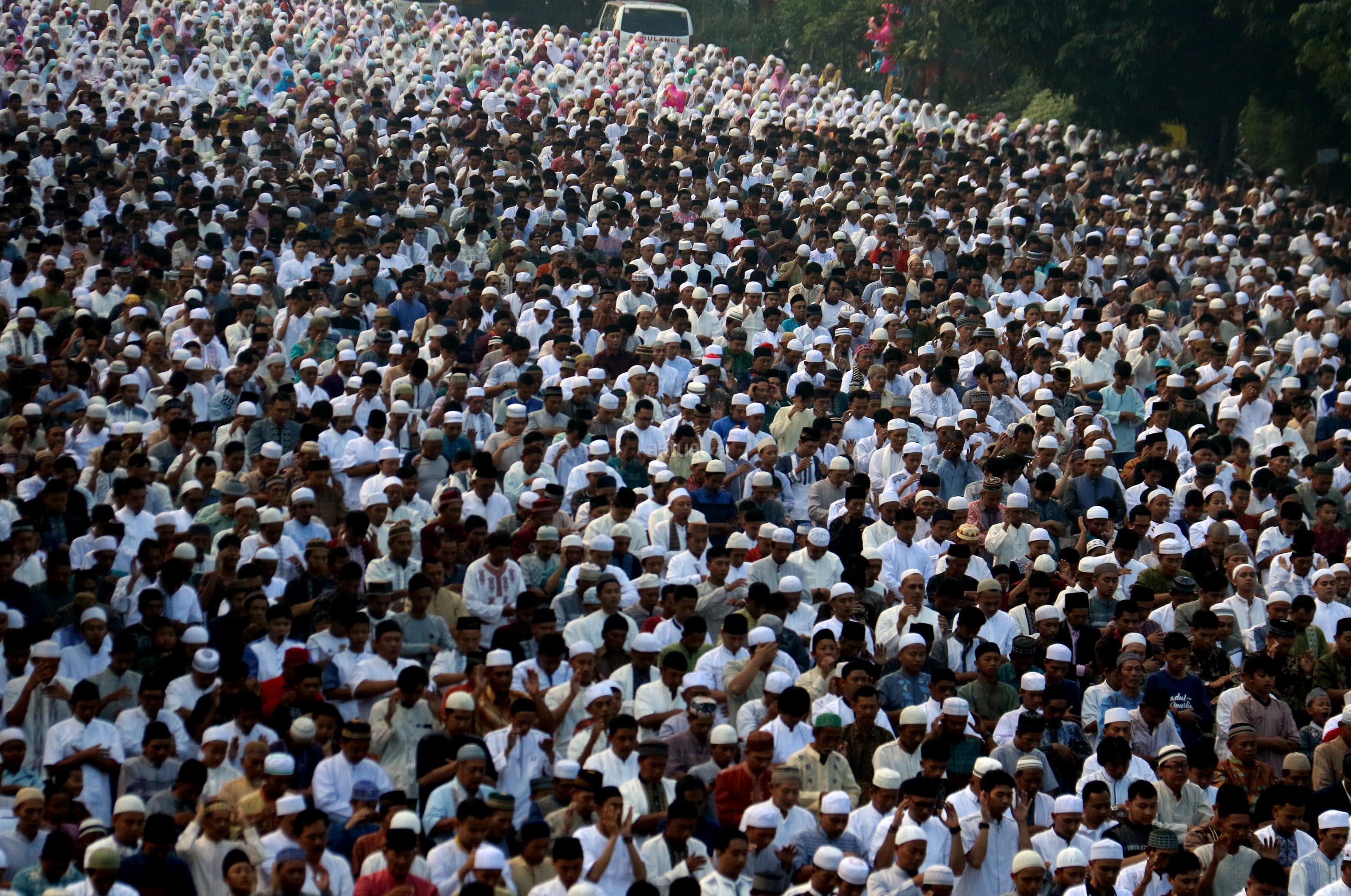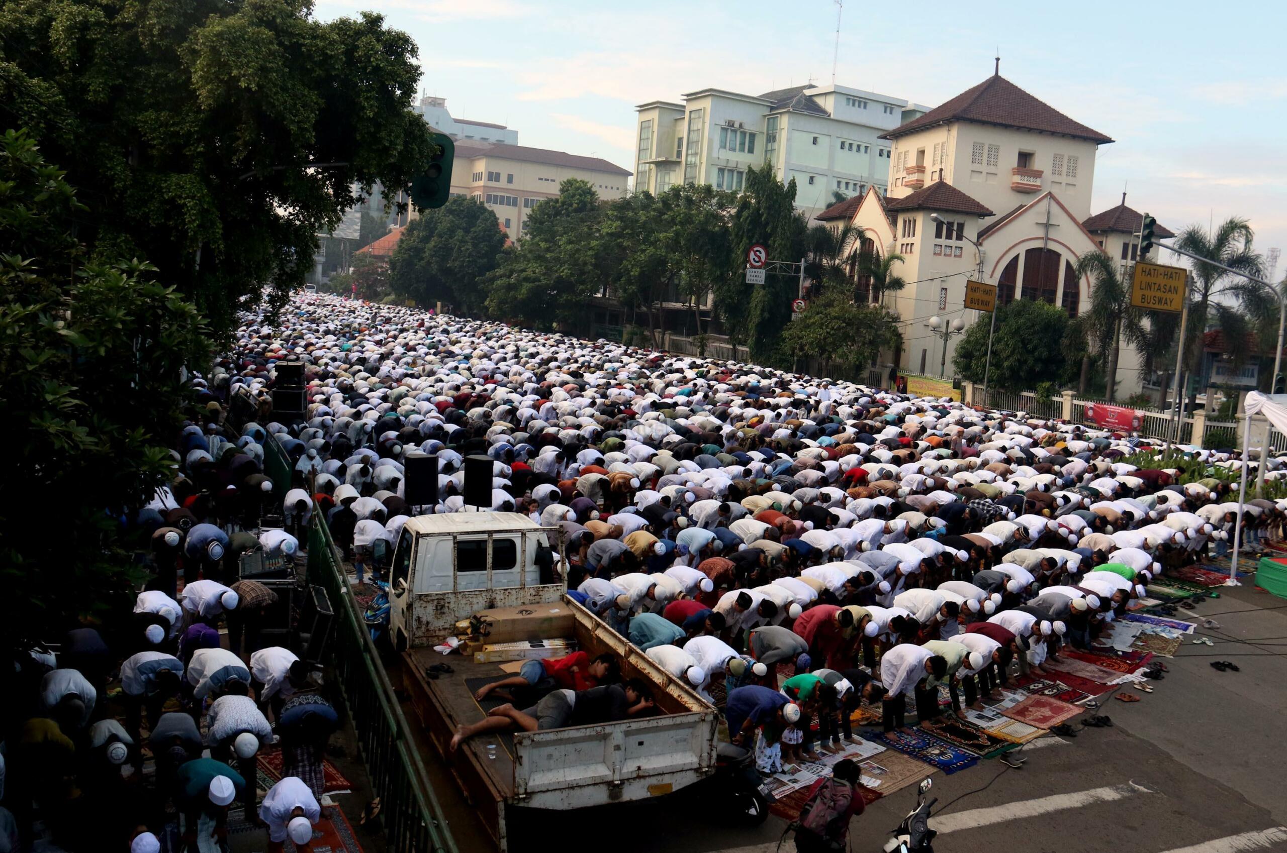 Terlihat ribuan umat muslim mengikuti salat Idul Fitri 1438 H di Jatinegara, Jakarta Timur, Minggu (25/6/2017). Pemerintah menetapkan hari raya Idul Fitri 1438 H jatuh pada hari ini Minggu (25/6/2017). AKTUAL/Munzir