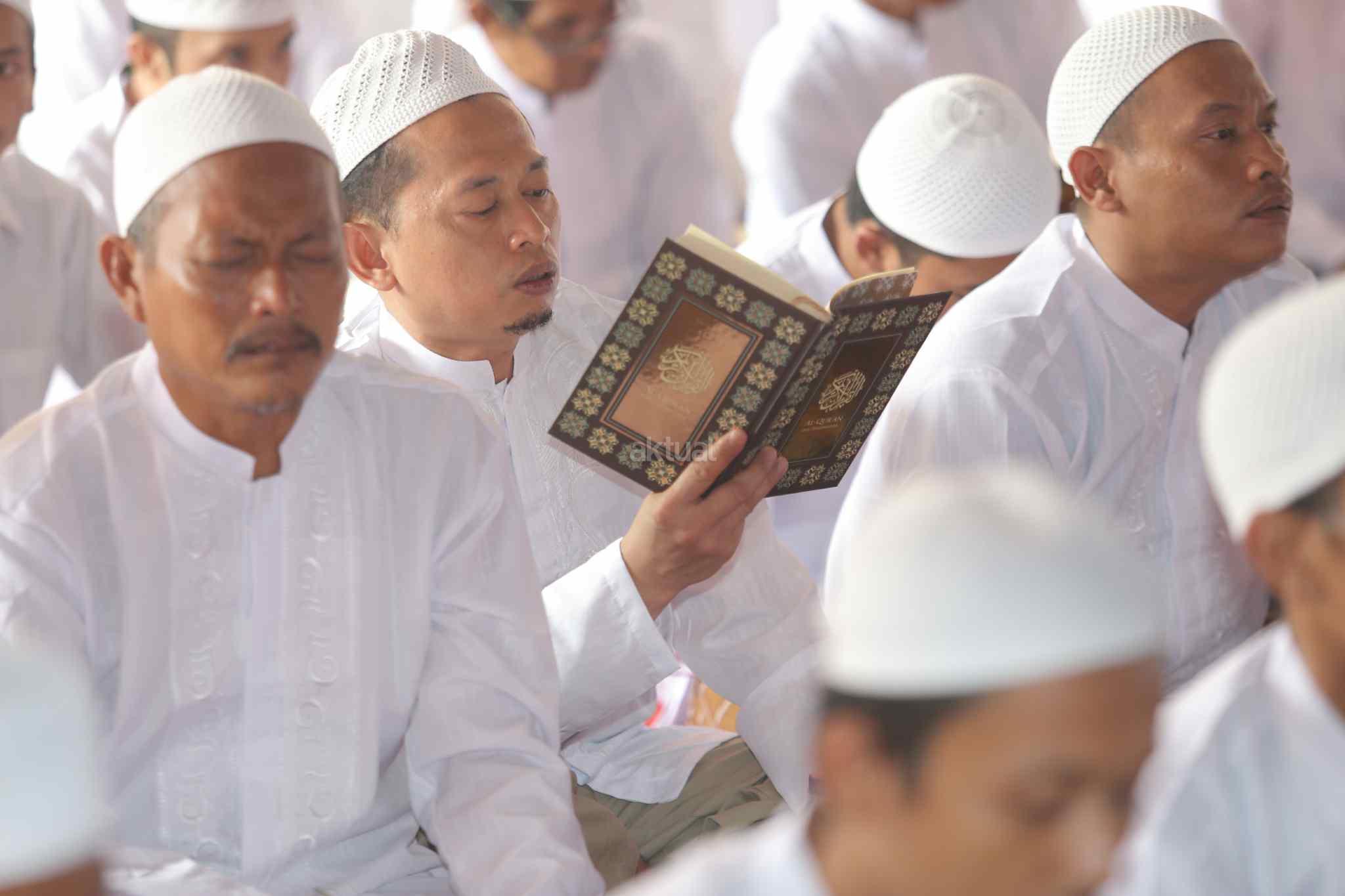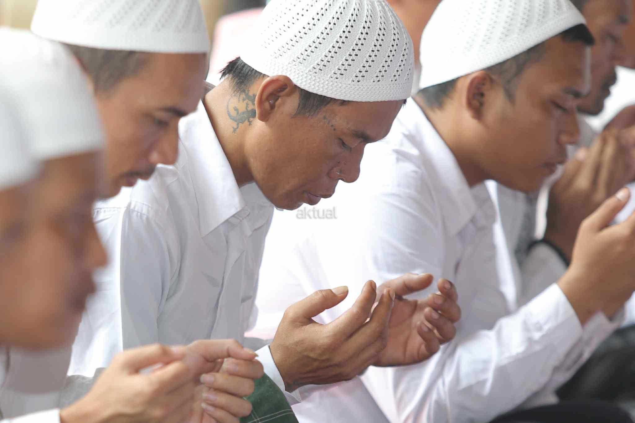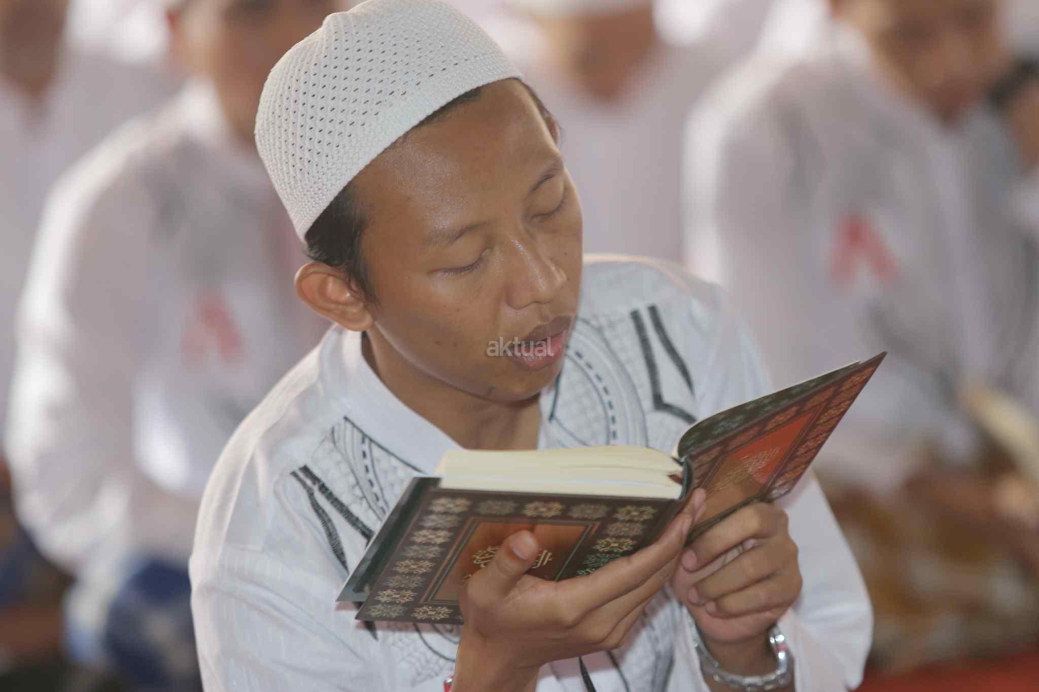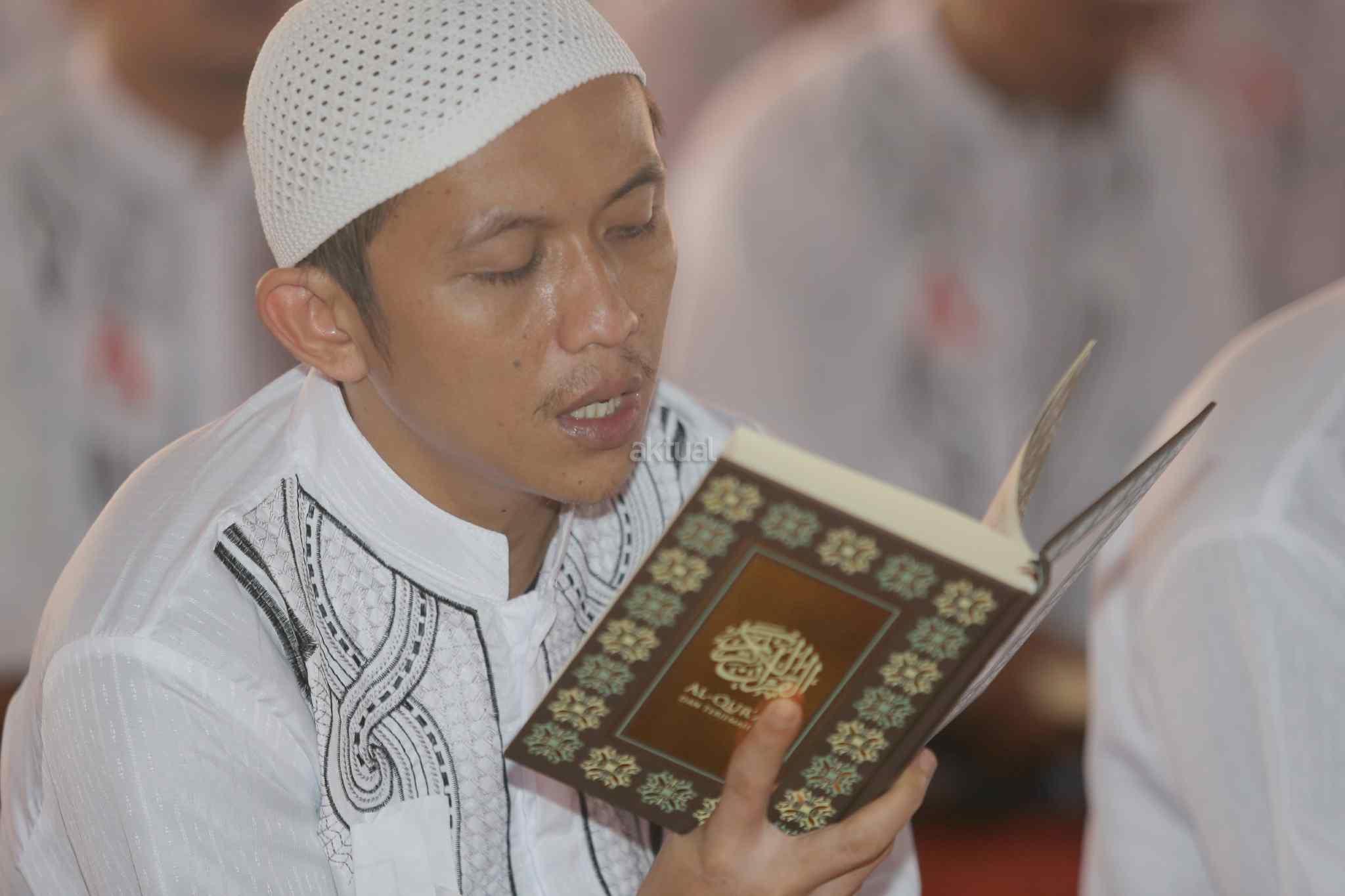 Ribuan warga binaan melantukan ayat-ayat suci Al-Quran dalam rangka peringatan Hari Bhakti Pemasyarakatan yang ke-53 di Rumah Tahanan Negara (Rutan) Kelas I Cipinang, Jakarta Timur, Kamis (20/4). Mengenakan baju koko putih dan peci, para napi yang mengaji disiarkan langsung melalui aplikasi Zoom dan terkoneksi dengan sejumlah lapas, rutan, dan Lembaga Pembinaan Khusus Anak (LPKA) lainnya di seluruh Indonesia, serta oleh seluruh jajaran Direktorat Jenderal Pemasyarakatan. Kegiatan ini berhasil tercatat dalam Museum Rekor Indonesia (Muri). AKTUAL/Tino Oktaviano
