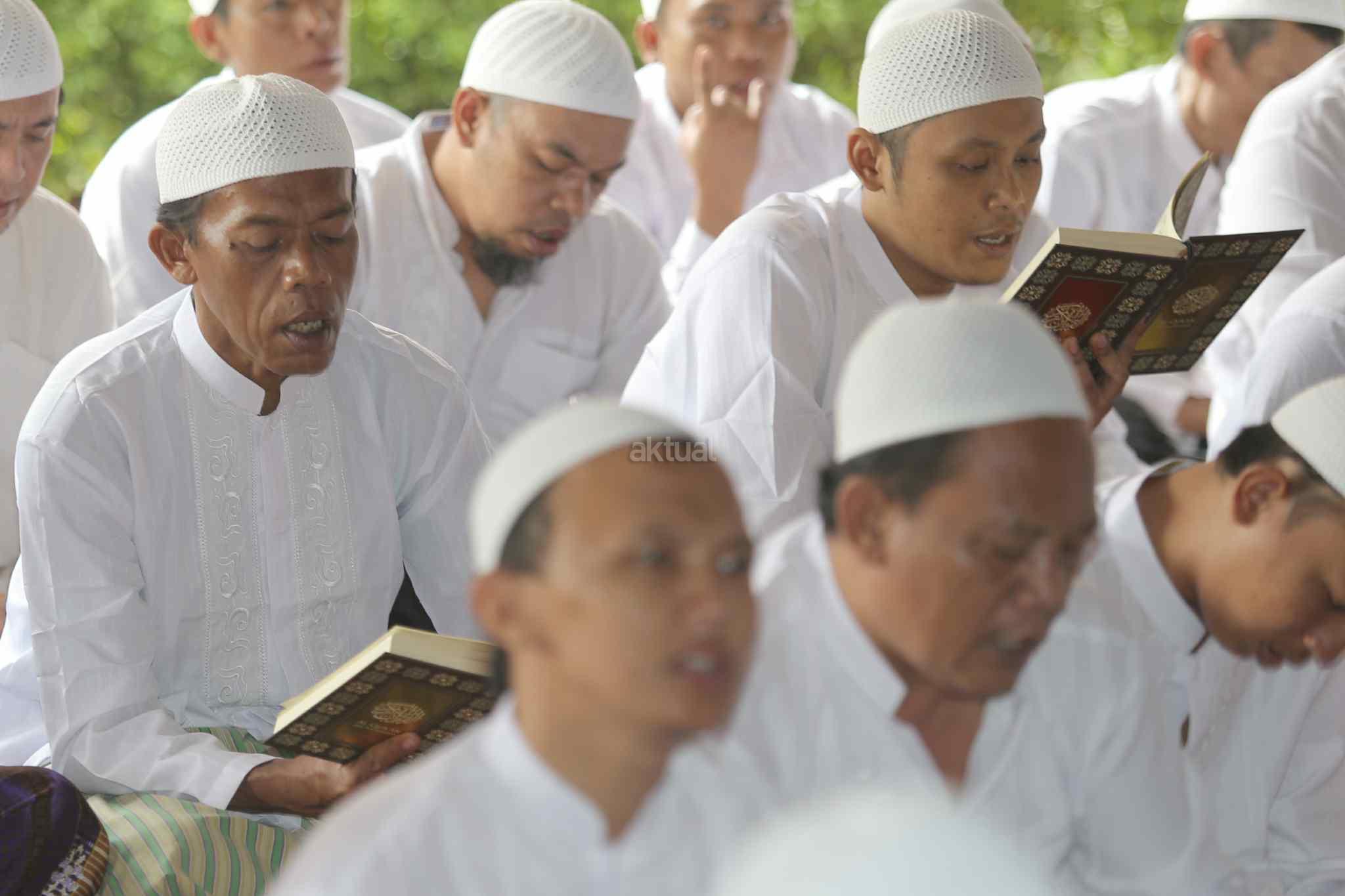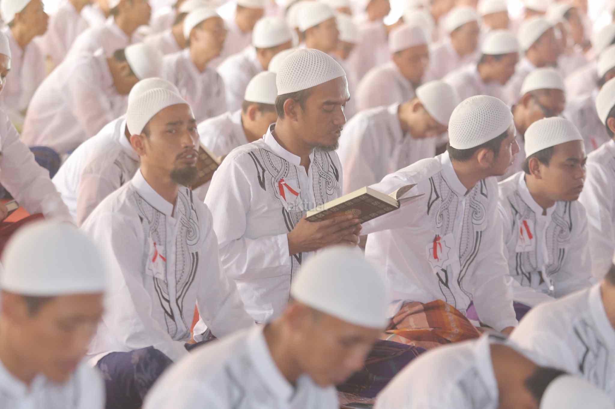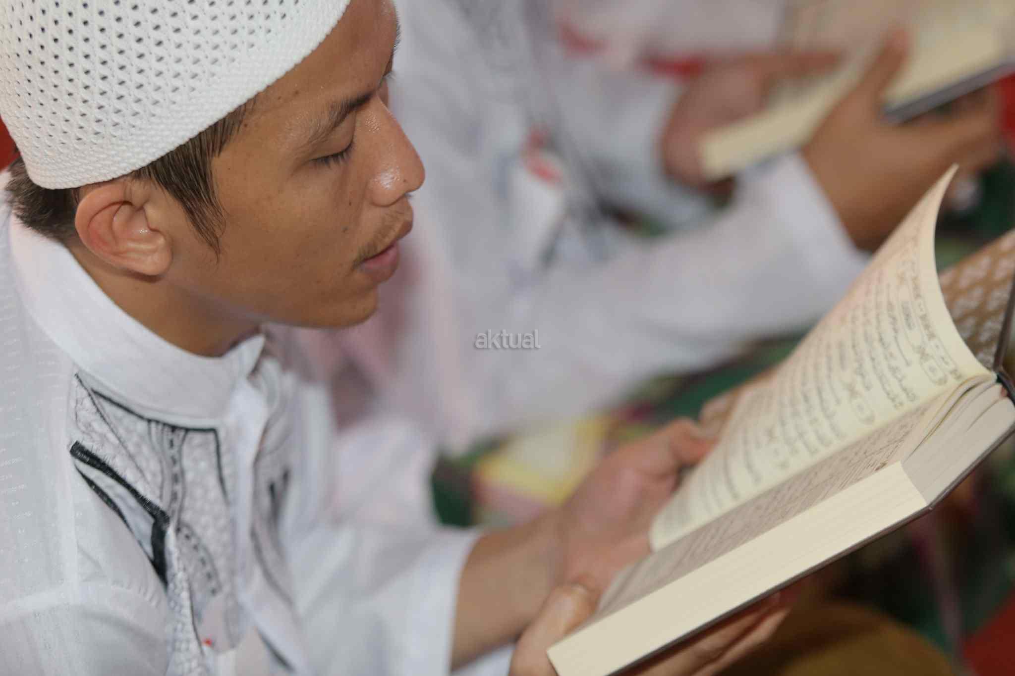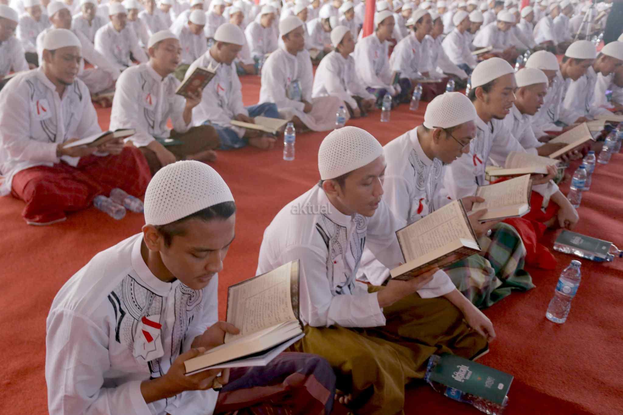 Ribuan warga binaan melantukan ayat-ayat suci Al-Quran dalam rangka peringatan Hari Bhakti Pemasyarakatan yang ke-53 di Rumah Tahanan Negara (Rutan) Kelas I Cipinang, Jakarta Timur, Kamis (20/4). Mengenakan baju koko putih dan peci, para napi yang mengaji disiarkan langsung melalui aplikasi Zoom dan terkoneksi dengan sejumlah lapas, rutan, dan Lembaga Pembinaan Khusus Anak (LPKA) lainnya di seluruh Indonesia, serta oleh seluruh jajaran Direktorat Jenderal Pemasyarakatan. Kegiatan ini berhasil tercatat dalam Museum Rekor Indonesia (Muri). AKTUAL/Tino Oktaviano