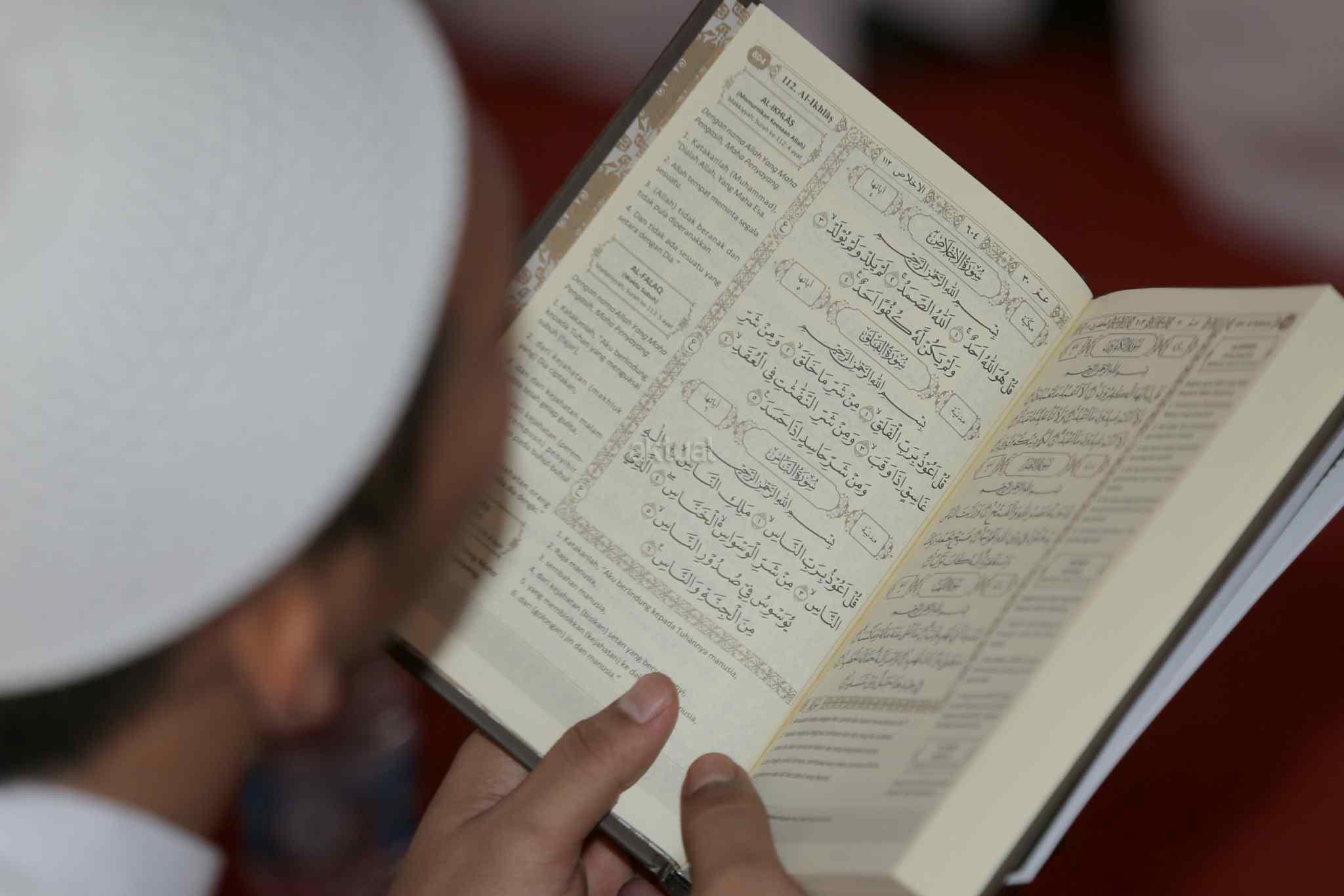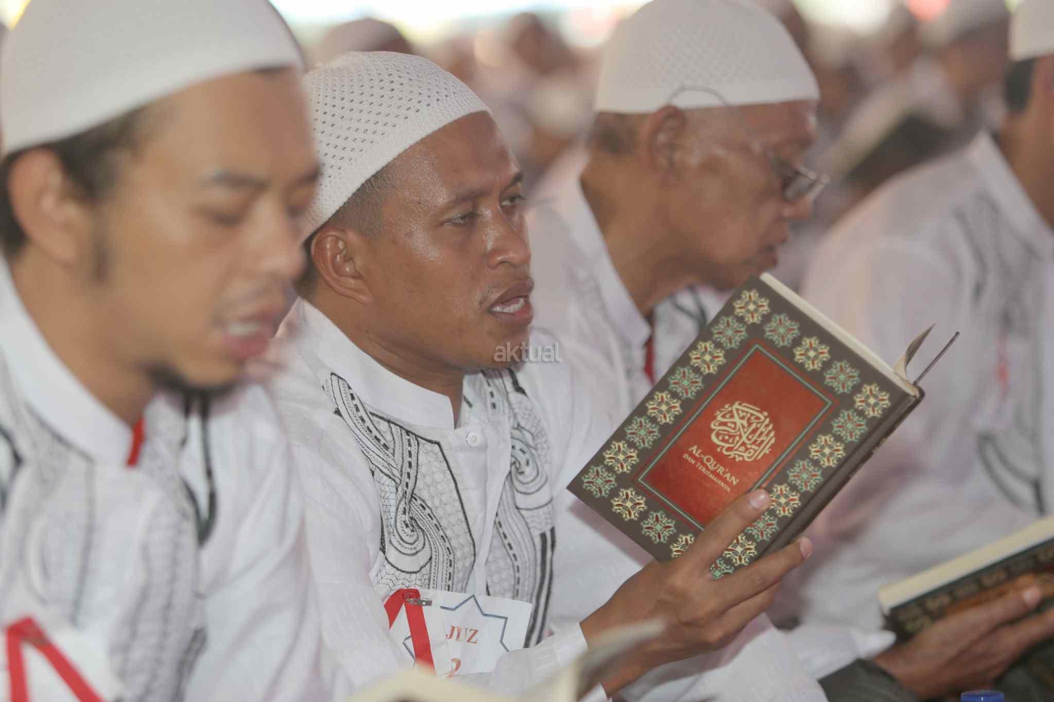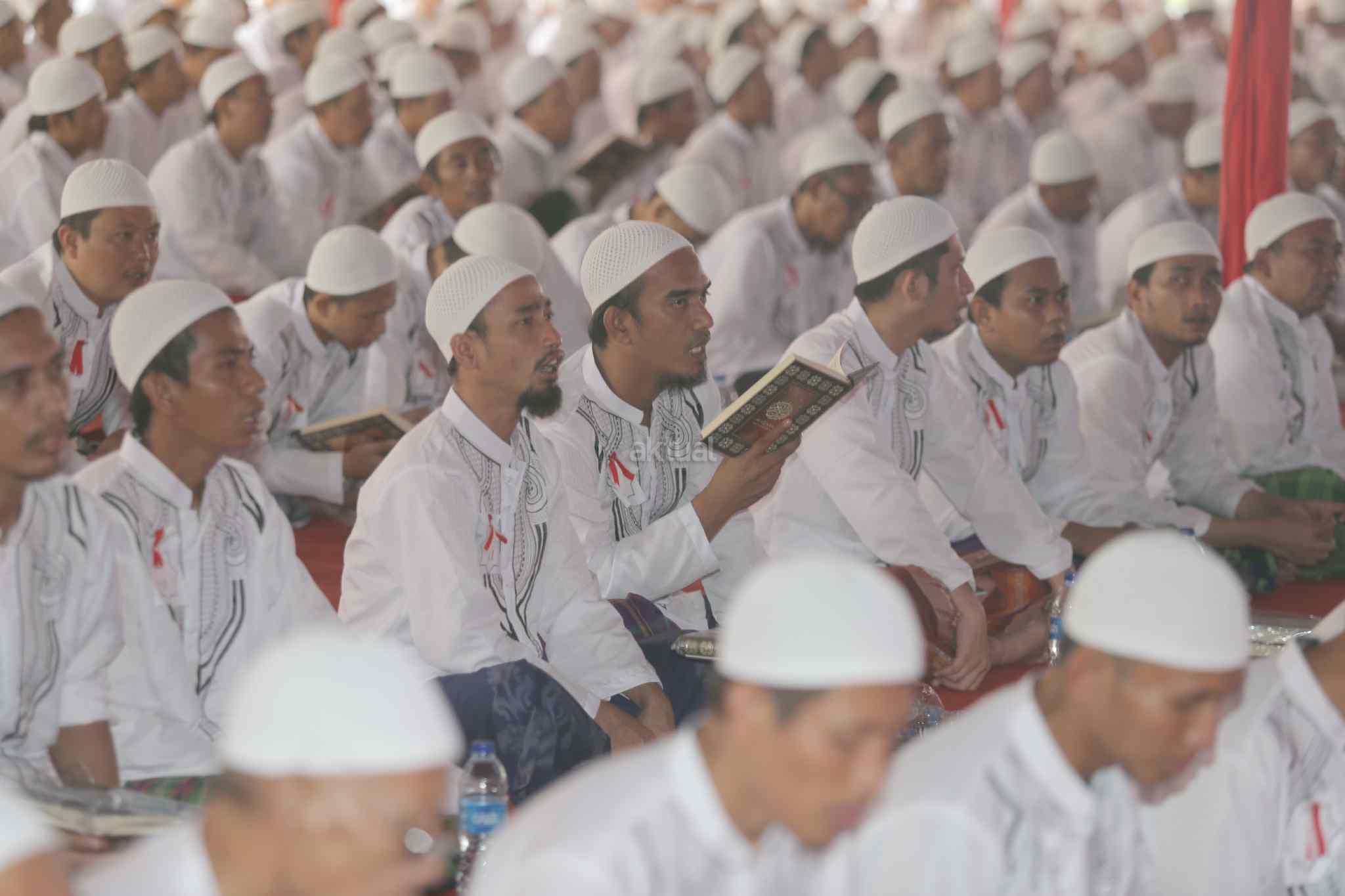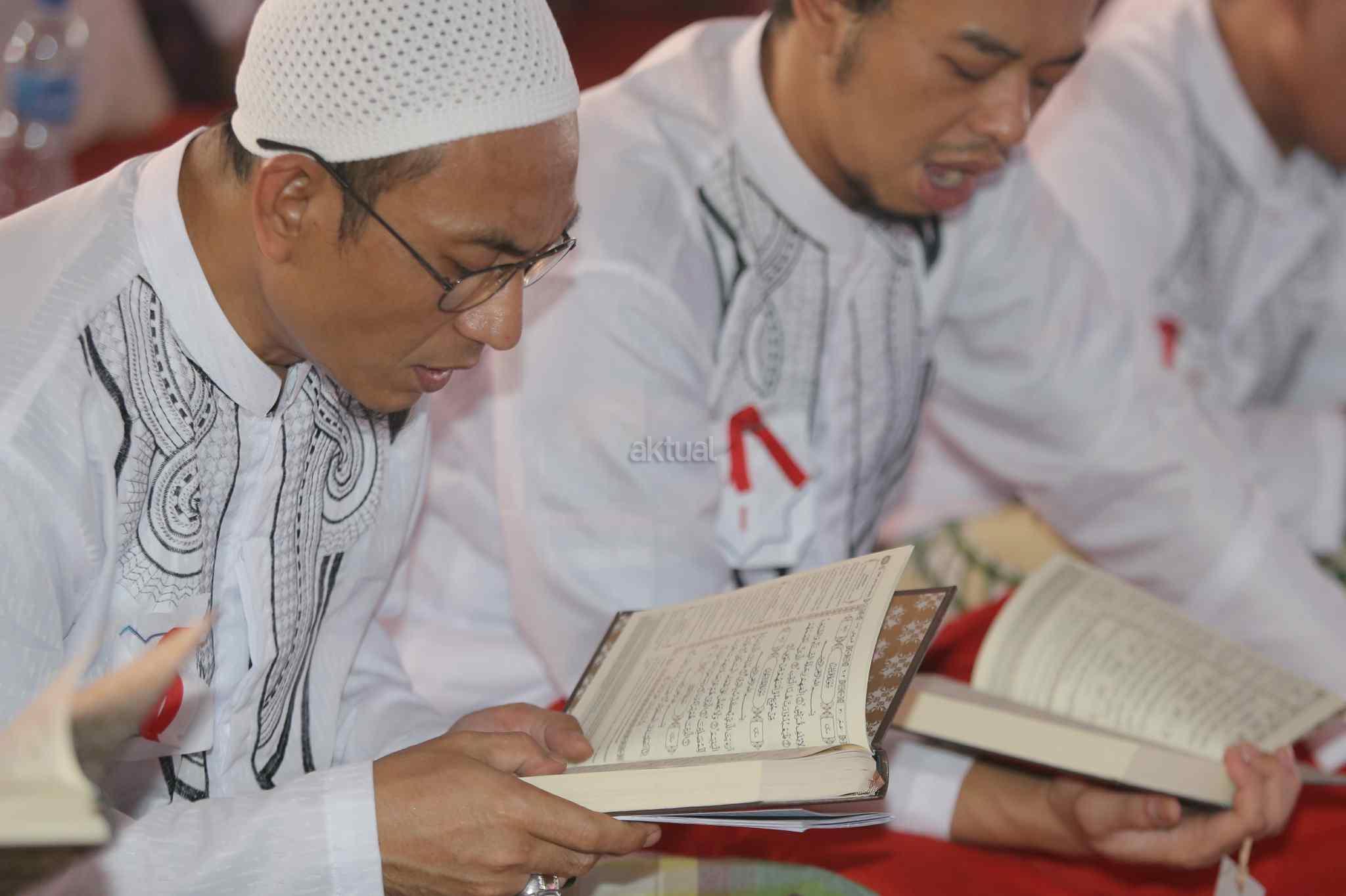 Ribuan warga binaan melantukan ayat-ayat suci Al-Quran dalam rangka peringatan Hari Bhakti Pemasyarakatan yang ke-53 di Rumah Tahanan Negara (Rutan) Kelas I Cipinang, Jakarta Timur, Kamis (20/4). Mengenakan baju koko putih dan peci, para napi yang mengaji disiarkan langsung melalui aplikasi Zoom dan terkoneksi dengan sejumlah lapas, rutan, dan Lembaga Pembinaan Khusus Anak (LPKA) lainnya di seluruh Indonesia, serta oleh seluruh jajaran Direktorat Jenderal Pemasyarakatan. Kegiatan ini berhasil tercatat dalam Museum Rekor Indonesia (Muri). AKTUAL/Tino Oktaviano