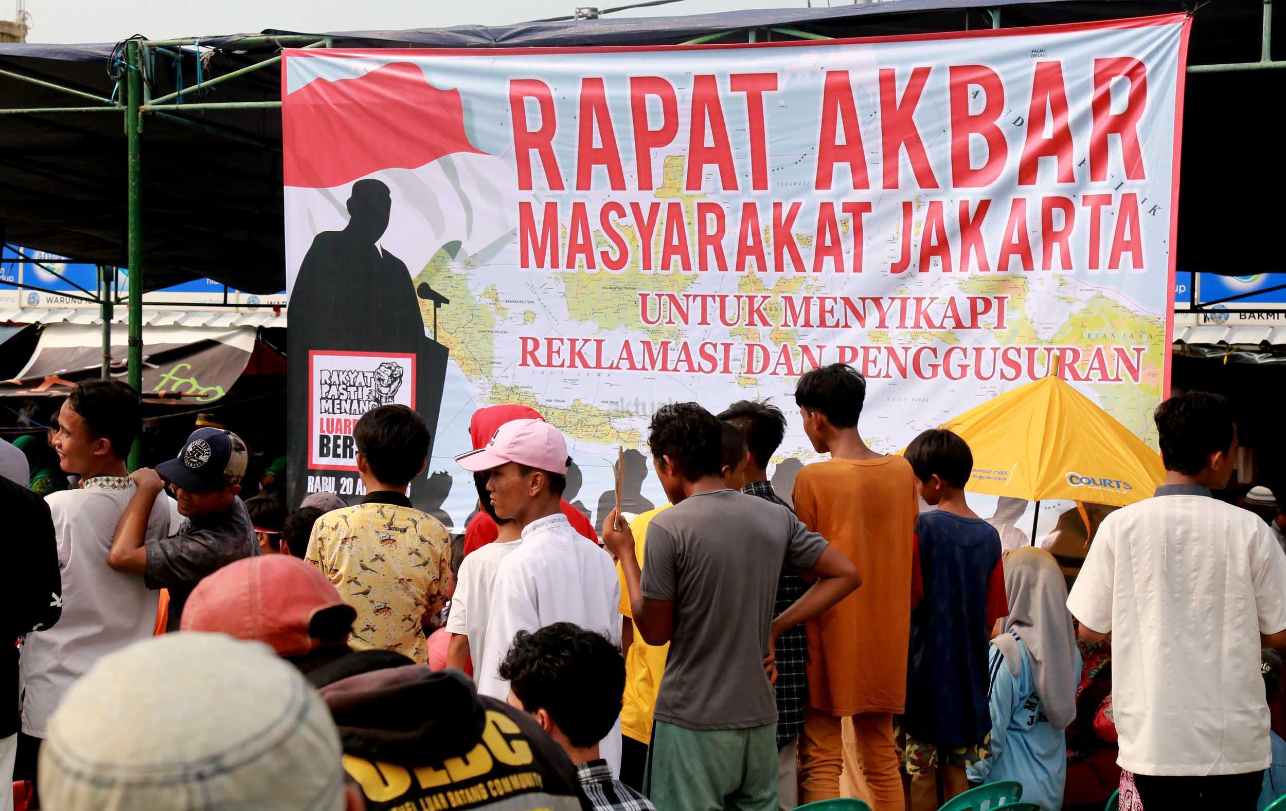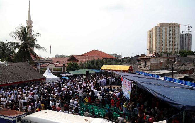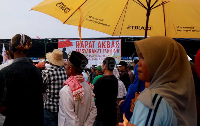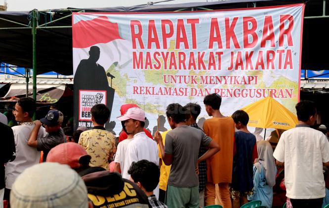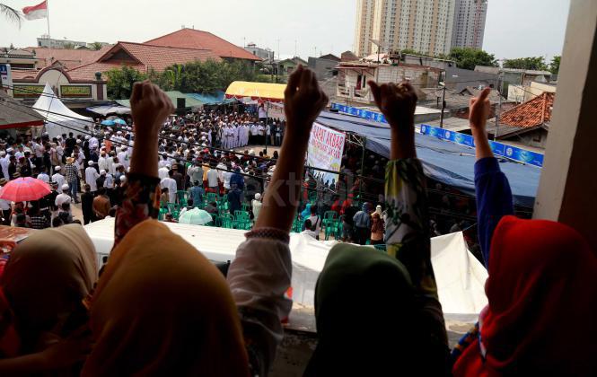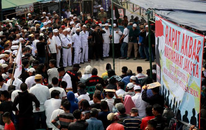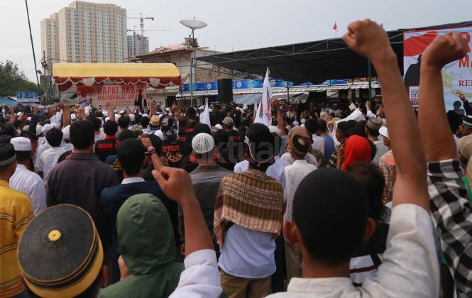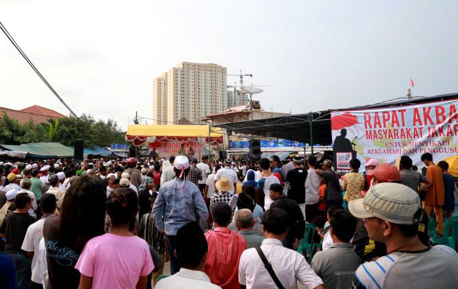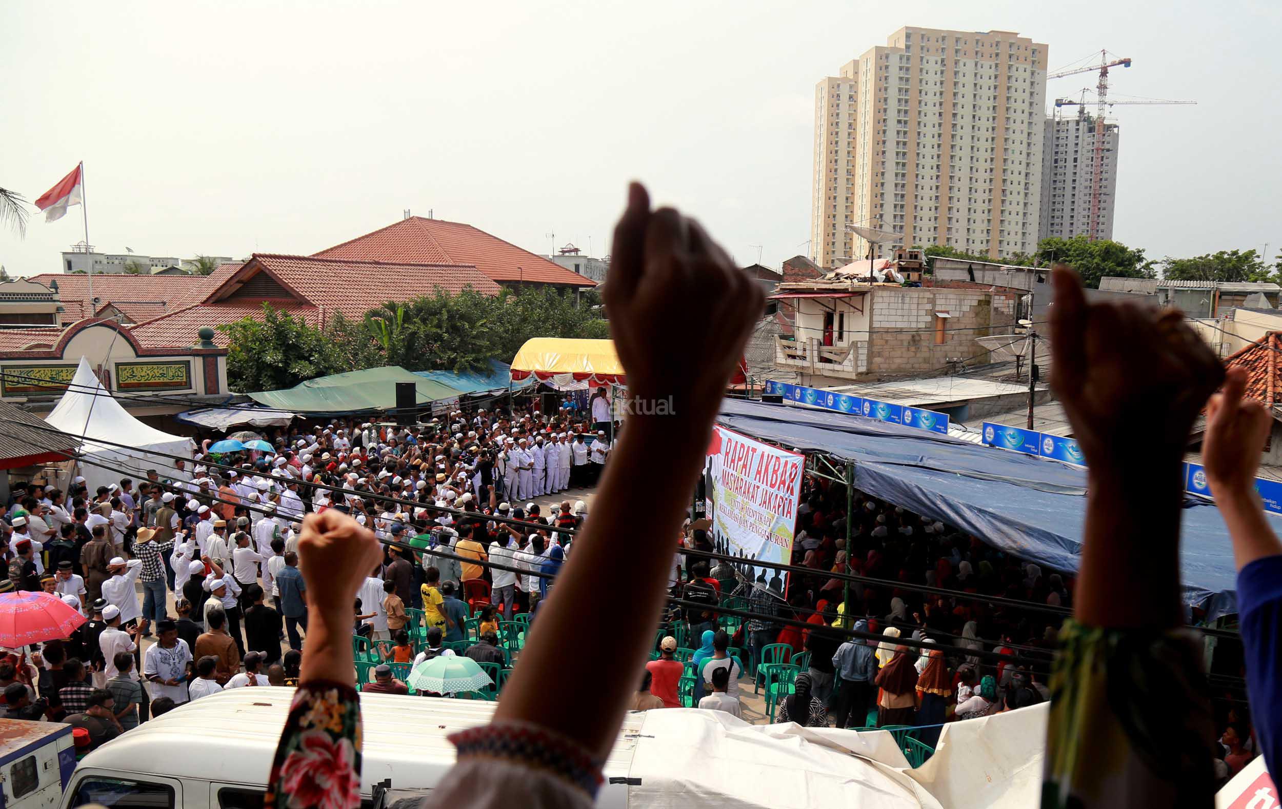 Ribuan warga Kampung Luar Batang bersama para korban pengusuran menggelar Rapat Akbar Masyarakat Jakarta di halaman Masjid Keramat Luar Batang, Jakarta, Rabu (20/4/2016). Dalam Rapat akbar masyarakat Luar Batang untuk menolak kezaliman yang dilakukan Pemprov DKI Jakarta dan menolak penggusuran dan penertiban terhadap warga Luar Batang.
