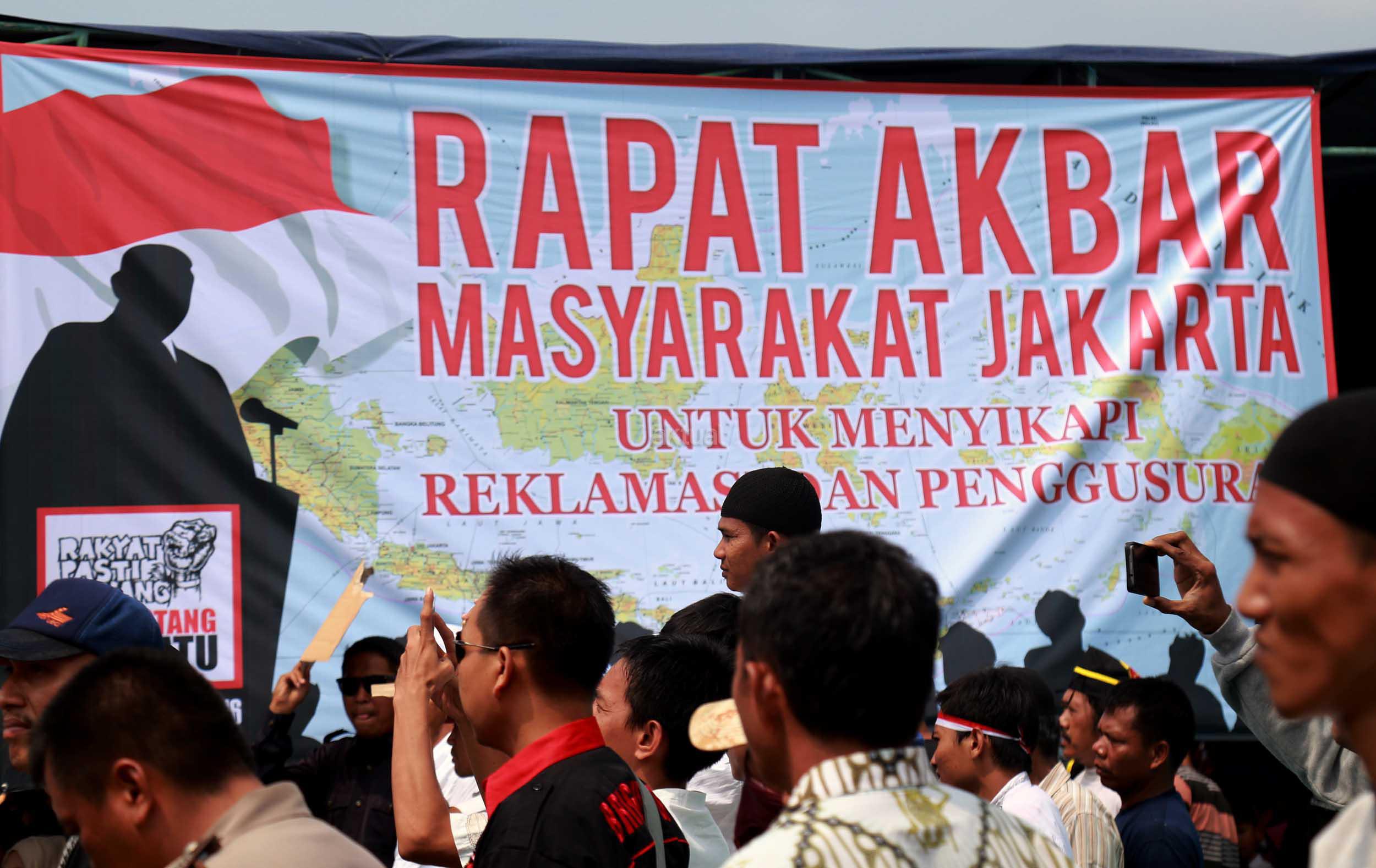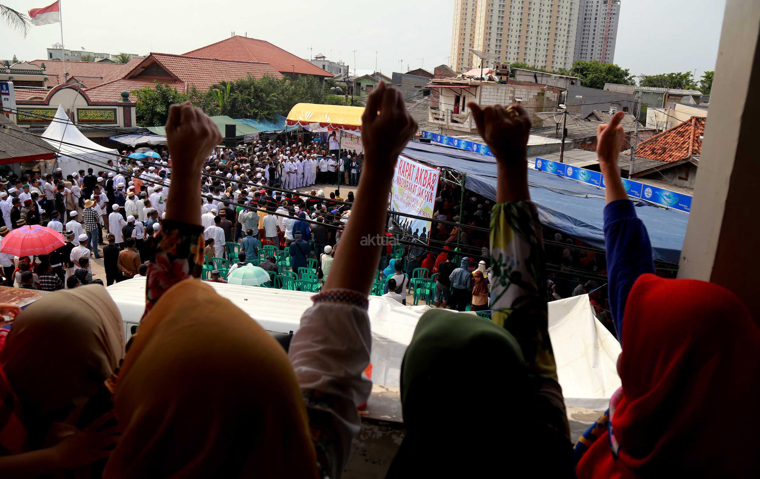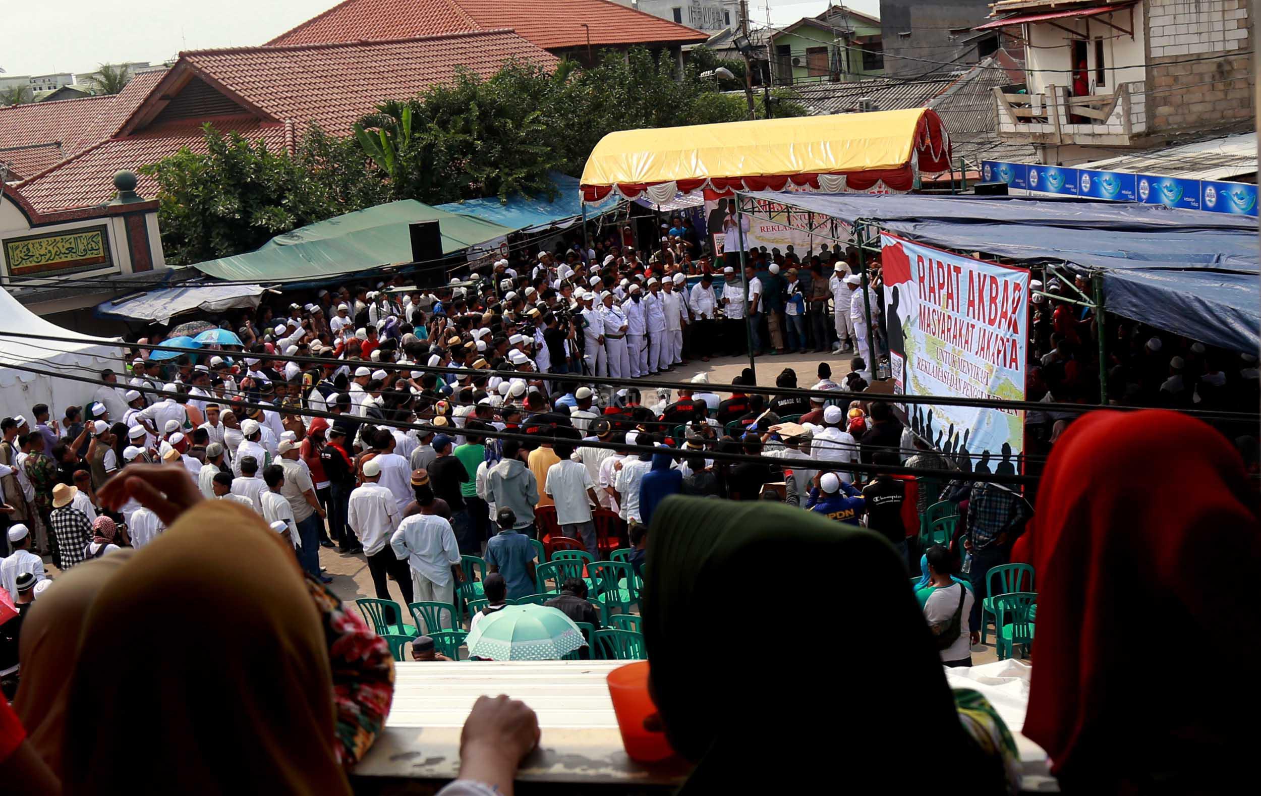 Ribuan warga Kampung Luar Batang bersama para korban pengusuran menggelar Rapat Akbar Masyarakat Jakarta di halaman Masjid Keramat Luar Batang, Jakarta, Rabu (20/4/2016). Dalam Rapat akbar masyarakat Luar Batang untuk menolak kezaliman yang dilakukan Pemprov DKI Jakarta dan menolak penggusuran dan penertiban terhadap warga Luar Batang.