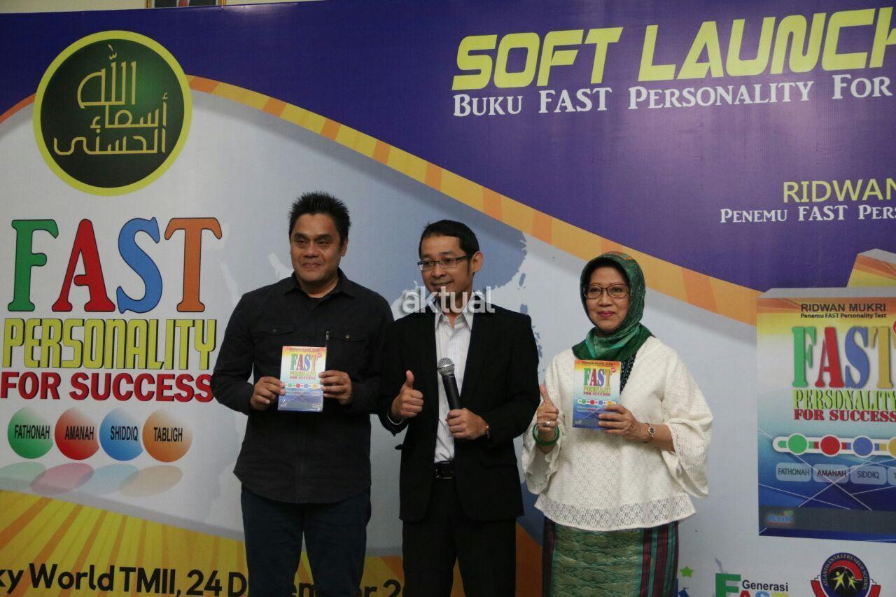 Tokoh Muda Indonesia Bidang Self Development Ridwan Mukri (tengah) didampingi Ibu angkatnya Iesje Latief (kanan) dan Musisi Dwiki Dharmawan (kiri) memperlihatkan buku FAST Personality saat acara Soft Launching di SkyWorld TMII, Jakarta, Sabtu (24/12/2016). Indonesia membutuhkan Gen FAST, yaitu generasi yang Fathonah (cerdas), Amanah (terpercaya), Shiddiq (benar), dan Tabligh (gemar menyampaikan kebaikan) untuk memerangi 4K: kebodohan, kebohongan, kemarahan, dan kebencian. Tokoh muda di bidang self develo pment Ridwan Mukri menulis buku FAST Personality for Success, menemukan alat uji kepribadian FAST Personality Test, dan mengembangkan program pembelajaran FAST Edutainment Learning untuk menciptakan Gen FAST di keluarga, sekolah, organisasi, perusahaan, sampai pemerintahan. AKTUAL/HO