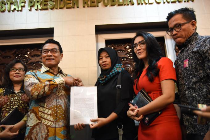 Kepala Staf Kepresidenan Moledoko saat menerima surat permohonan amnesti dari terpidana kasus pelanggaran UU ITE Baiq Nuril Maknun didampingi anggota DPR Fraksi PDI Perjuangan Rieke Diah Pitaloka di Kantor Staf Presiden, kompleks Istana Presiden, Jakarta, Senin (15/7/2019). AKTUAL/IST