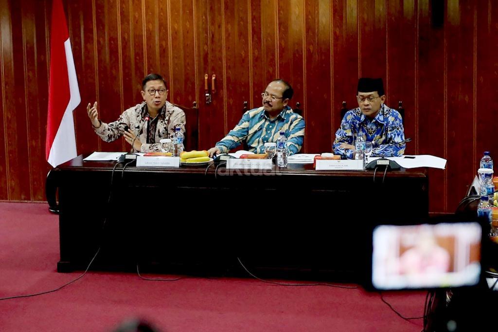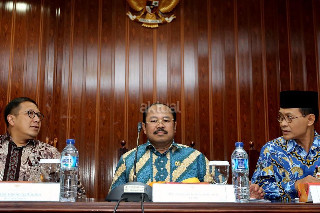 Menteri Agama Lukman Hakim Saifuddin (kiri), Ketua Ombudsman Amzulian Rifai (tengah) dan anggota Ombudsman Ahmad Su’adi menjawab pertanyaan rilis hasil investigasi pelaksanaan biro umrah di Kantor Ombudsman, Jakarta, Rabu (4/10/2017). Ombudsman menyampaikan rilis investigasi serta meminta klarifikasi sejumlah pihak, salah satunya Kementerian Agama mengenai tata kelola pelayanan umrah, terkait kasus salah satunya first travel. AKTUAL/Munzir