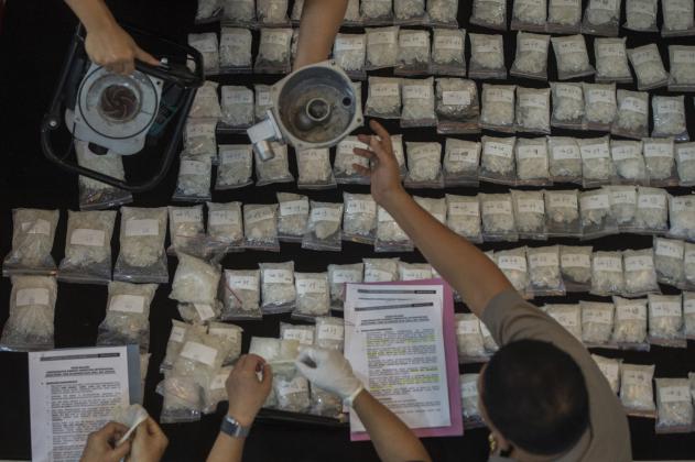 Petugas memperlihatkan barang bukti kejahatan narkotika berupa sabu-sabu dalam rilis di Direktorat Tindak Pidana Narkoba Mabes Polri, Jakarta Timur, Jumat (18/9). Sabu sebanyak 15,5 kg itu diperkirakan bernilai Rp32 miliar yang melibatkan warga negara Nigeria merupakan sindikat internasional. ANTARA FOTO/Rosa Panggabean/Spt/15.