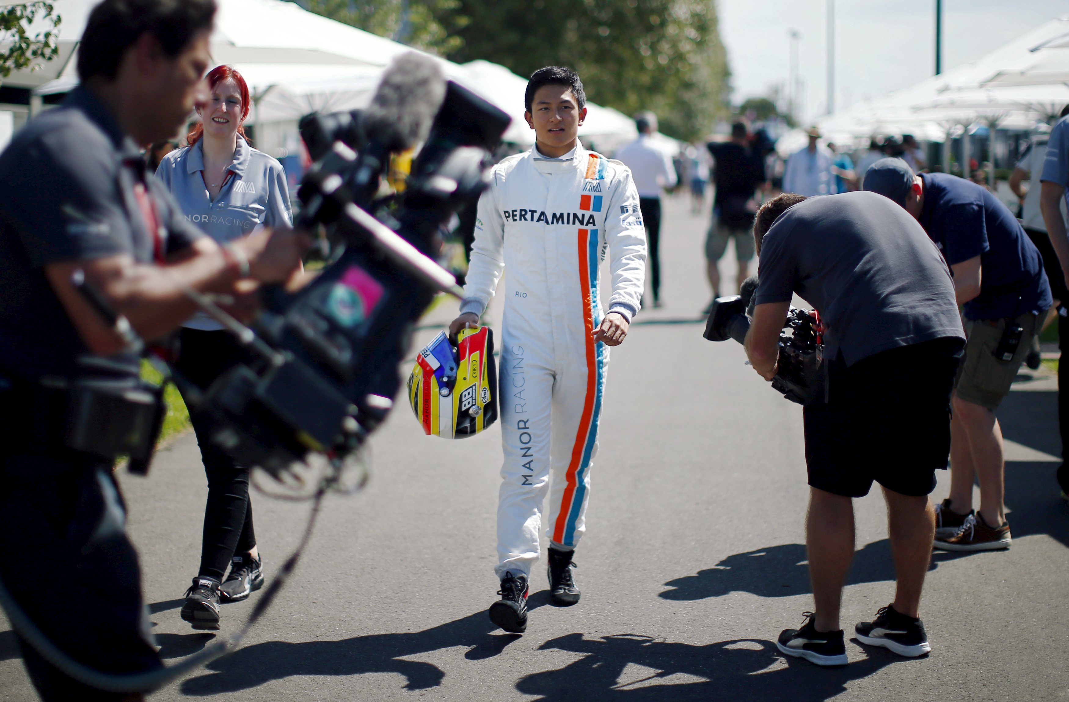 Pembalap Manor Racing Rio Haryanto berjalan untuk pemotretan pebalap sebelum dimulainya Formula 1 GP Australia di Melbourne, Kamis (17/3). Rio mencatat sejarah sebagai pebalap Indonesia pertama yang bisa ikut beraksi dalam balap mobil bergengsi ajang F1. ANTARA FOTO/REUTERS/Brandon Malone/djo/pd/16 *** Local Caption *** Formula One - Australia Grand Prix - Melbourne, Australia - 17/03/16 - Manor Racing F1 driver Rio Haryanto walks to a drivers portrait session before the Australian Formula One Grand Prix in Melbourne. REUTERS/Jason Reed