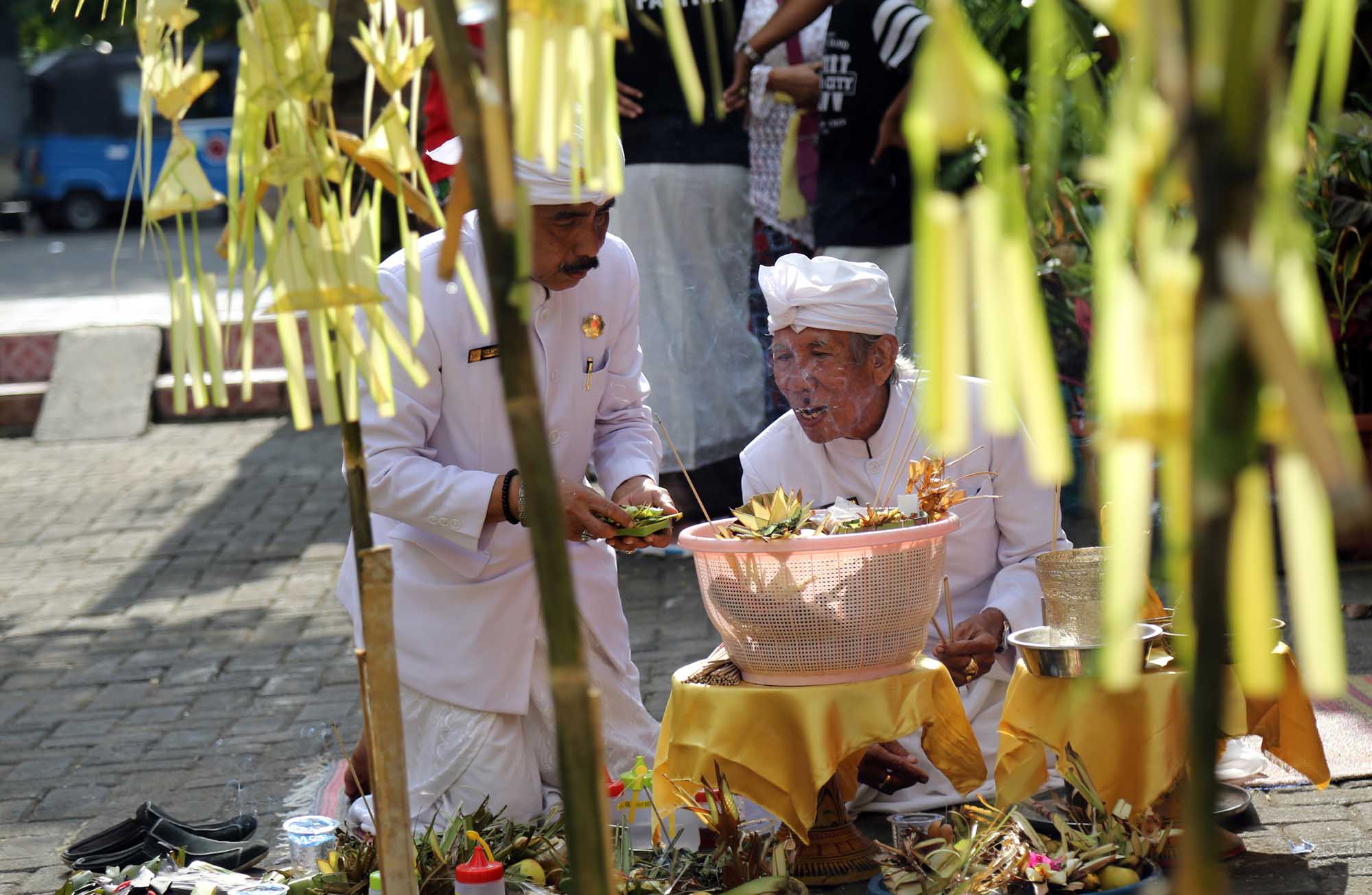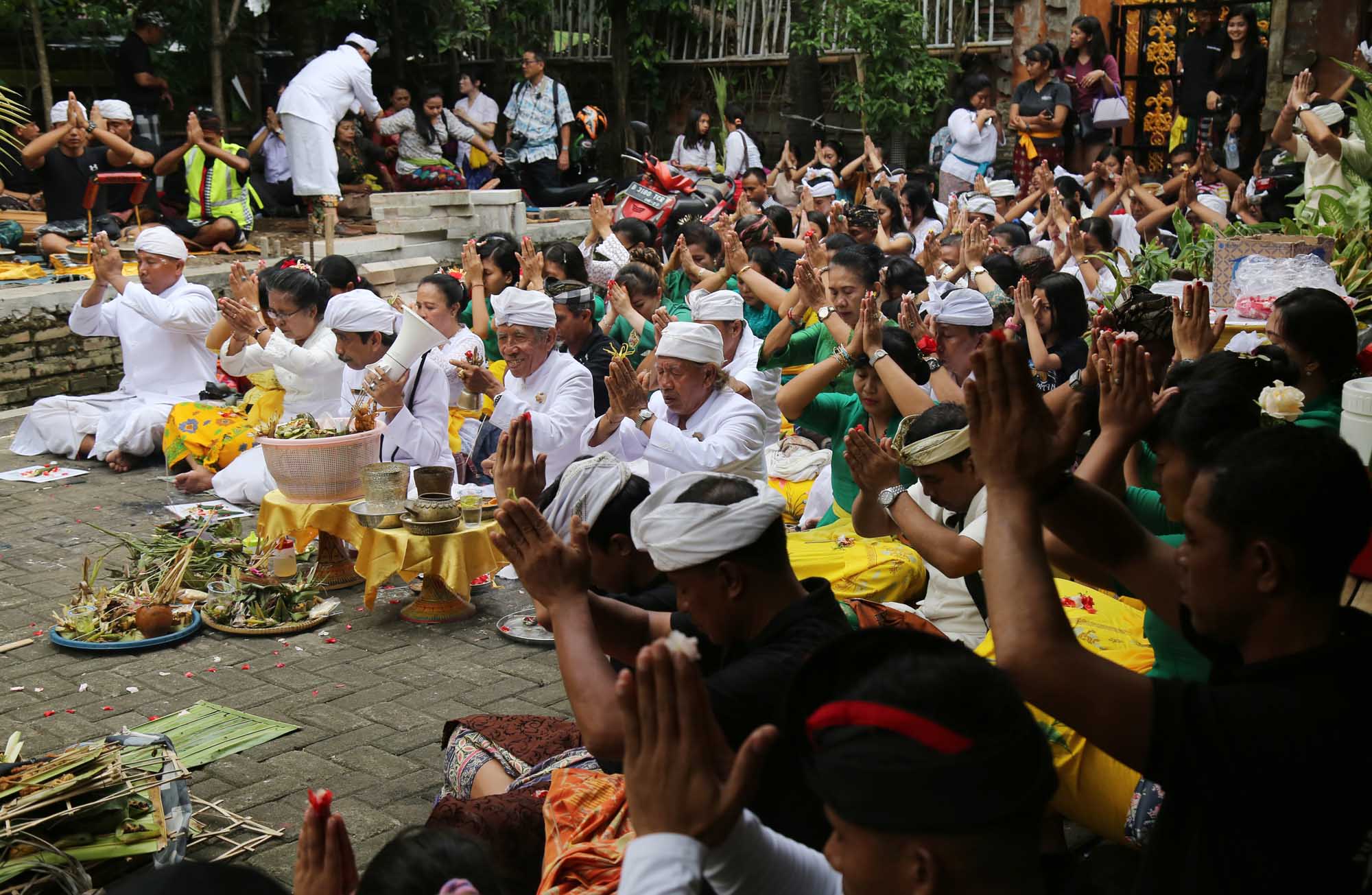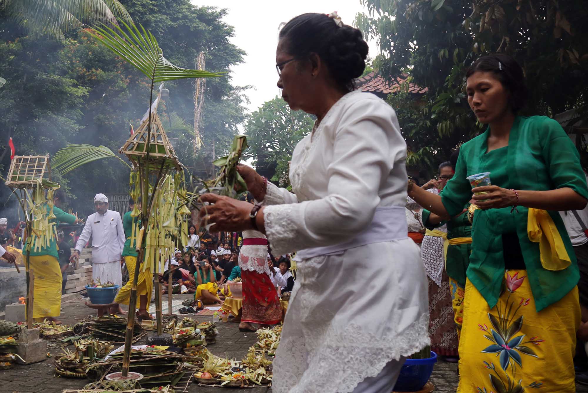 Umat Hindu menggelar ritual suci Tawur Kesanga jelang perasaan Nyepi di Pura Agung Wira Satya Buana, Jakarta, Senin (27/3). Kegiatan ritual tersebut digelar untuk menyucikan alam semesta beserta isinya dan meningkatkan hubungan dan keharmonisan antara sesama manusia, manusia dengan lingkungannya, serta manusia dengan Tuhan (Tri Hita Karana). AKTUAL/Tino Oktaviano