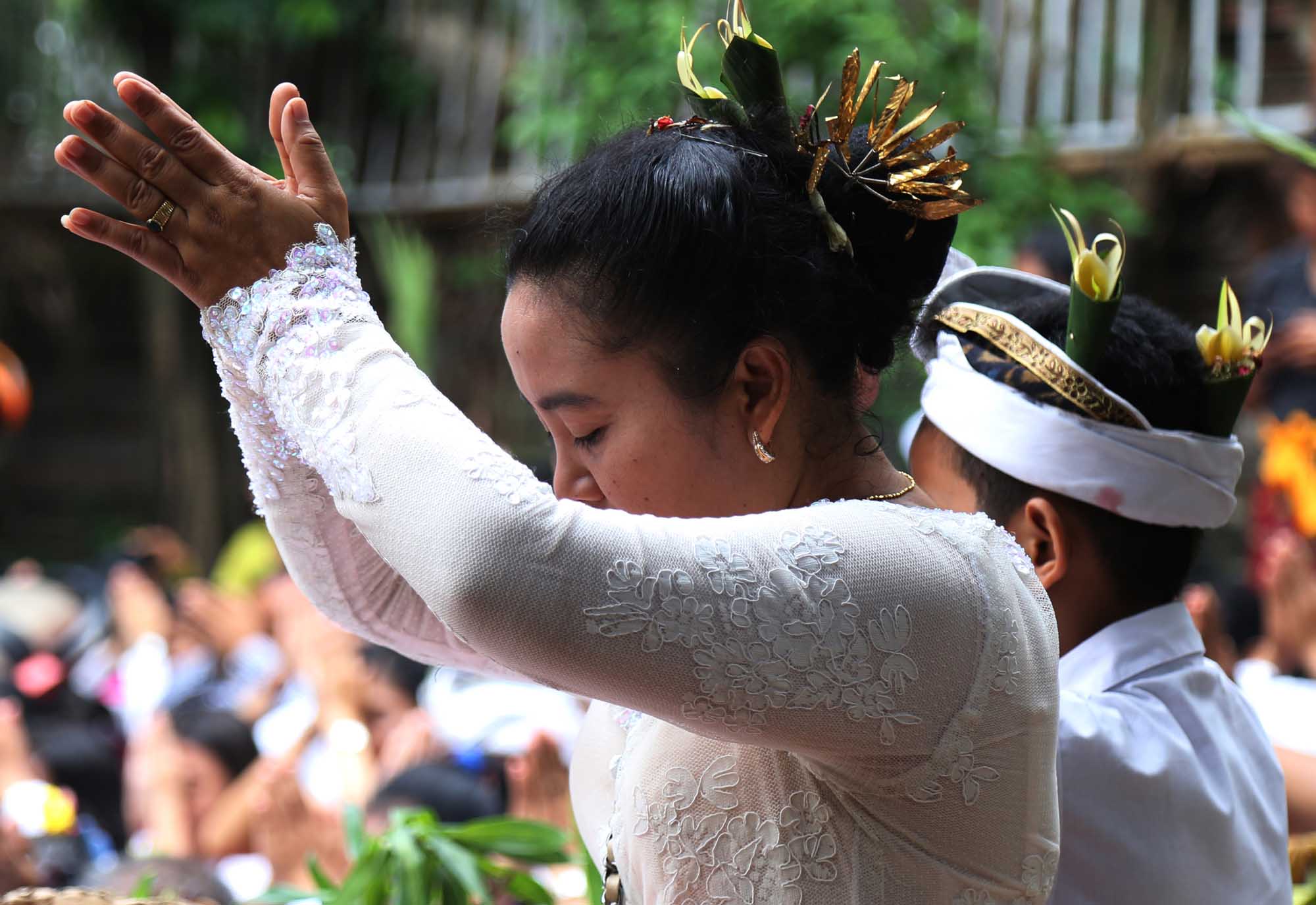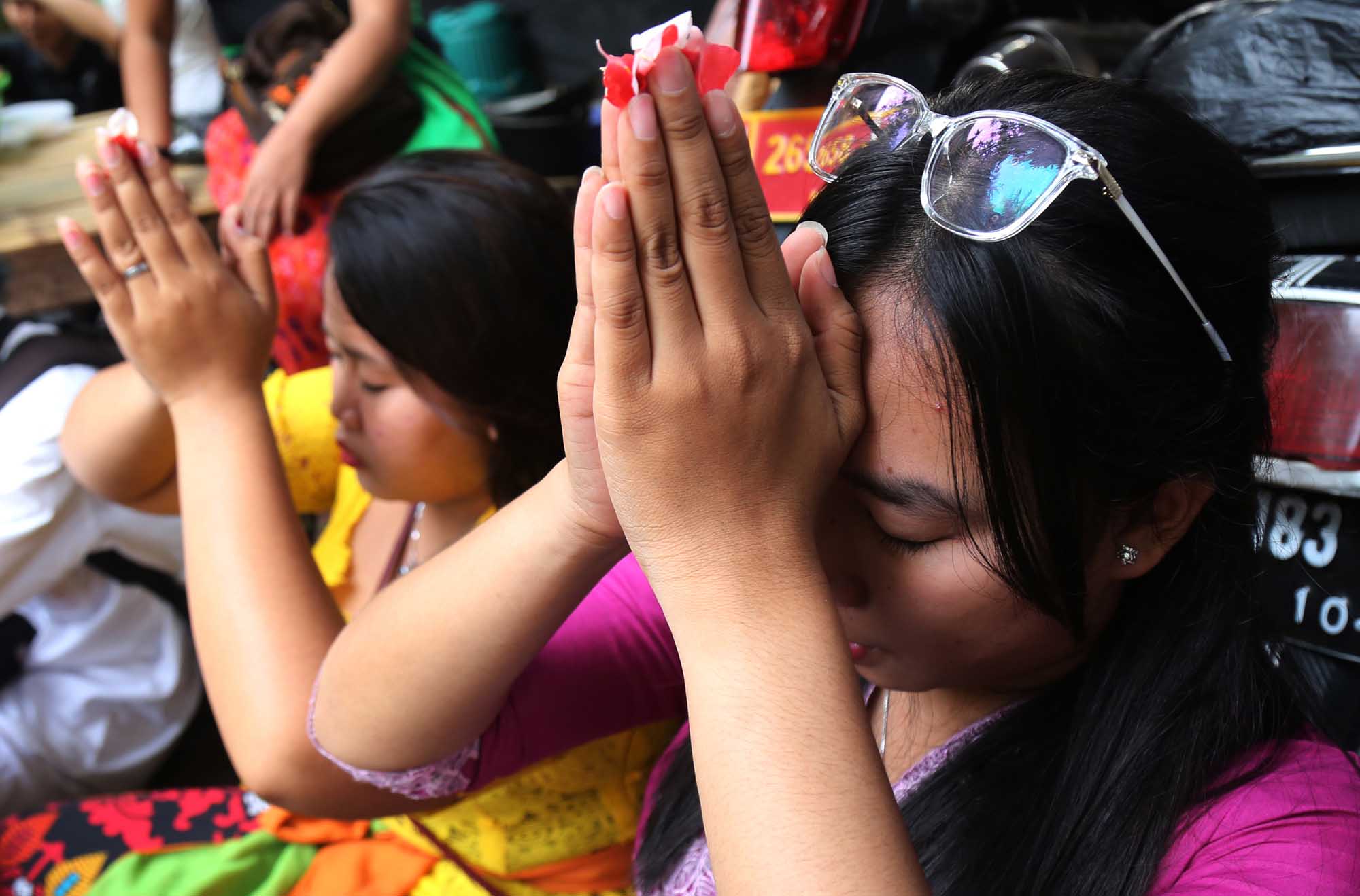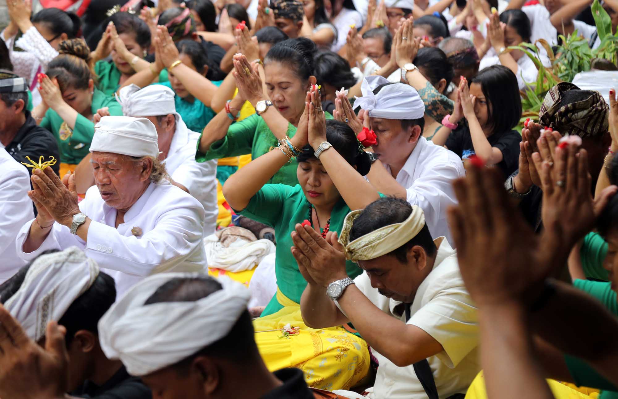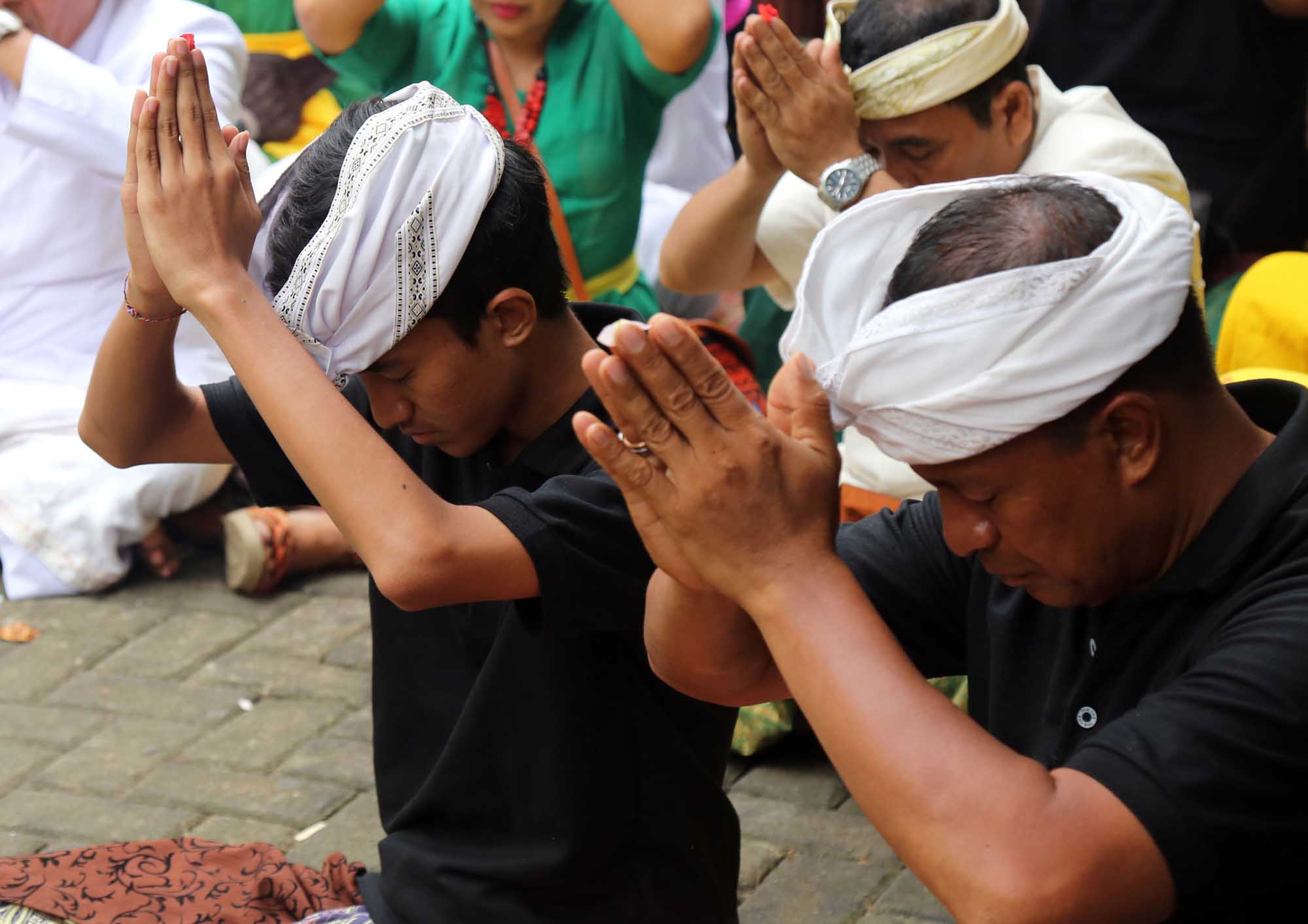 Umat Hindu menggelar ritual suci Tawur Kesanga jelang perasaan Nyepi di Pura Agung Wira Satya Buana, Jakarta, Senin (27/3). Kegiatan ritual tersebut digelar untuk menyucikan alam semesta beserta isinya dan meningkatkan hubungan dan keharmonisan antara sesama manusia, manusia dengan lingkungannya, serta manusia dengan Tuhan (Tri Hita Karana). AKTUAL/Tino Oktaviano