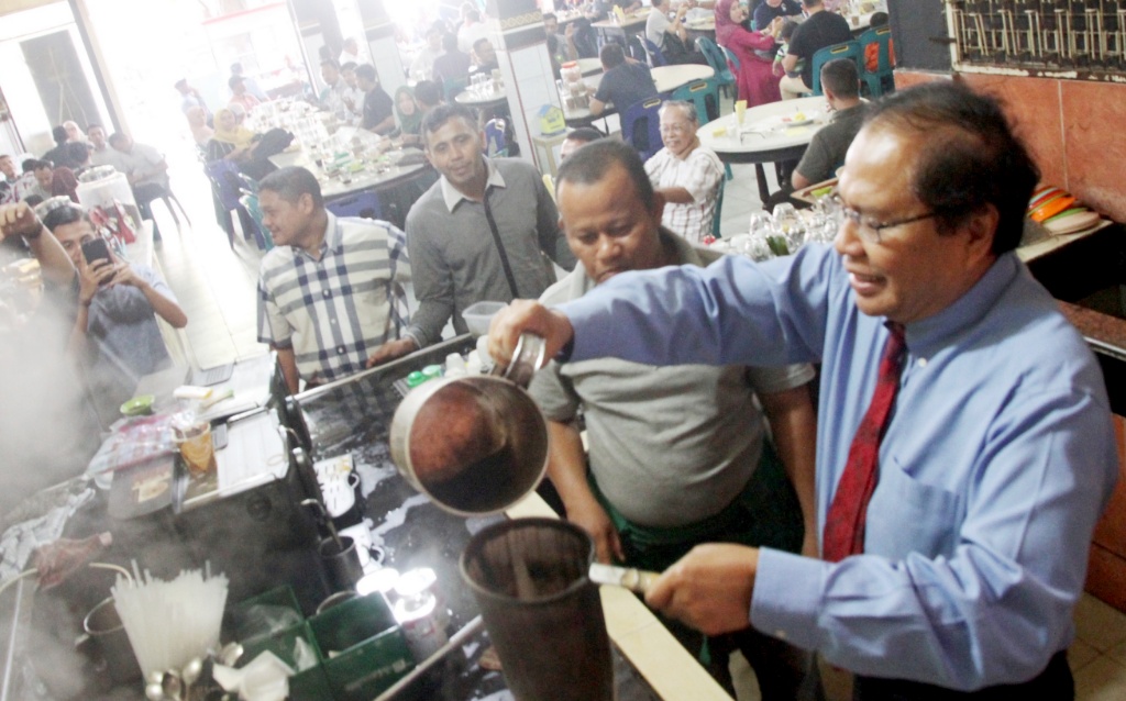 Tokoh Indonsia Rizal Ramli meracik kopi di Warung Kopi Solong Ulee Kareng Banda Aceh, Senin (16/4/18). Setelah melakukan safari politik di Tanah Pasundan pada pekan lalu, kali ini ekonom senior, Rizal Ramli menyambangi Aceh. AKTUAL/Istimewa