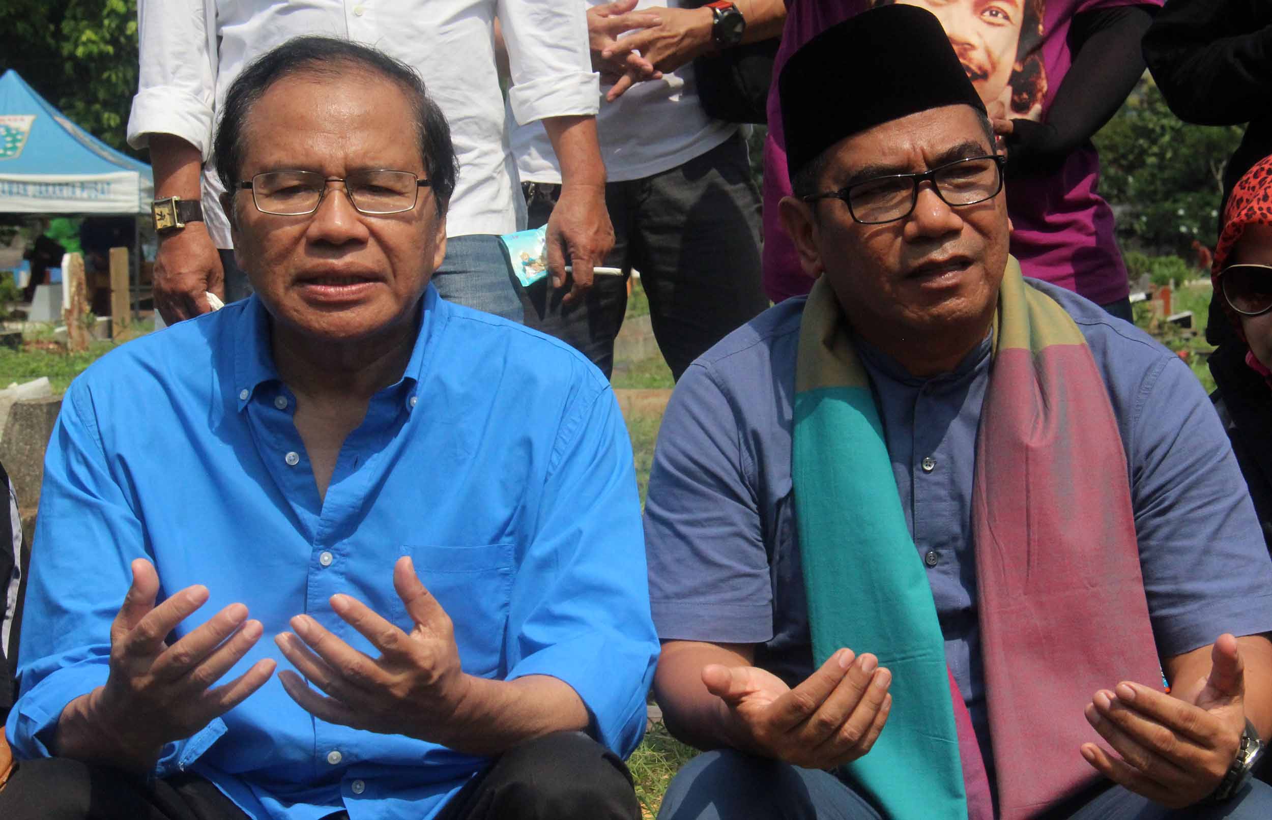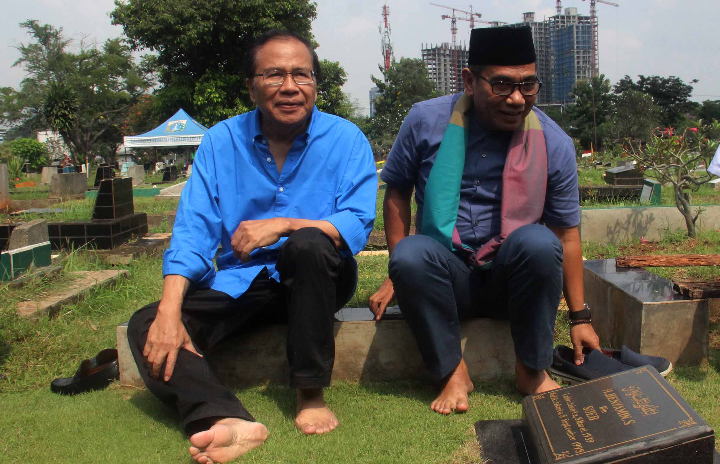 Mantan Menko Maritim Rizal Ramli (kiri) dan putra ketiga seniman Benyamin S, Biem Benyamin (kanan) berziarah ke makam Benyamin S di TPU Karet Bivak, Jakarta, Senin (5/9/2016). Rizal Ramli bersama keluarga dan fans Benyamin S berdoa di makam Benyamin S dalam rangka haul Benyamin ke-21 untuk mengenang Seniman Betawi yang meninggal pada 5 September 1995