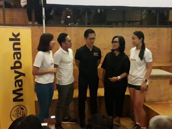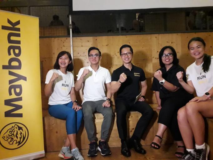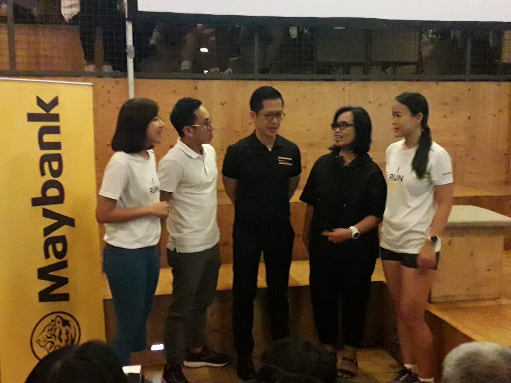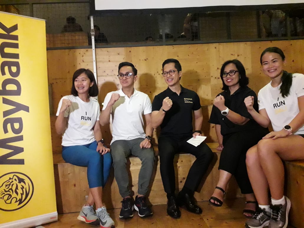 Direktur PT Bank Maybank Indonesia (Maybank Indonesia) Eri Budiono (tengah) bersama Head Corporate Communications & Branding Maybank Indonesia Esti Nugraheni (kedua dari kanan), Project Manager Maybank Bali Marathon Deniawan serta para pacer berbincang pada Road To Maybank Bali Marathon 2019, di Jakarta, Jumat (3/5). Kegiatan ini yang pertama kali dari rangkaian aktivitas menuju Maybank Bali Marathon, yang mengangkat pentingnya melakukan persiapan kesehatan sebelum mengikuti lomba marathon, mencakup aspek persiapan, kesehatan dan keselamatan. Road To Maybank Bali Marathon juga memperkenalkan para pacer, yang bertambah dari tahun lalu 19 pacer menjadi 41 pacer. AKTUAL/STR-Eko S Hilman