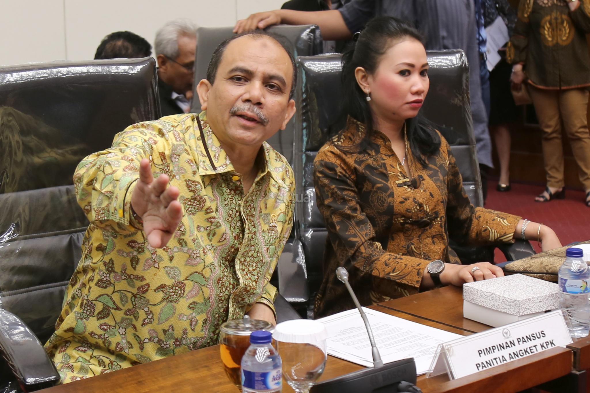 Pimpinan rapat yang juga Wakil Ketua Pansus Angket KPK Dossy Iskandar (kiri) didampingi Risa Mariska (kanan) meminta penjelasan dan pandangan Romli Atmasasmita sebagai pakar hukum pidana berkaitan temuan pansus angket terhadap dugaan penyimpangan yang dilakukan KPK. AKTUAL/Tino Oktaviano