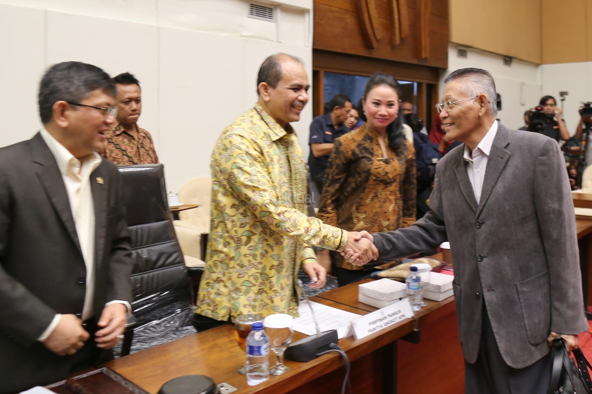 Pimpinan rapat yang juga Wakil Ketua Pansus Angket KPK Dossy Iskandar (kedua kiri) didampingi Wakil Ketua Pansus Angket KPK Taufiqulhadi (kiri) dan Risa Mariska (ketiga kiri) berbincang dengan Pakar Hukum Pidana Romli Atmasasmita (kanan) sebelum rapat dengar pendapat umum (RDPU) di Kompleks Parlemen, Senayan, Jakarta, Selasa (11/7). Rapat tersebut meminta penjelasan dan pandangan Romli Atmasasmita sebagai pakar hukum pidana berkaitan temuan pansus angket terhadap dugaan penyimpangan yang dilakukan KPK. AKTUAL/Tino Oktaviano