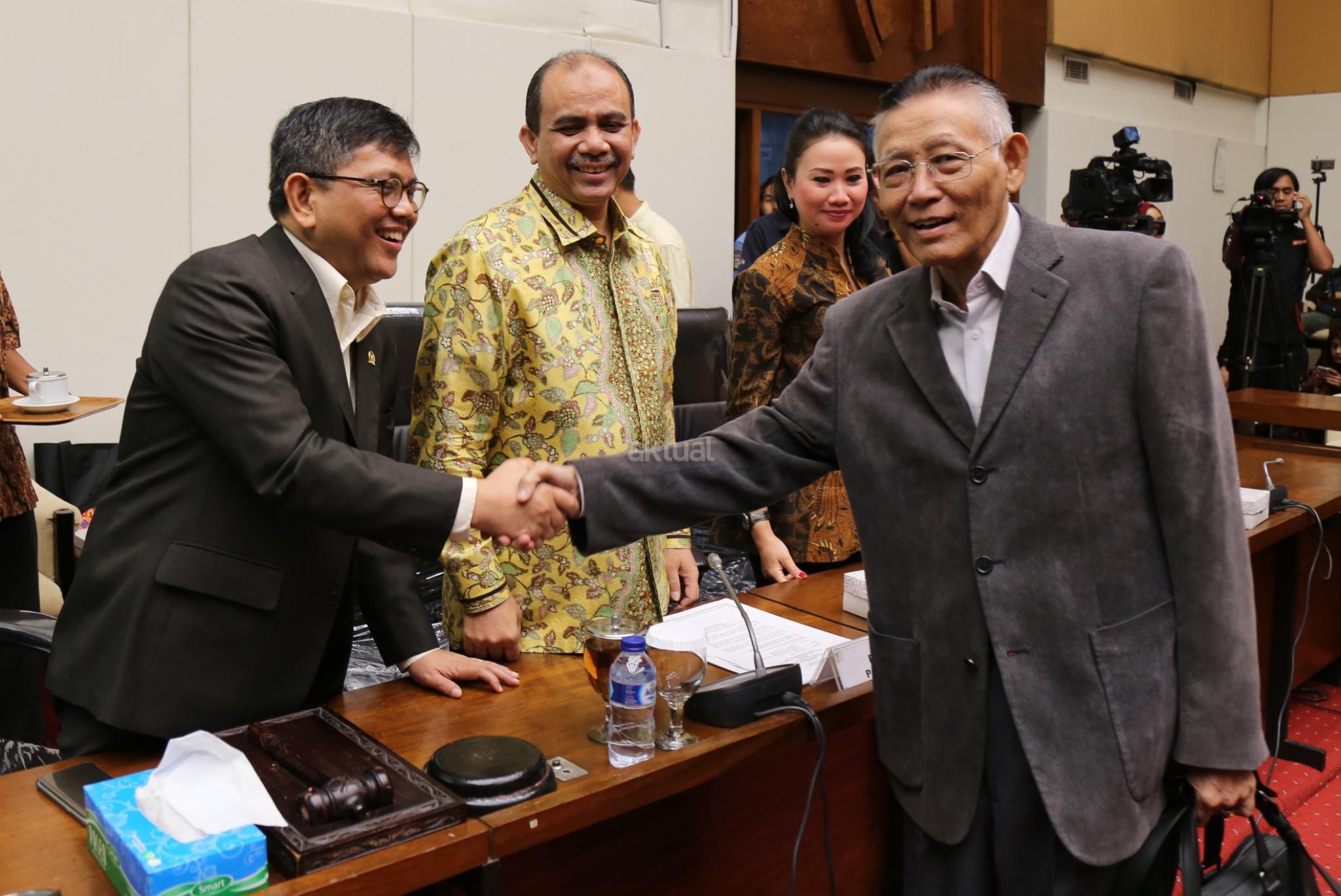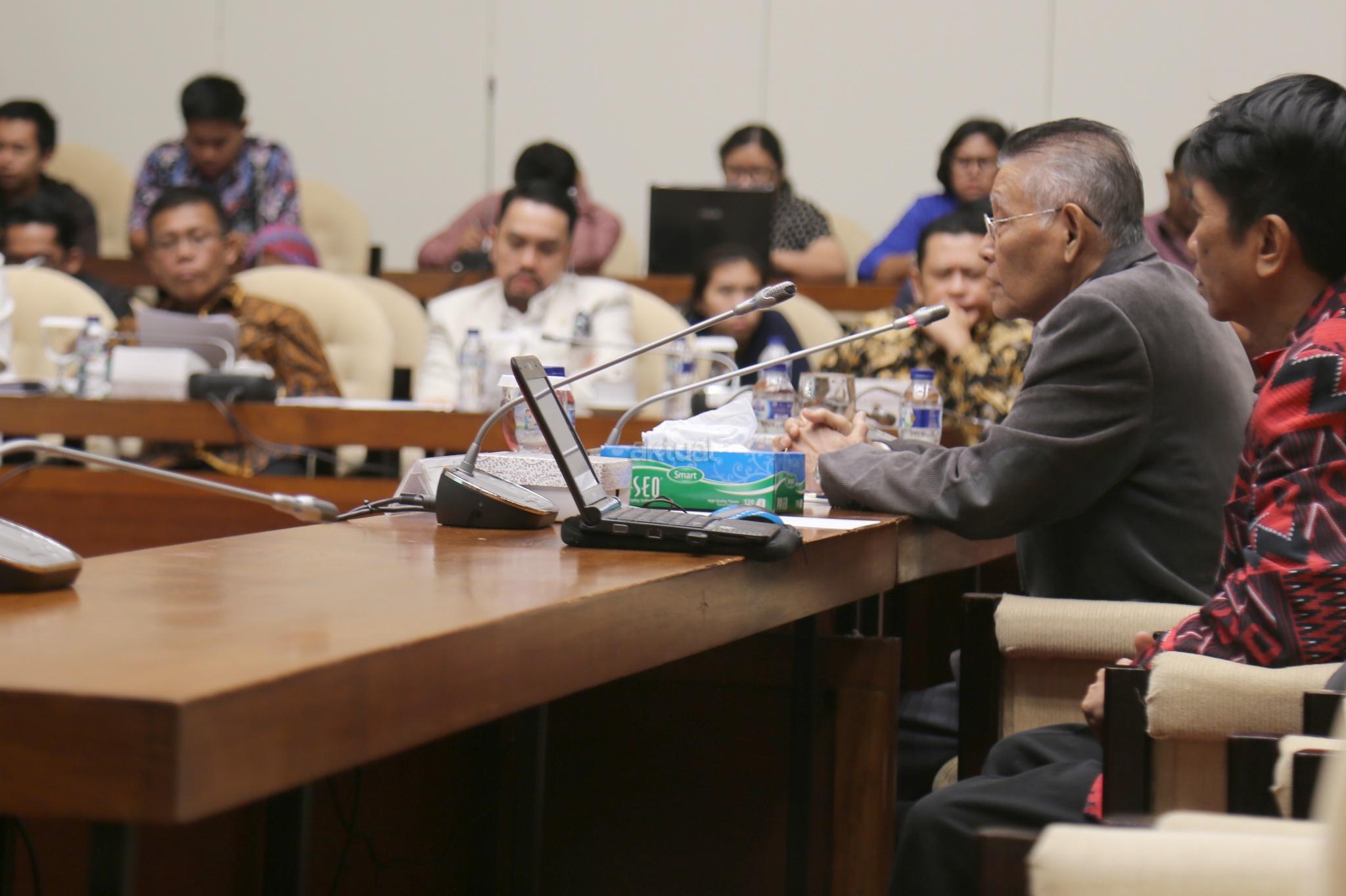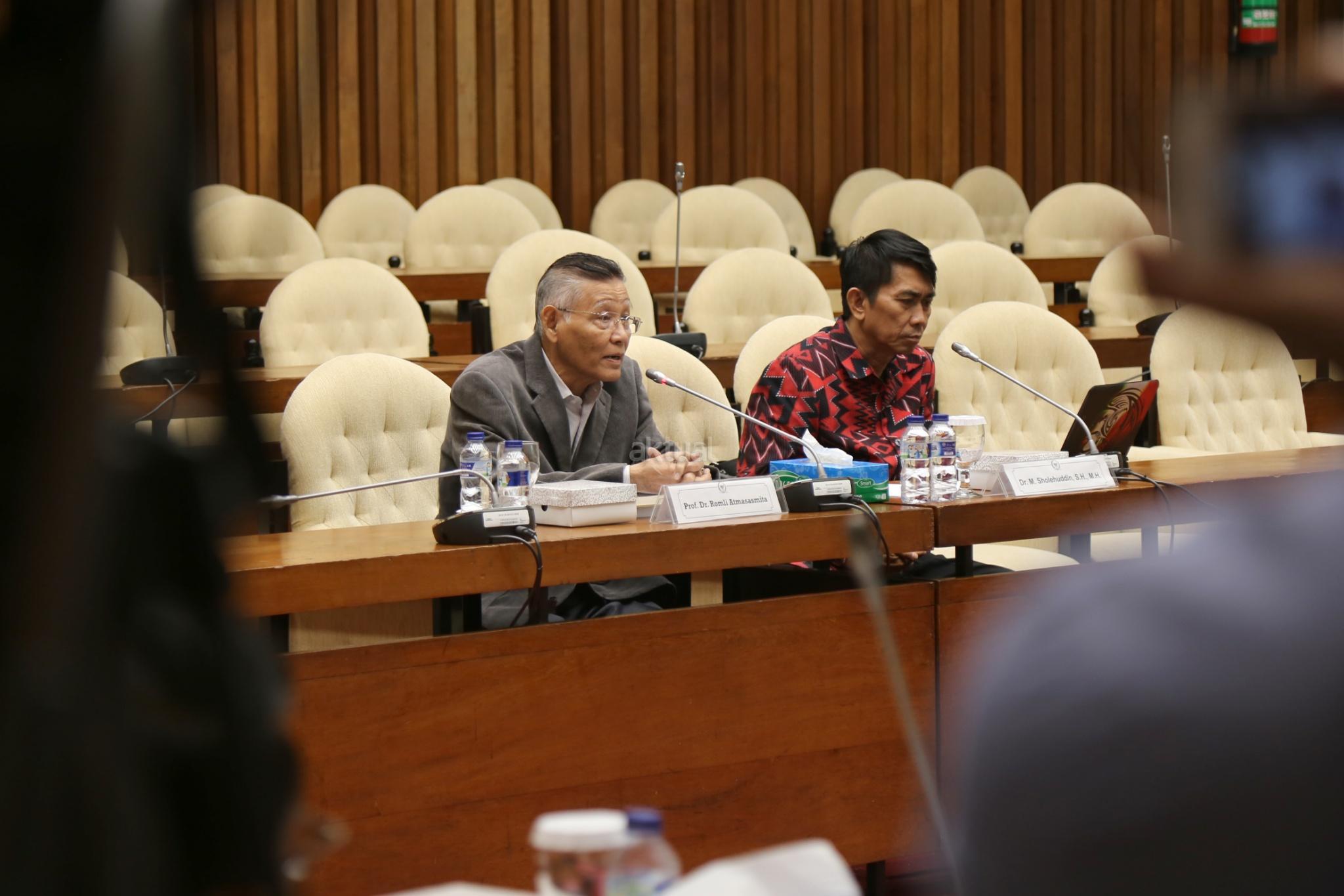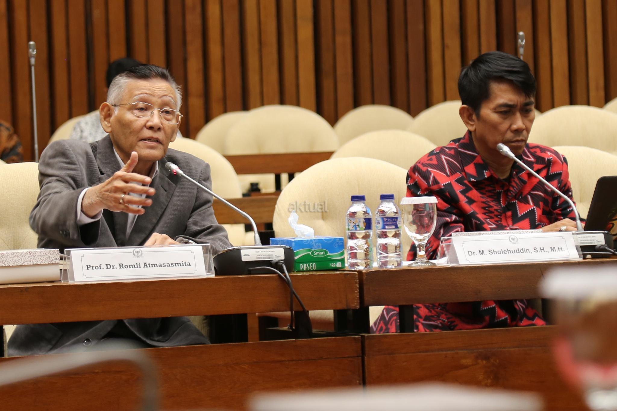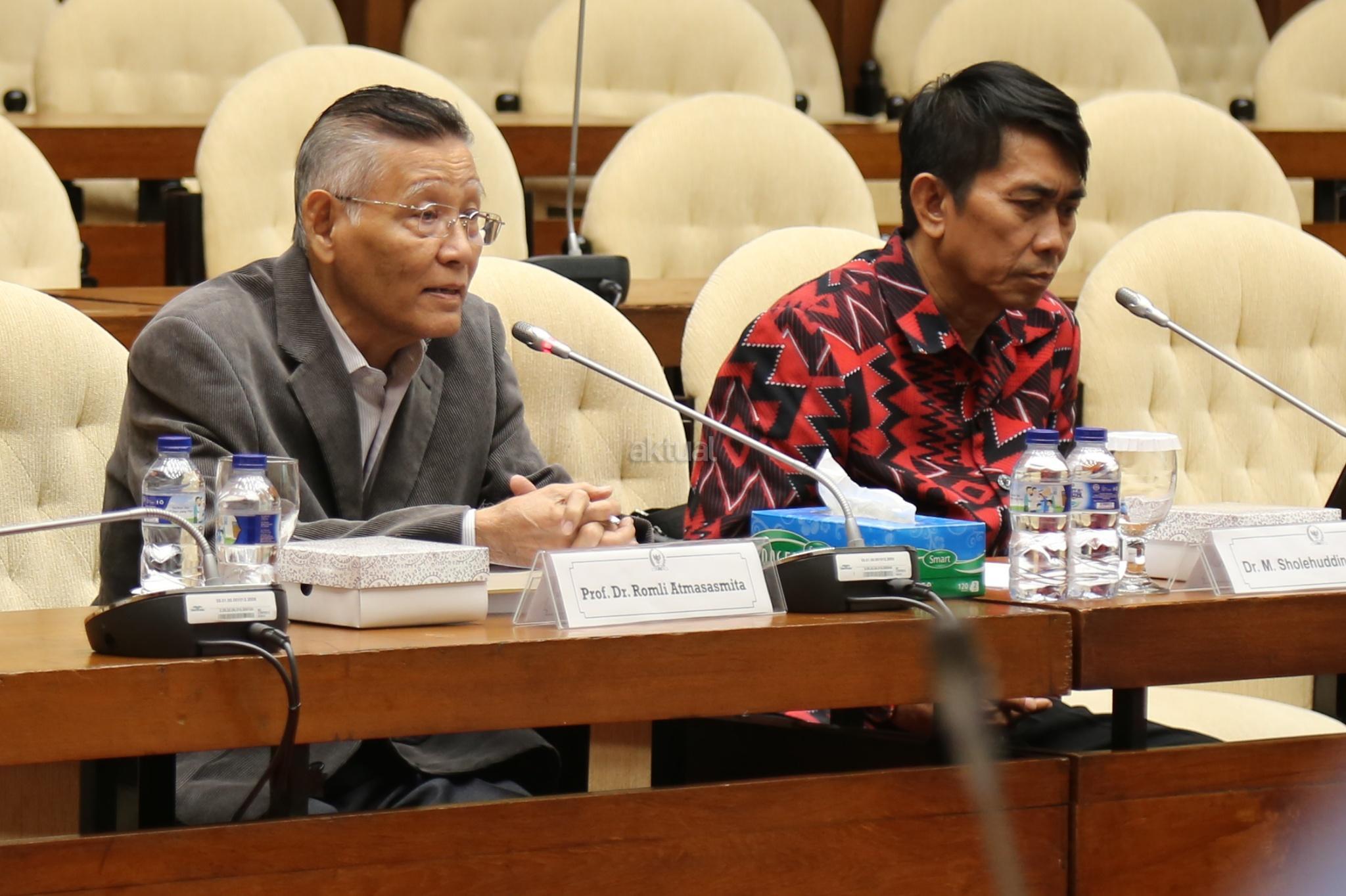 Pakar Hukum Pidana Romli Atmasasmita menghadiri rapat dengar pendapat umum (RDPU) di Kompleks Parlemen, Senayan, Jakarta, Selasa (11/7). Dalam RDPU tersebut Romli Atmasasmita mengatakan KPK gagal dalam mencegah tindak pidana korupsi, tidak bisa menjalankan koordinasi supervisi, maupun pencegahan dan hanya mengutamakan penindakan. AKTUAL/Tino Oktaviano