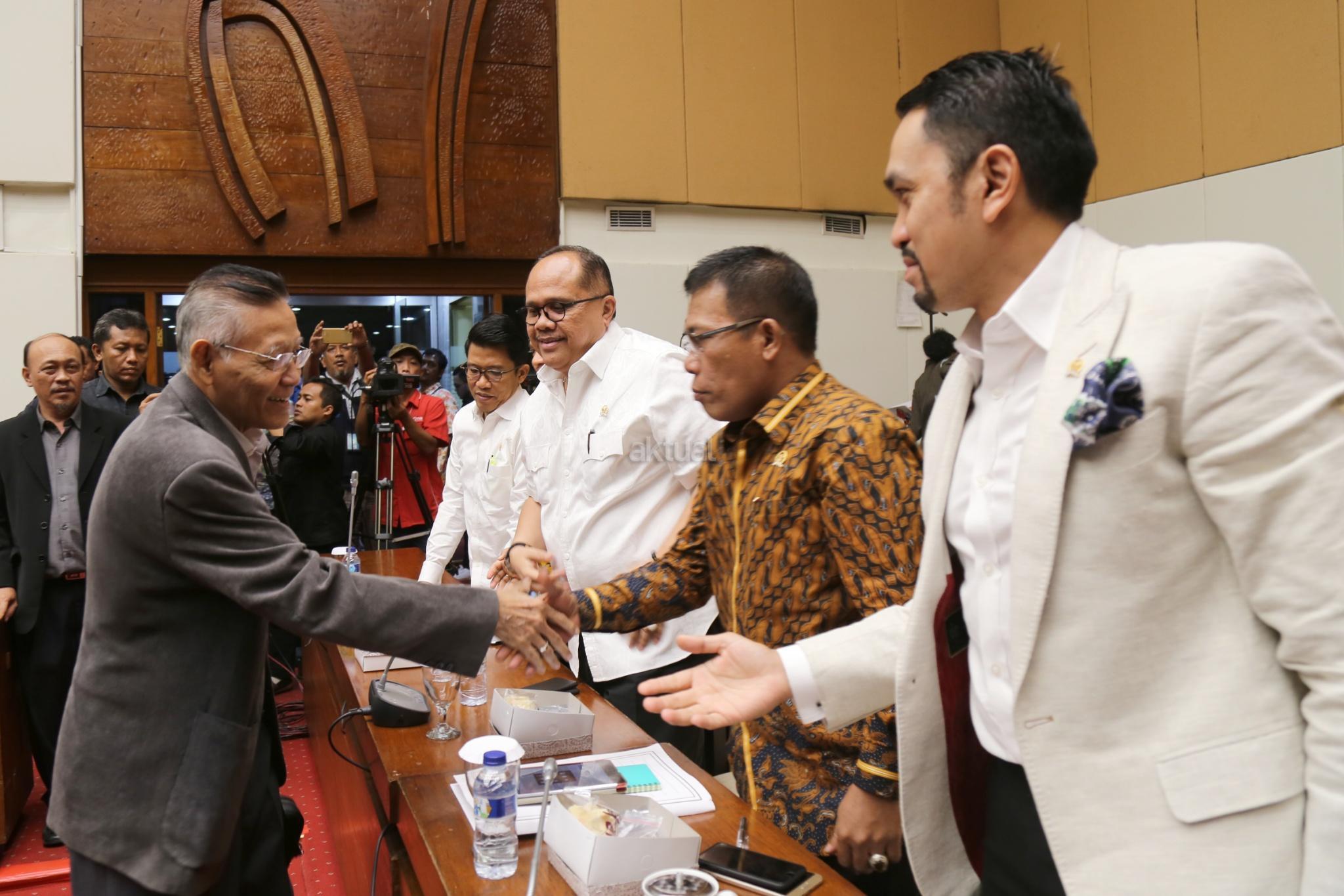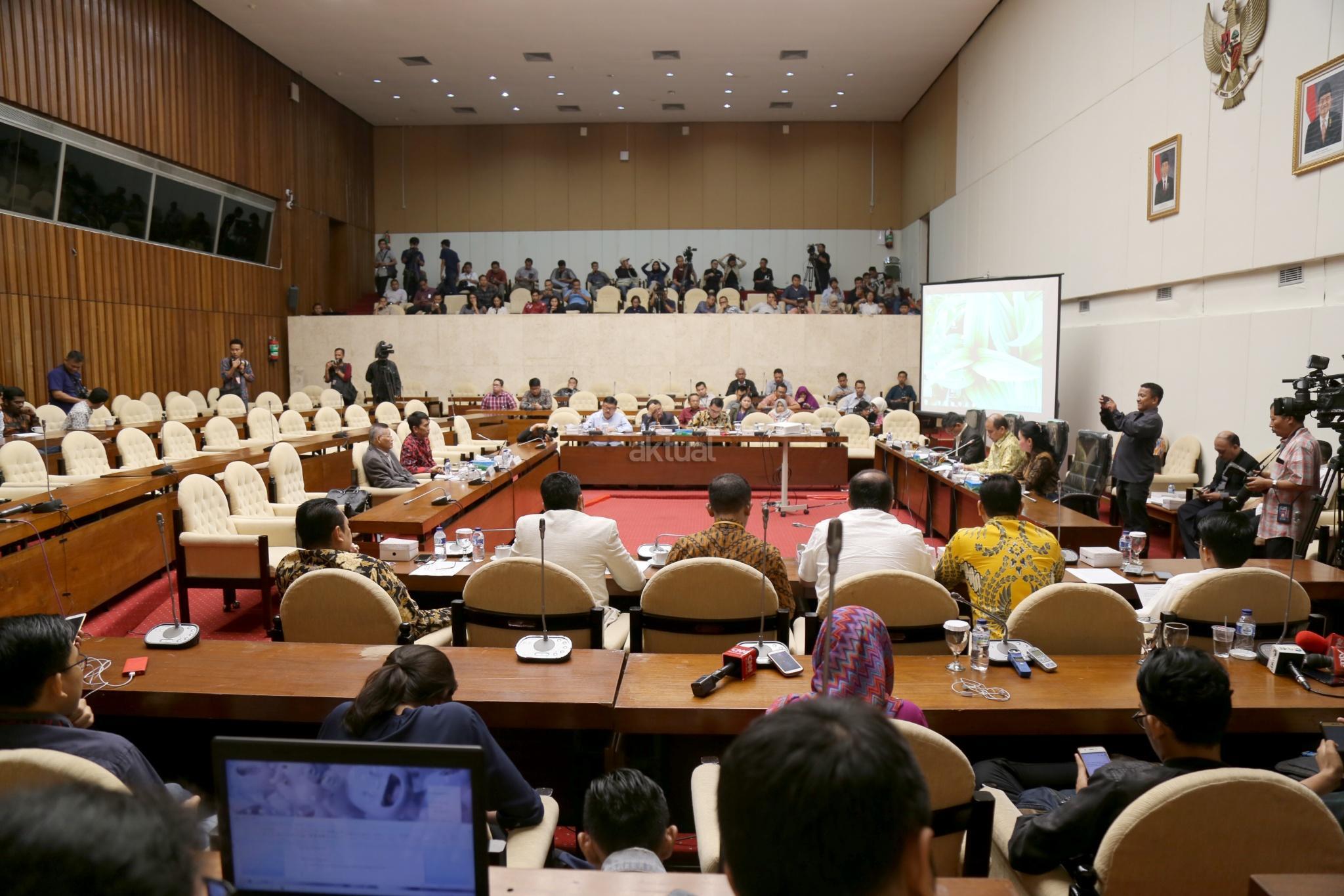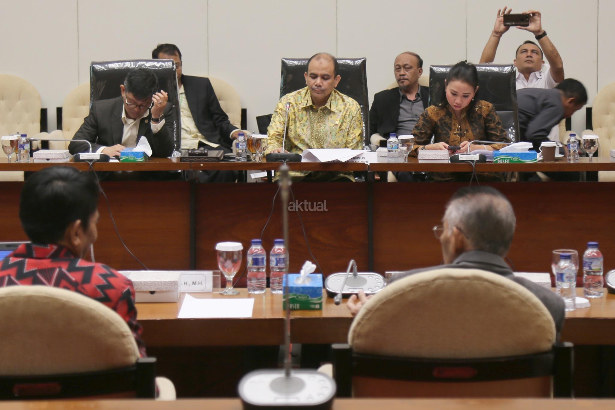 Suasana rapat dengar pendapat umum (RDPU) di Kompleks Parlemen, Senayan, Jakarta, Selasa (11/7). Rapat tersebut meminta penjelasan dan pandangan Romli Atmasasmita sebagai pakar hukum pidana berkaitan temuan pansus angket terhadap dugaan penyimpangan yang dilakukan KPK. AKTUAL/Tino Oktaviano