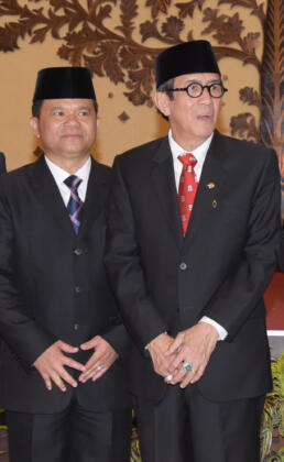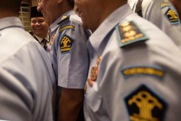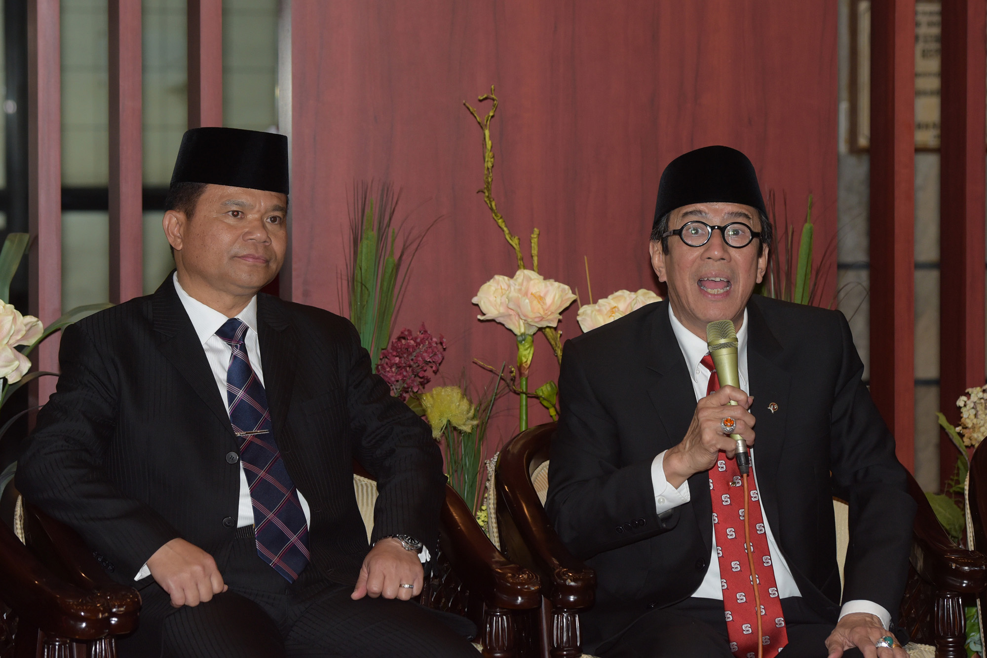 Irjen Pol Ronny F. Sompie (kanan) berjalan usai dilantik sebagai Dirjen Imigrasi Kemenkumham di Kantor Kementerian Hukum dan HAM di Jakarta, Senin (10/8). Menkum HAM Yasonna Laoly secara resmi melantik Ronny F Sompie sebagai Dirjen Imigrasi Kementerian Hukum dan HAM. ANTARA FOTO/Rosa Panggabean/aww/15.